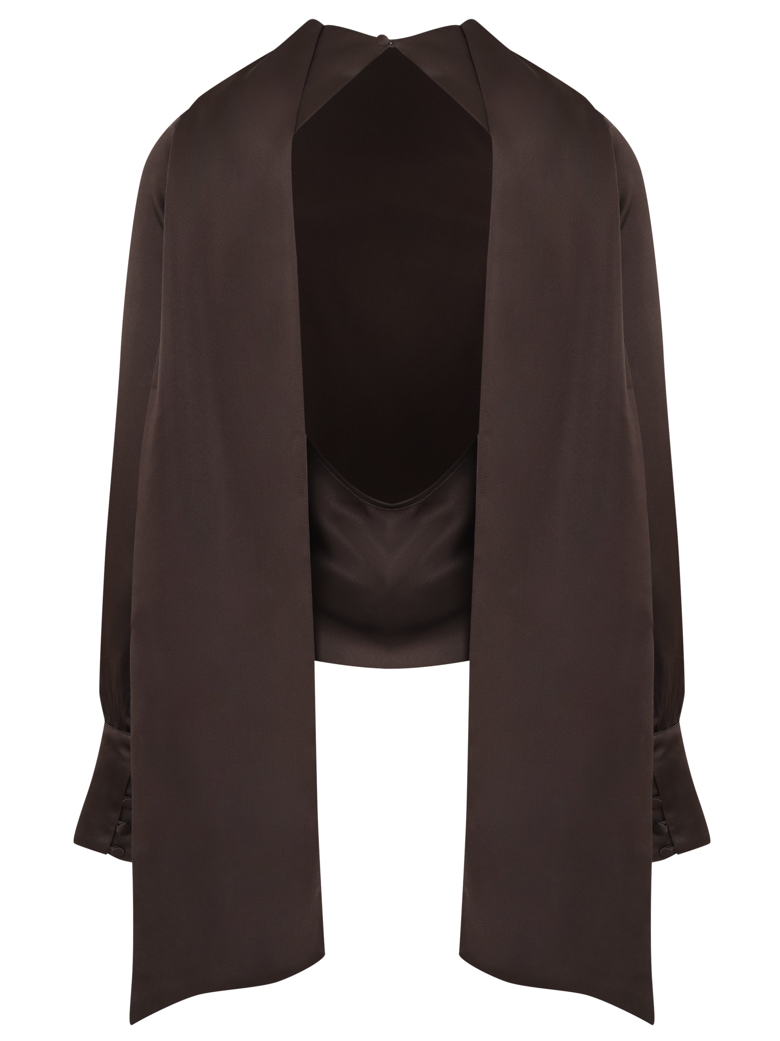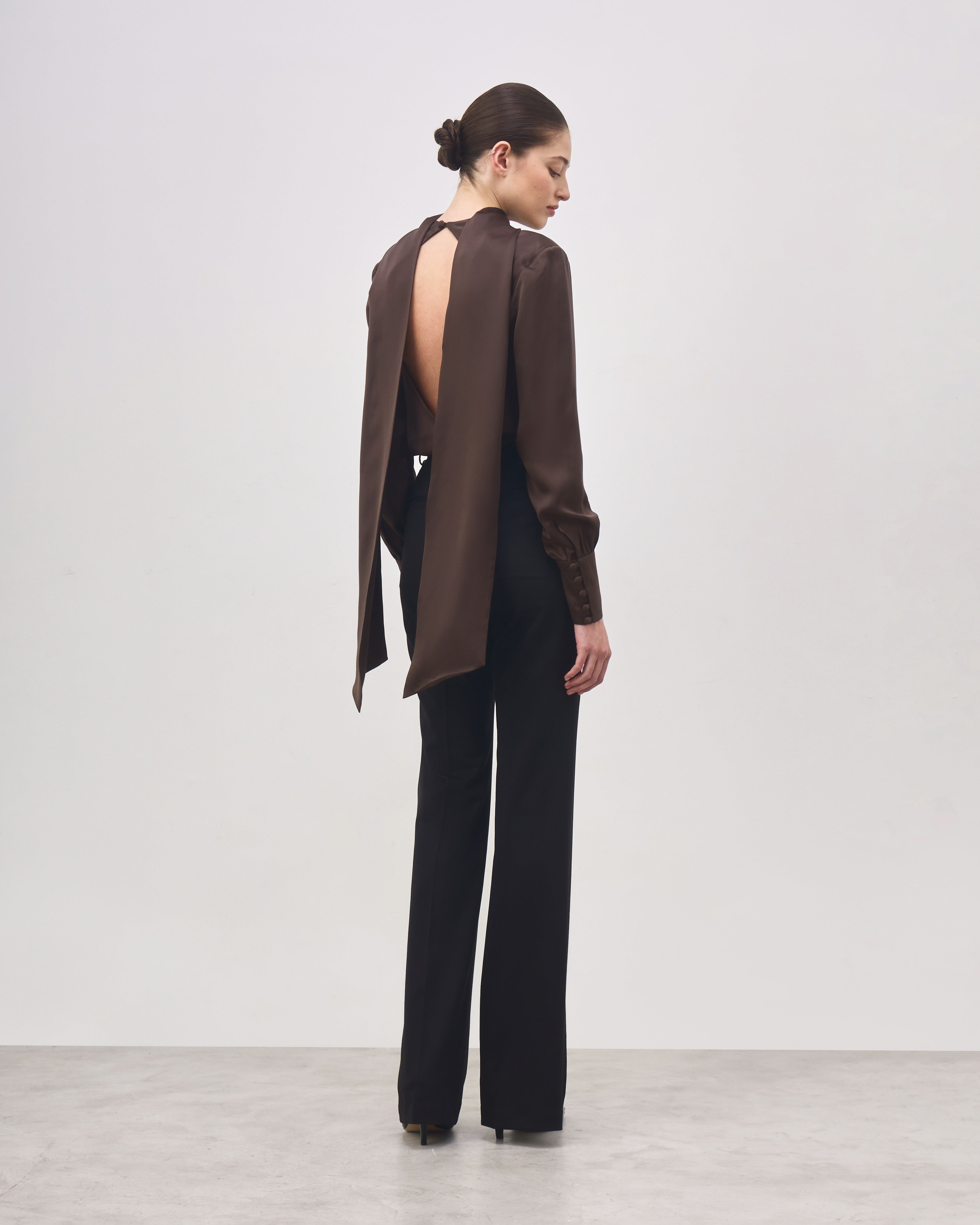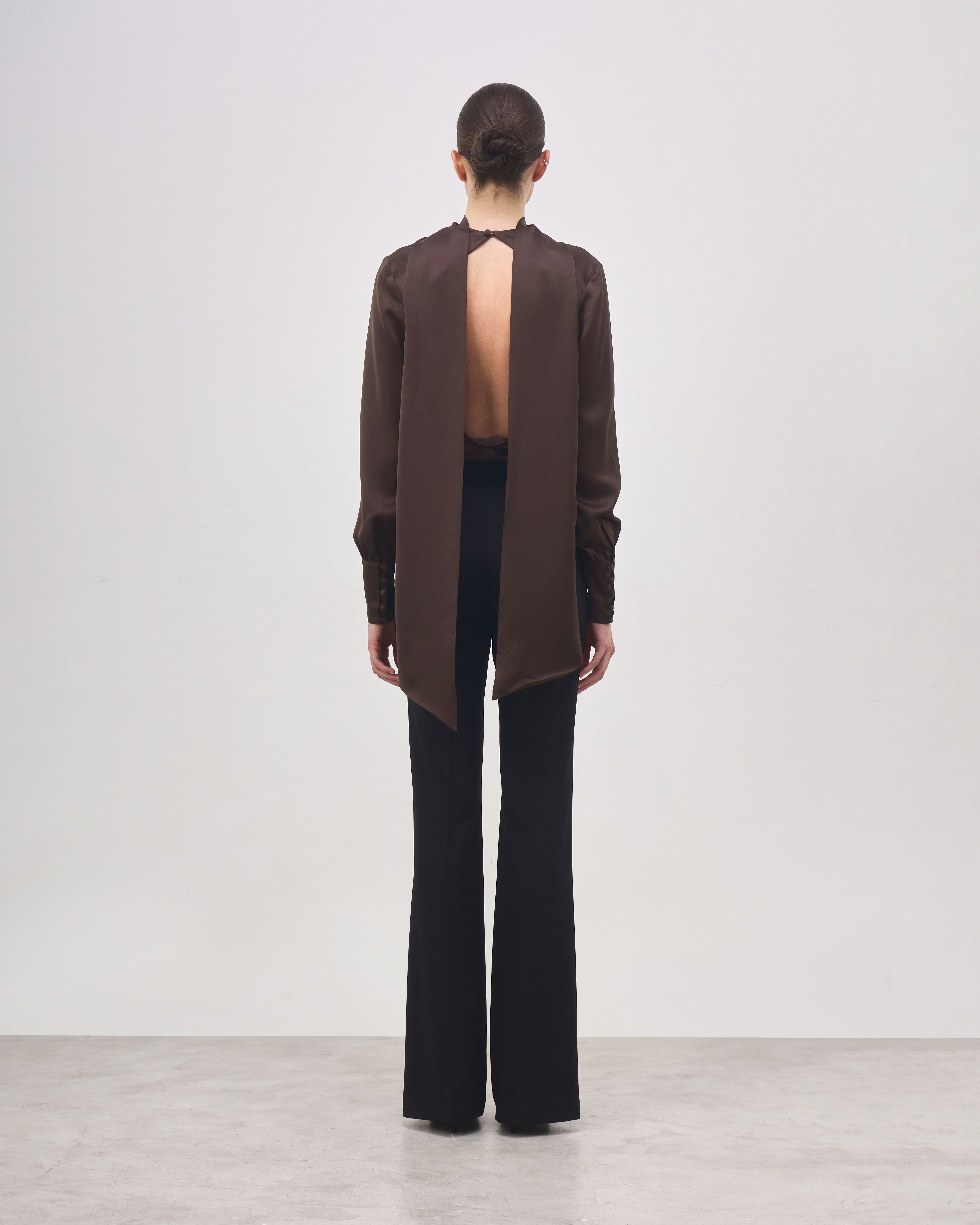 The Marie Blouse is made from pure silk and features a draped halter-style silhouette with a straight fit. The upper ties allow multiple styling options, such as a high-neck effect, bow, or scarf detail. It has long sleeves with covered buttons at the cuffs, a deep open back and a straight hem.