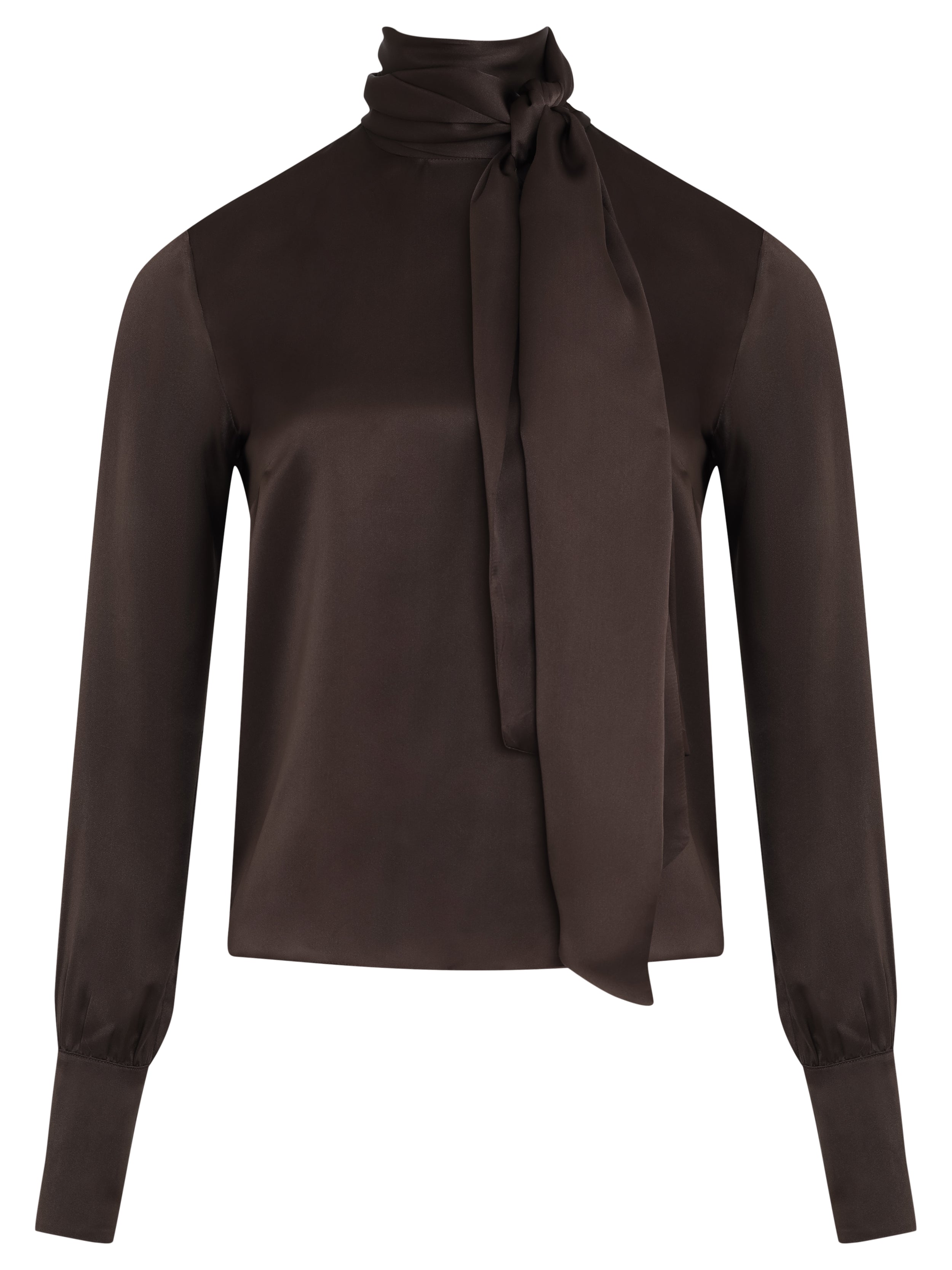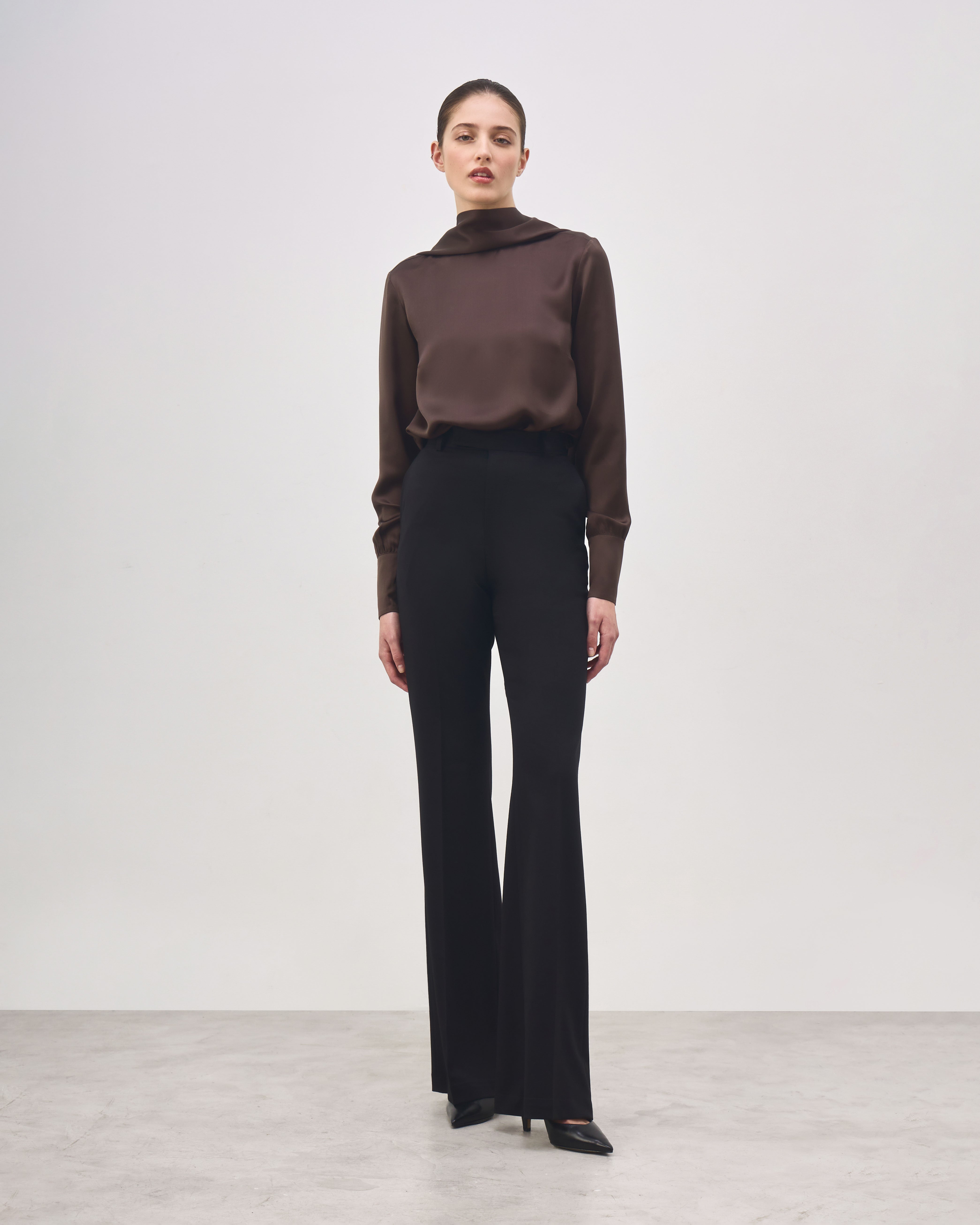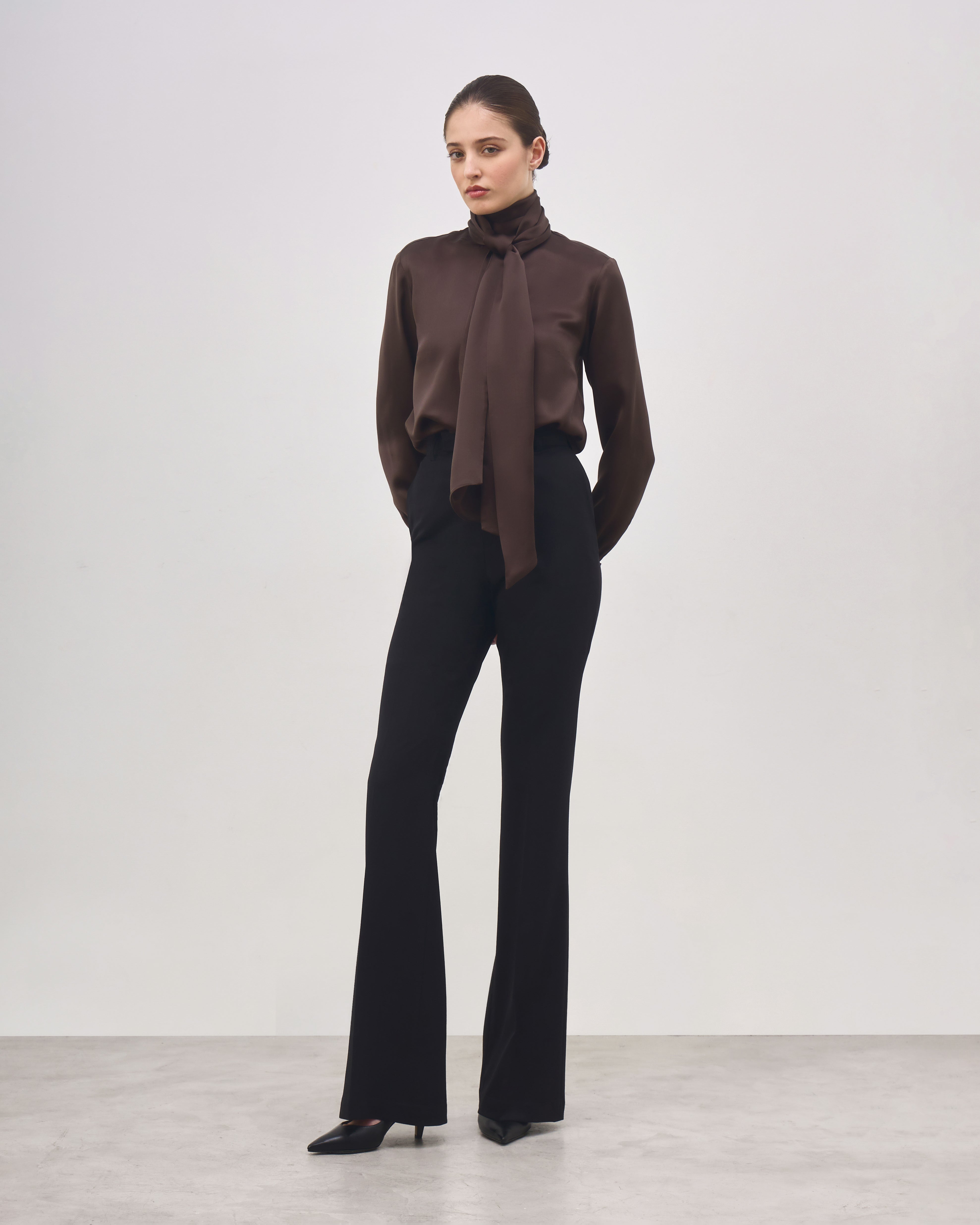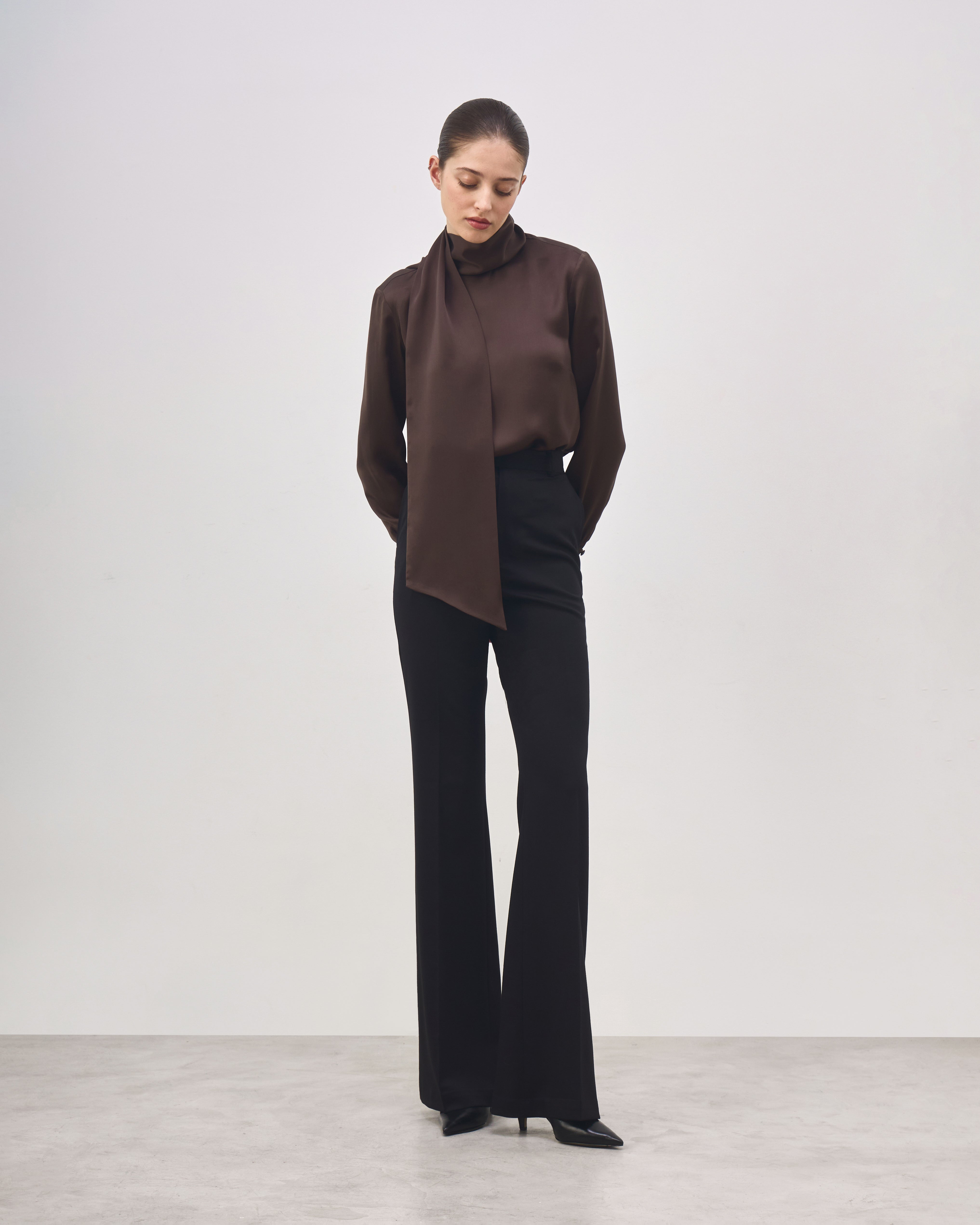 The Marie Blouse is made from pure silk and features a draped halter-style silhouette with a straight fit. The upper ties allow multiple styling options, such as a high-neck effect, bow, or scarf detail. It has long sleeves with covered buttons at the cuffs, a deep open back and a straight hem.