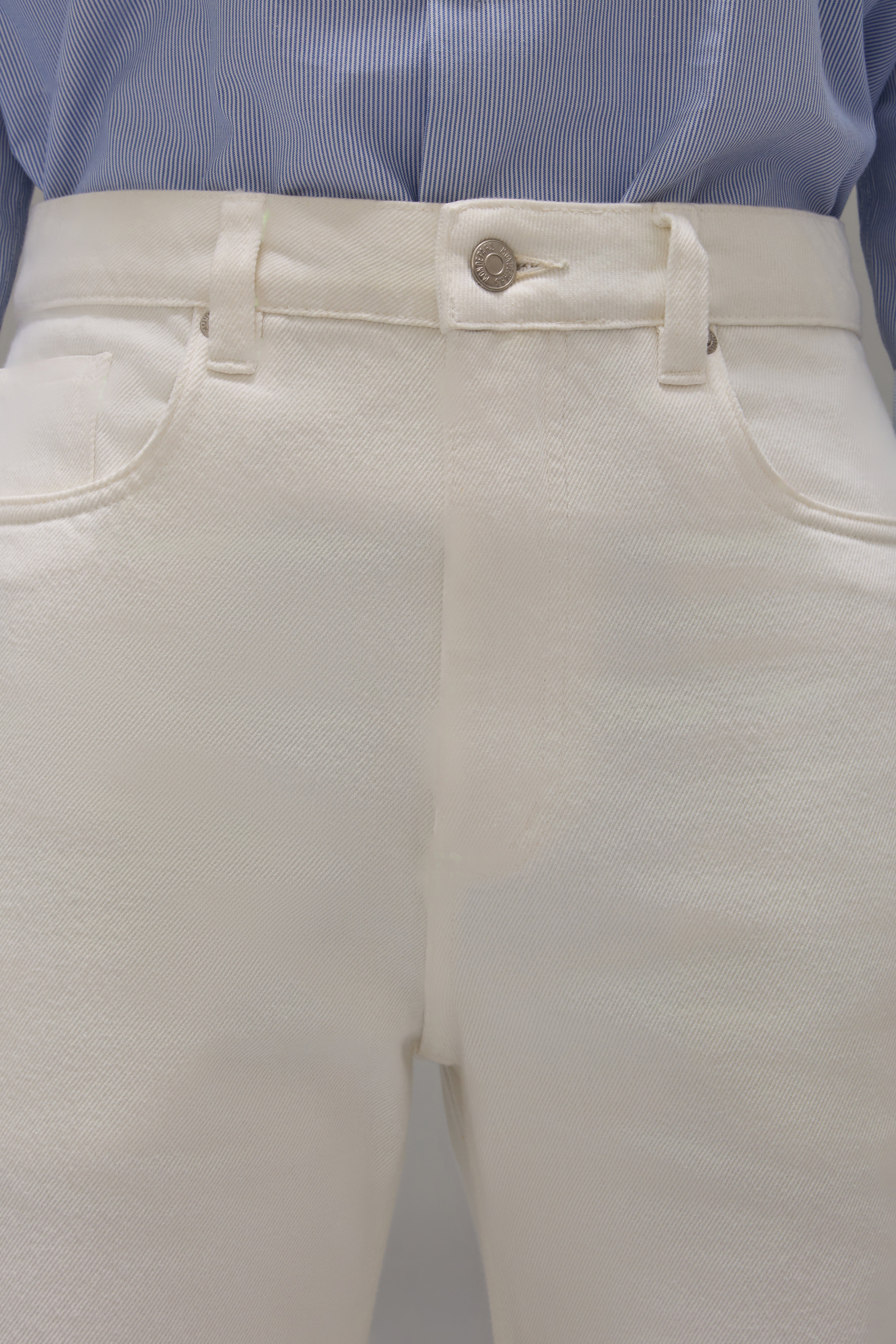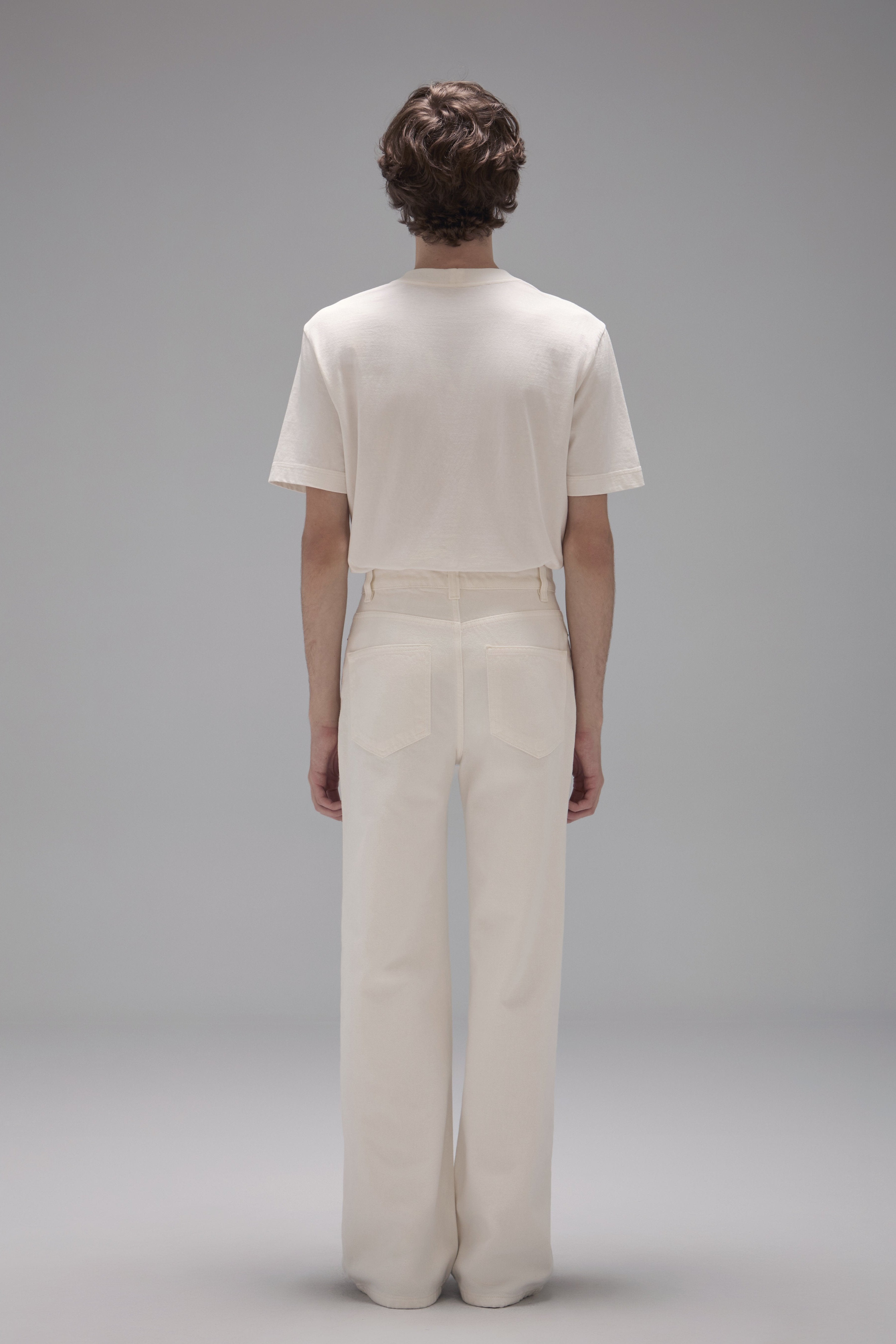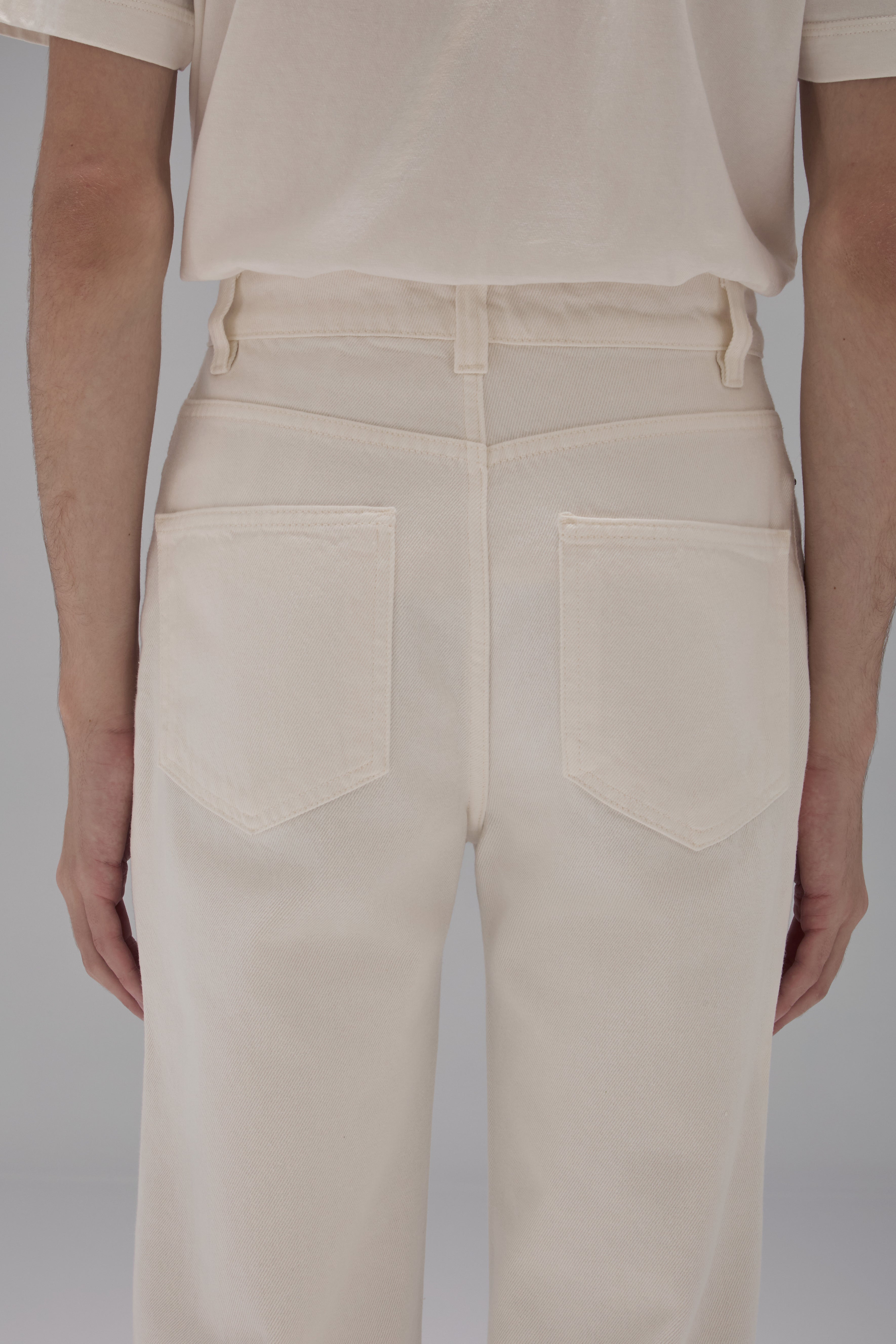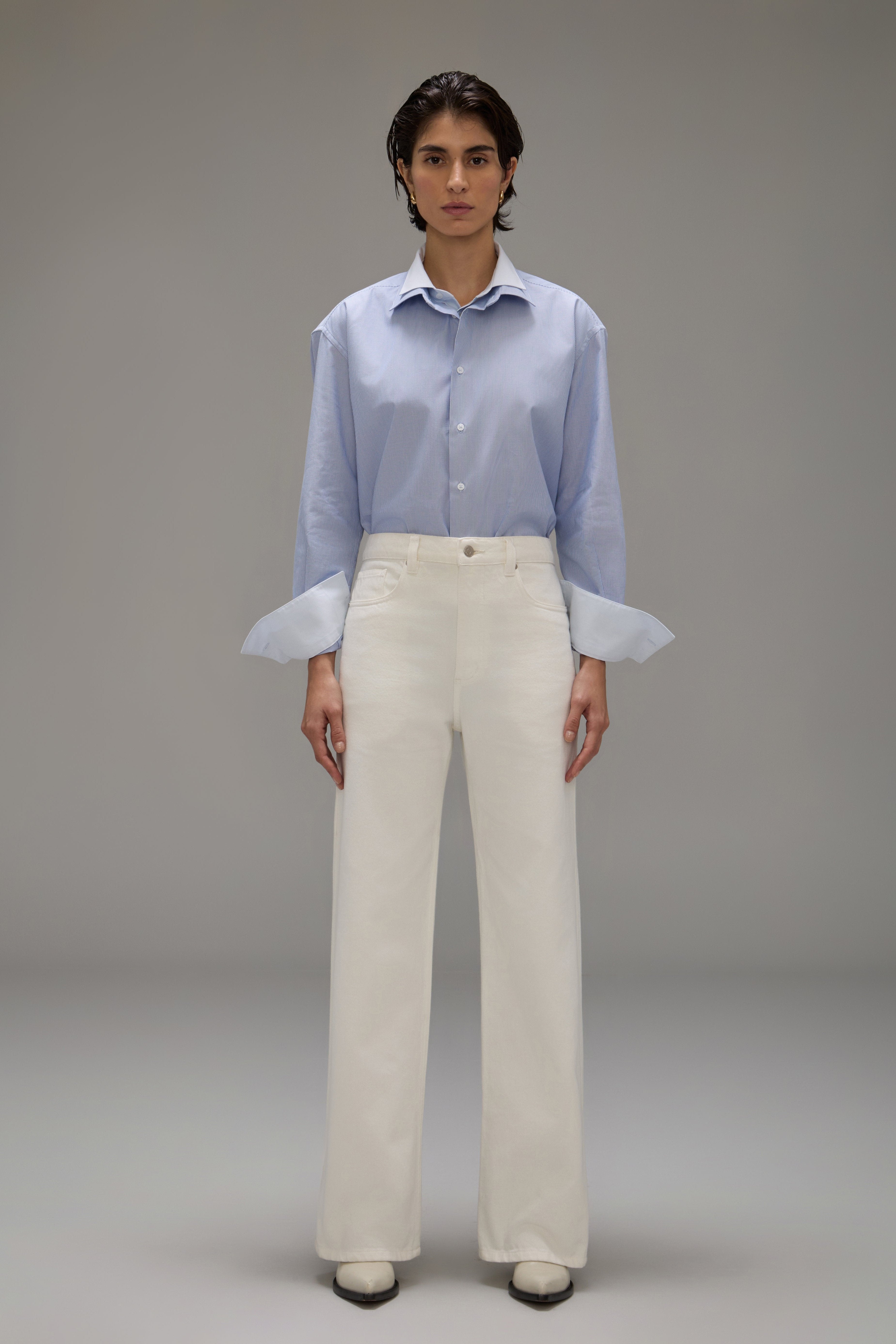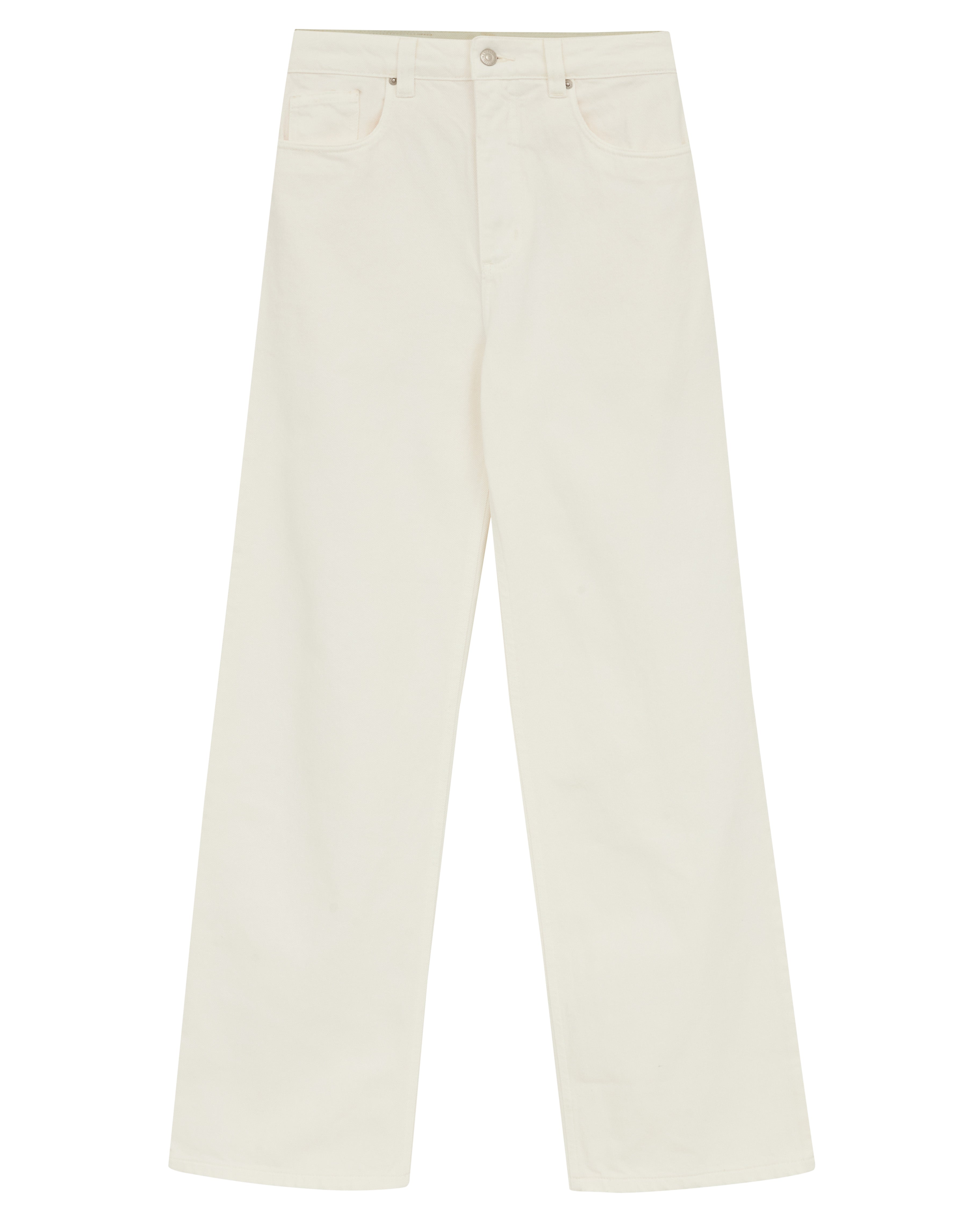 The Gal Pants are made of denim, have a flared fit, high waist, waistband with belt loops, front button and zipper closure, five pockets, brand label made of natural leather in discarded raw material and topstitched finish.