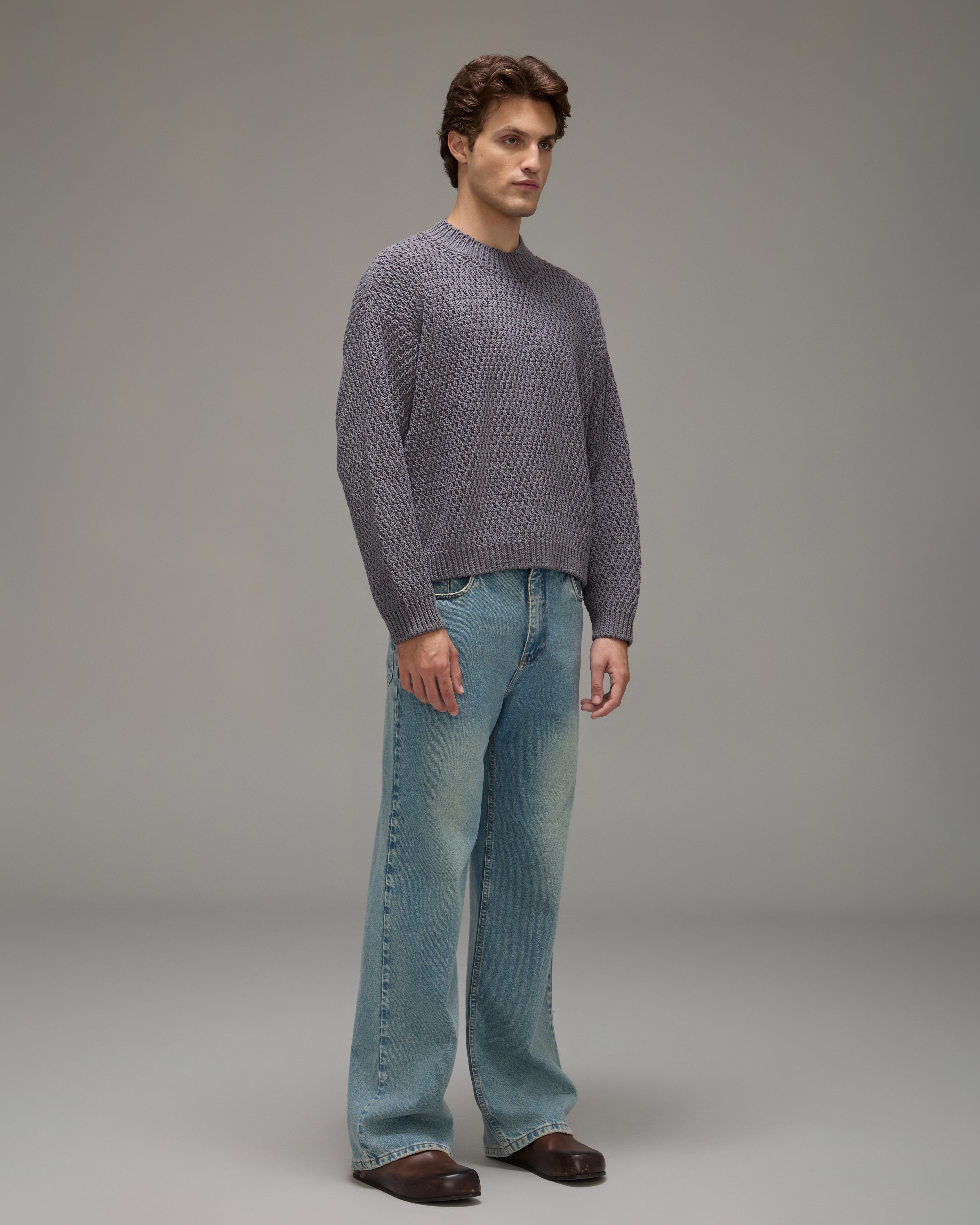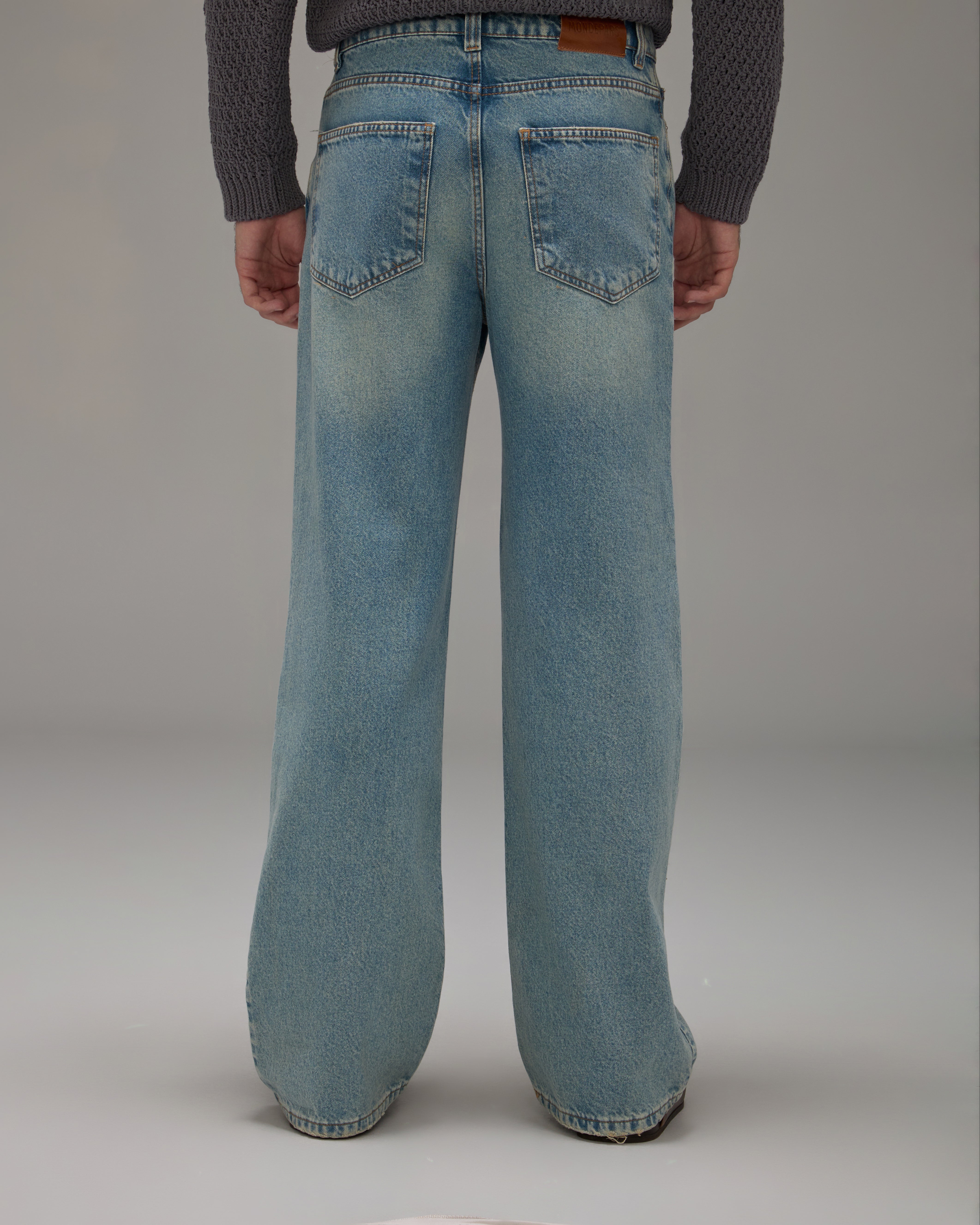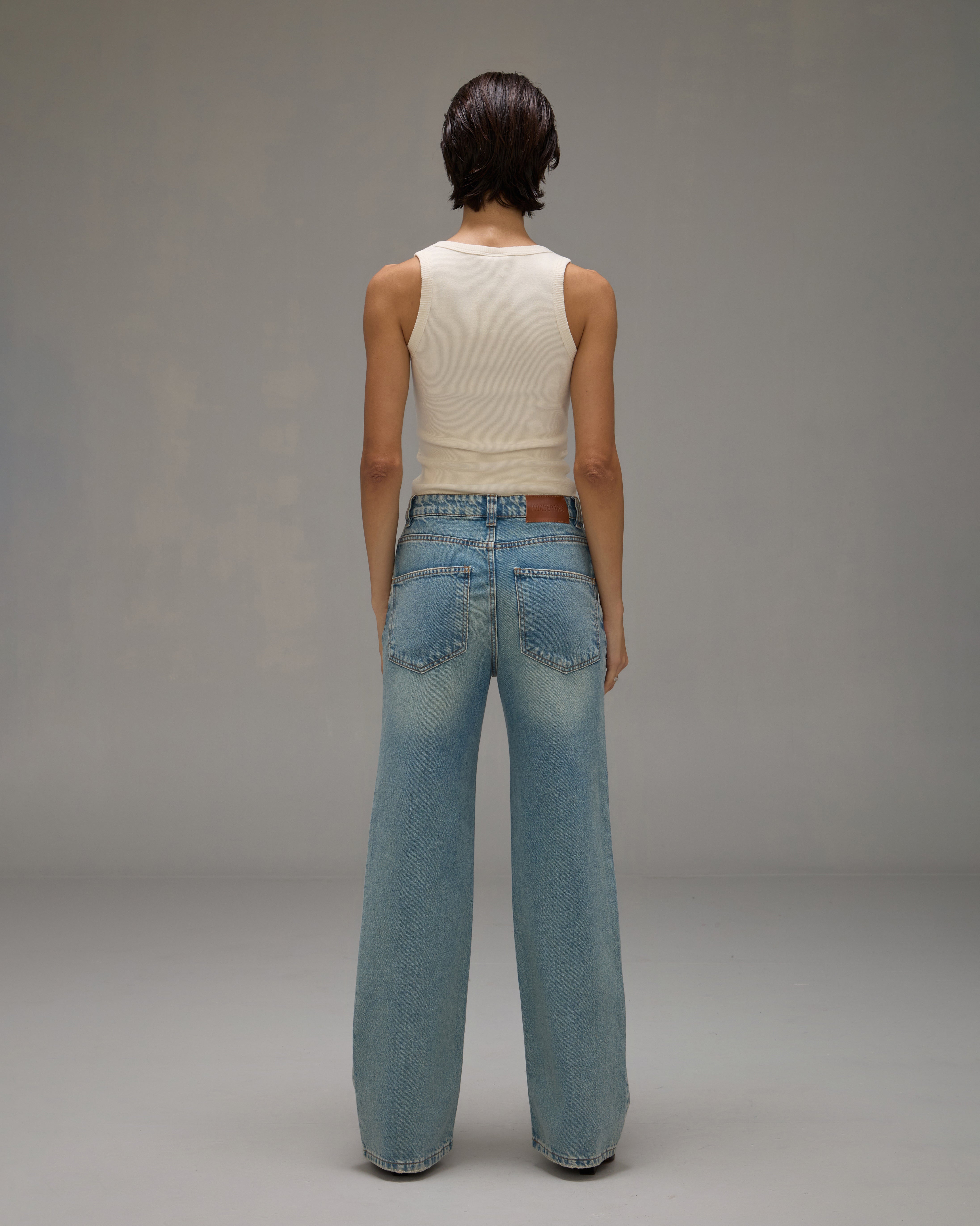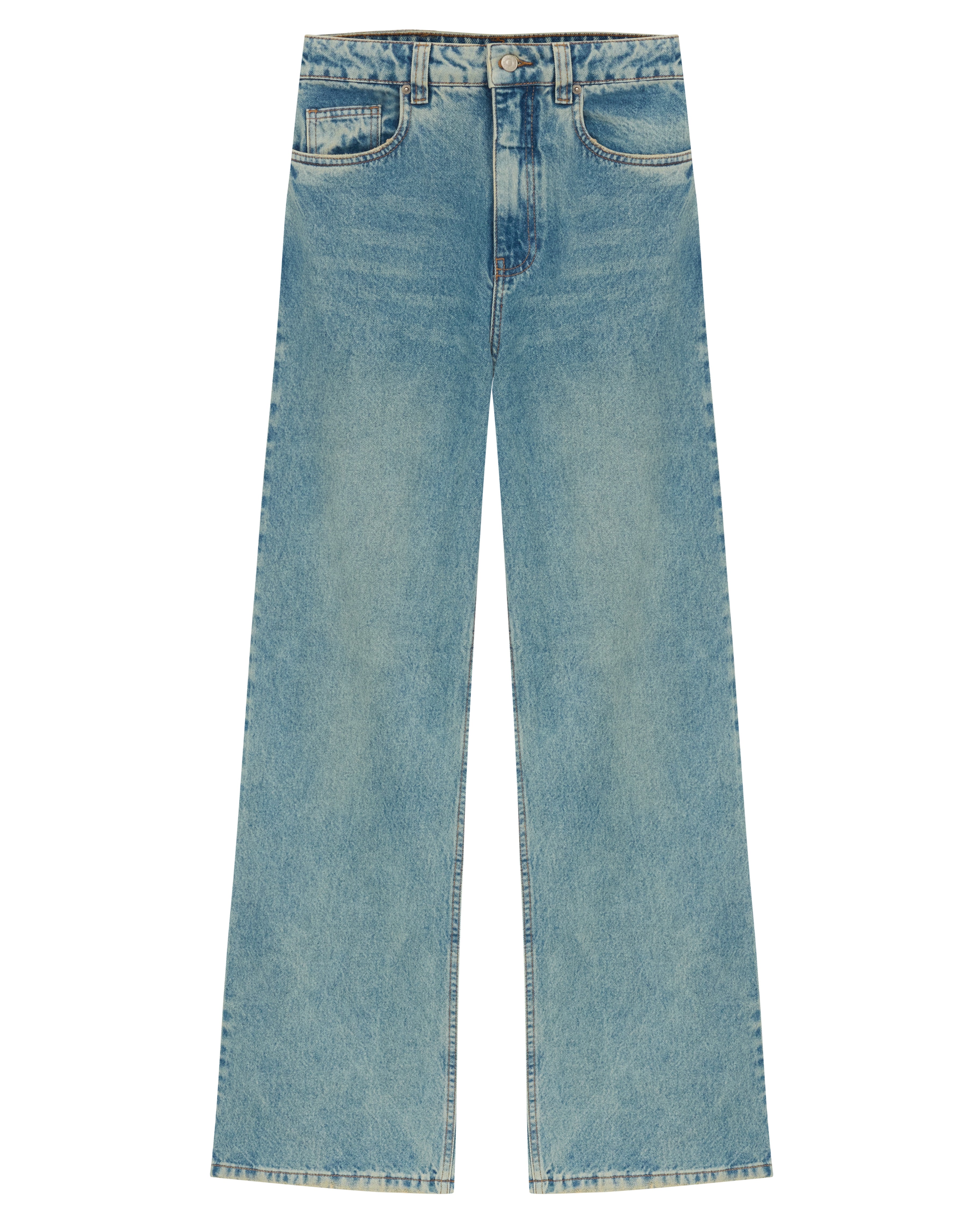 The Gal Pants is made of denim, have a flared fit, high waist, waistband with belt loops, front button and zipper closure, five pockets, brand label made of natural leather in discarded raw material and topstitched finish.