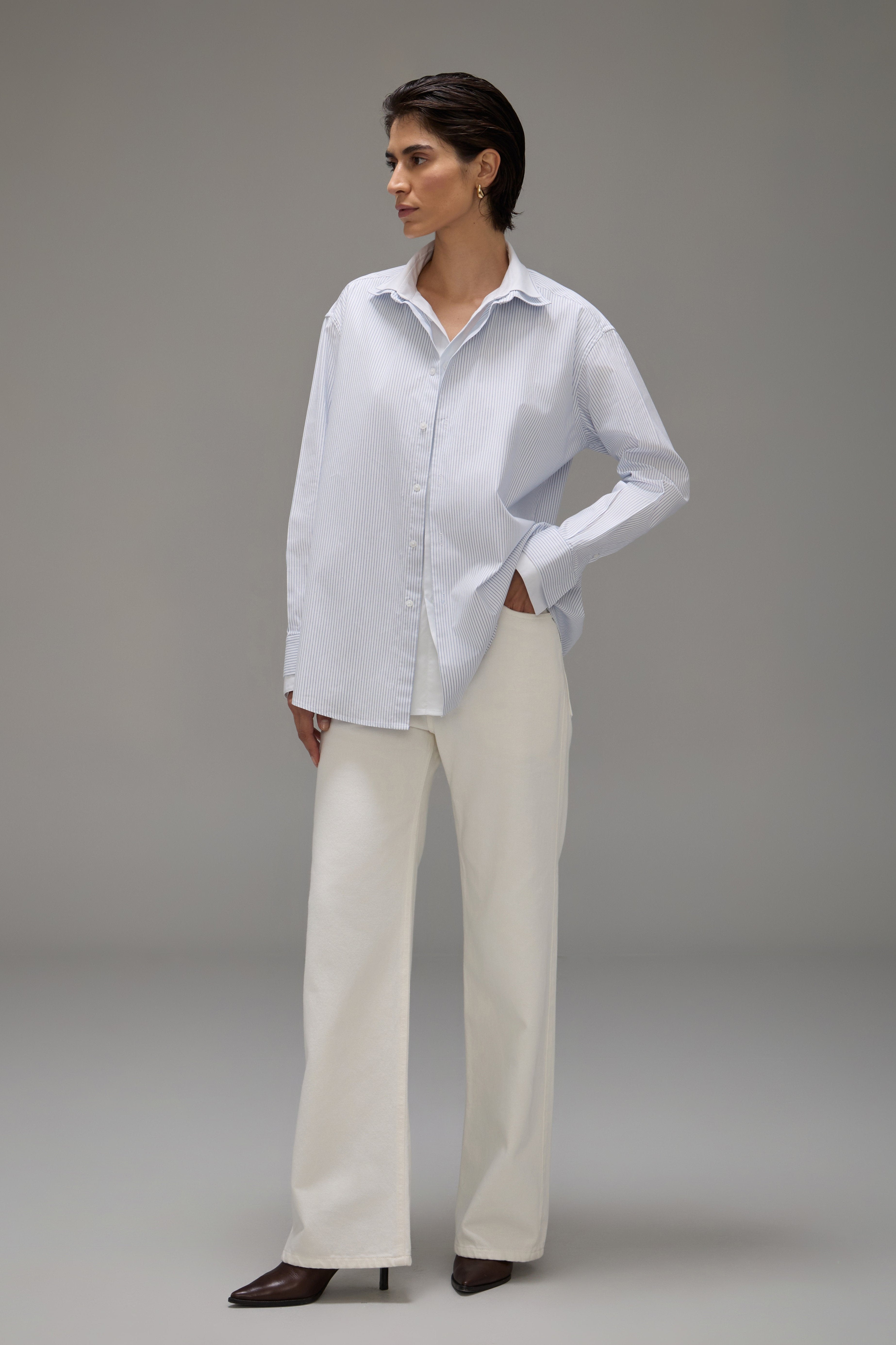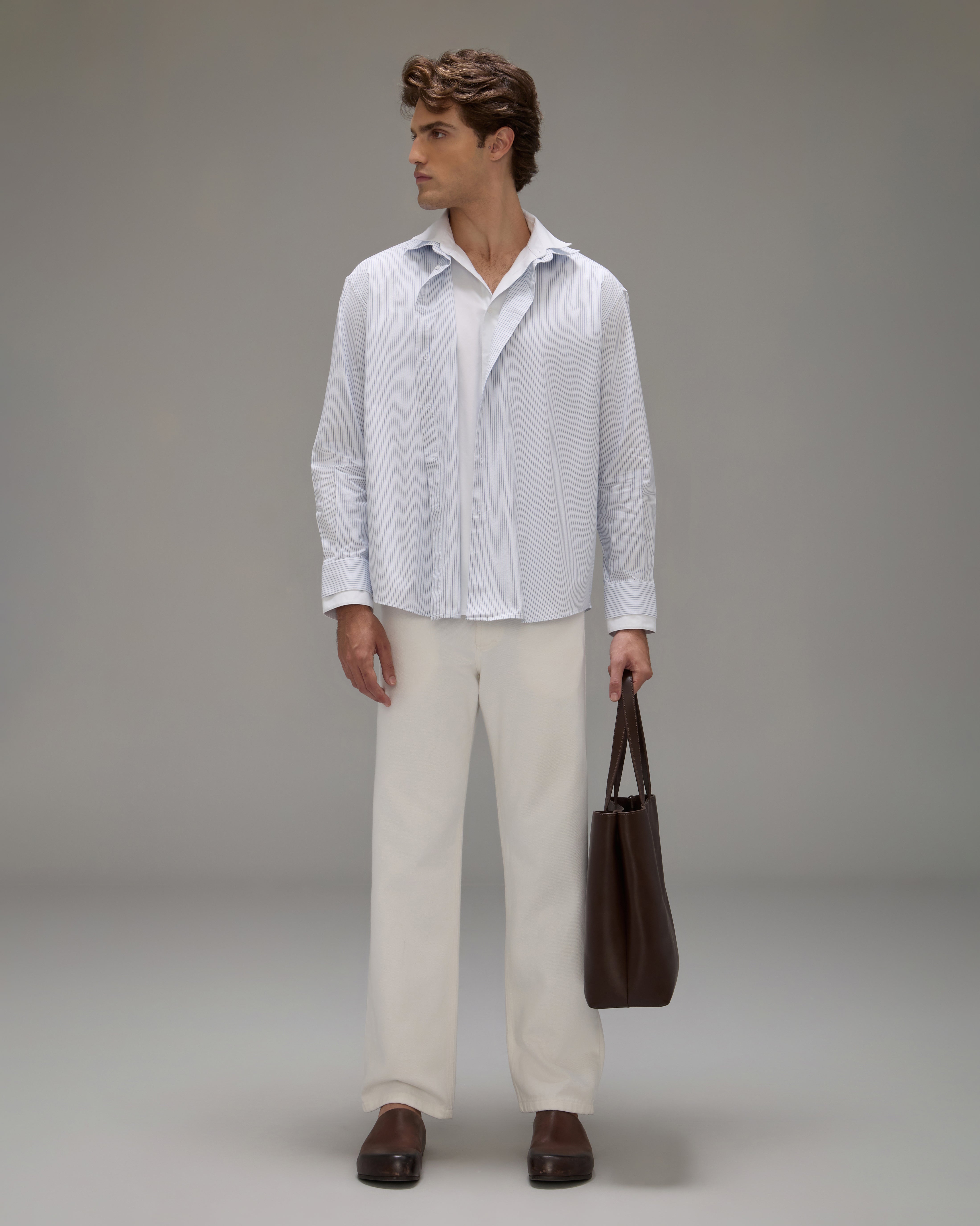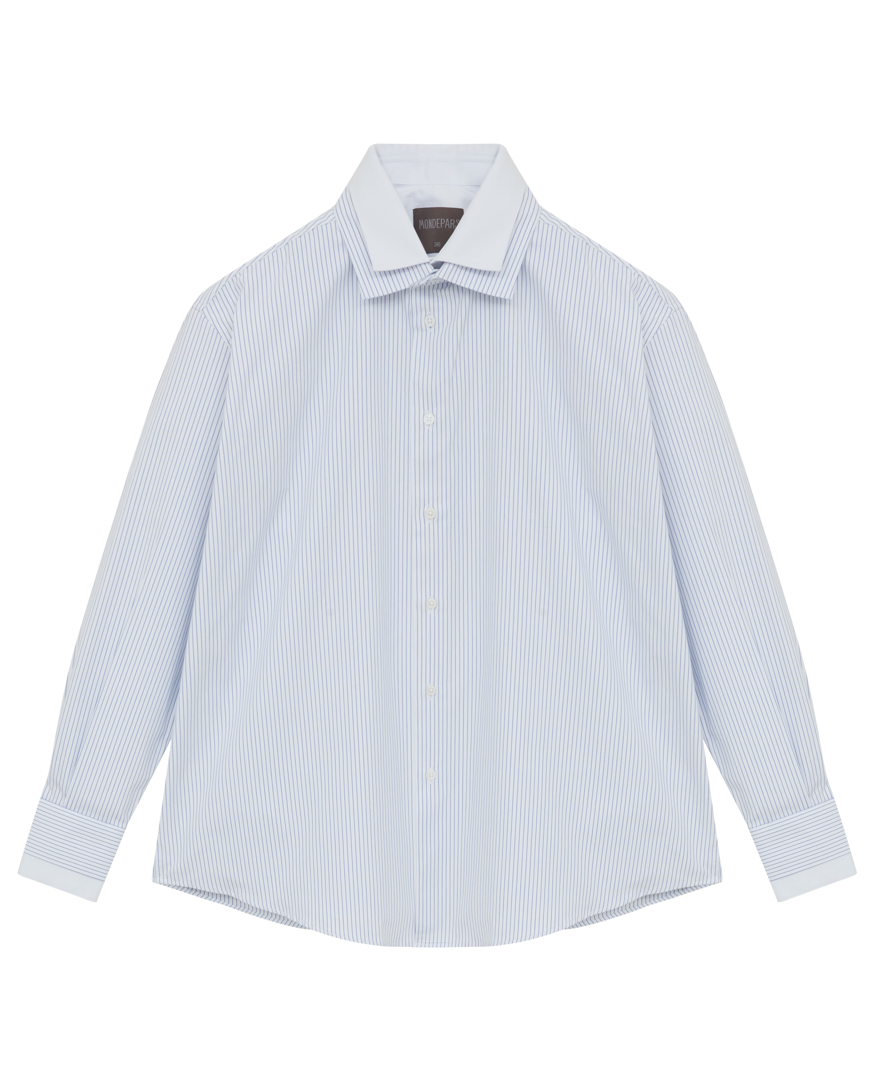 The Dua Shirt is made of poplin, has an external striped pattern, true-to-size fit, double collar, front closure with custom buttons, long sleeves, double-button cuffs, French seams and traditional finish.