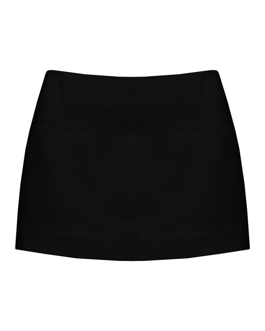 Crepe mini skirt with a low waist. It features faux front pockets and a back zipper closure.
