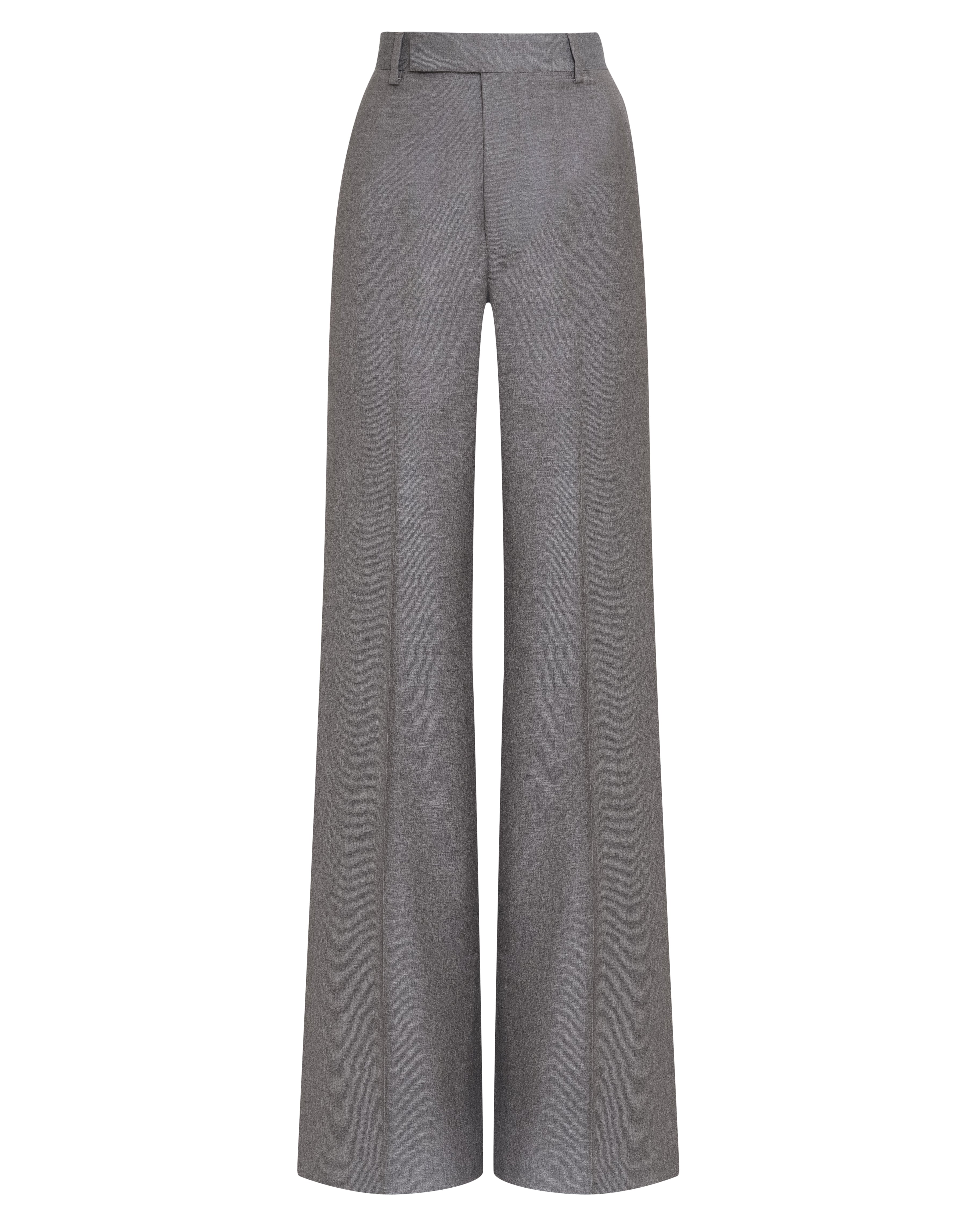 The Kai Pants are made from imported wool, have a tailored fit, a looser fit, a high waist, a waistband with belt loops, a front zipper closure, a vertical crease, two slash pockets on the sides, two welt pockets on the back, a built-in lining, an invisible hem, and traditional tailored interior finishes, with bias binding and chopped stitch.