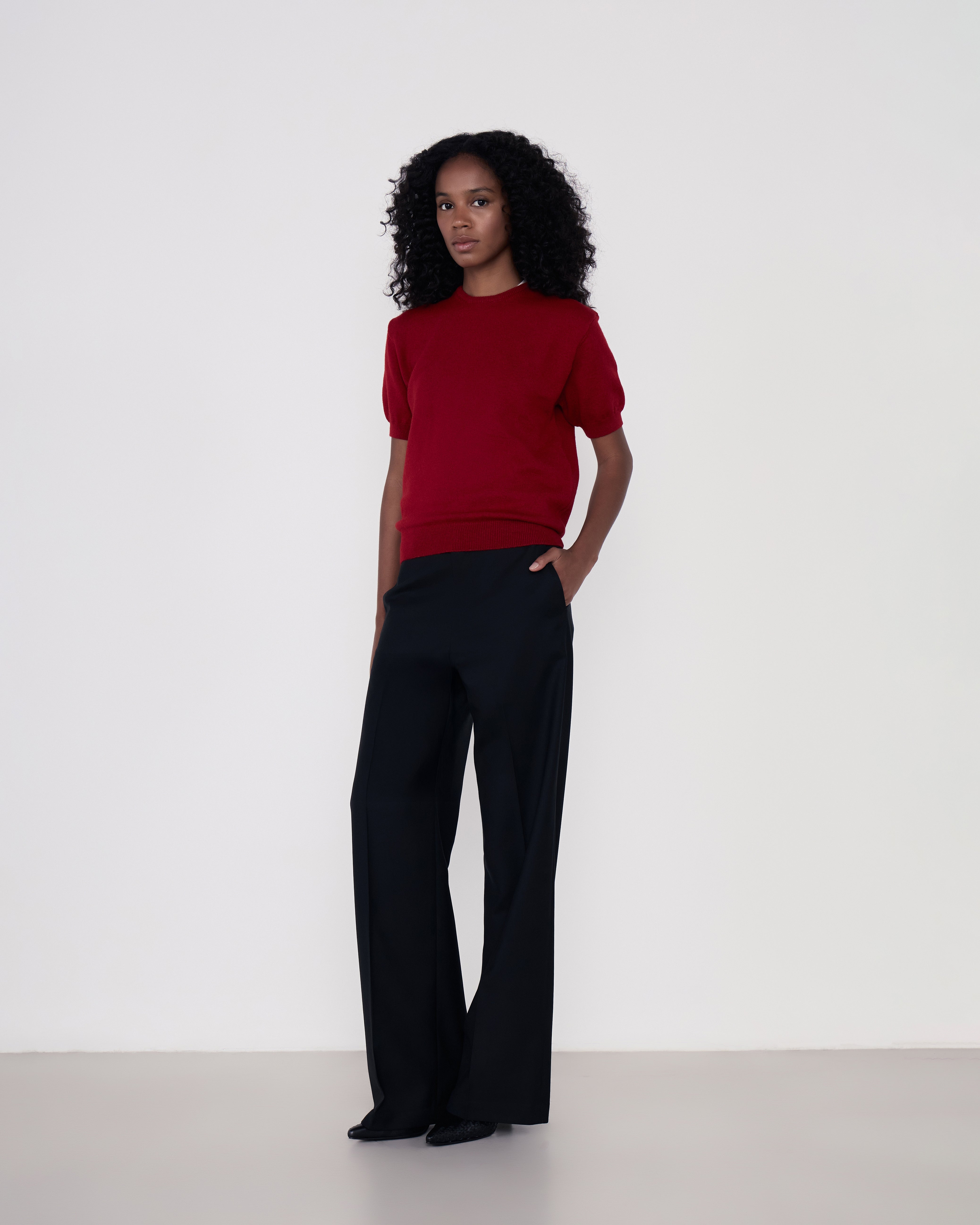 A Calça Kioko é confeccionada em lã importada, possui modelagem de alfaiataria, caimento mais solto, cintura alta, cós com passantes, fechamento frontal por zíper, vinco vertical, dois bolsos modelo faca nas laterais, dois bolsos embutidos posteriores, forro embutido, barra invisível e acabamentos internos de alfaiataria tradicional, com viés e ponto picado.