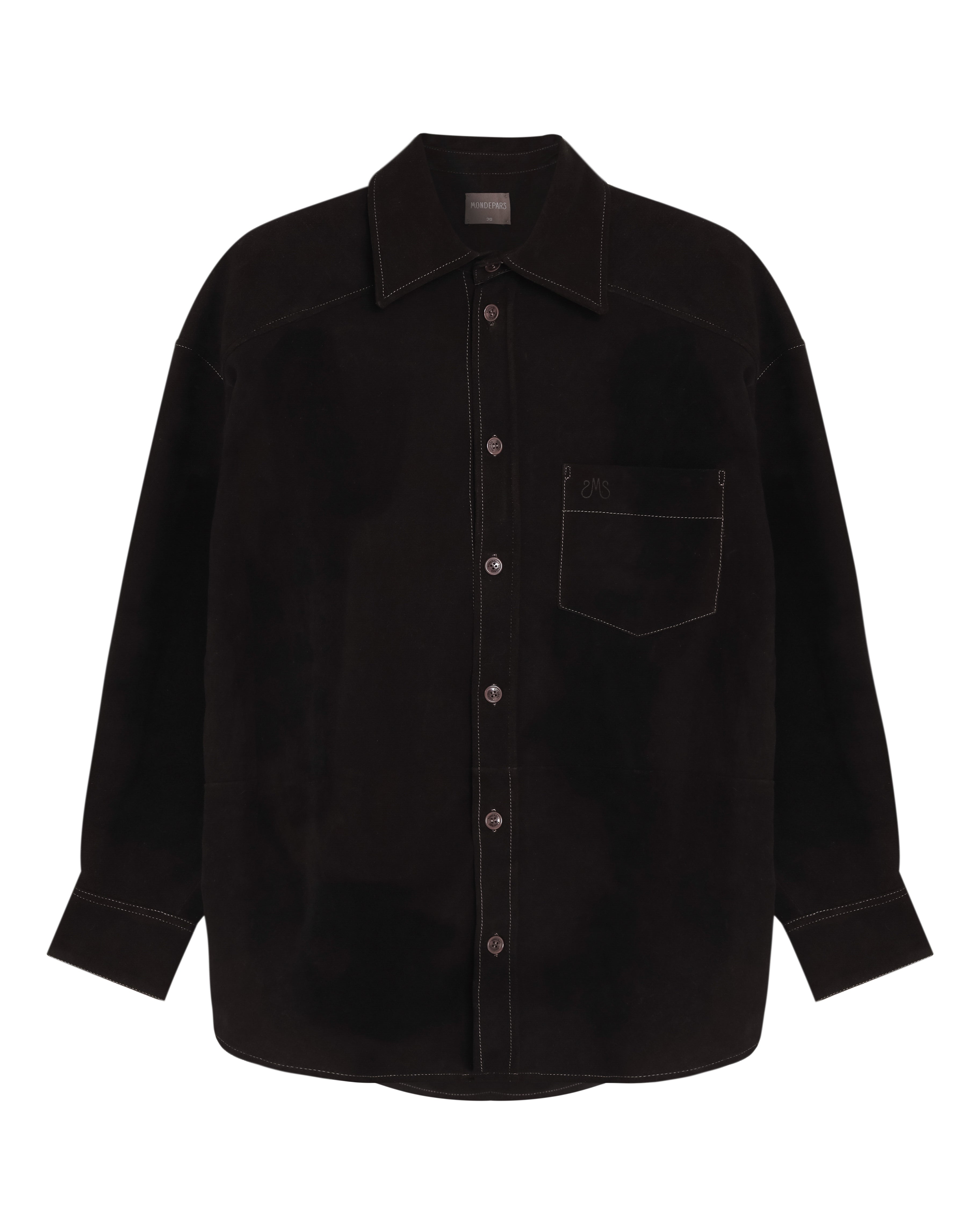 The Agnes Shirt is made from natural suede, has an oversized design, collar, front button closure, front pocket, long sleeves with double button cuffs and topstitched finish.