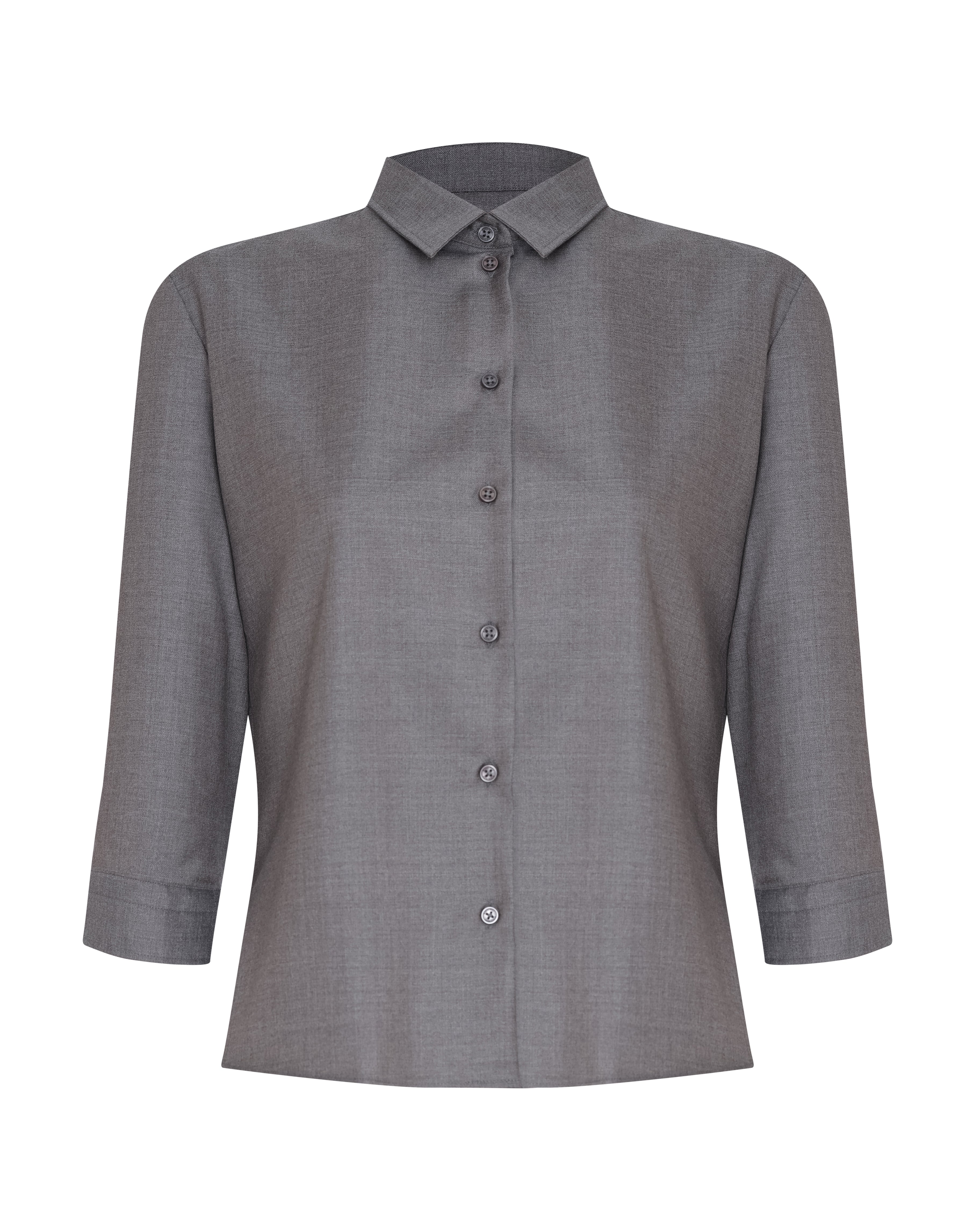The Regina Shirt is made of wool, has a fitted design, collar, front closure with personalized Mondepars buttons, 3/4 sleeves with double buttoning, hip length and topstitched finish.