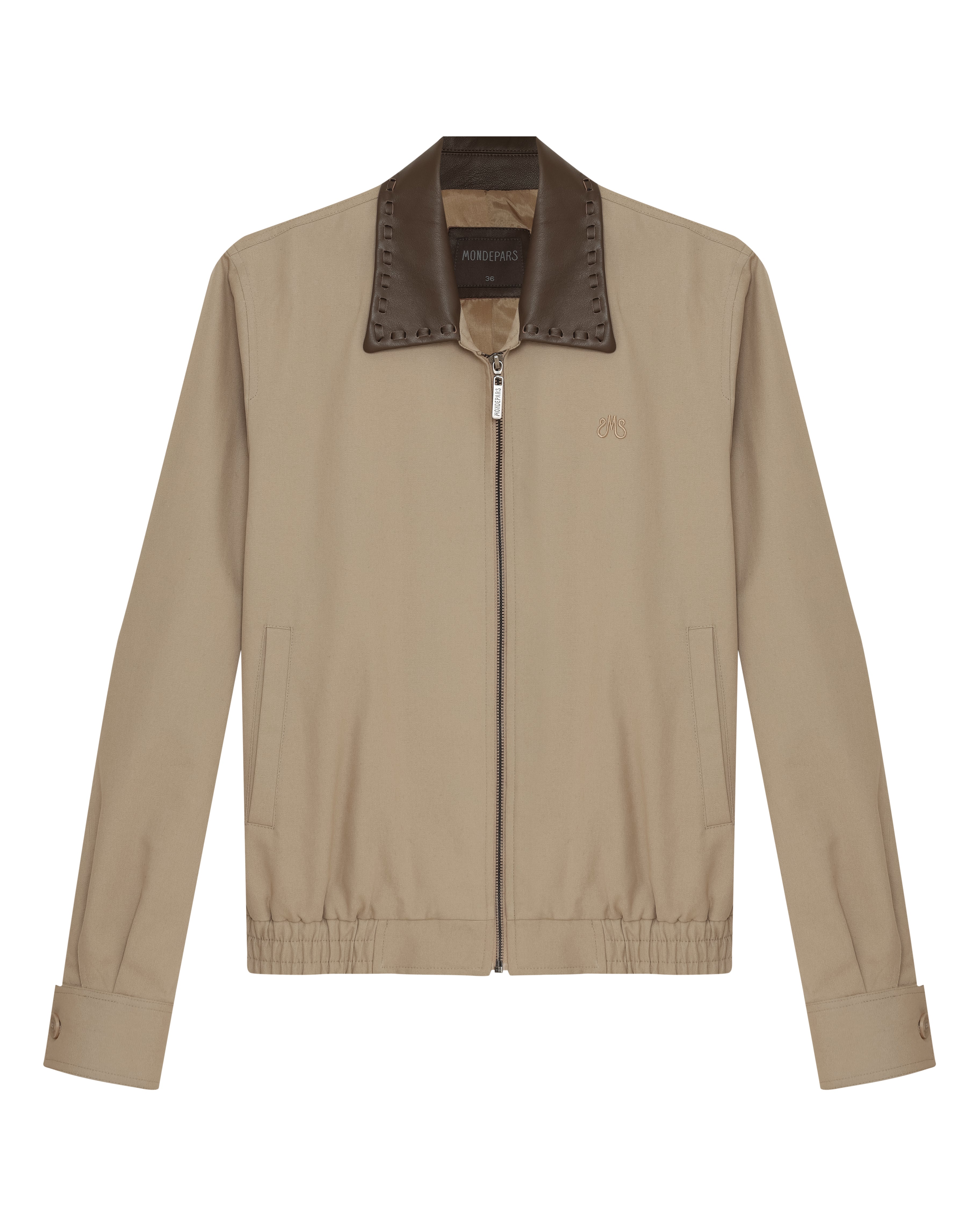 A Jaqueta Daniel é confeccionada em algodão, possui colarinho em couro, mangas longas com abotoamento nos punhos, fechamento frontal por zíper, dois bolsos, barra com elástico e acabamento pespontado.