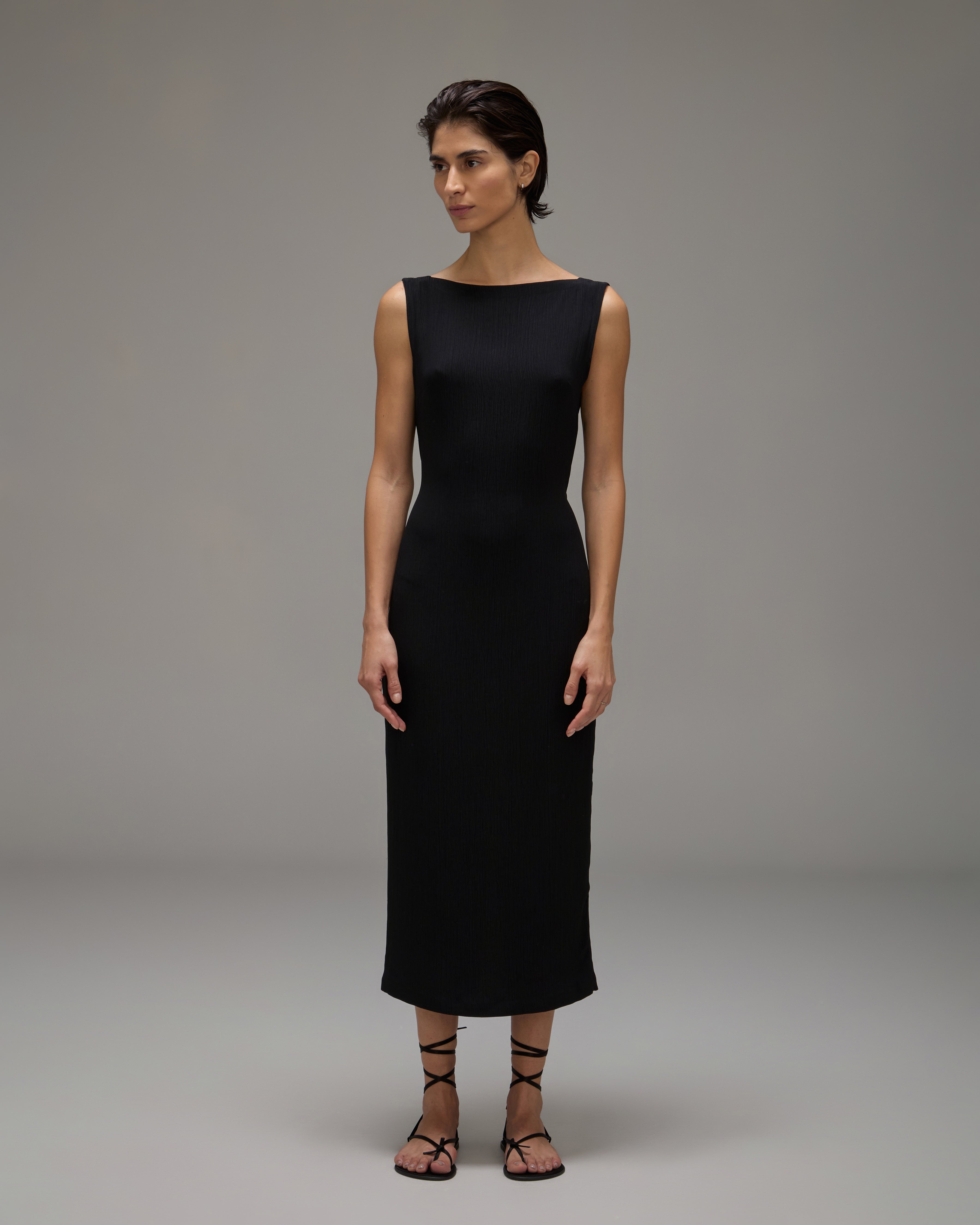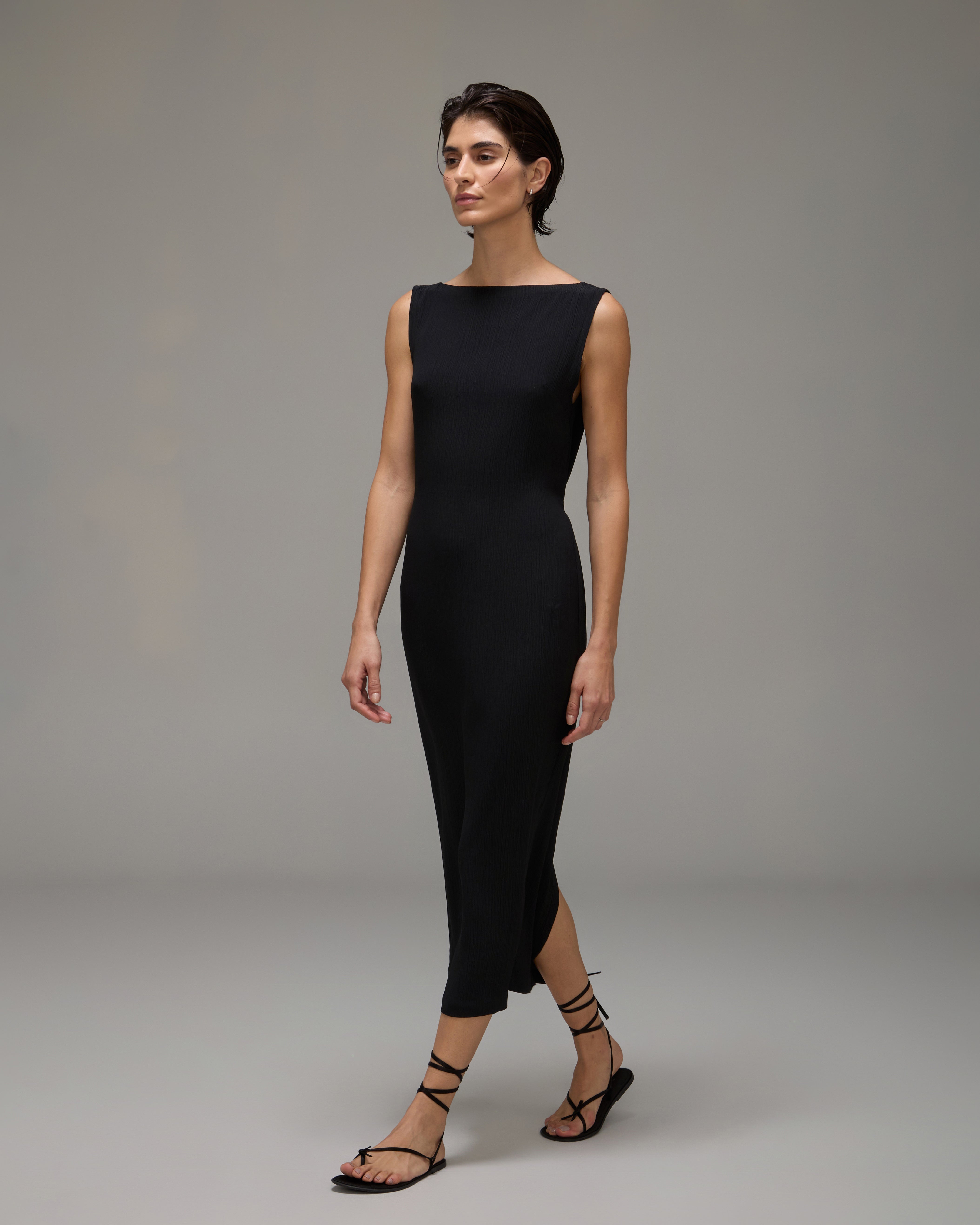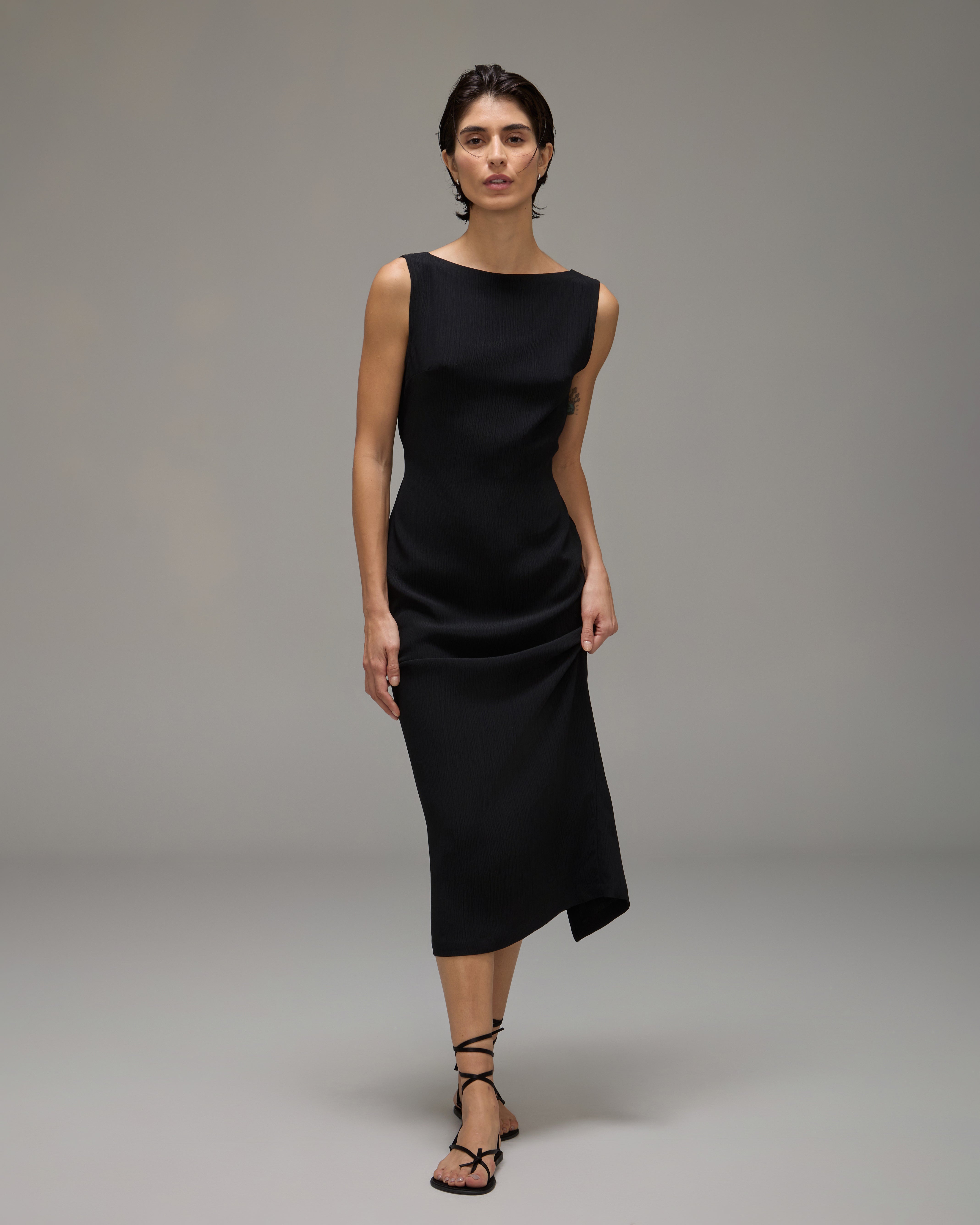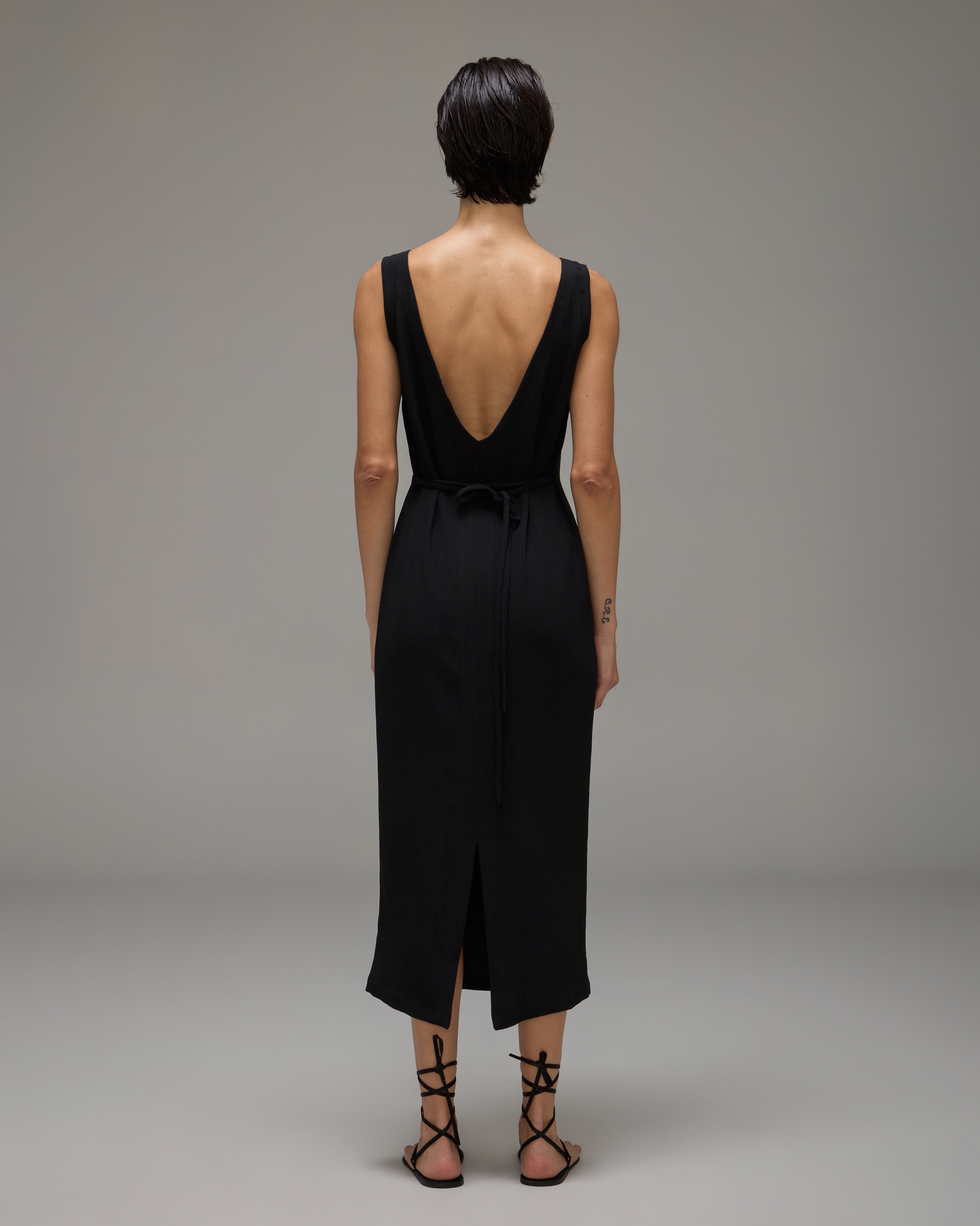 Dress made of textured crepe, with a straight neckline at the front and a deeper neckline at the back. Finished with a revealing slit and a roll-up back to cinch the waist.