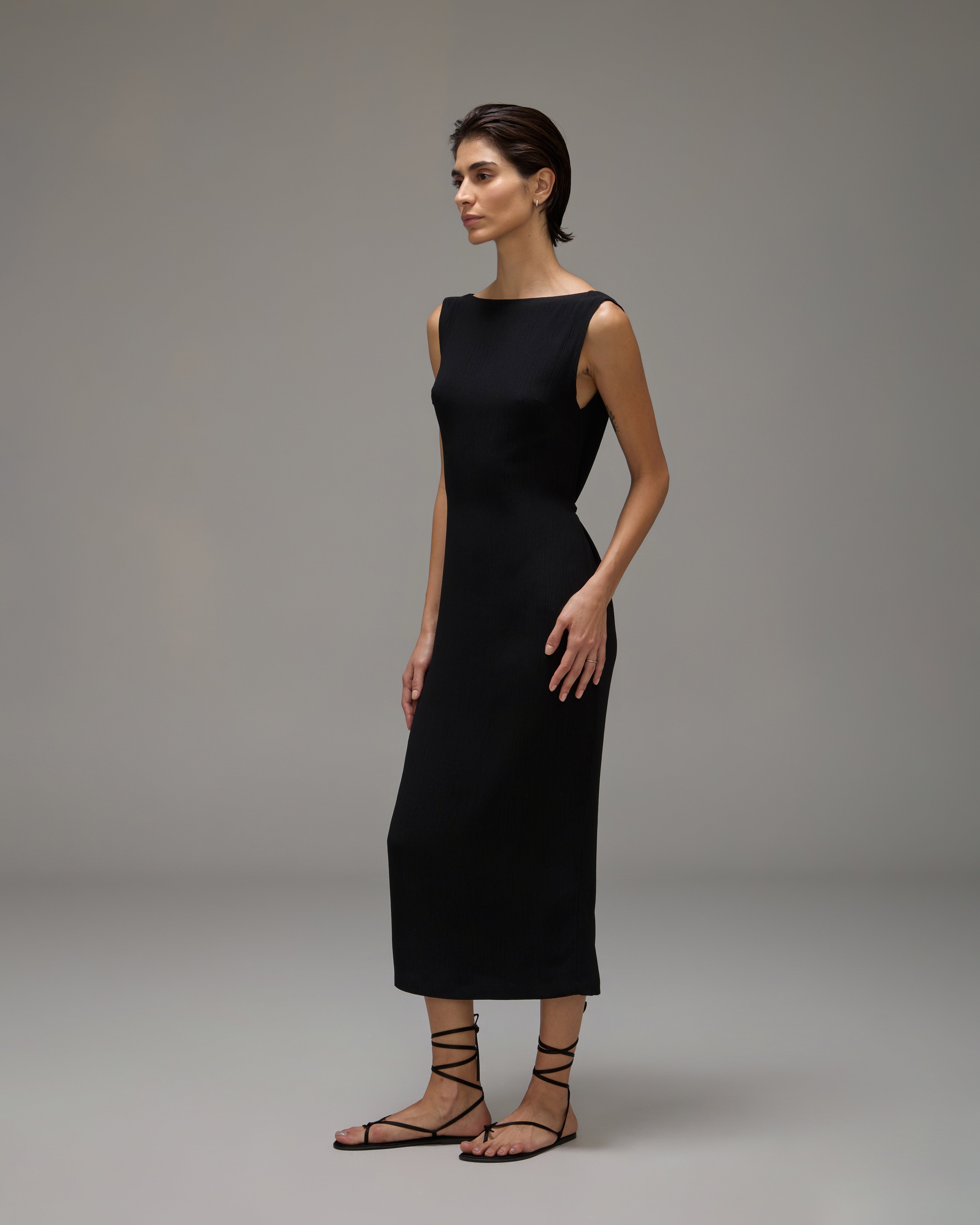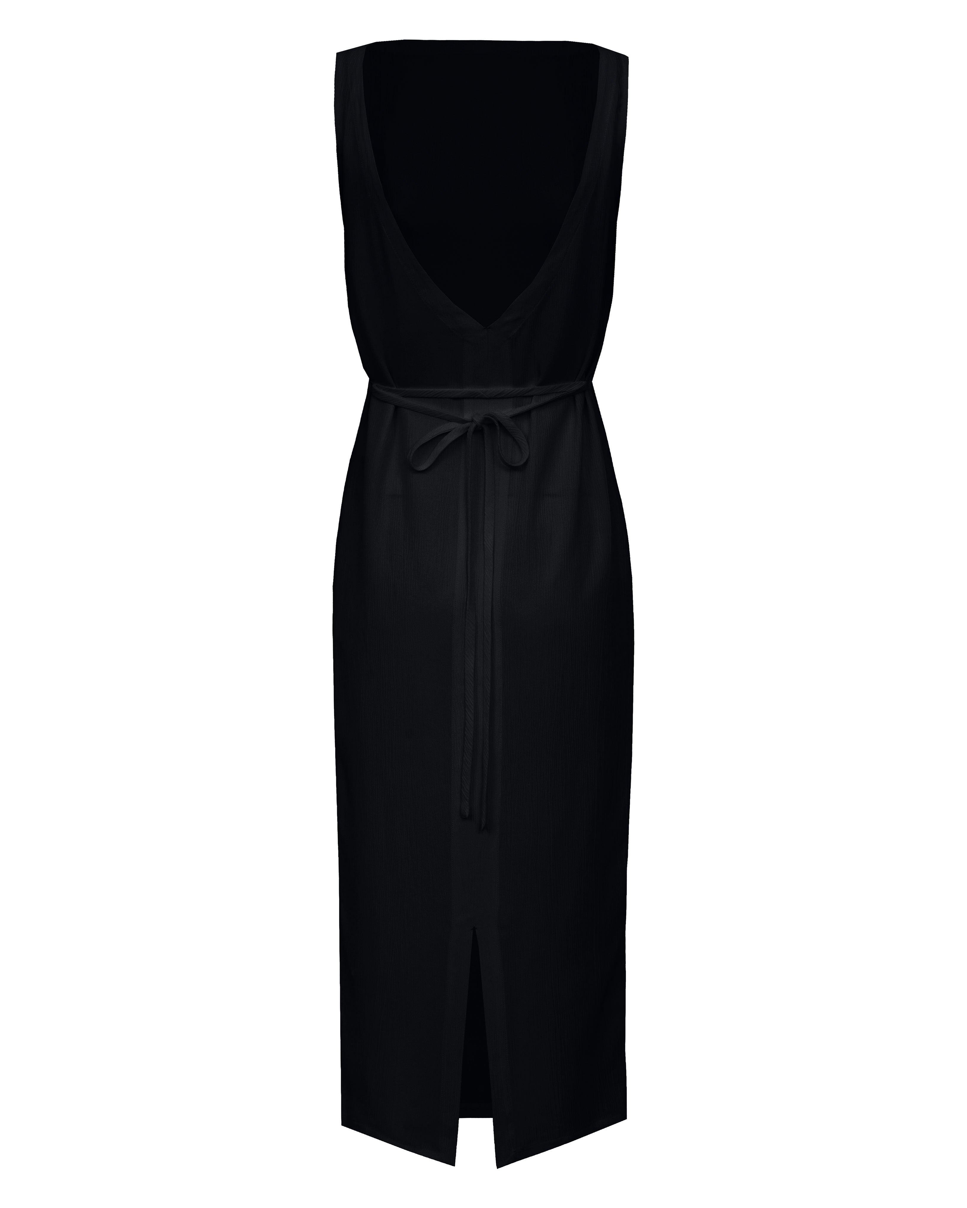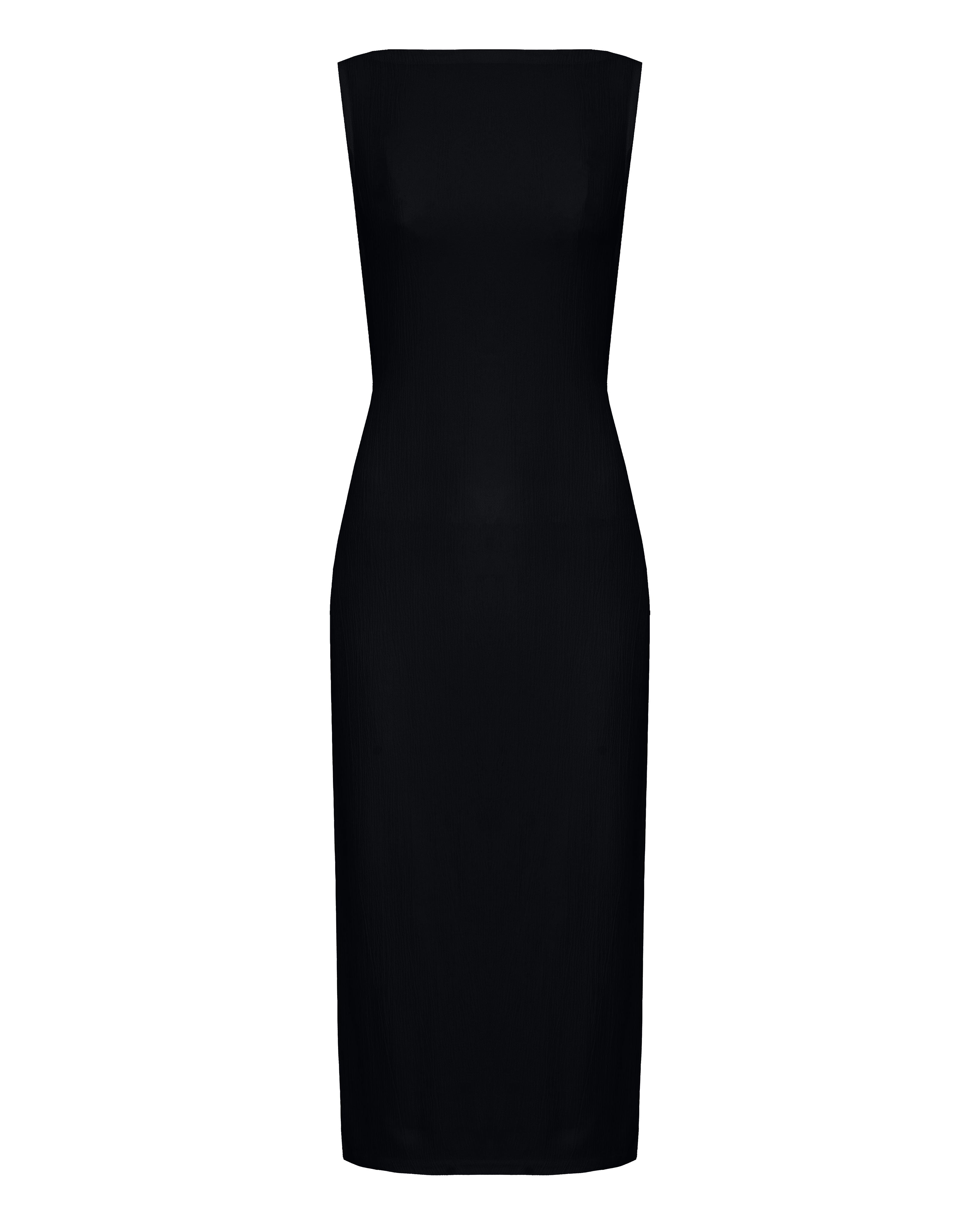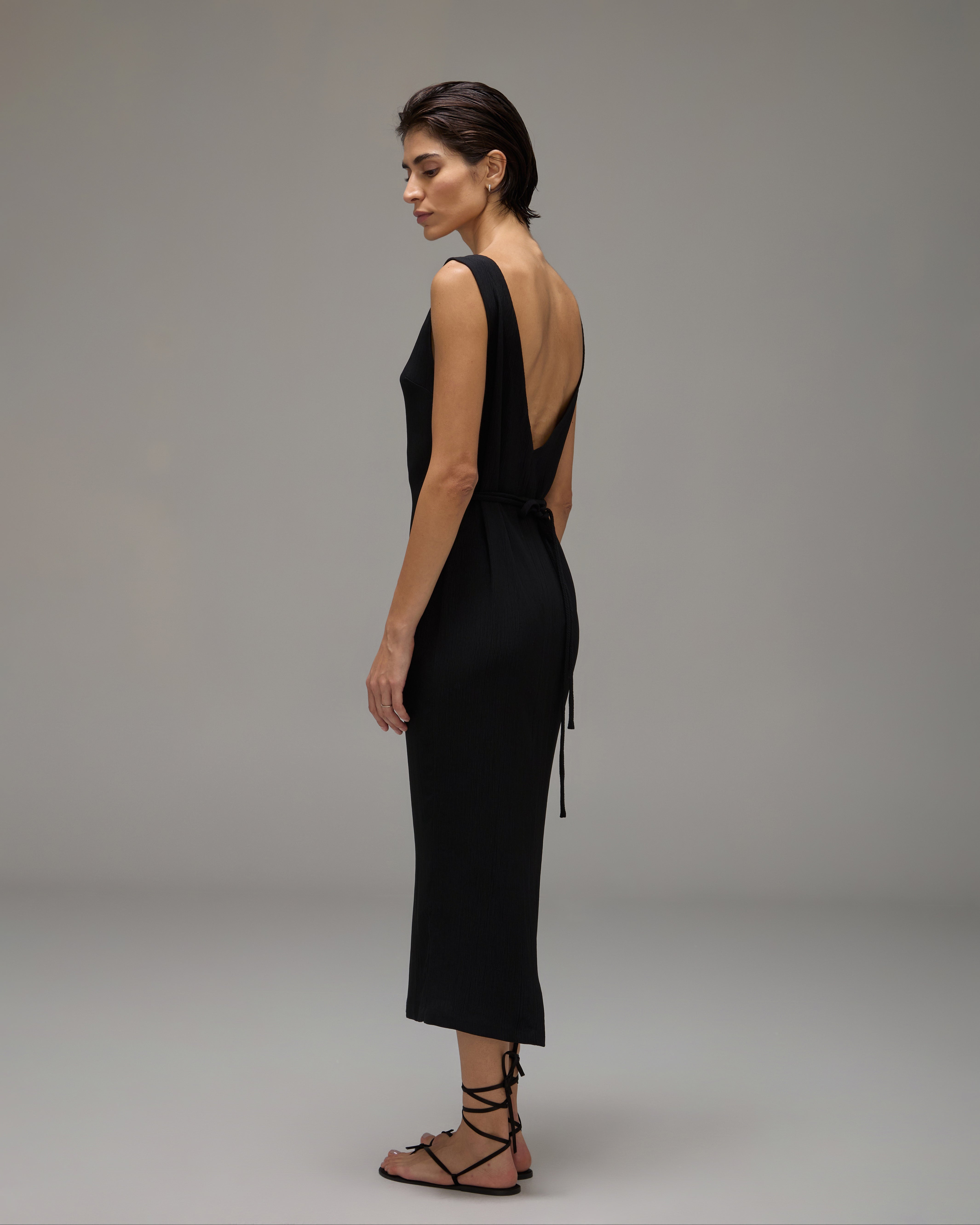 Dress made of textured crepe, with a straight neckline at the front and a deeper neckline at the back. Finished with a revealing slit and a roll-up back to cinch the waist.