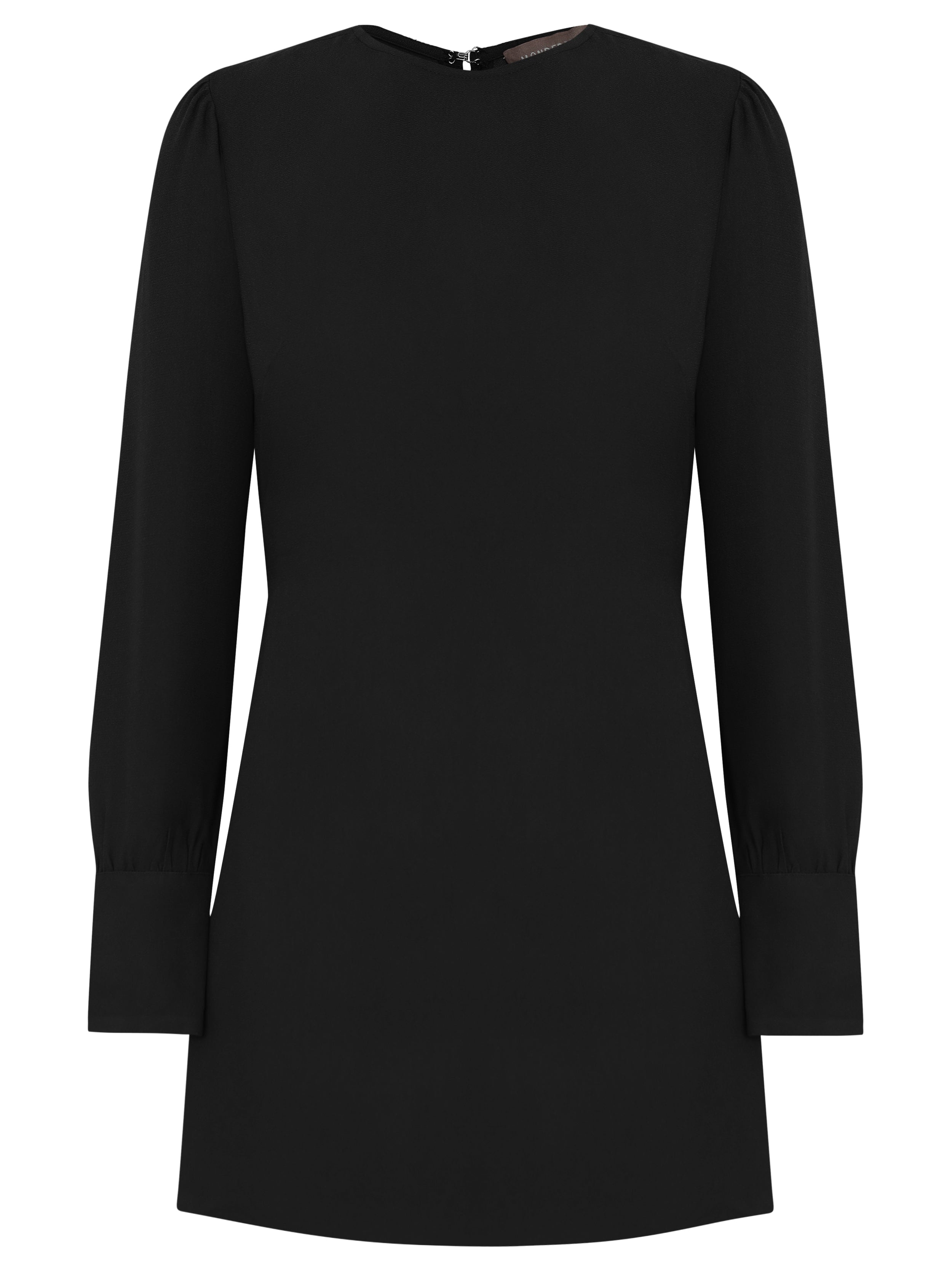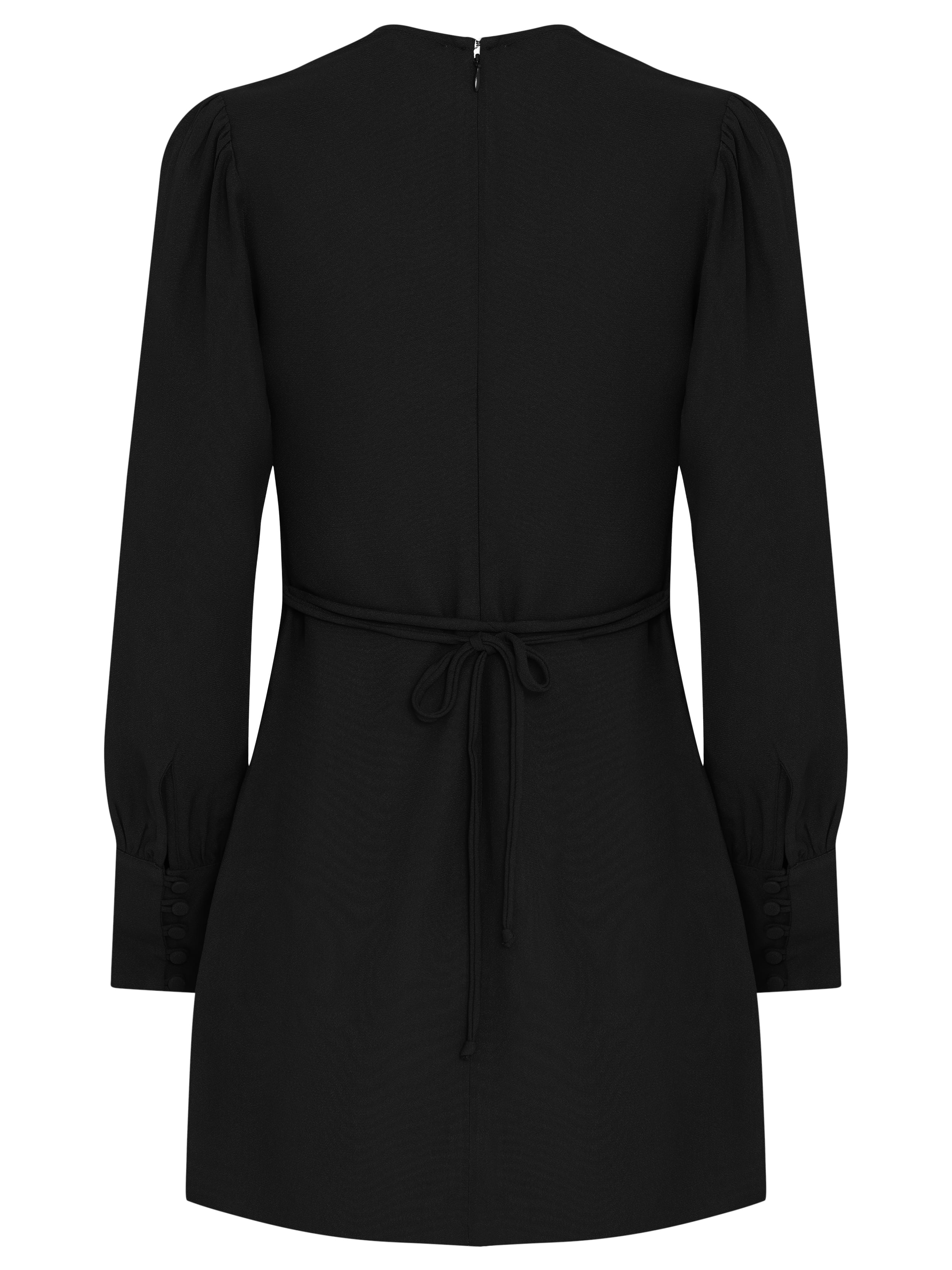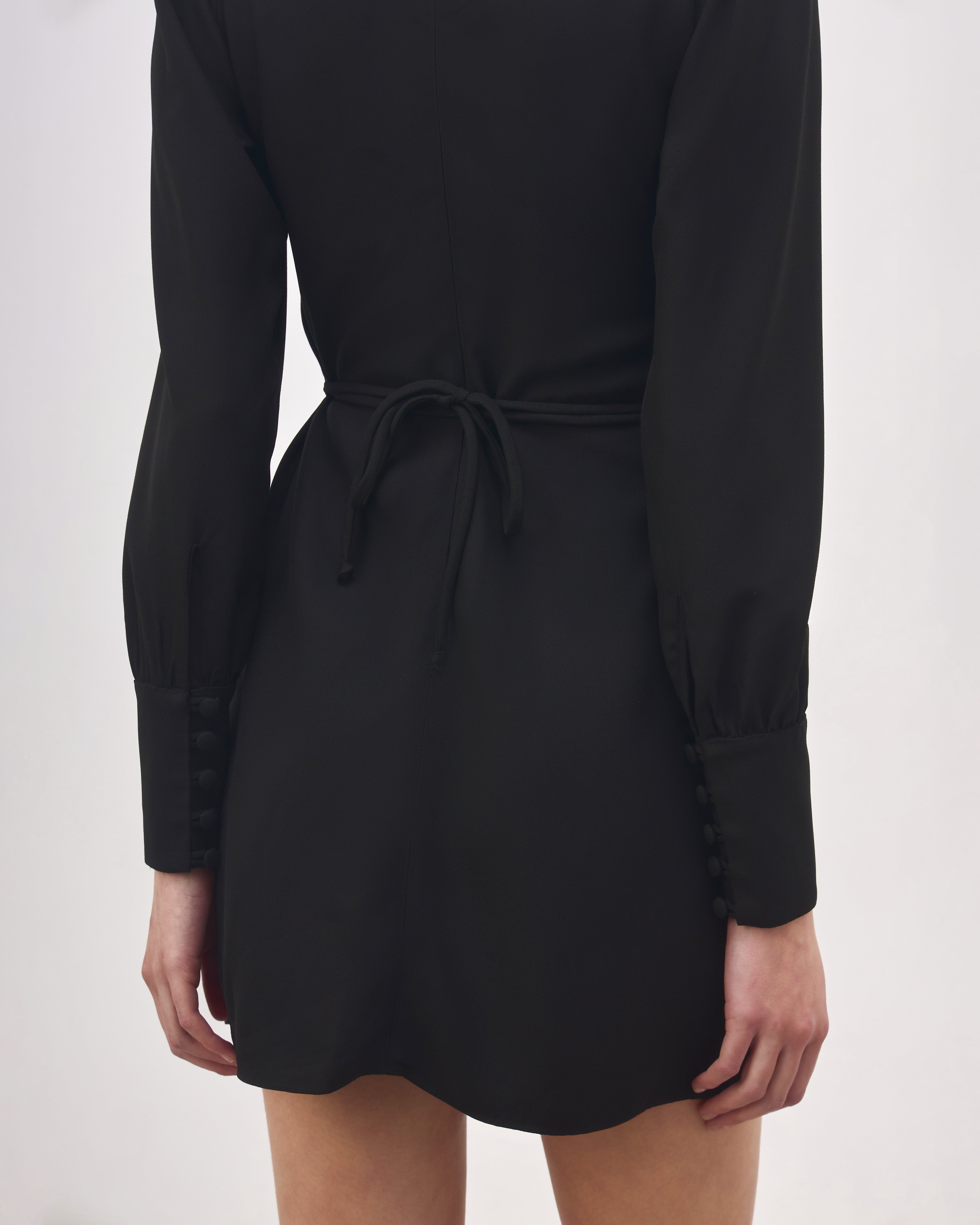 The Inês Dress is made of acetate and viscose-based fabric, bringing lightness and fluidity to the look, has a fitted fit, round neck, long, slightly puffed sleeves, cuffs with covered button closure, drawstring in the same fabric for tying at the back, invisible zipper closure at the back and short length.