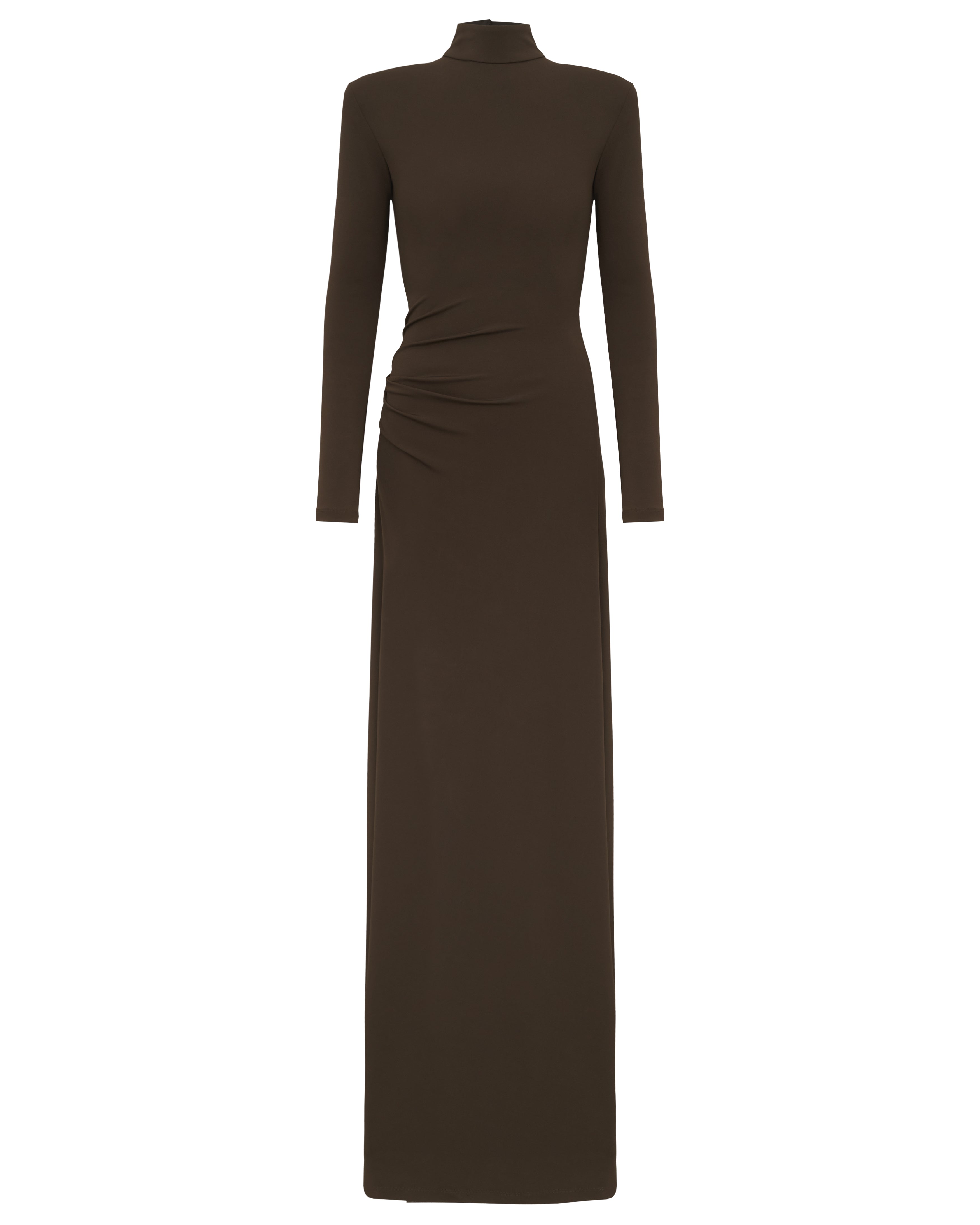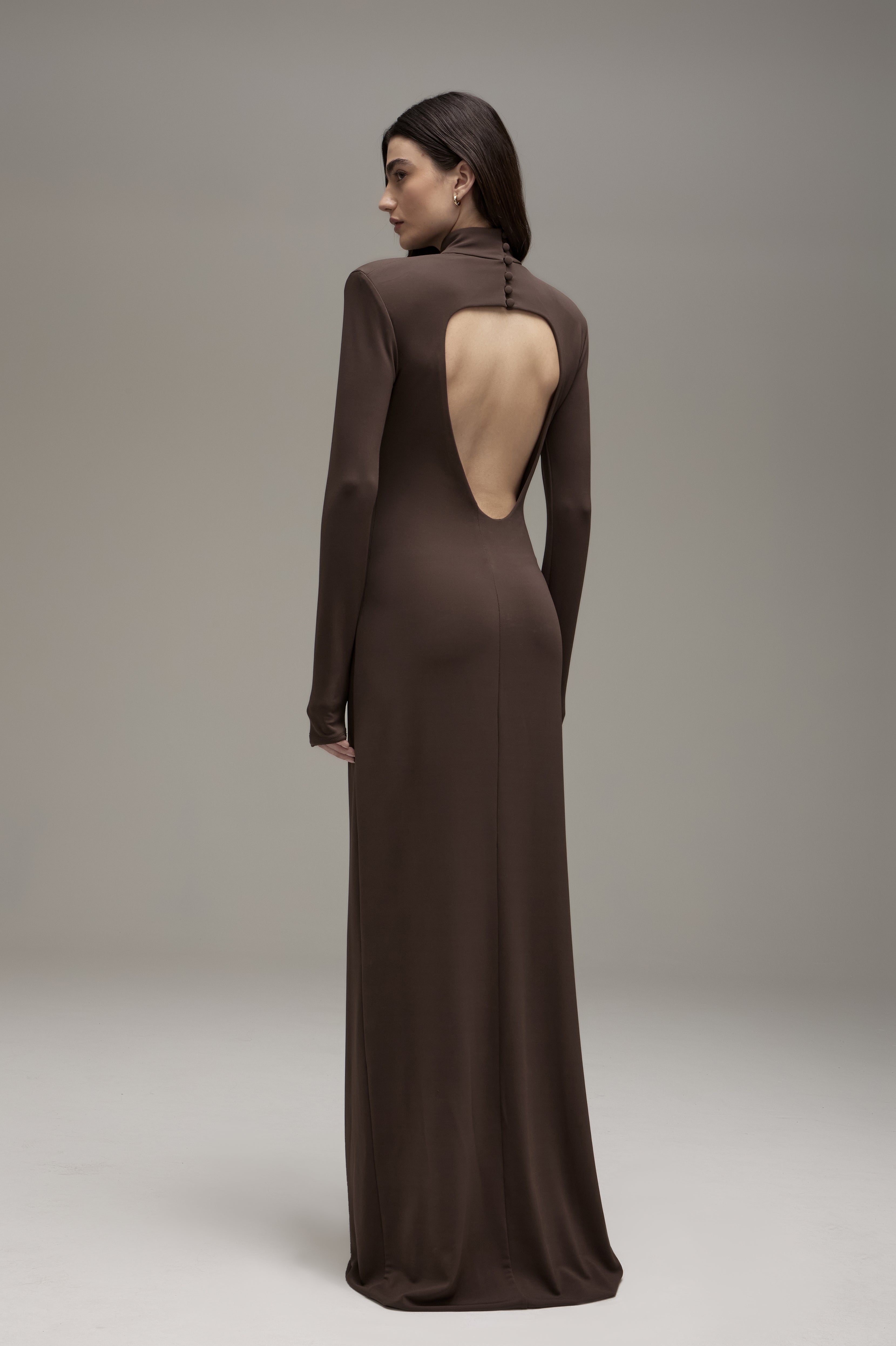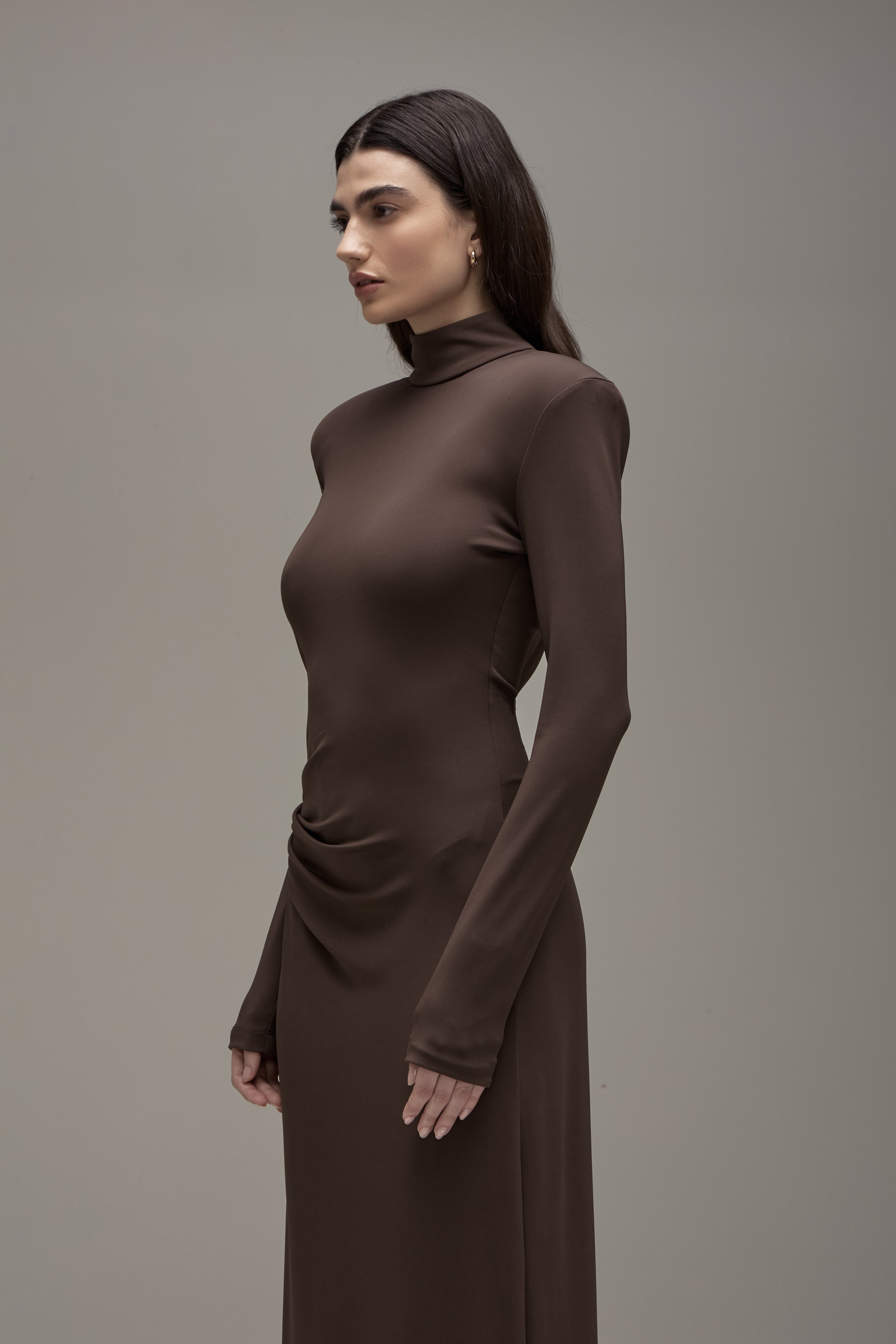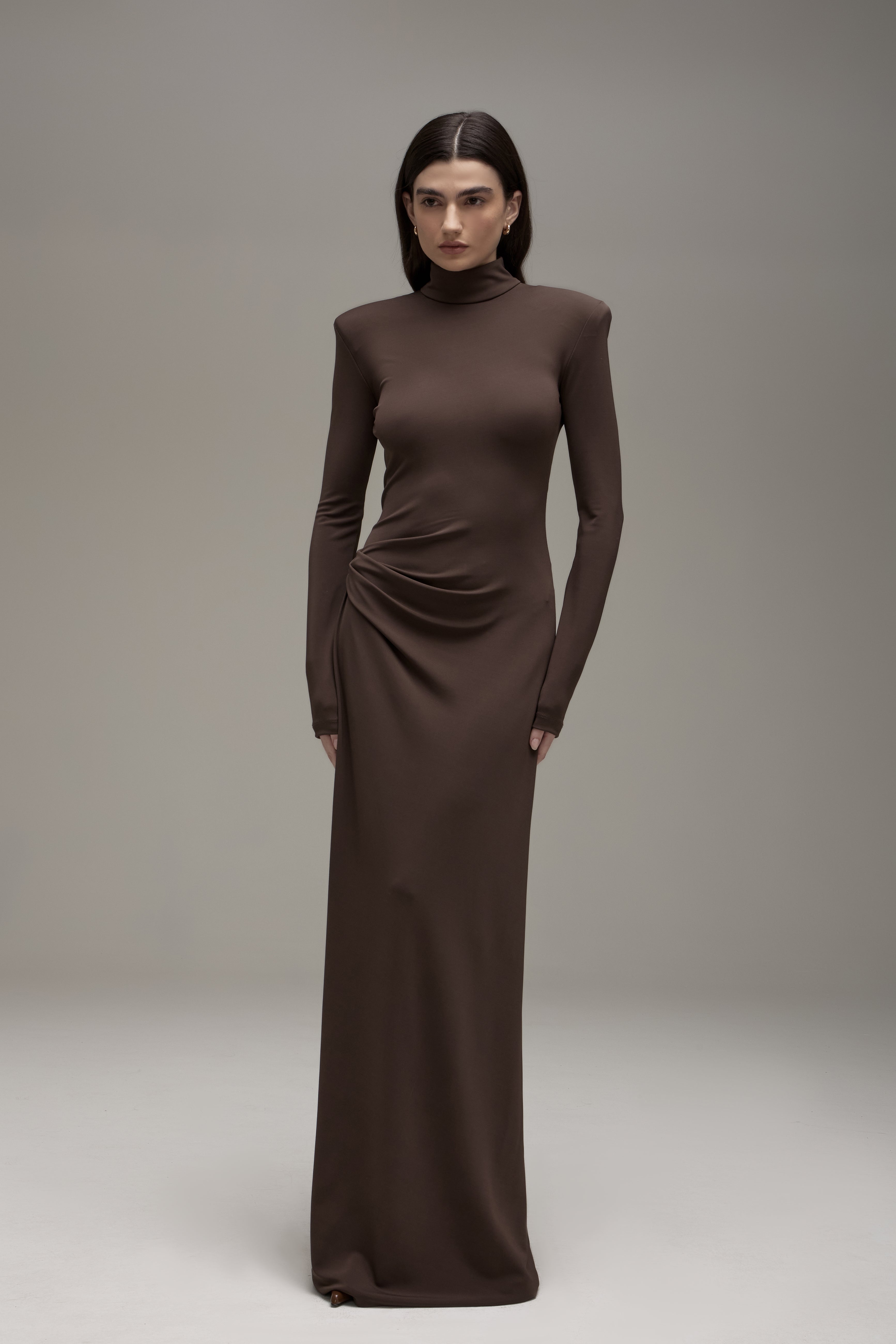 Dress made of jersey fabric with a crepe feel. It features well-structured shoulders with draped detailing at the hips. It closes at the back with buttons and silk tassels.