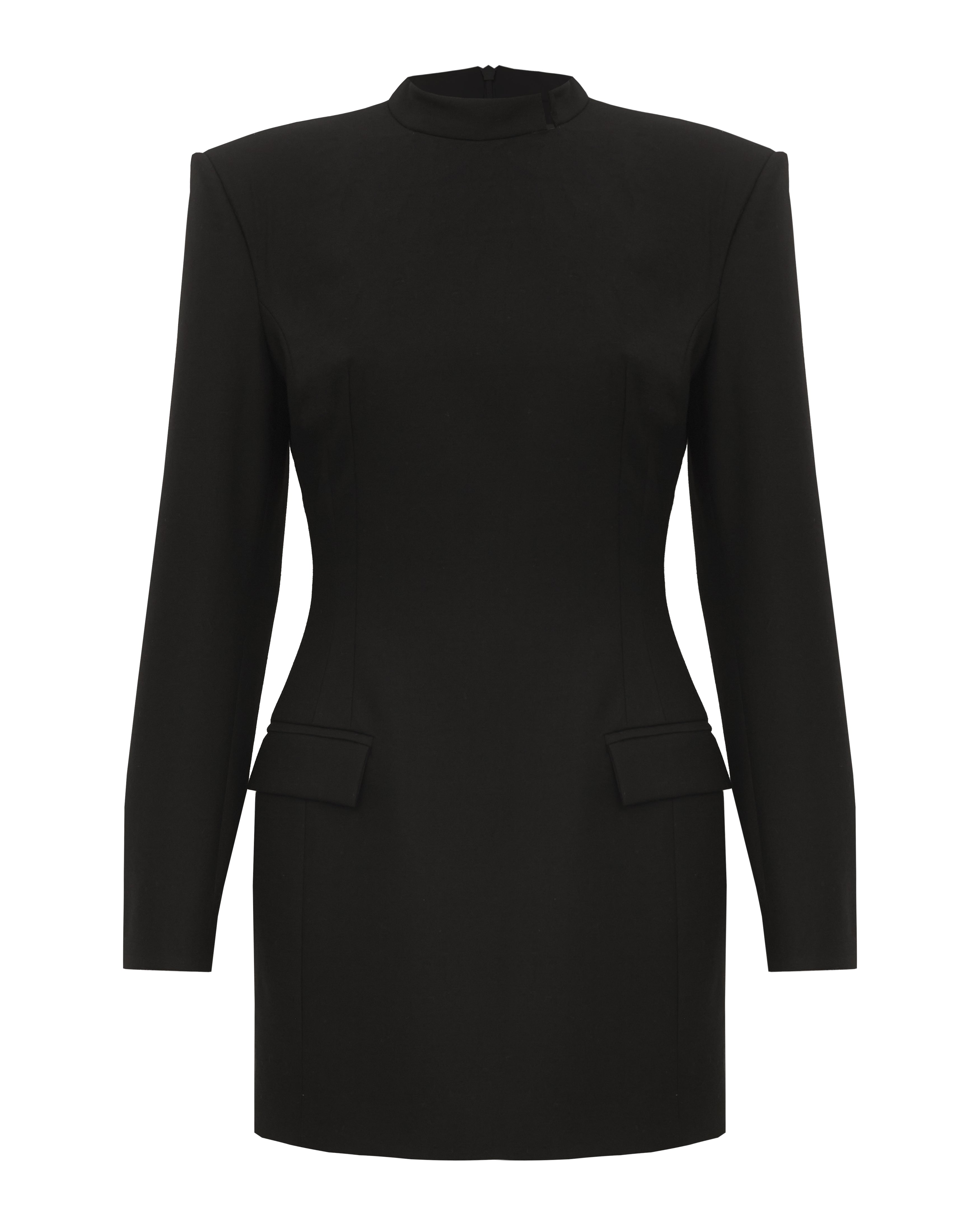 A dress with structured shoulders and a high collar, featuring a back zipper closure. Made of wool fabric with a tailored lining. The piece features an oversized fit at the shoulders, which falls to the waist.