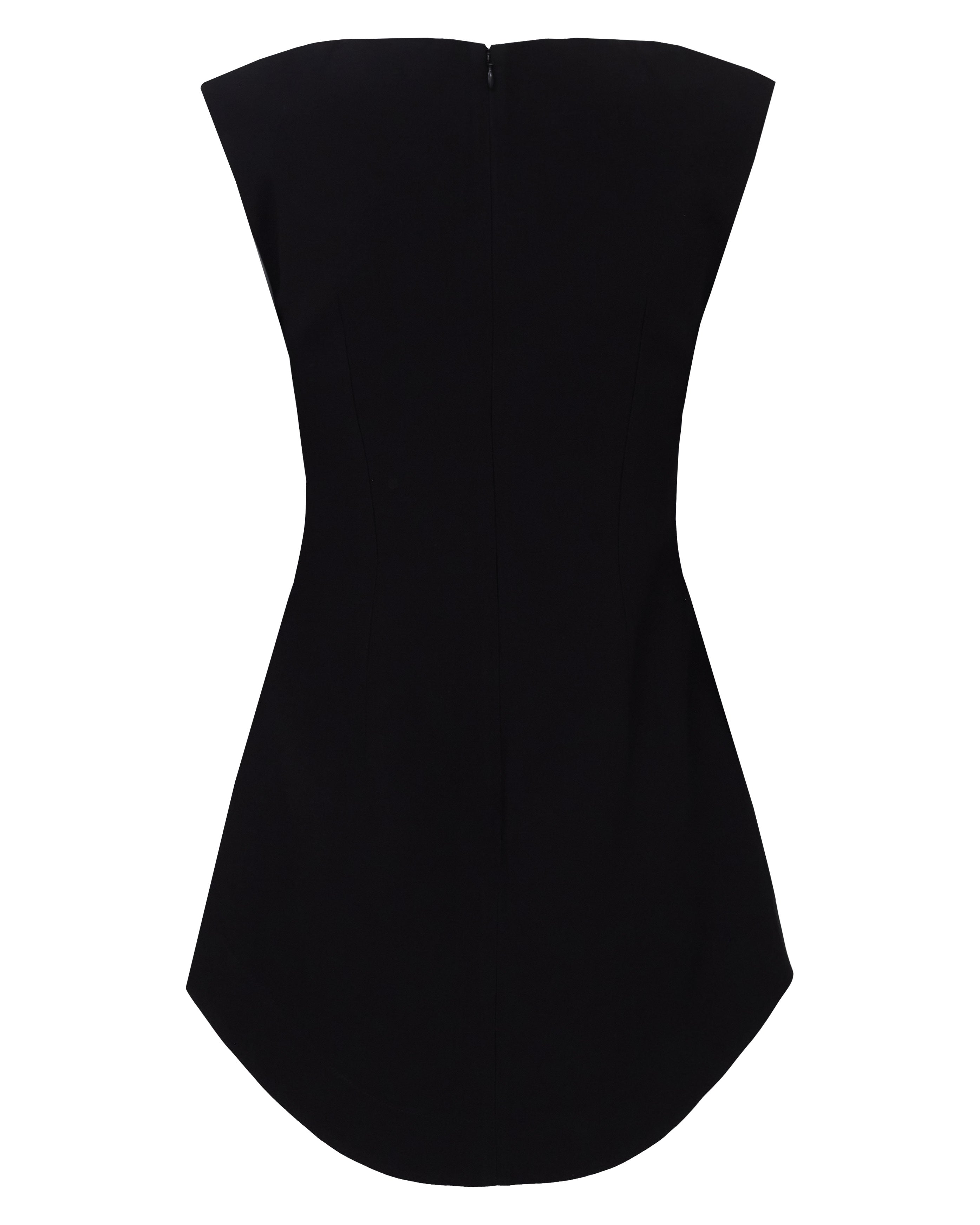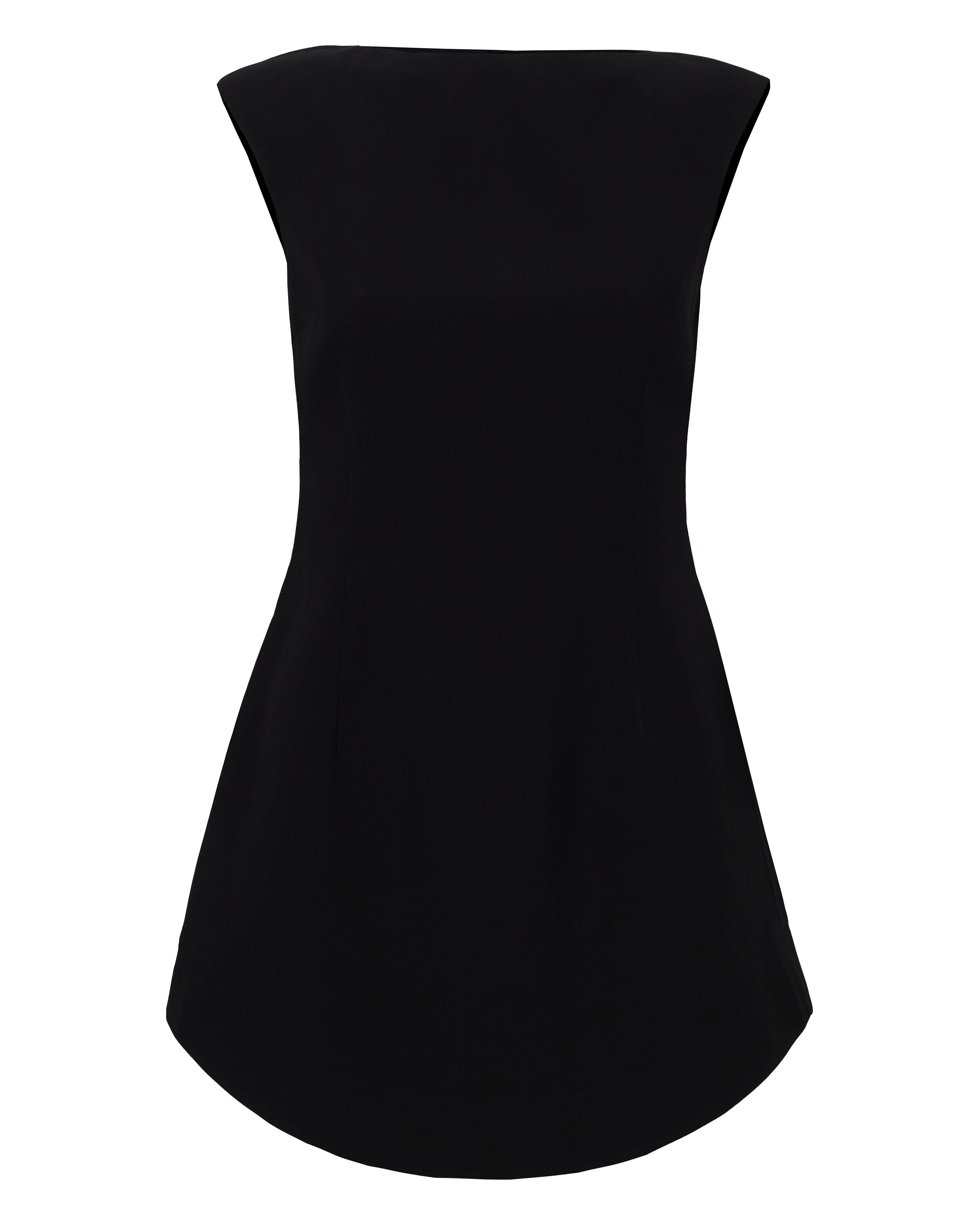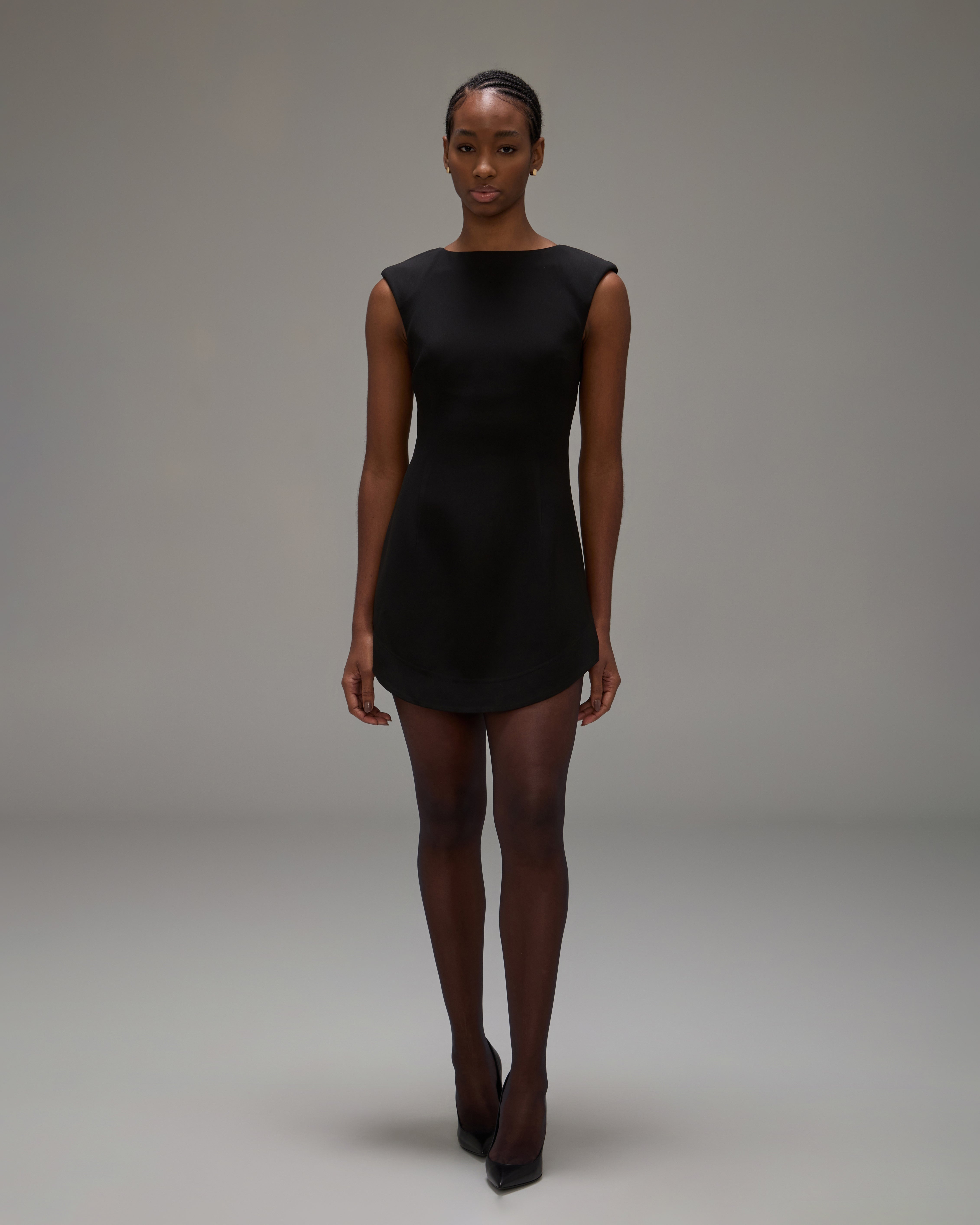 Structured crepe dress with light shoulder pads. Finished with a tailored lining and a back zipper closure. The piece features a fitted fit, with a flared skirt and curved hem.