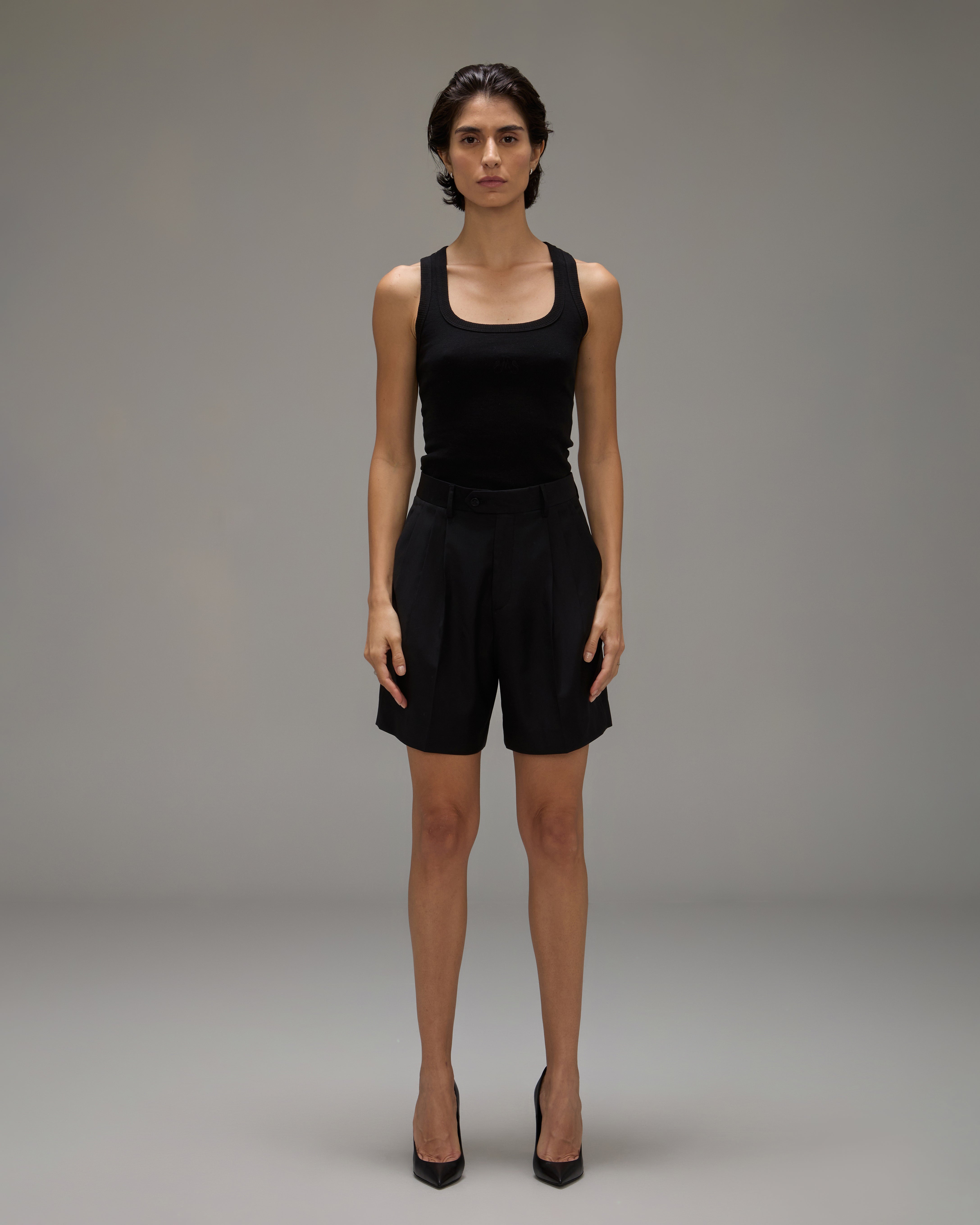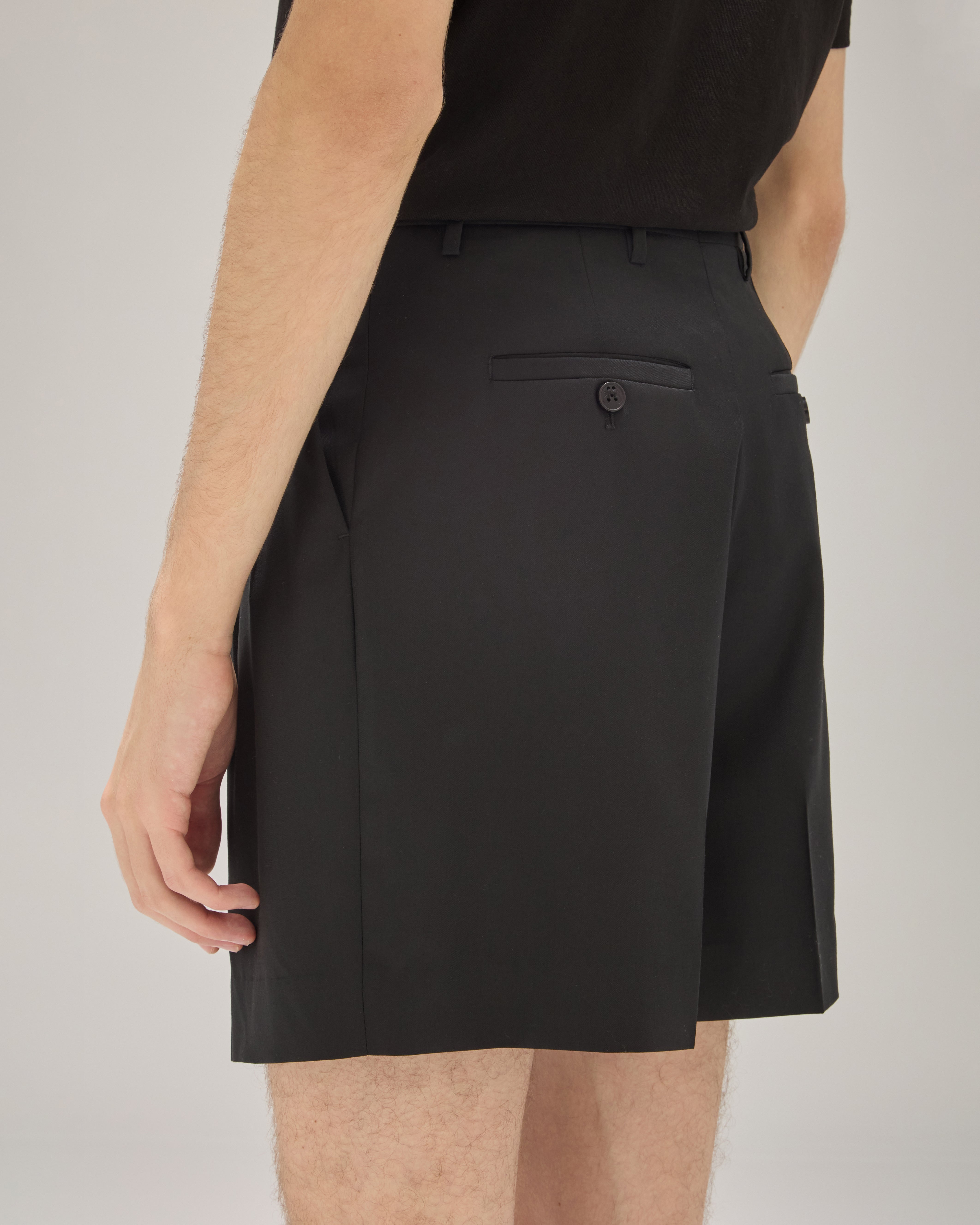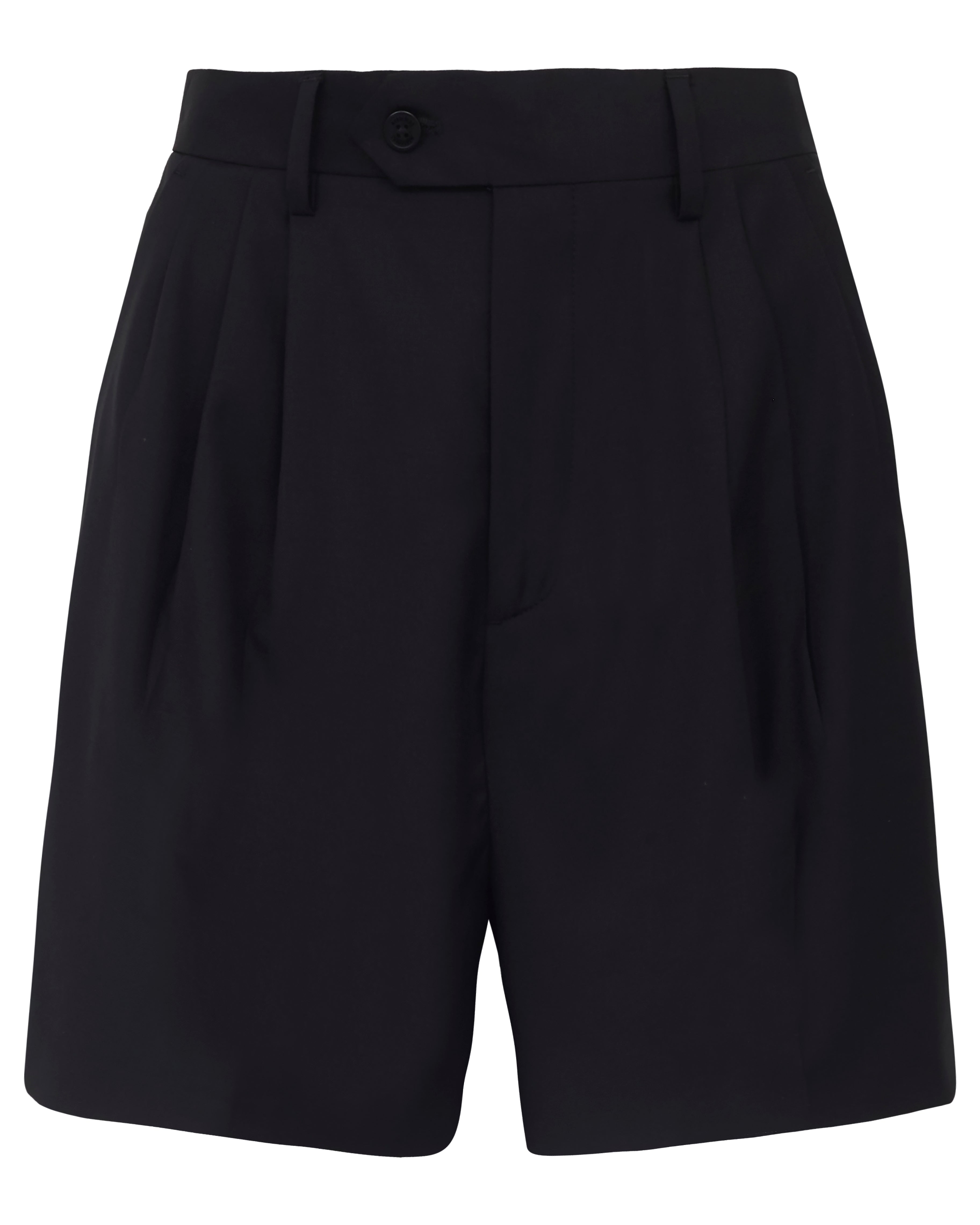 A Bermuda Lee é confeccionada em lã, possui modelagem de alfaiataria, cós com passantes, pregas, fechamento frontal por zíper e botão personalizado, dois bolsos faca frontais, dois bolsos posteriores embutidos com fechamento por botões, comprimento alongado e acabamentos internos vivados.