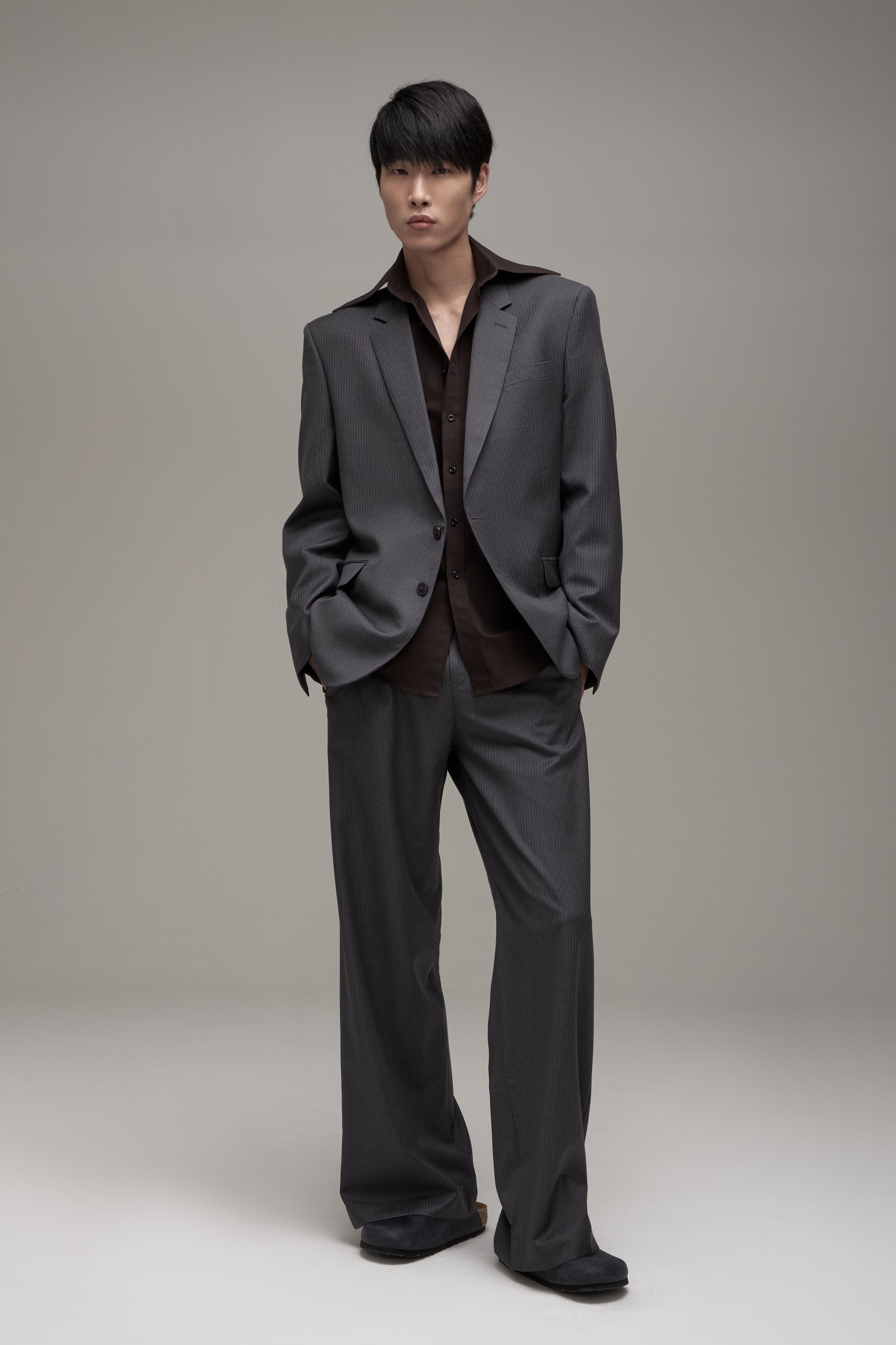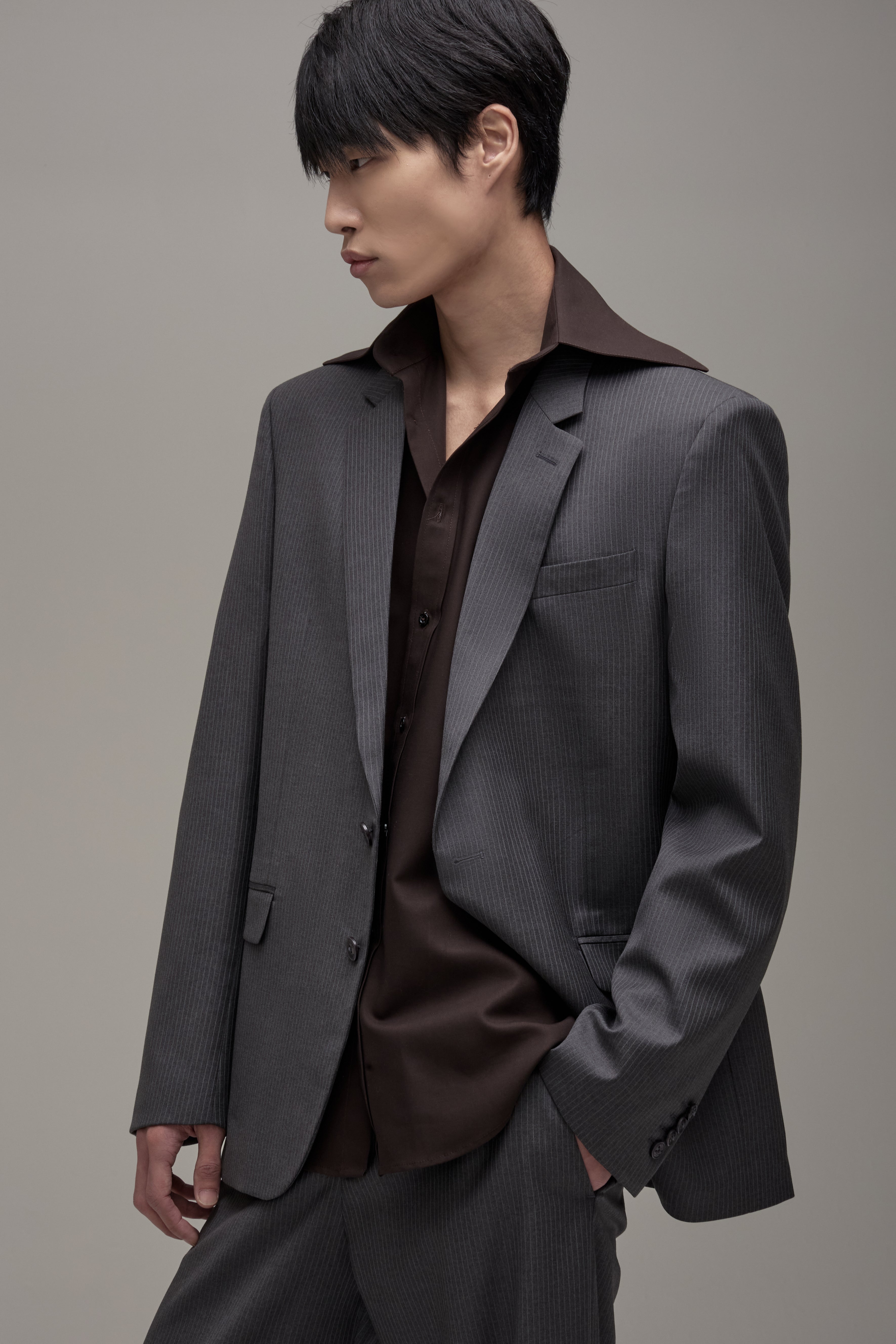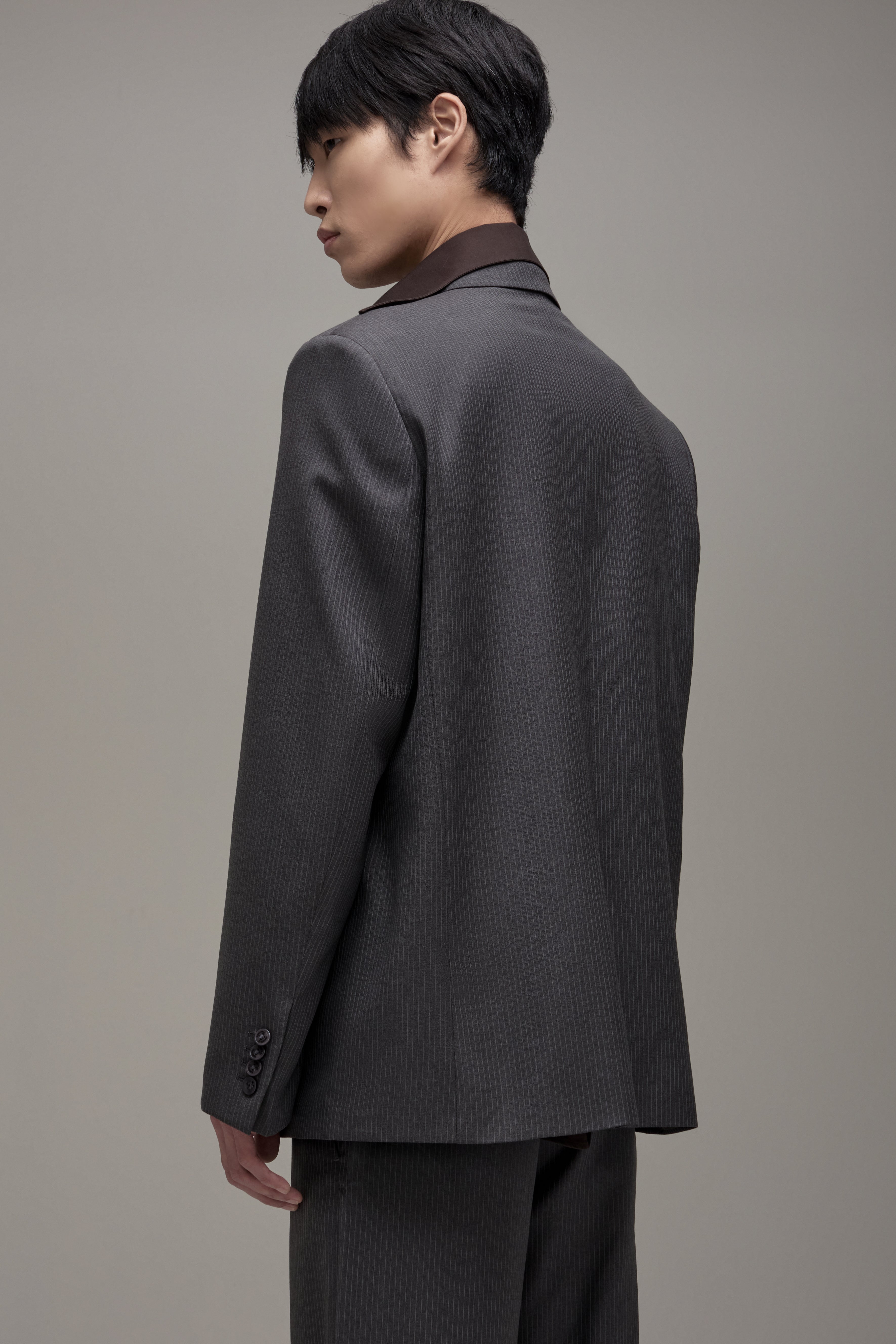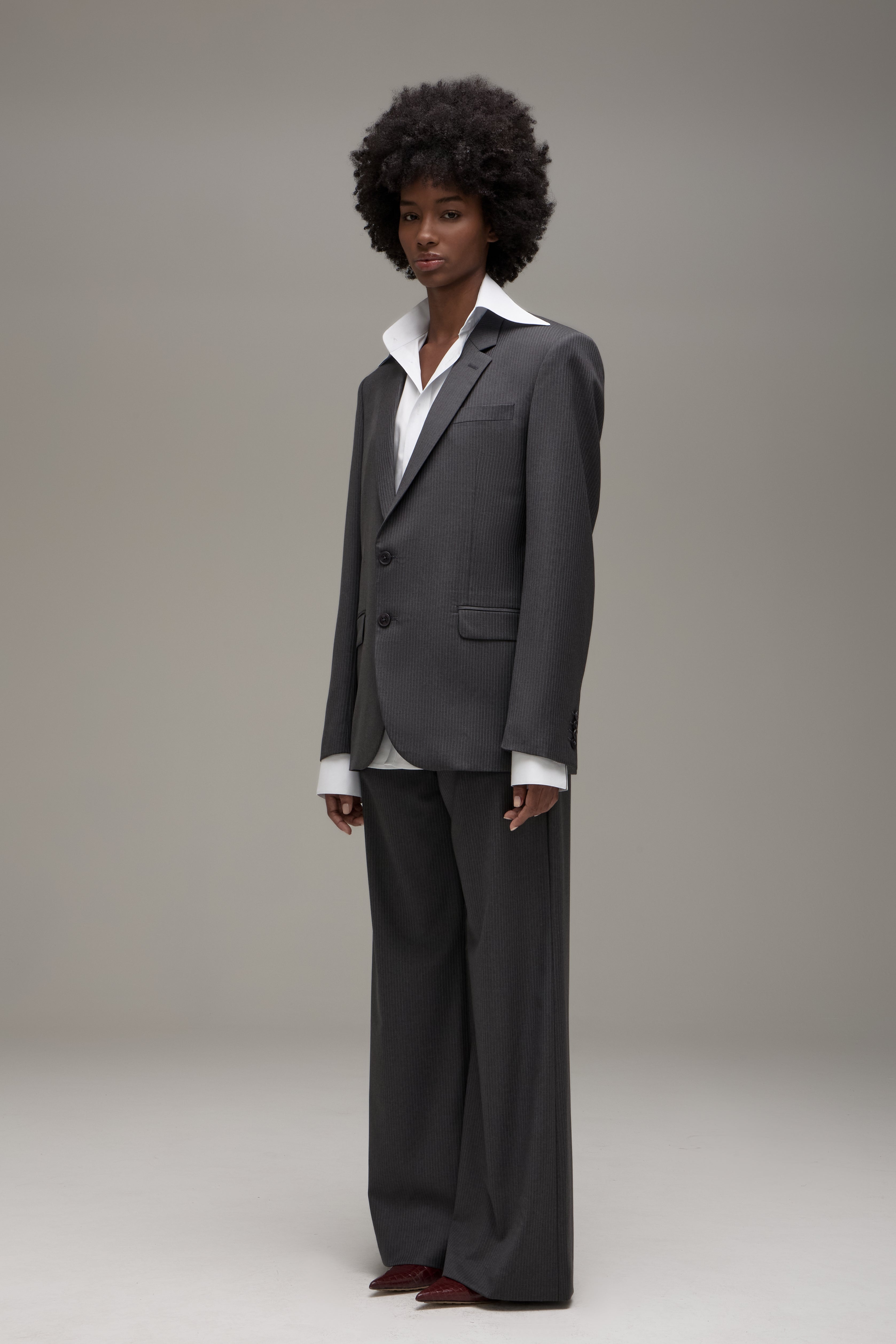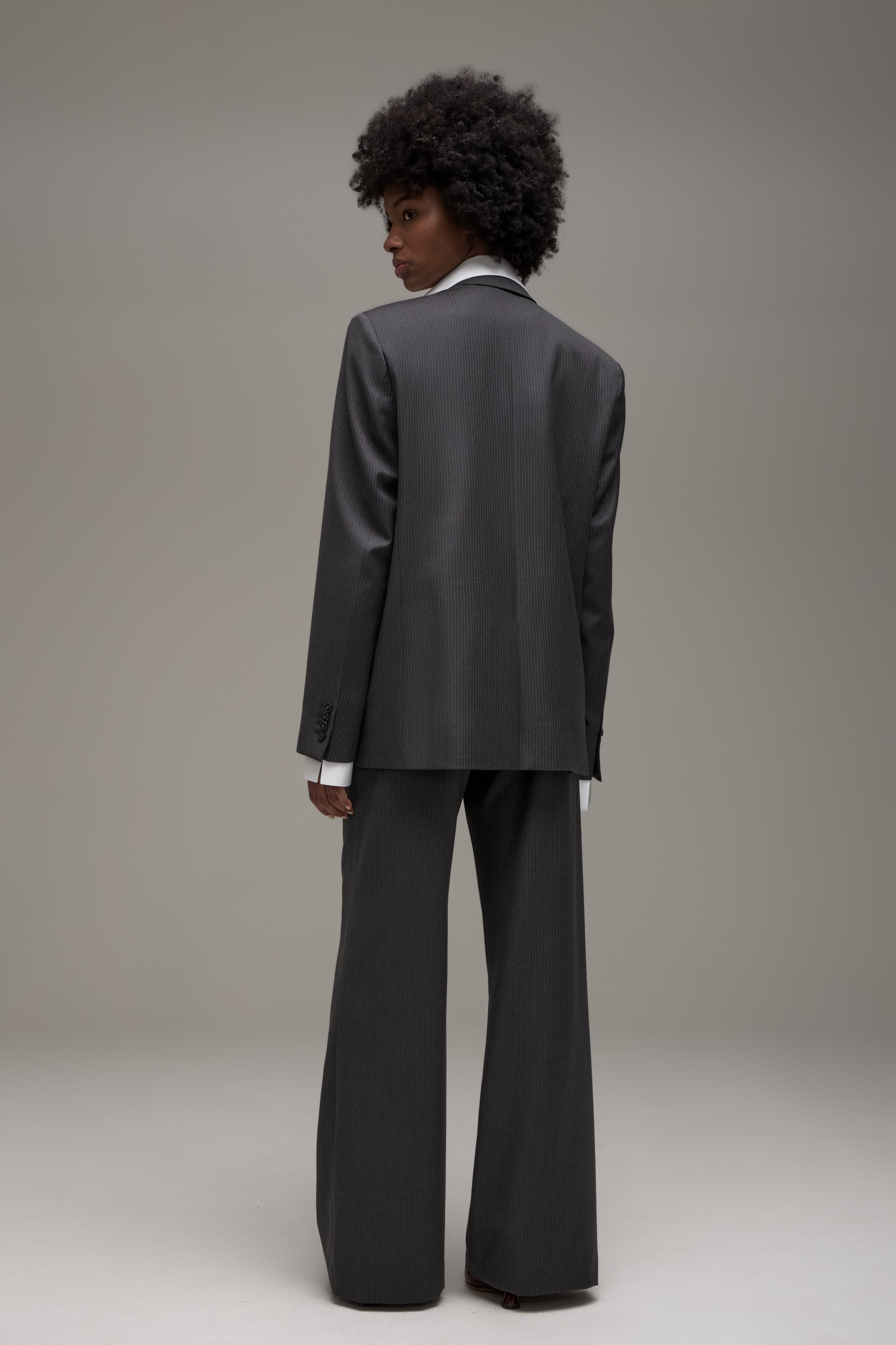 O Blazer Ezra é confeccionado em lã importada, possui padronagem de risca de giz, modelagem de alfaiataria tradicional, caimento oversize, lapelas notched, feltro de alfaiataria no interno da gola, ombreiras estruturadas, fechamento frontal por botões personalizados e caseado de olho, mangas longas com abotoamento nos punhos com abertura funcional, bolso interno de alfaiataria, bolsos externos alinhavados à mão para abertura conforme manufatura tradicional e forro embutido.