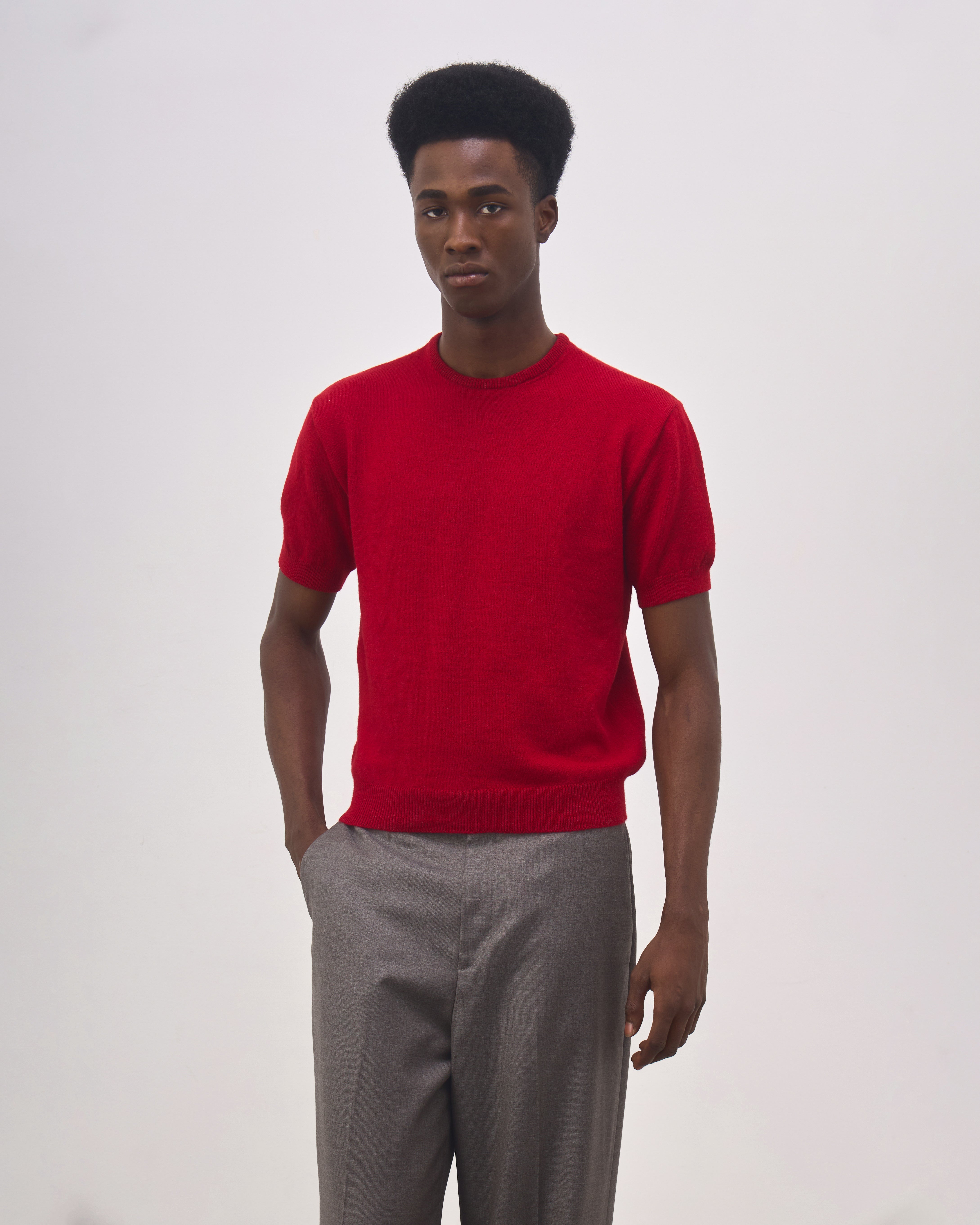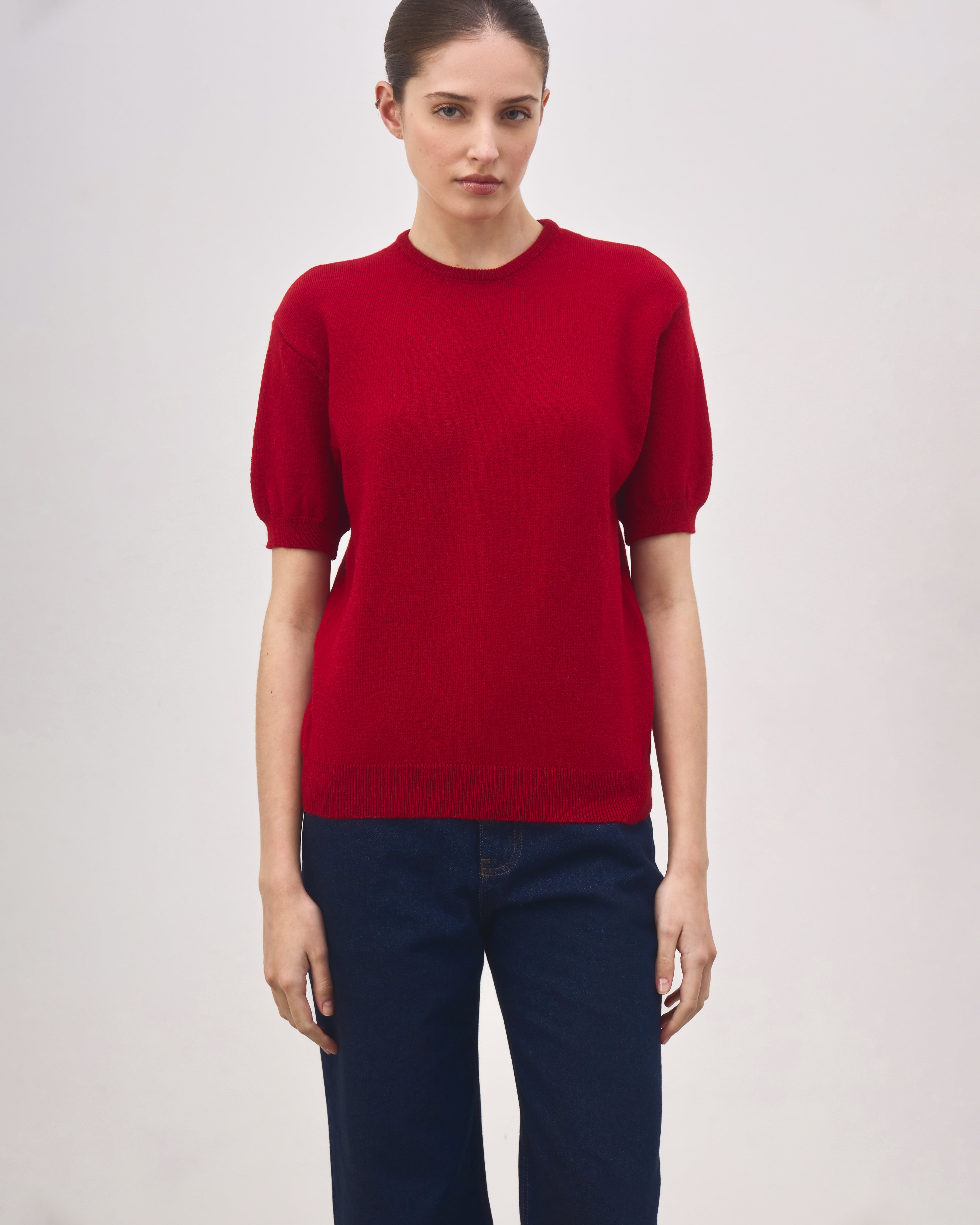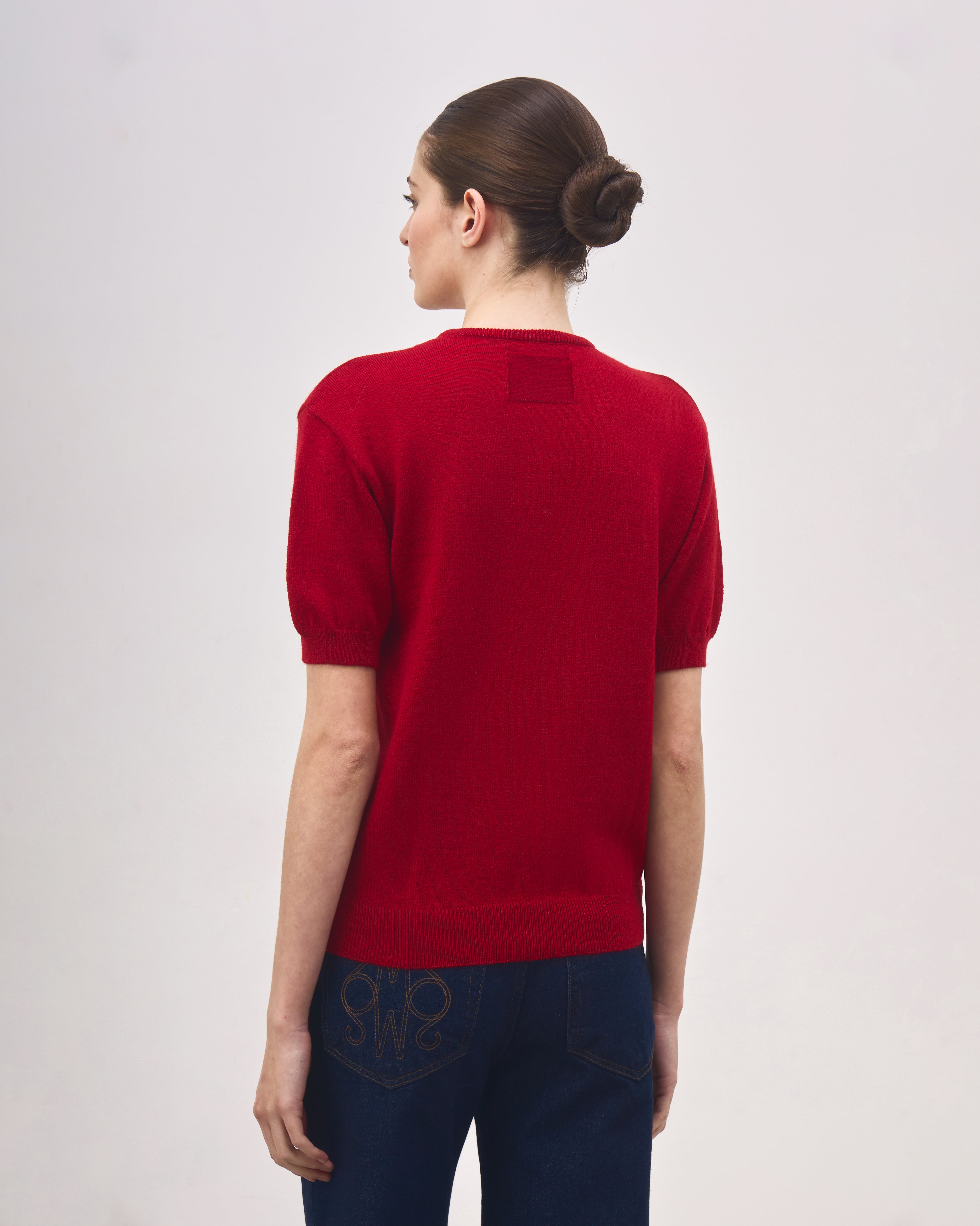 A Blusa Martha é confeccionada em tricot de lã alpaca, possui gola redonda, manga curta levemente bufante, ponto diferenciado centralizado nas costas e acabamento canelado.