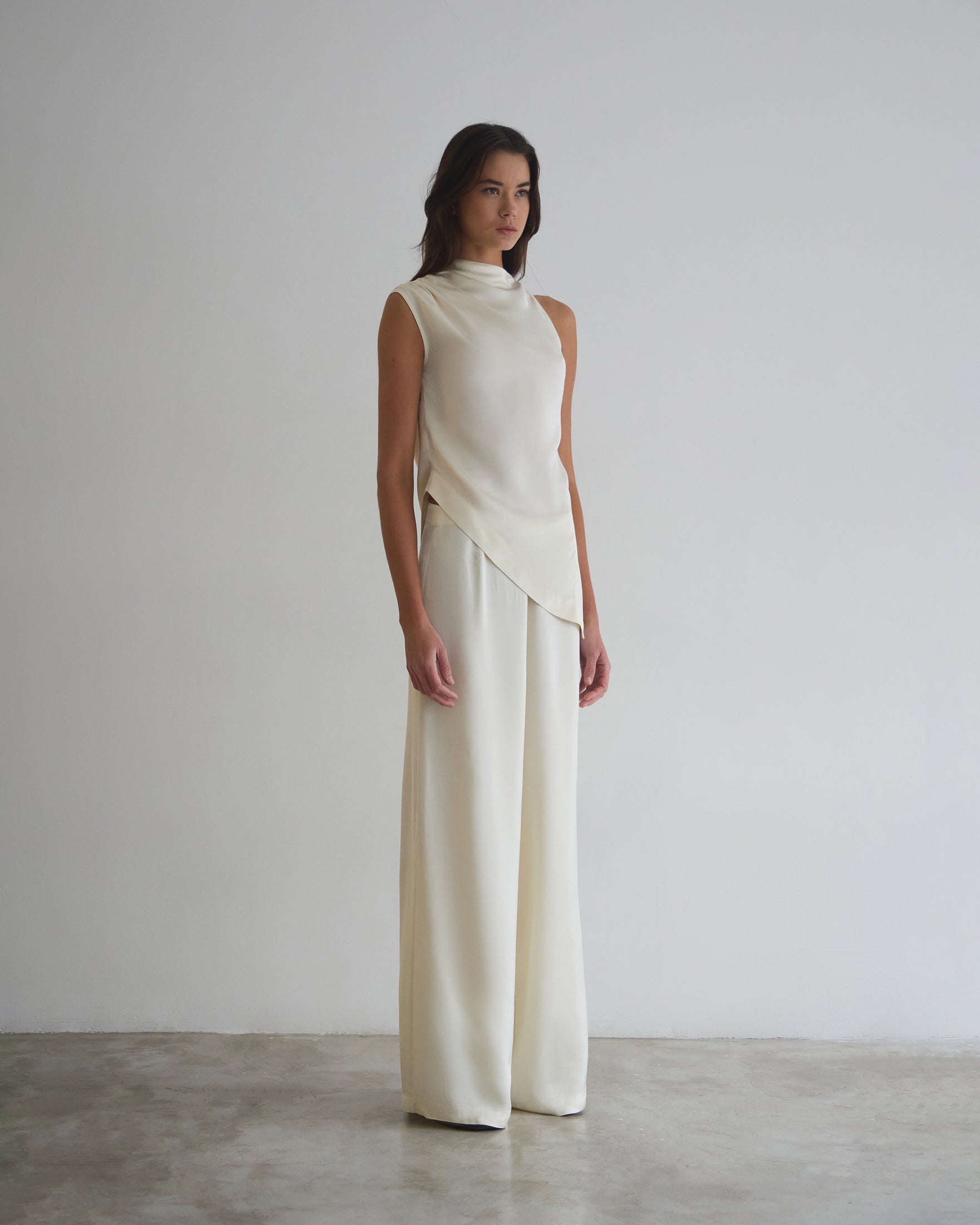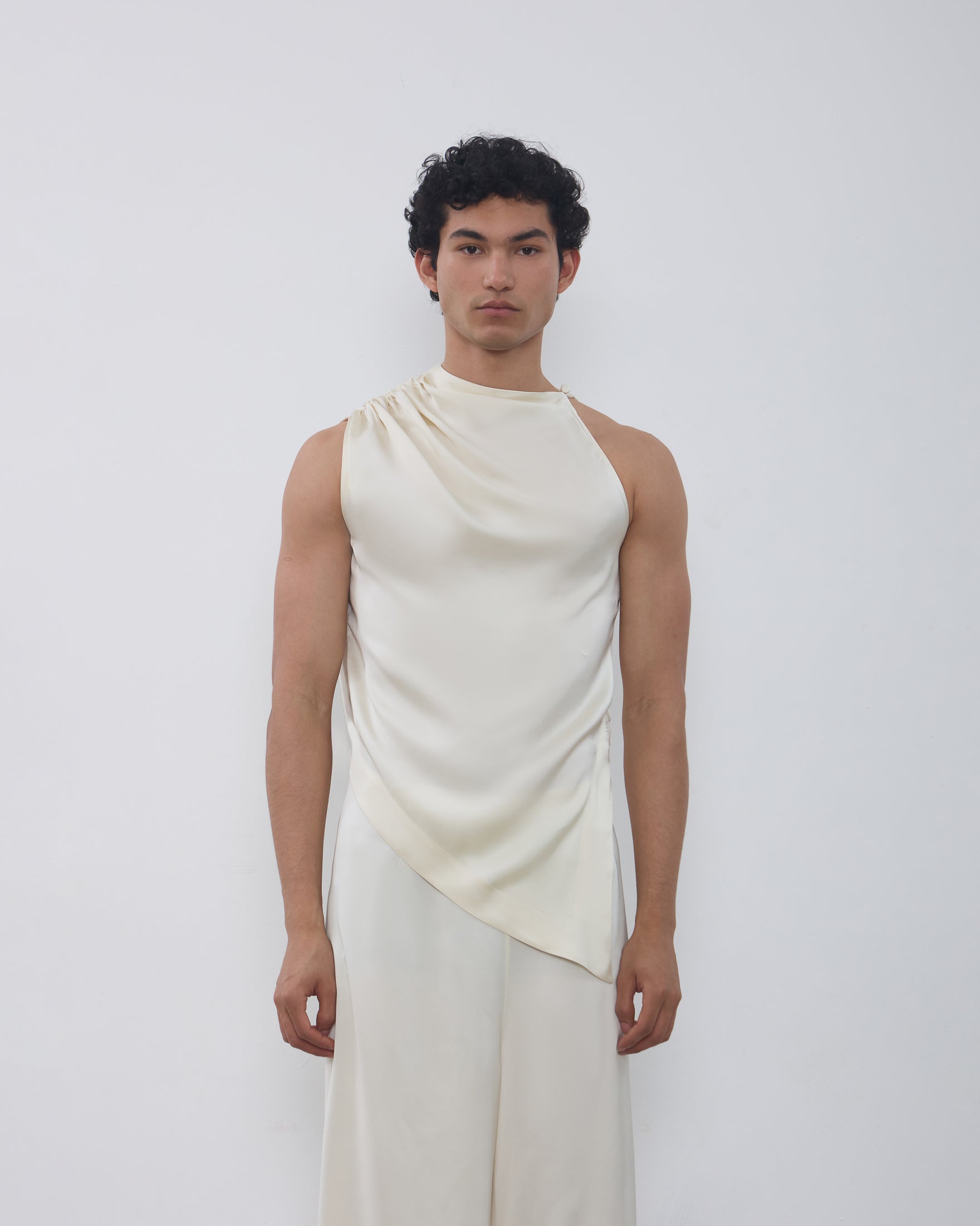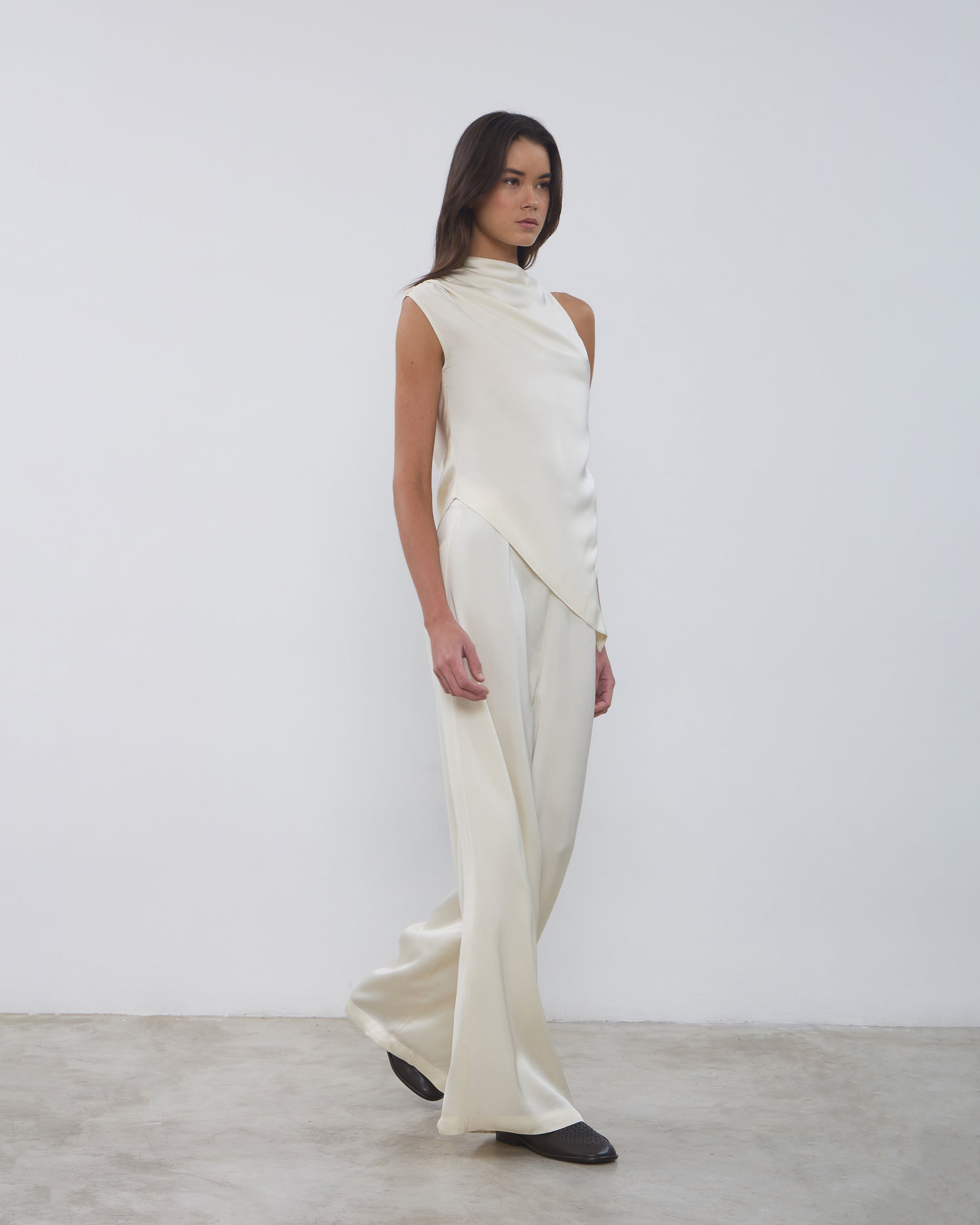 A Blusa Vera é confeccionada em tecido plano fluído, possui modelo assimétrico, caimento acinturado, gola semi alta com detalhe drapeado, alças largas com franzidos em uma lateral e fechamento por botão na outra lateral, barra assimétrica pontuda com detalhe de botões revestidos na lateral.