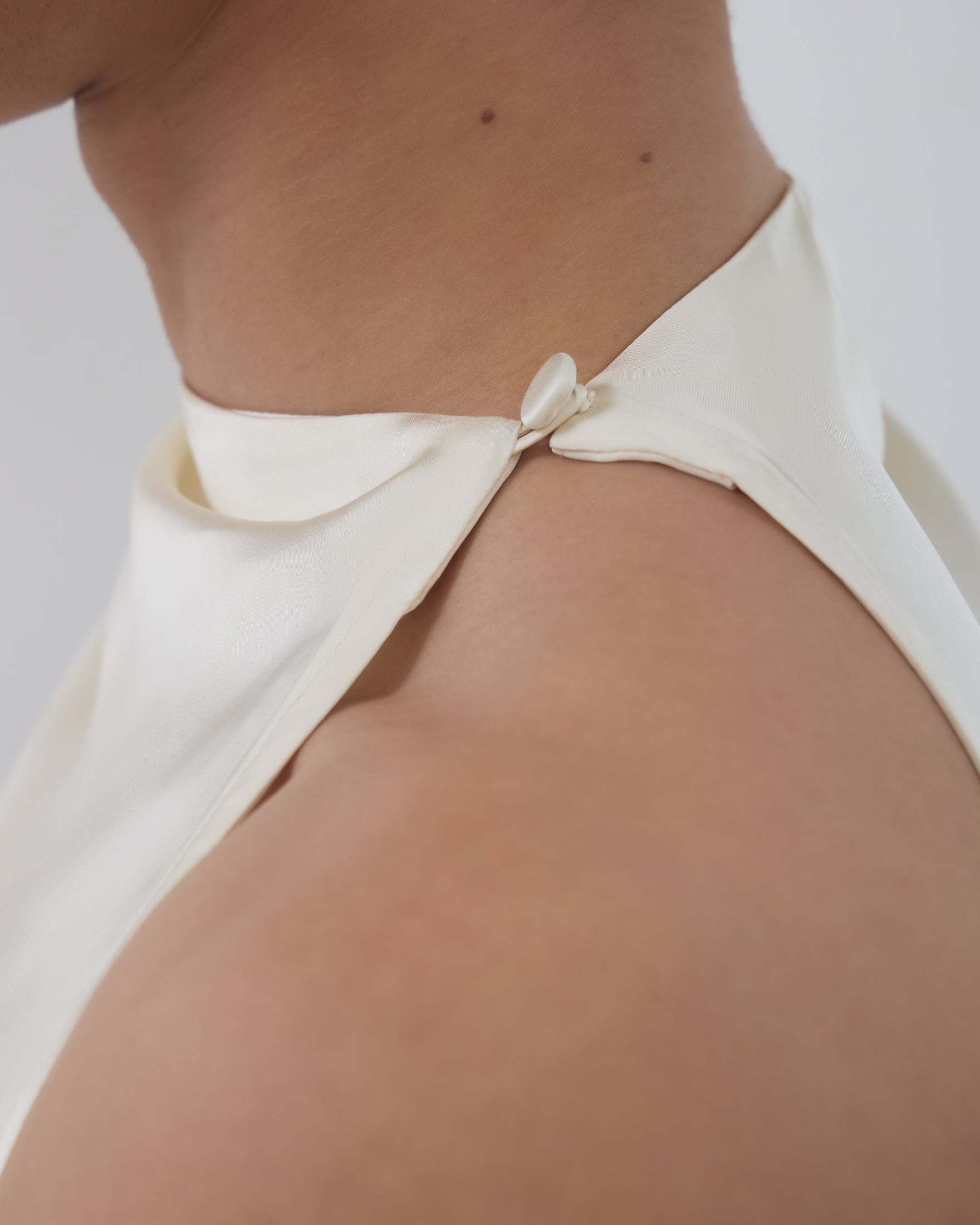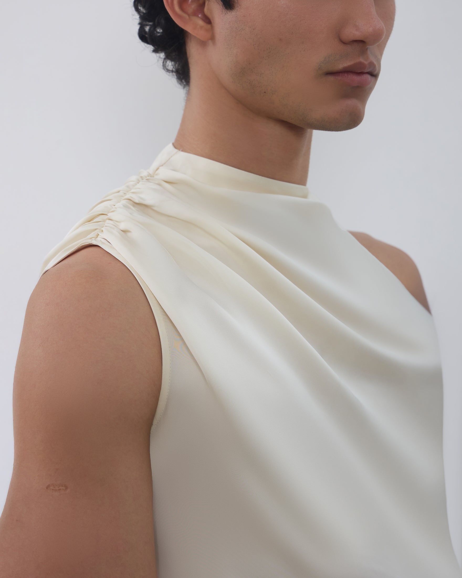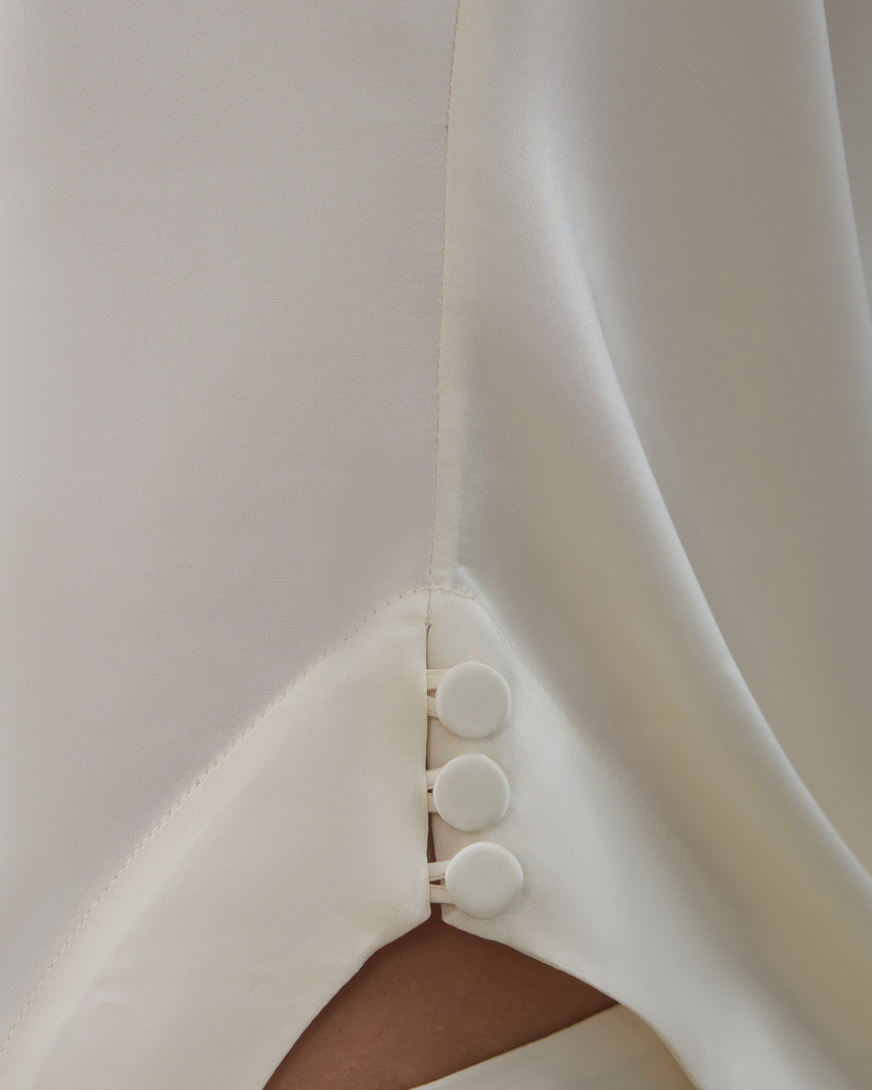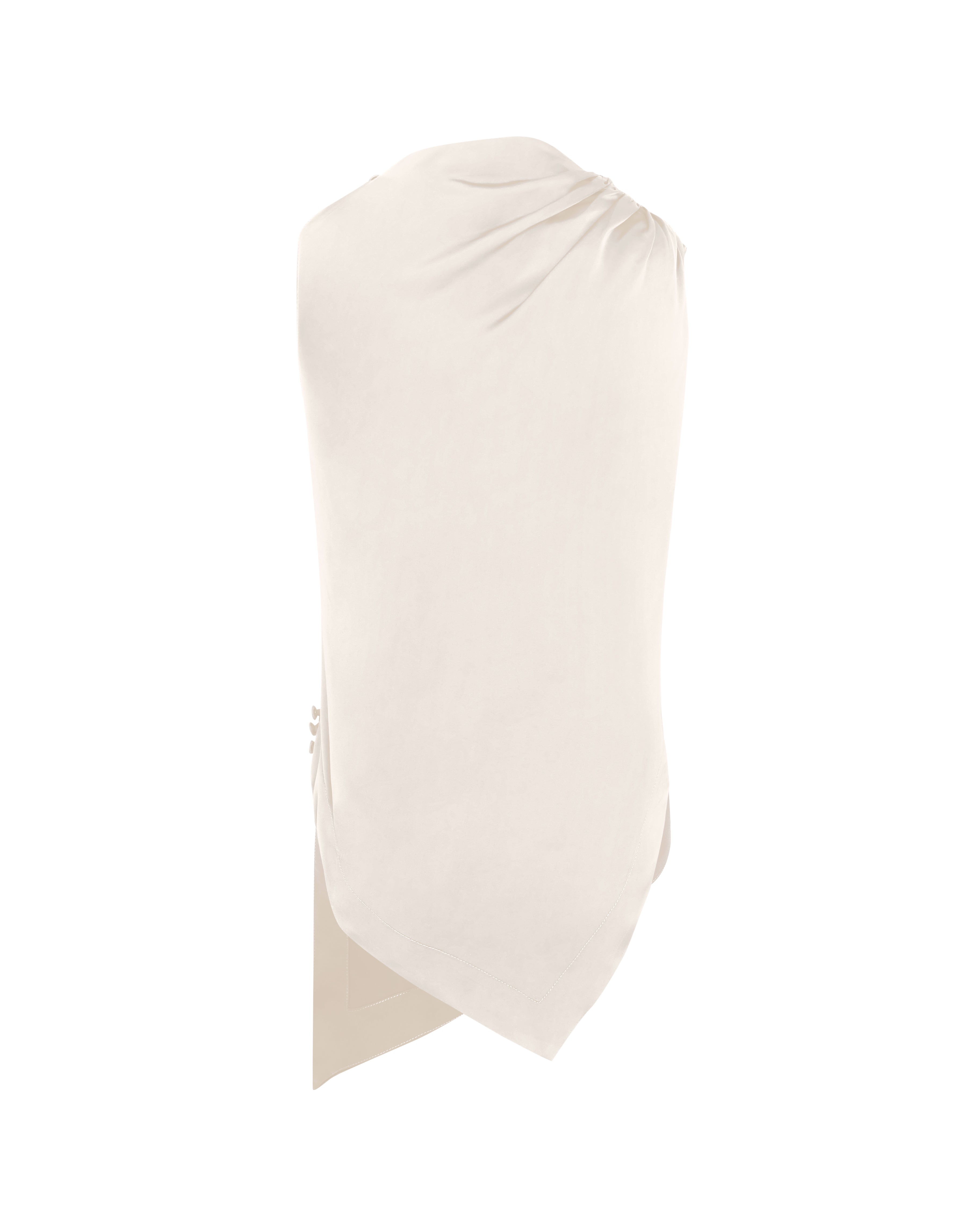 A Blusa Vera é confeccionada em tecido plano fluído, possui modelo assimétrico, caimento acinturado, gola semi alta com detalhe drapeado, alças largas com franzidos em uma lateral e fechamento por botão na outra lateral, barra assimétrica pontuda com detalhe de botões revestidos na lateral.