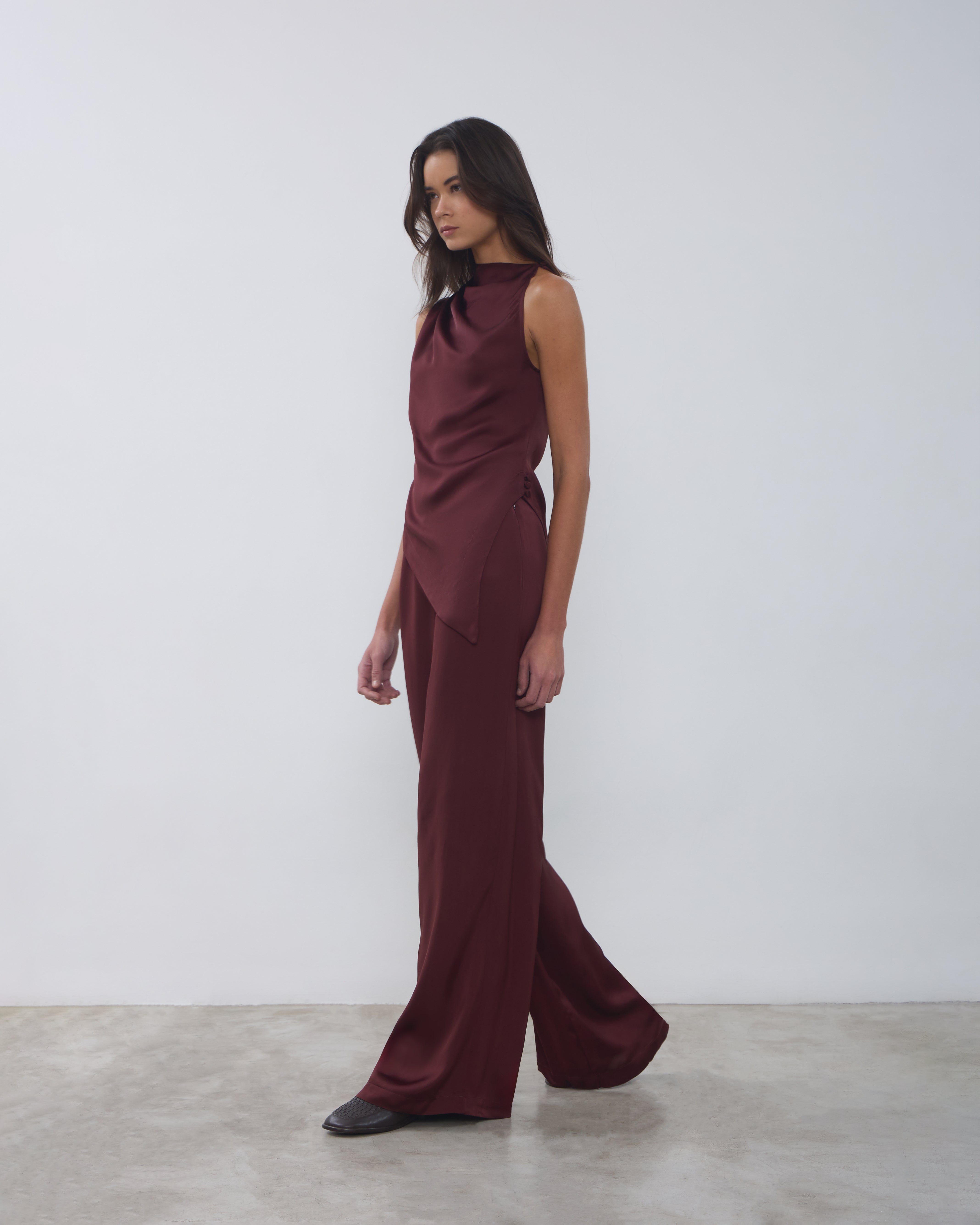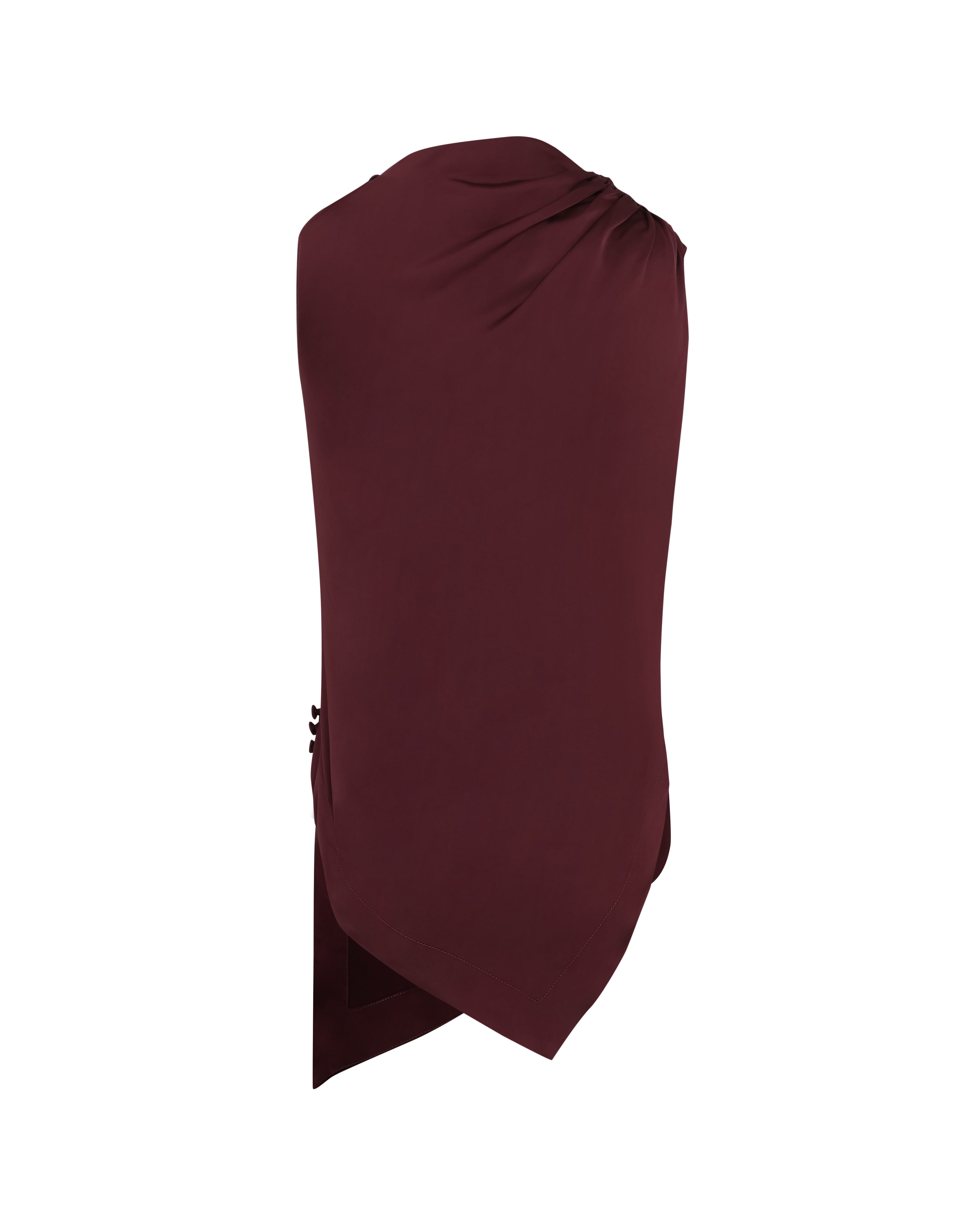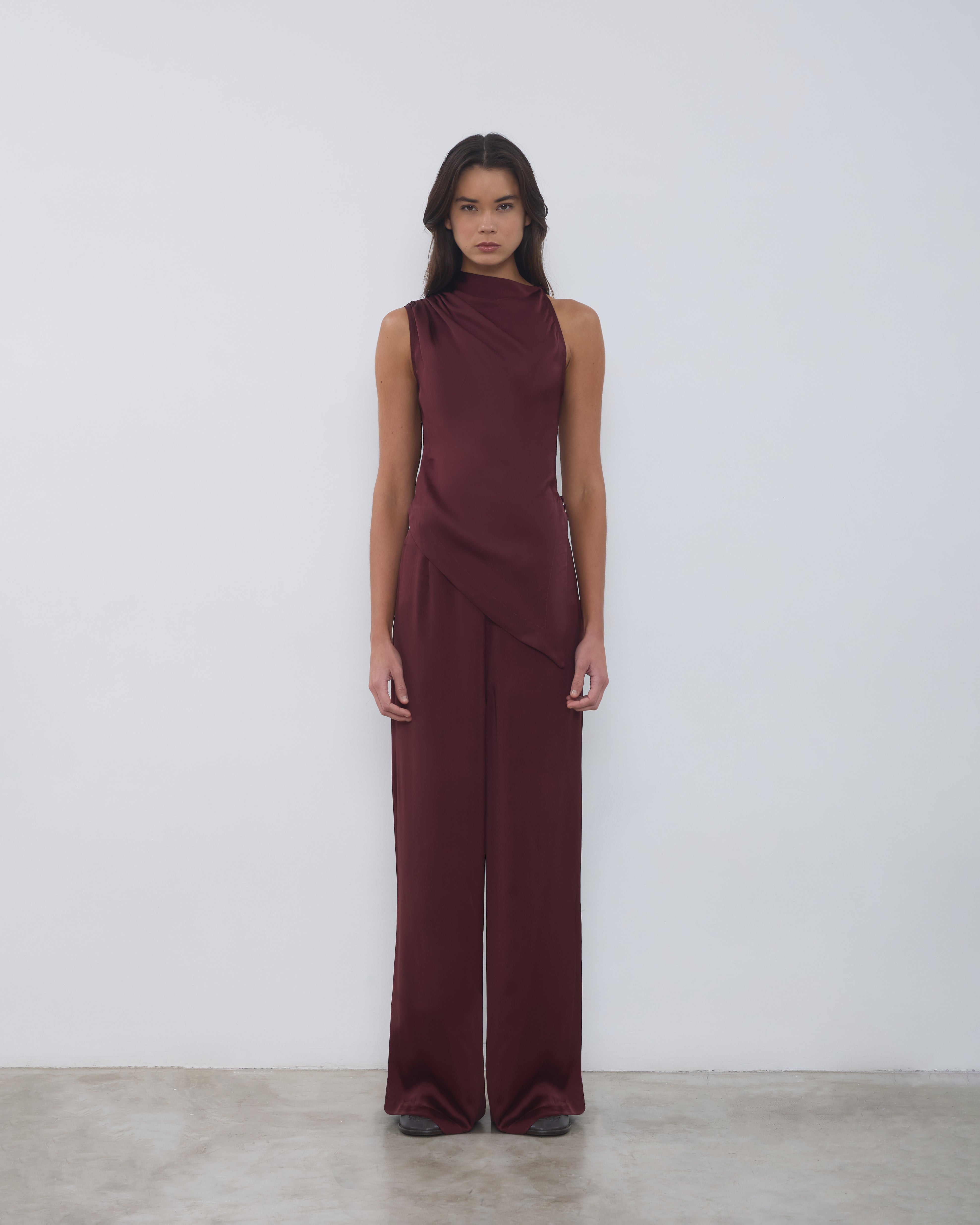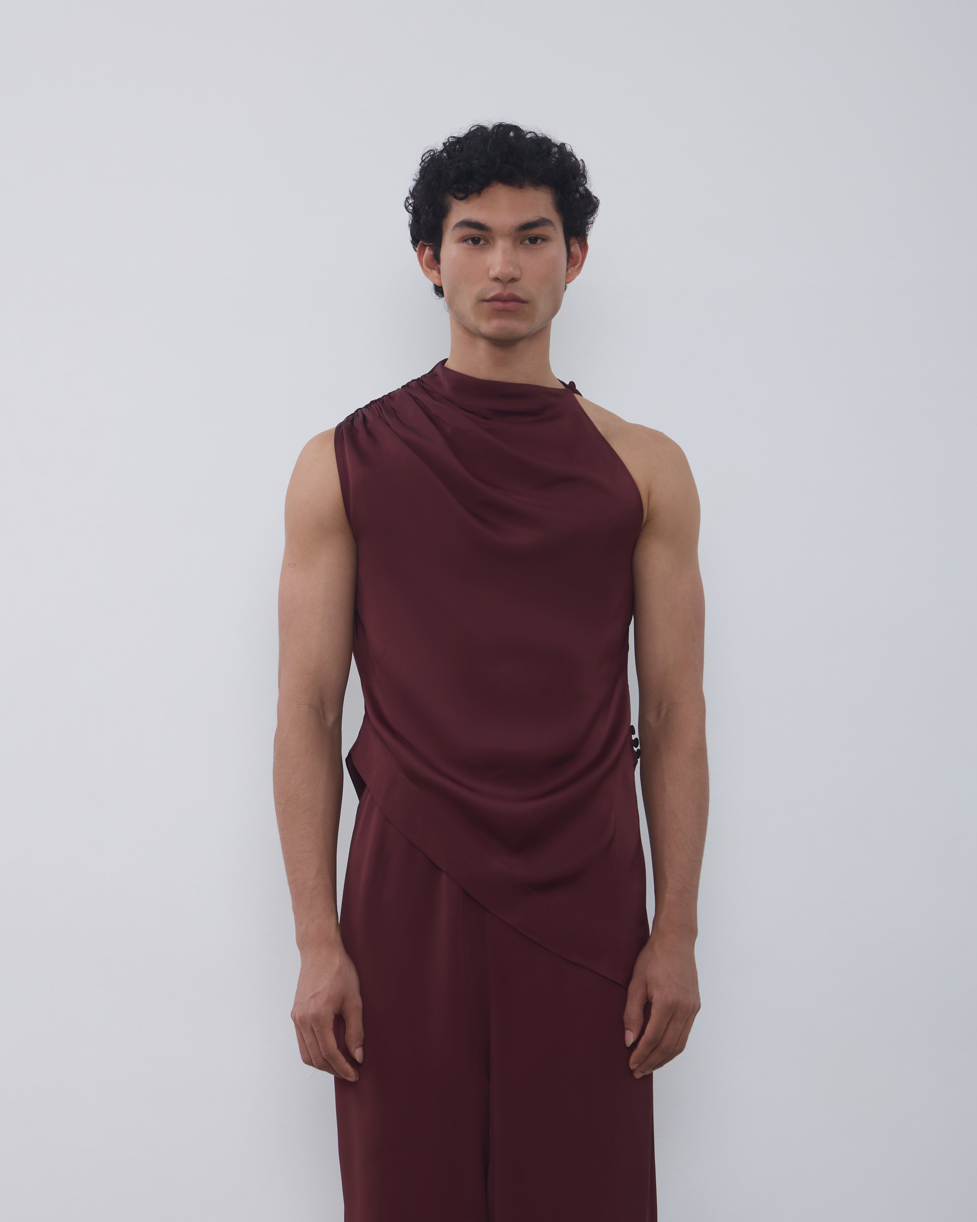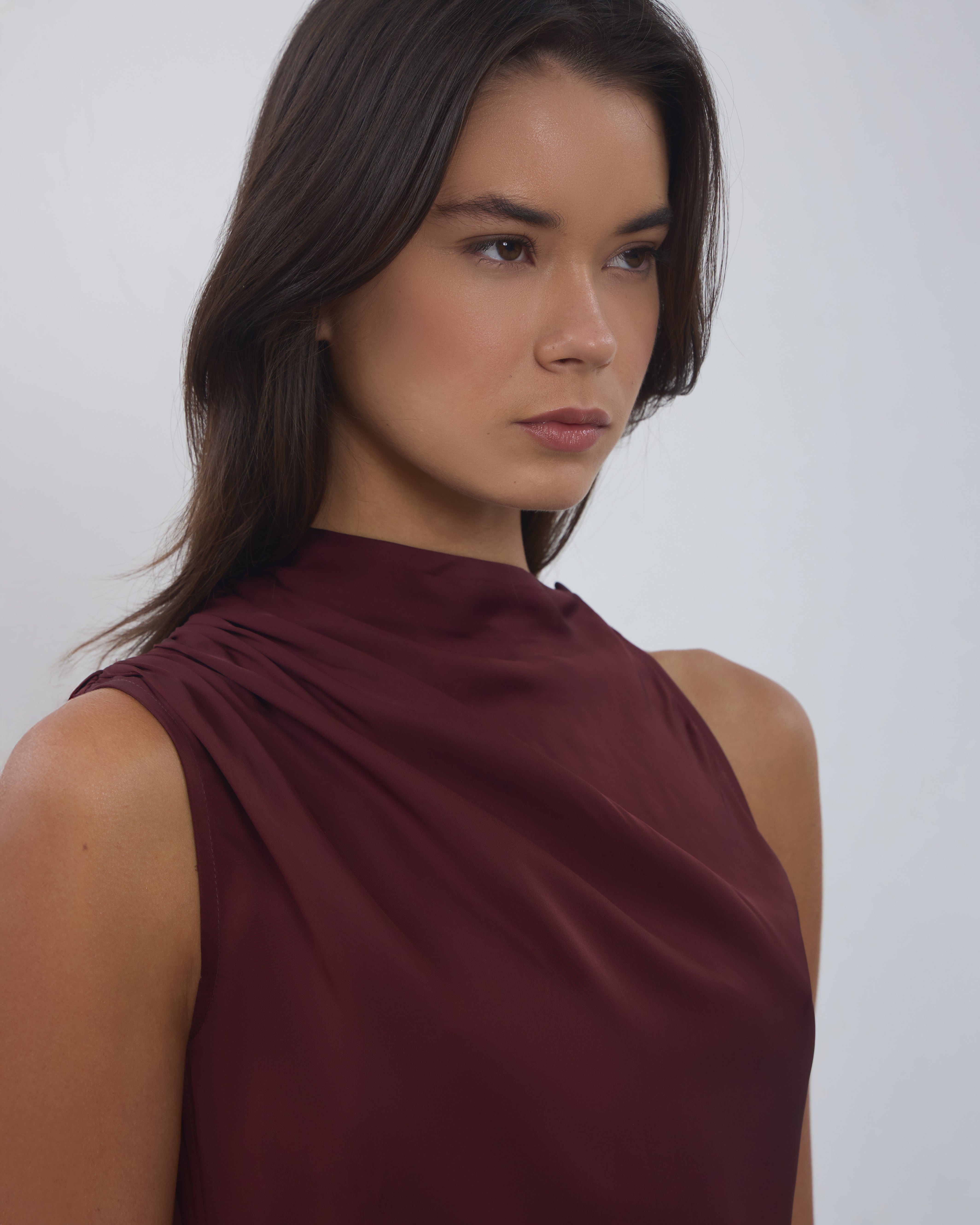 A Blusa Vera é confeccionada em tecido plano fluído, possui modelo assimétrico, caimento acinturado, gola semi alta com detalhe drapeado, alças largas com franzidos em uma lateral e fechamento por botão na outra lateral, barra assimétrica pontuda com detalhe de botões revestidos na lateral.