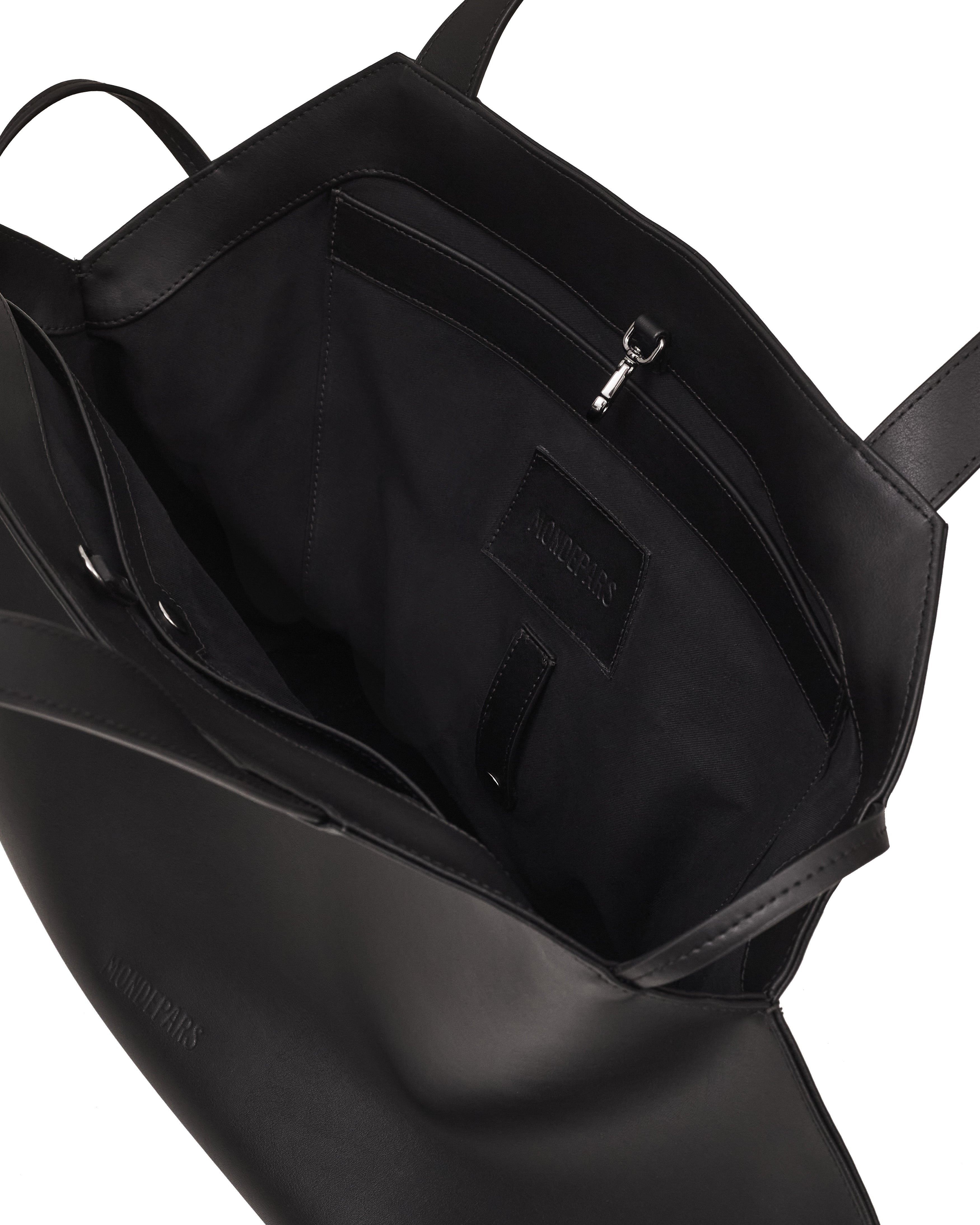 A Bolsa Arraia possui formato inspirado na arraia, alças pespontadas, fechamento por ganchos, bolsos internos em ambos dos lados, assinatura com etiqueta biomaterial com o nome Mondepars no interior e no exterior, base rígida com metais de suporte e acabamento pespontado.