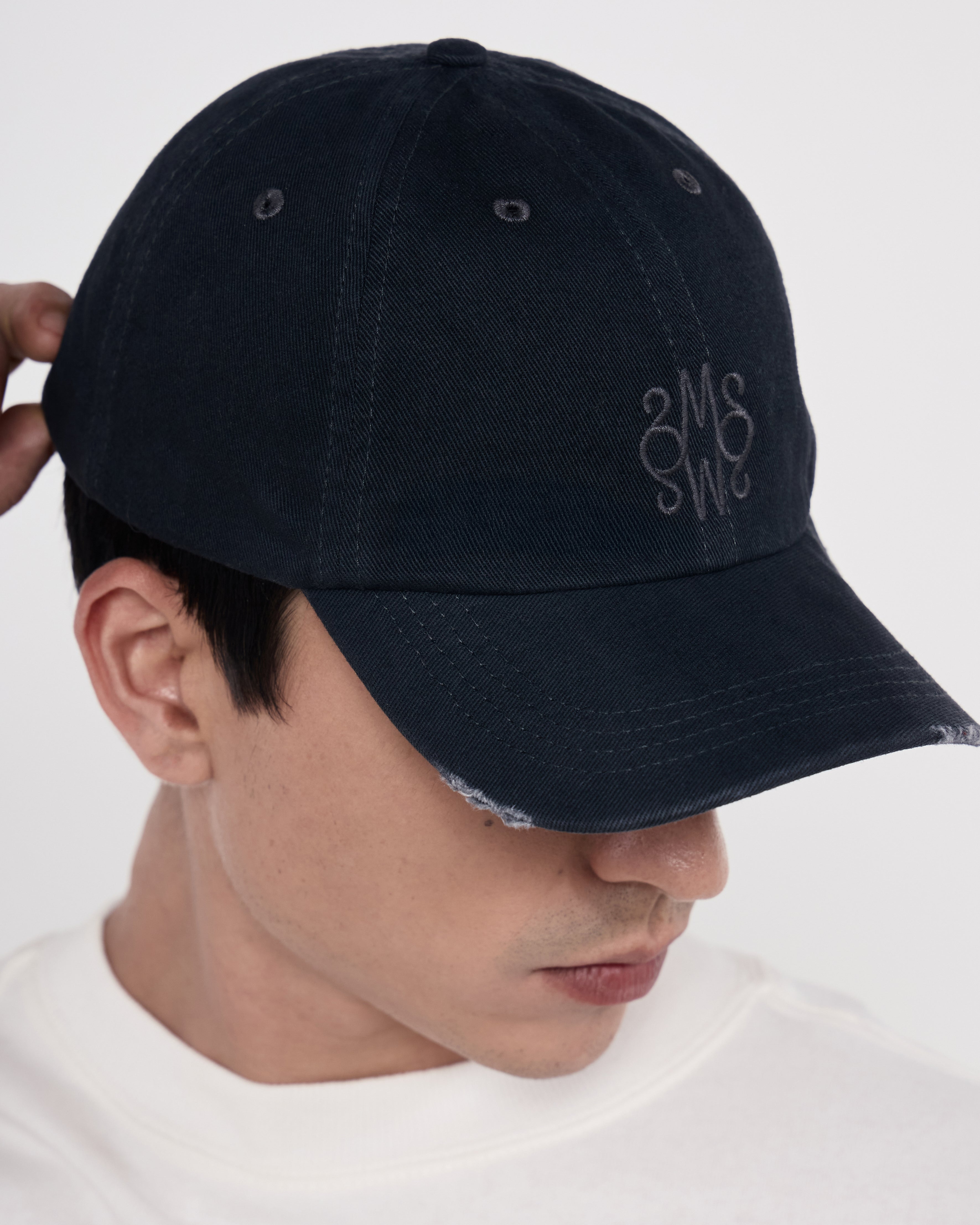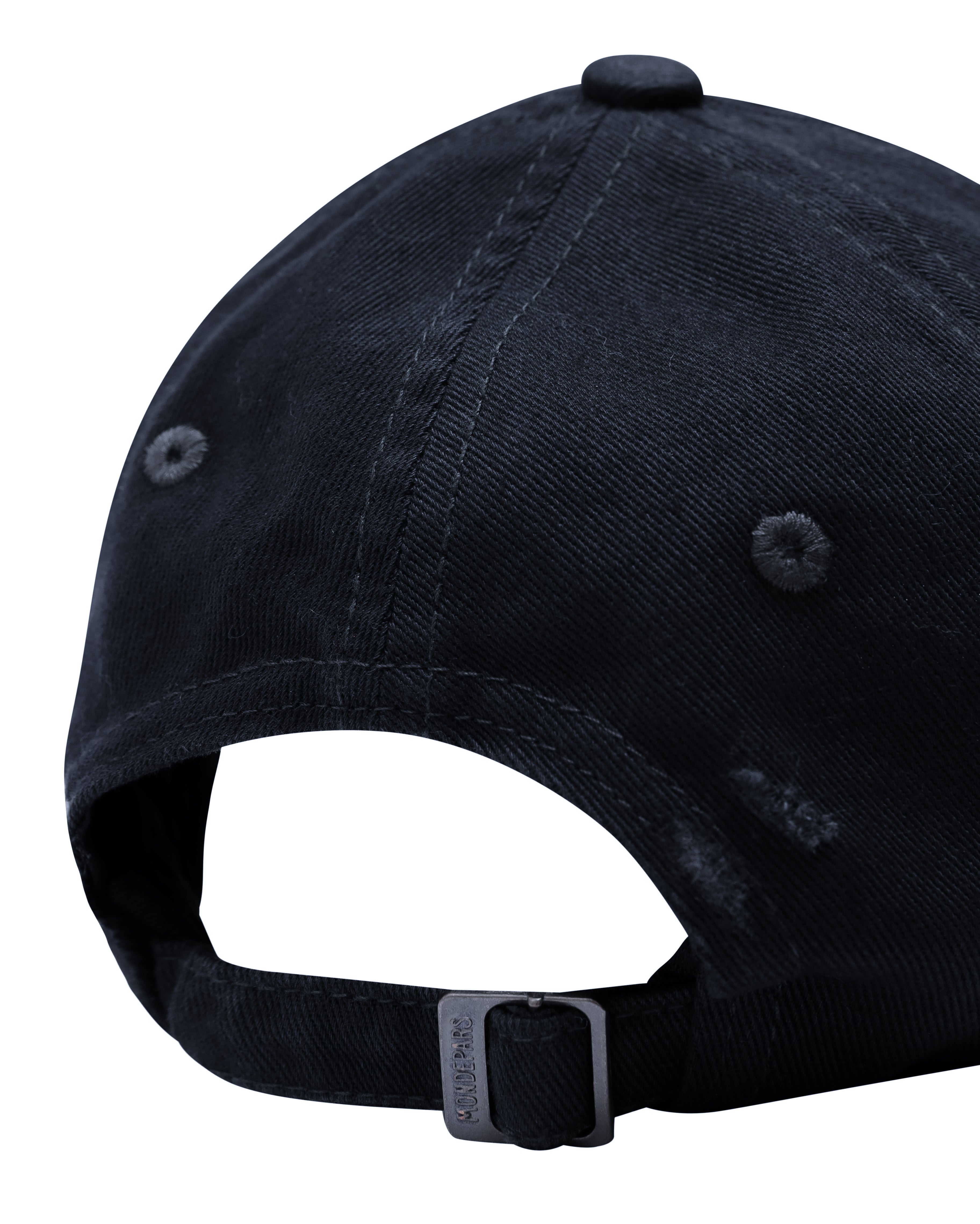 O Boné Logos é confeccionado em algodão com acabamento em lavanderia, possui modelagem curta, bordado frontal com longo, entrelaçado, leve puídos com efeito desgastado, fechamento posterior com regulador personalizado Mondepars e acabamento pespontado.