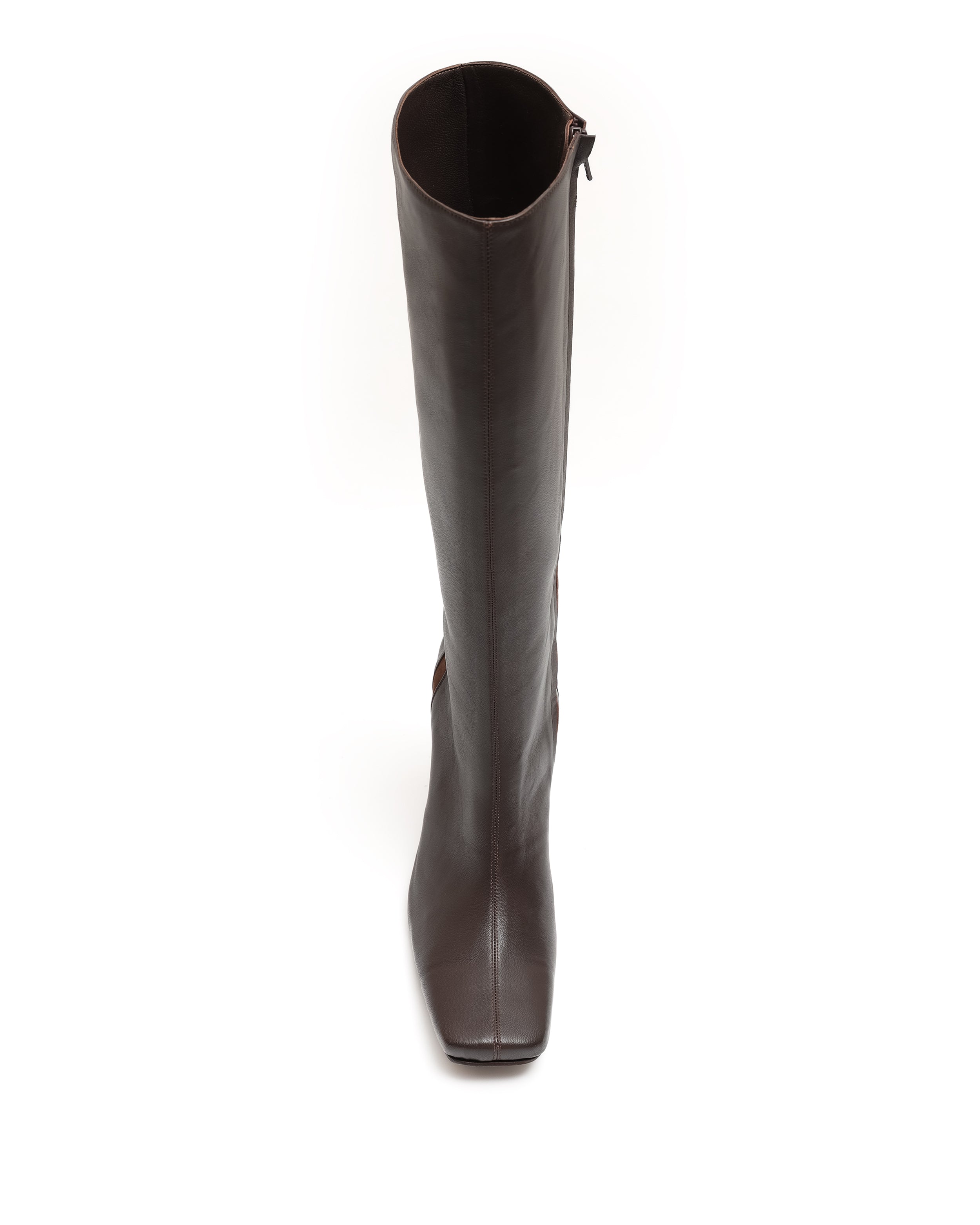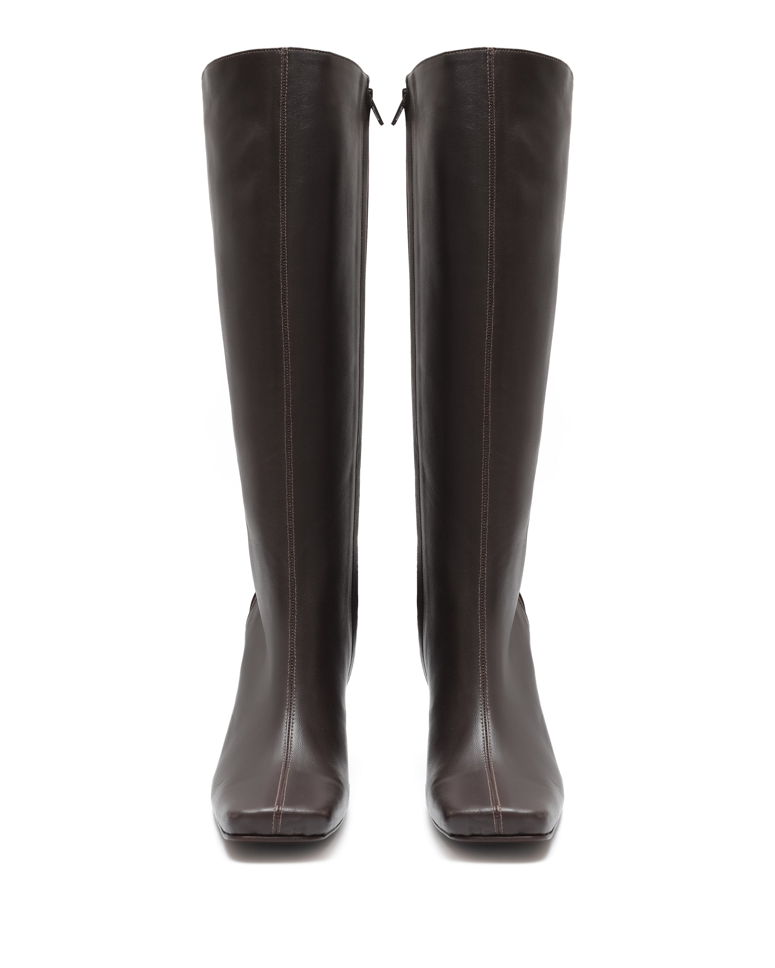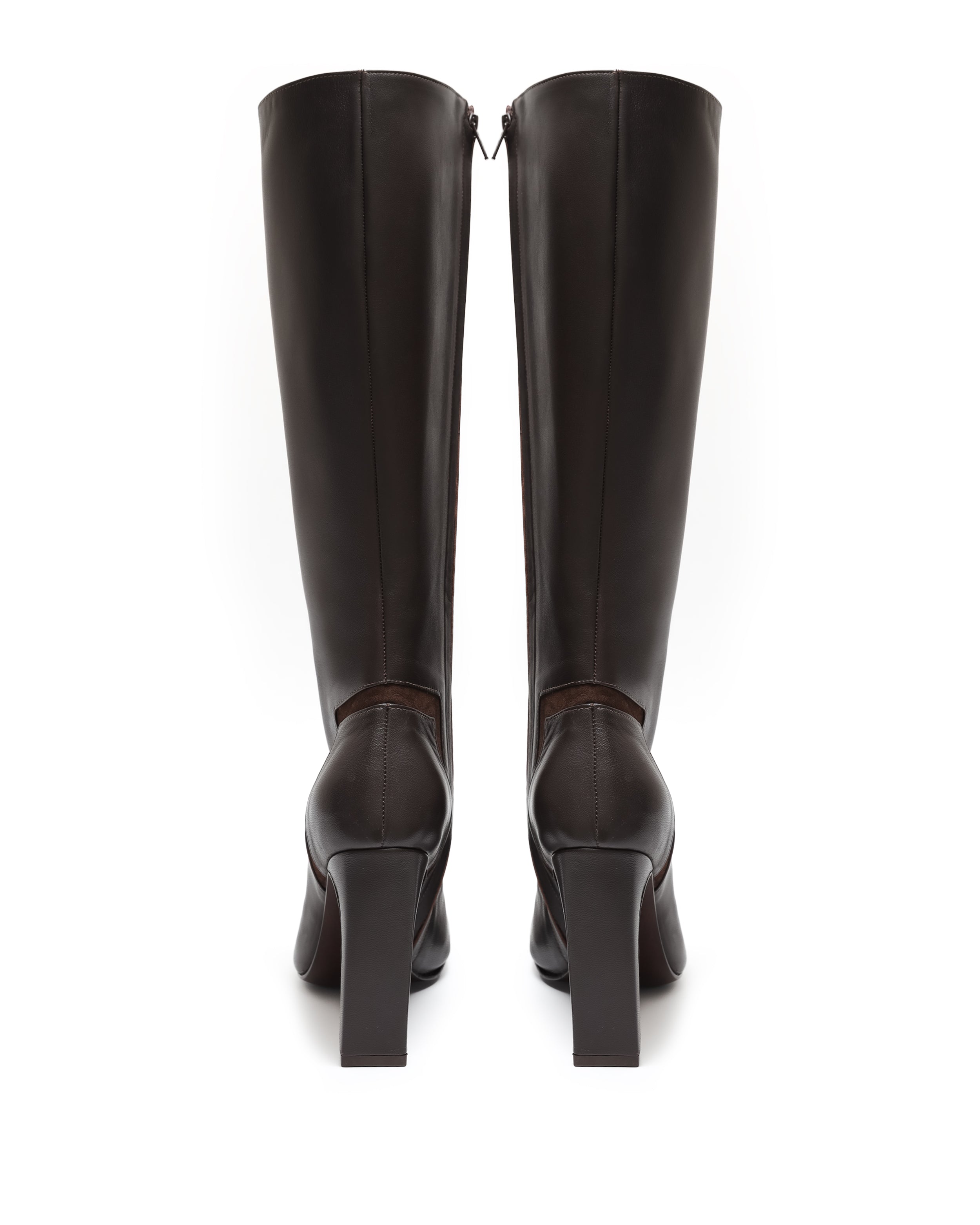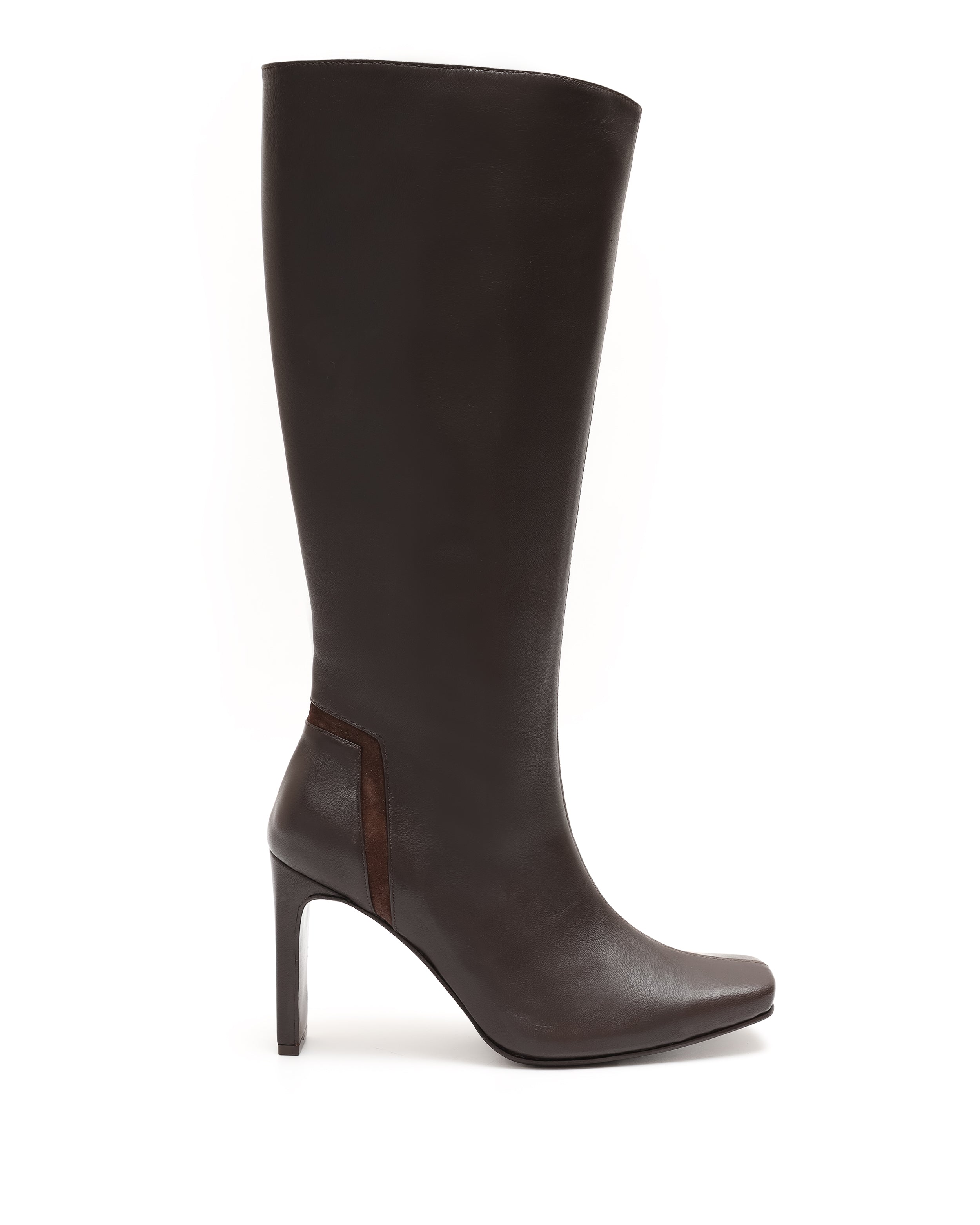 A Bota Clemence é confeccionada em couro, possui cano longo, fechamento por zíper na lateral, detalhe posterior em camurça, salto semi bloco, solado externo de madeira, bico quadrado e acabamento pespontado.