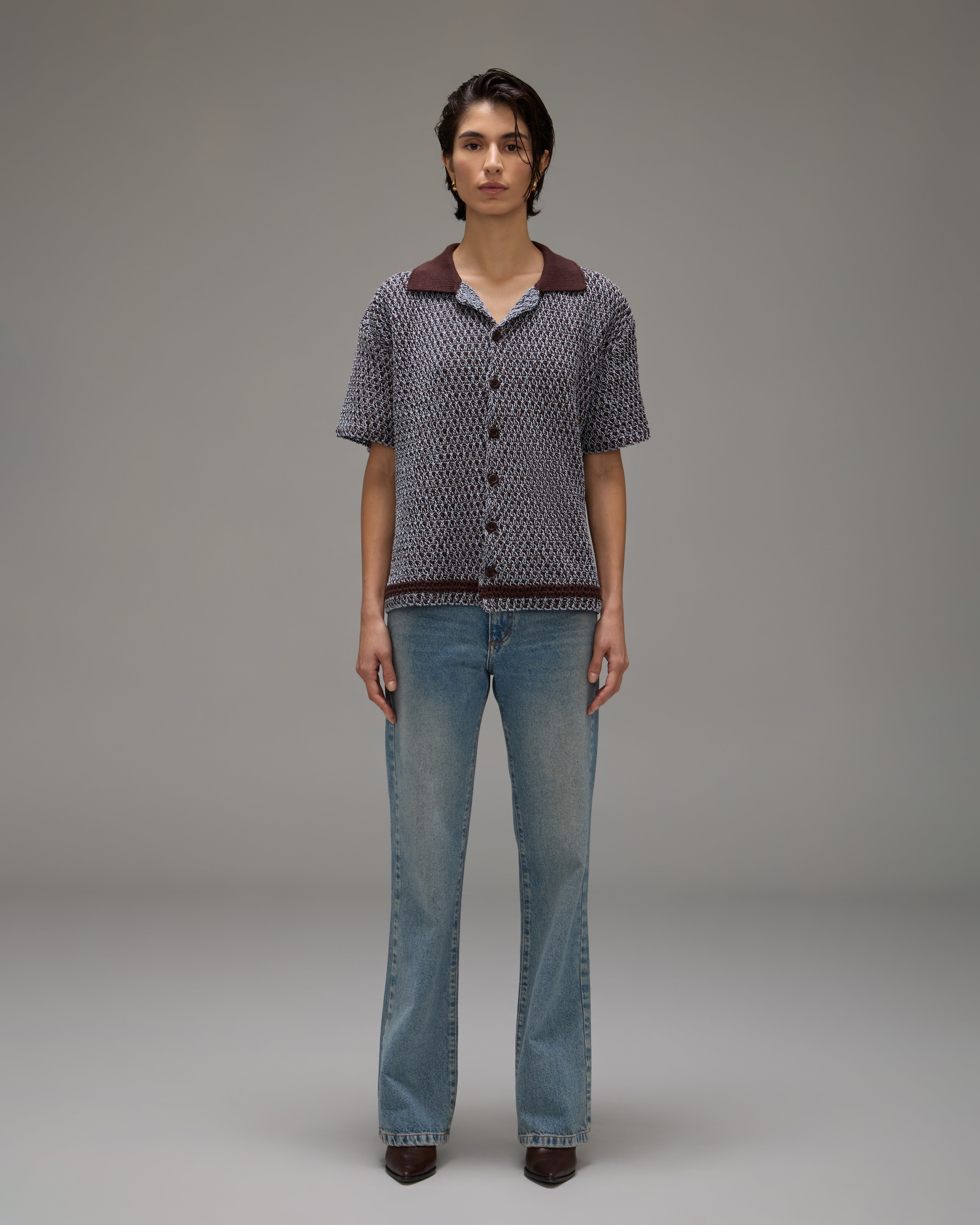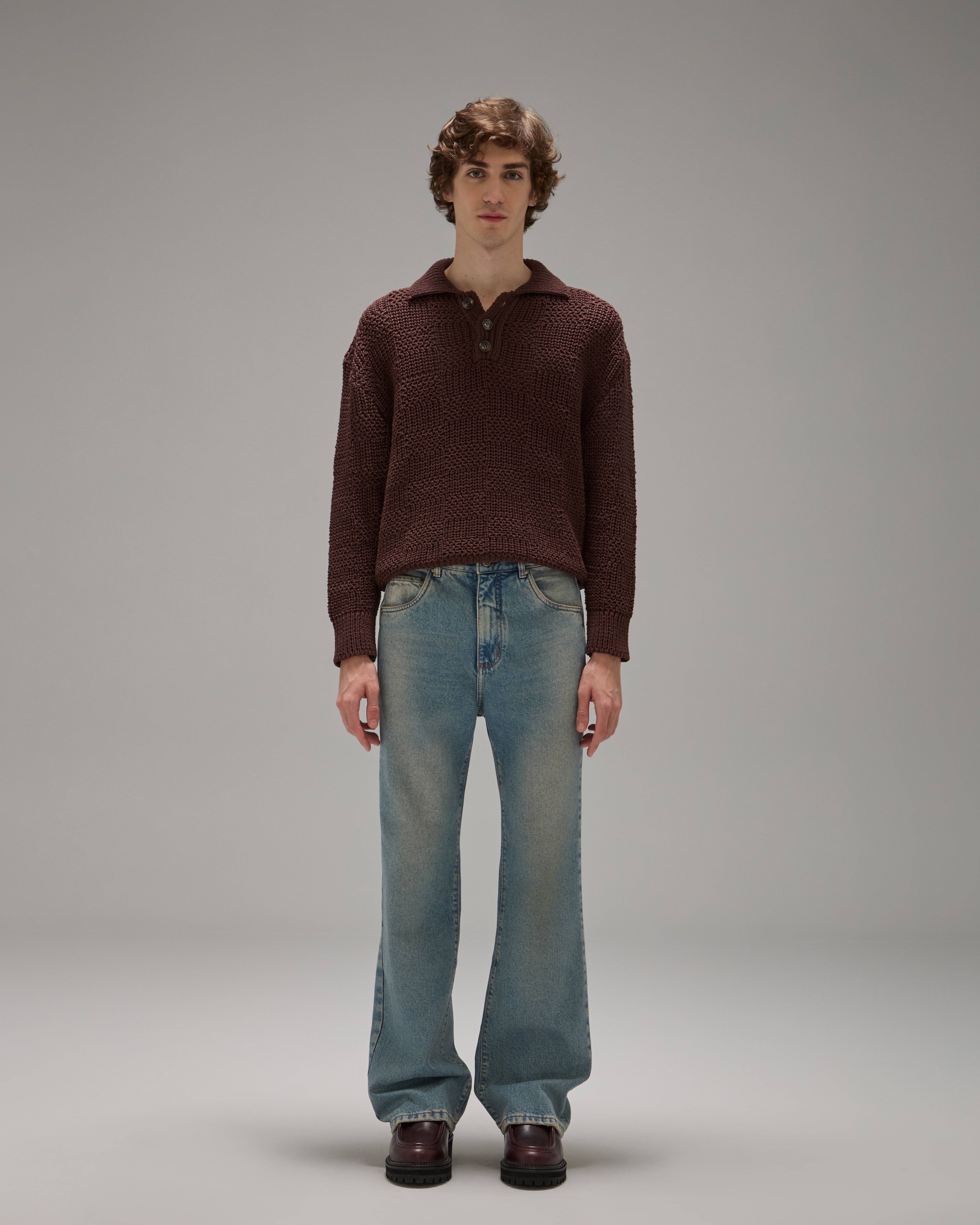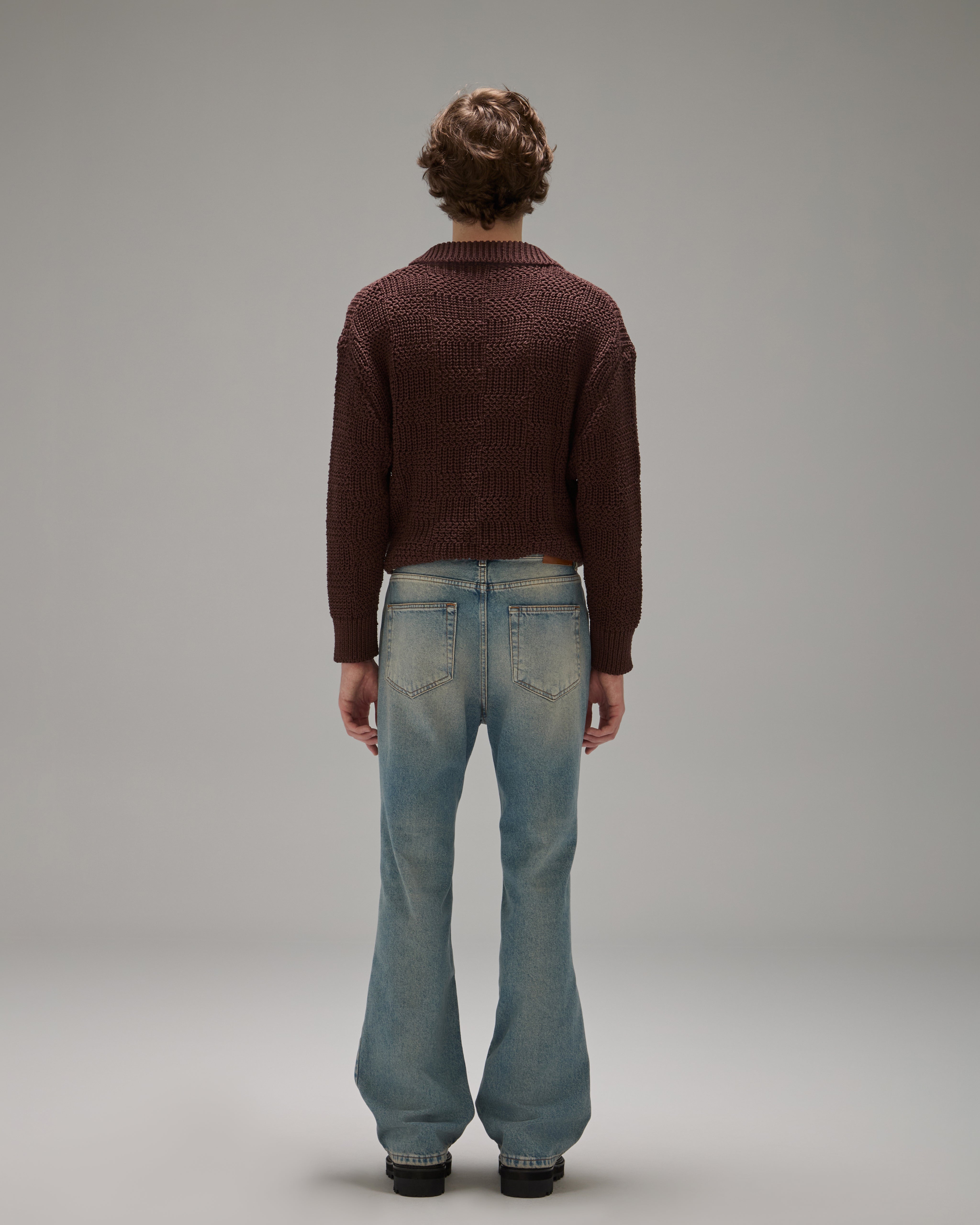 A Calça Bootcut é confeccionada em jeans pesado sem stretch, possui modelagem bootcut, caimento ajustado na cintura e no quadril, fechamento frontal por zíper e botão, cinco bolsos, etiqueta de couro natural, feita com matéria-prima de descarte e acabamento pespontado.