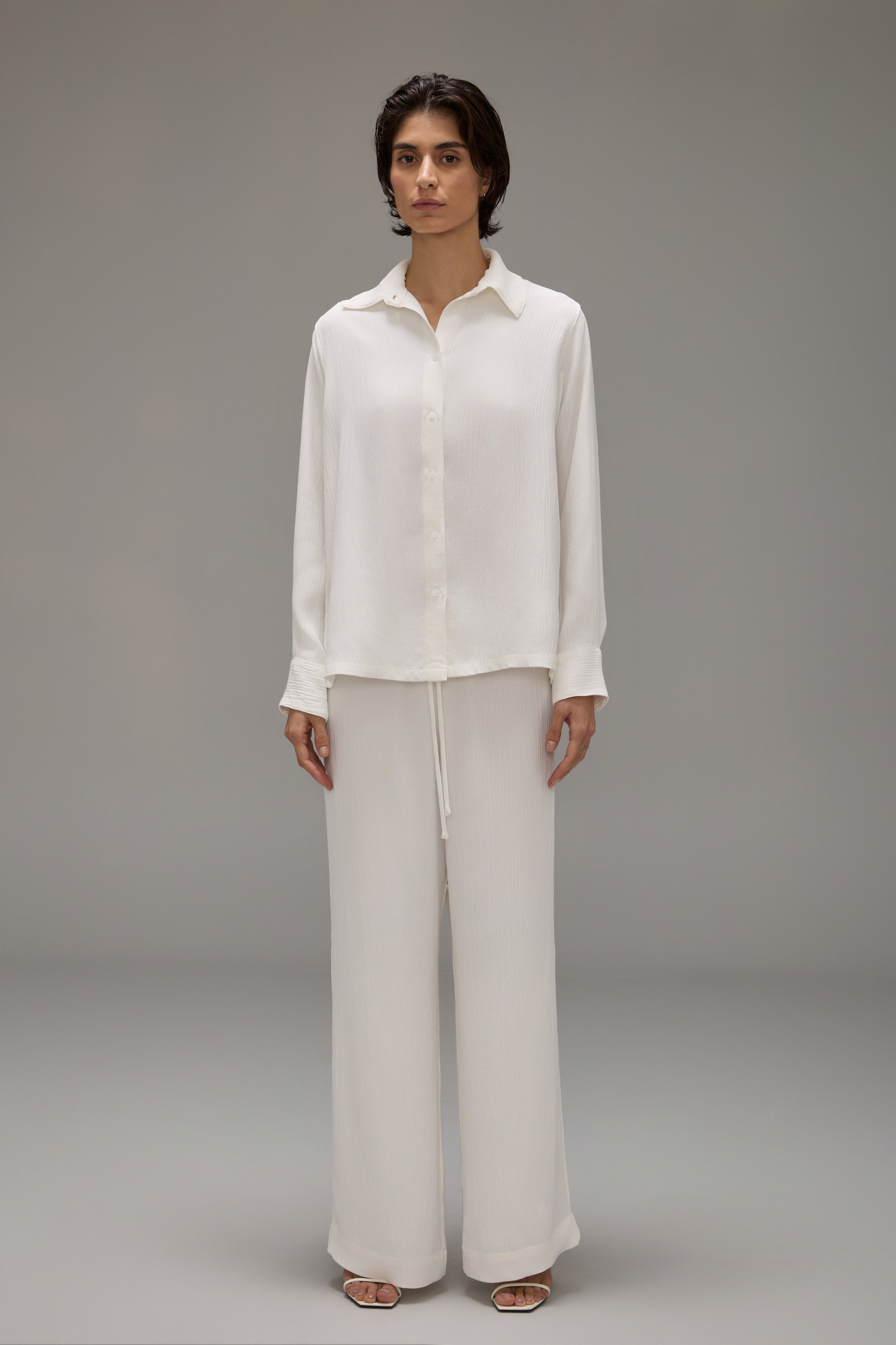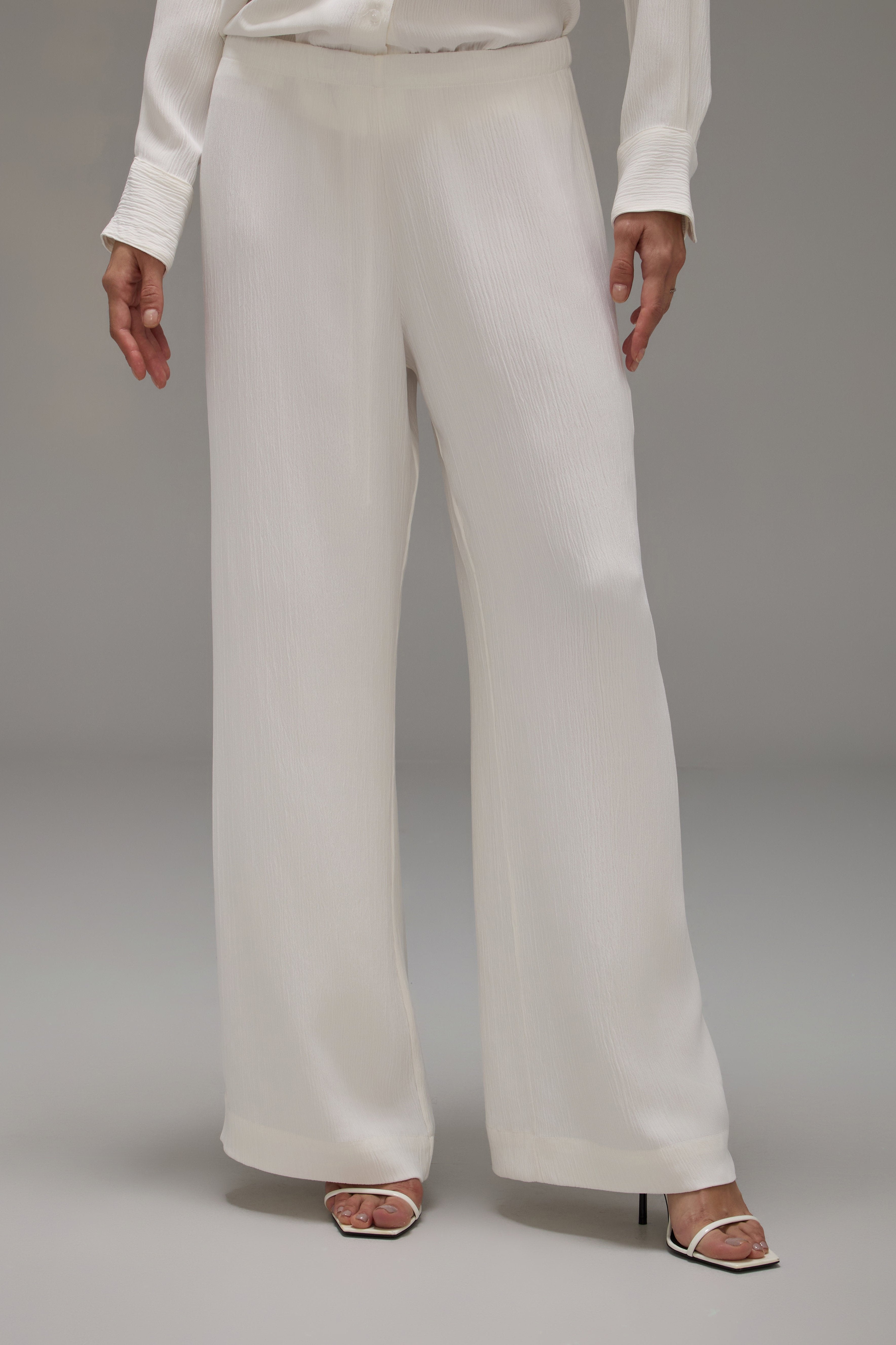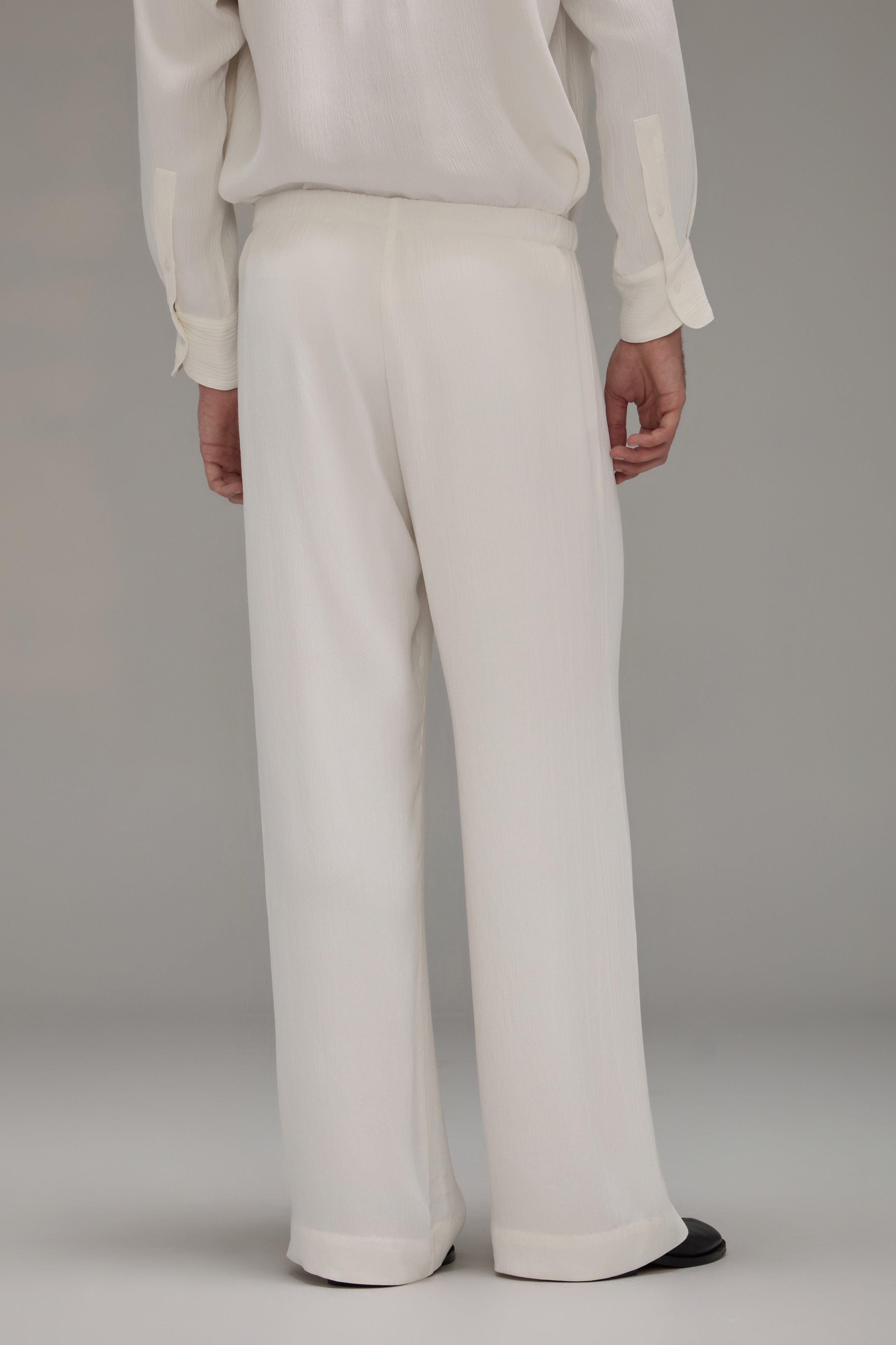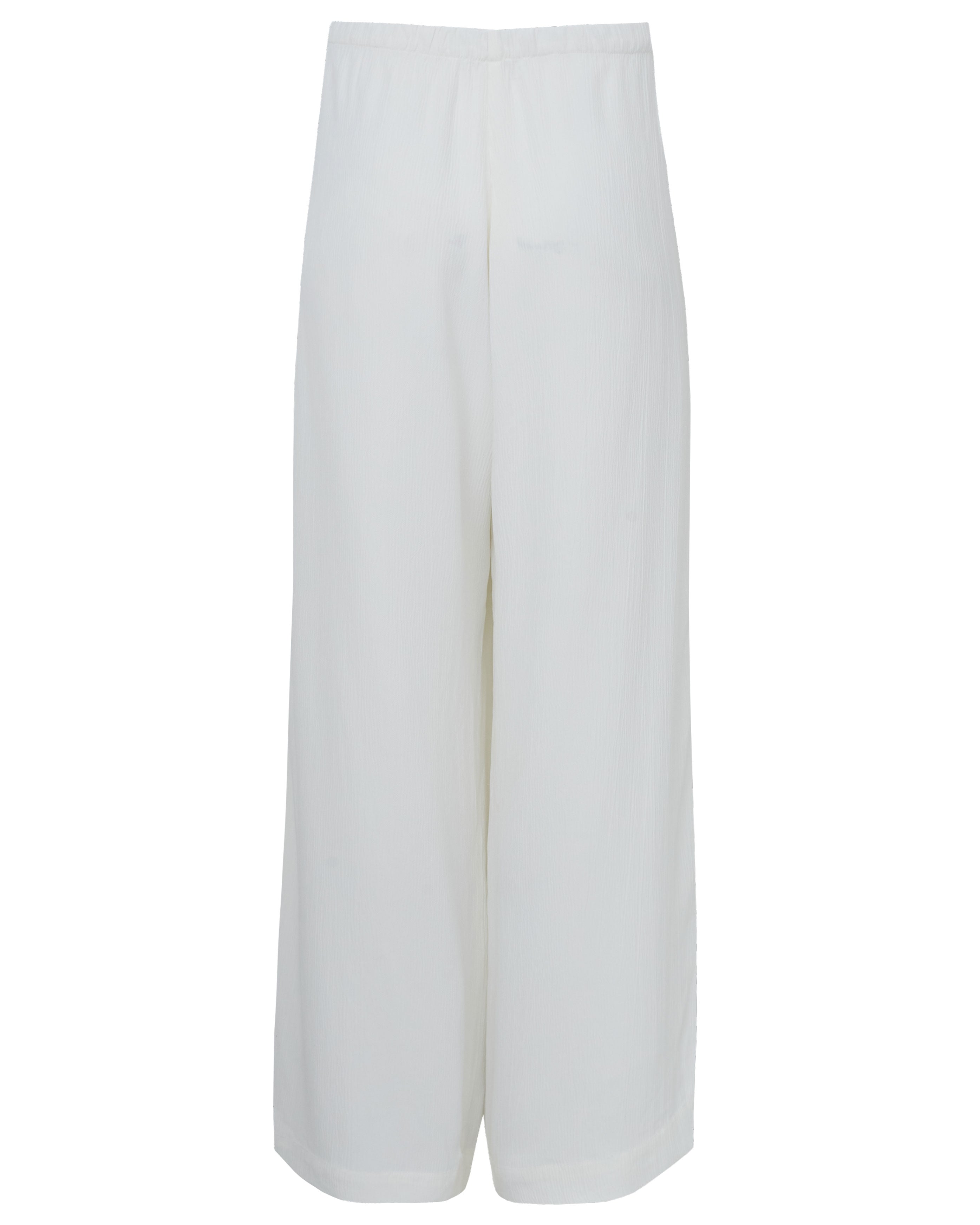 A Calça Brisa é confeccionada em crepe texturizado, possui caimento solto, cós com elástico ajustável por rolotê interno e não possui bolsos.