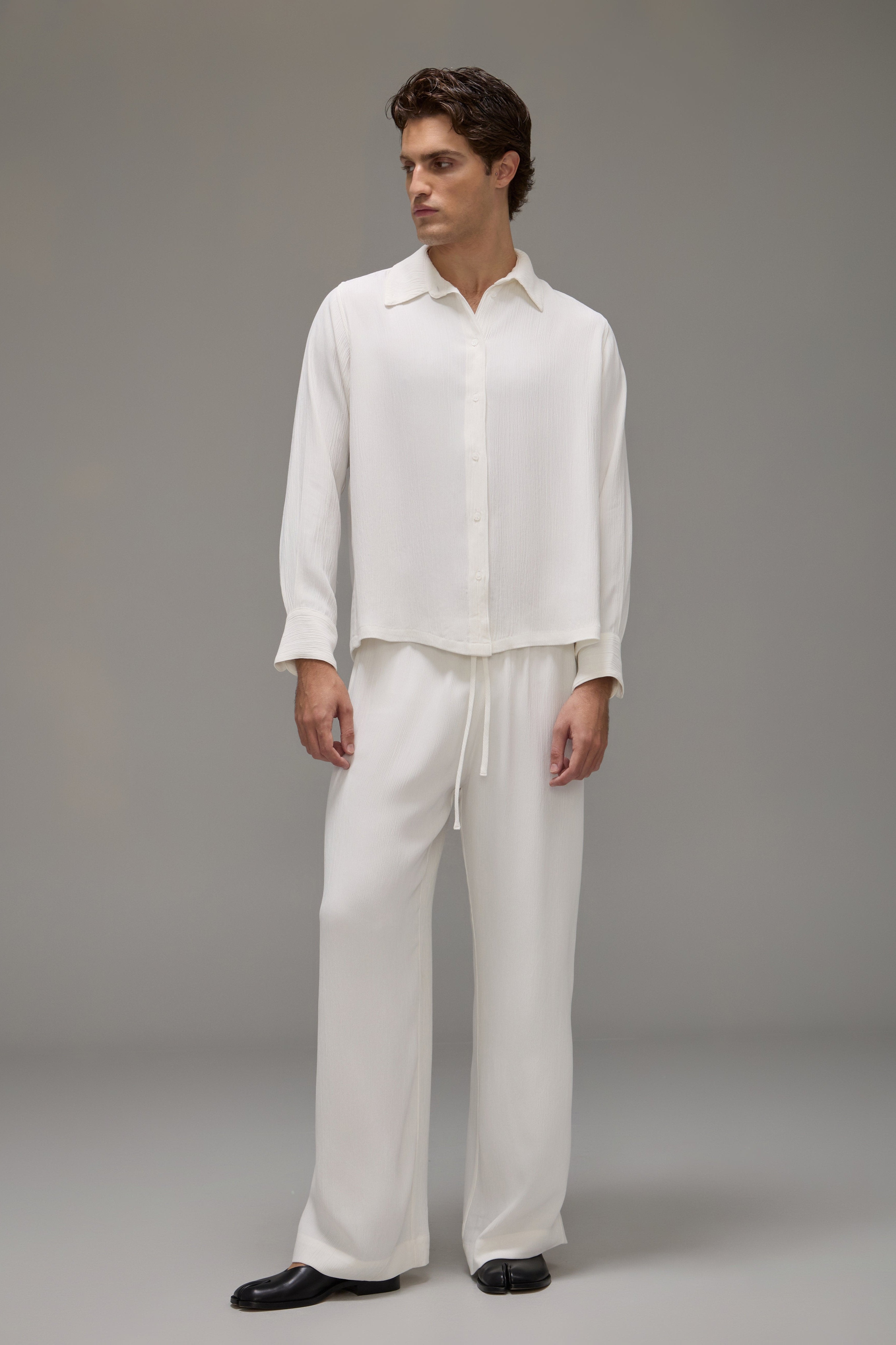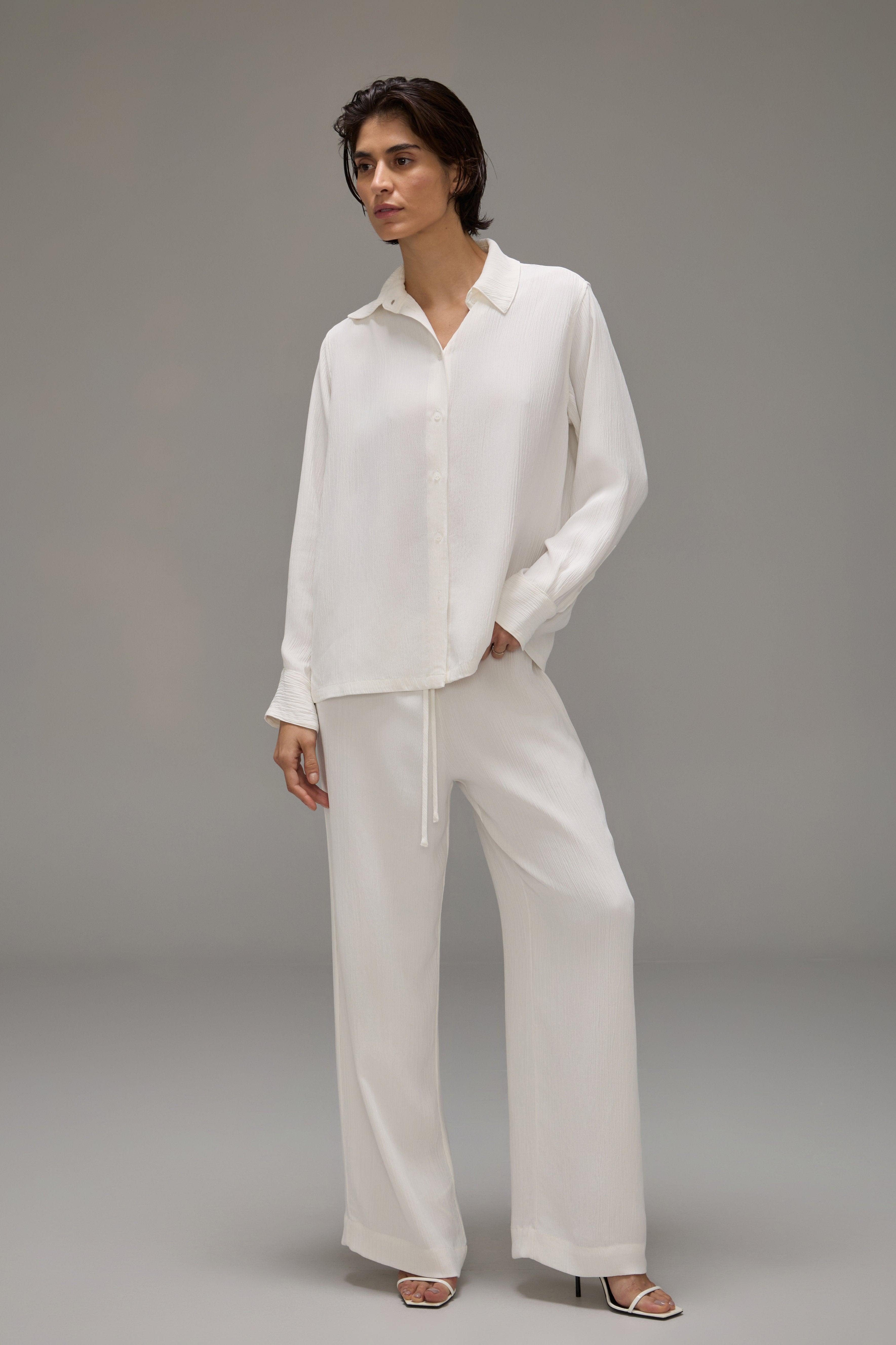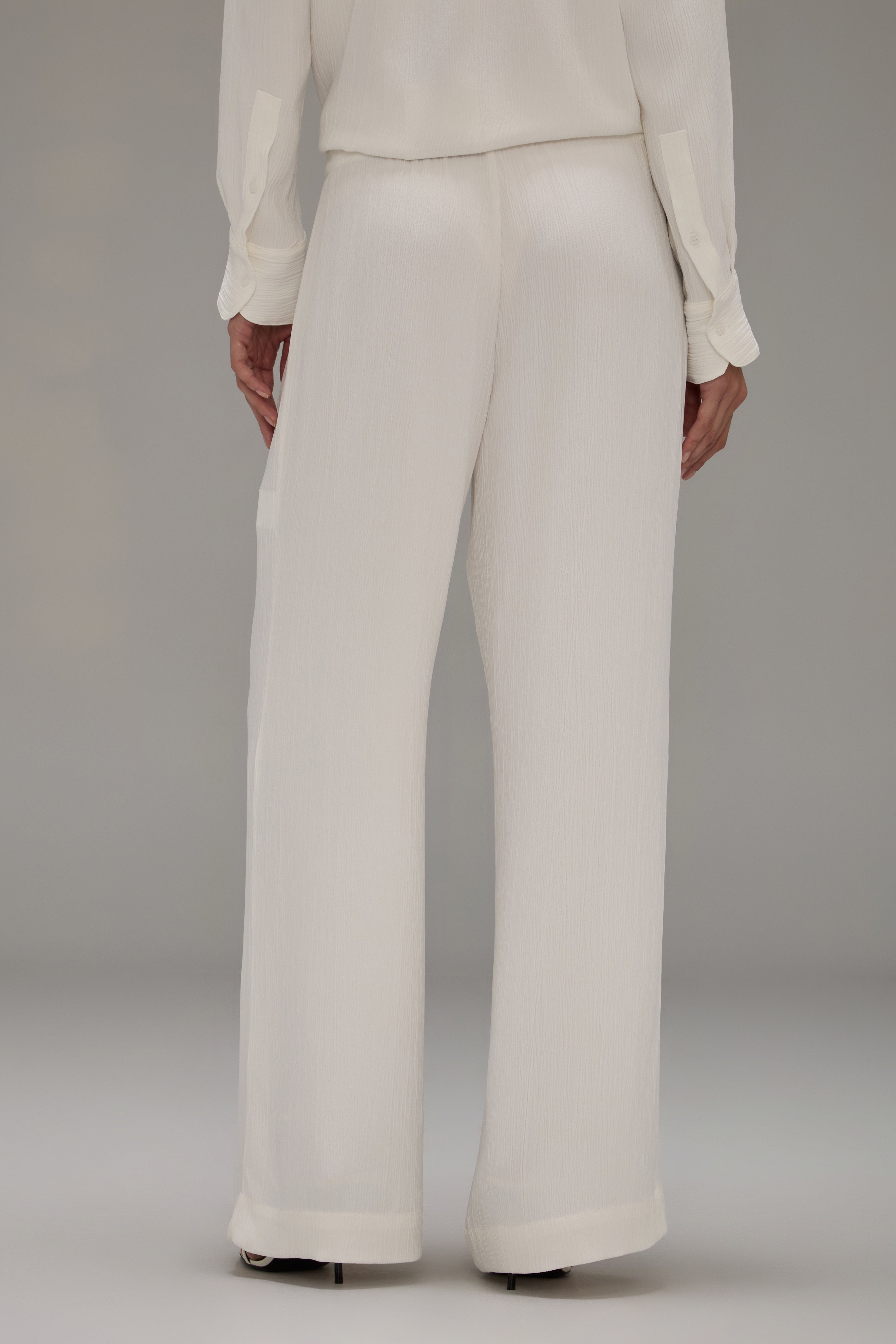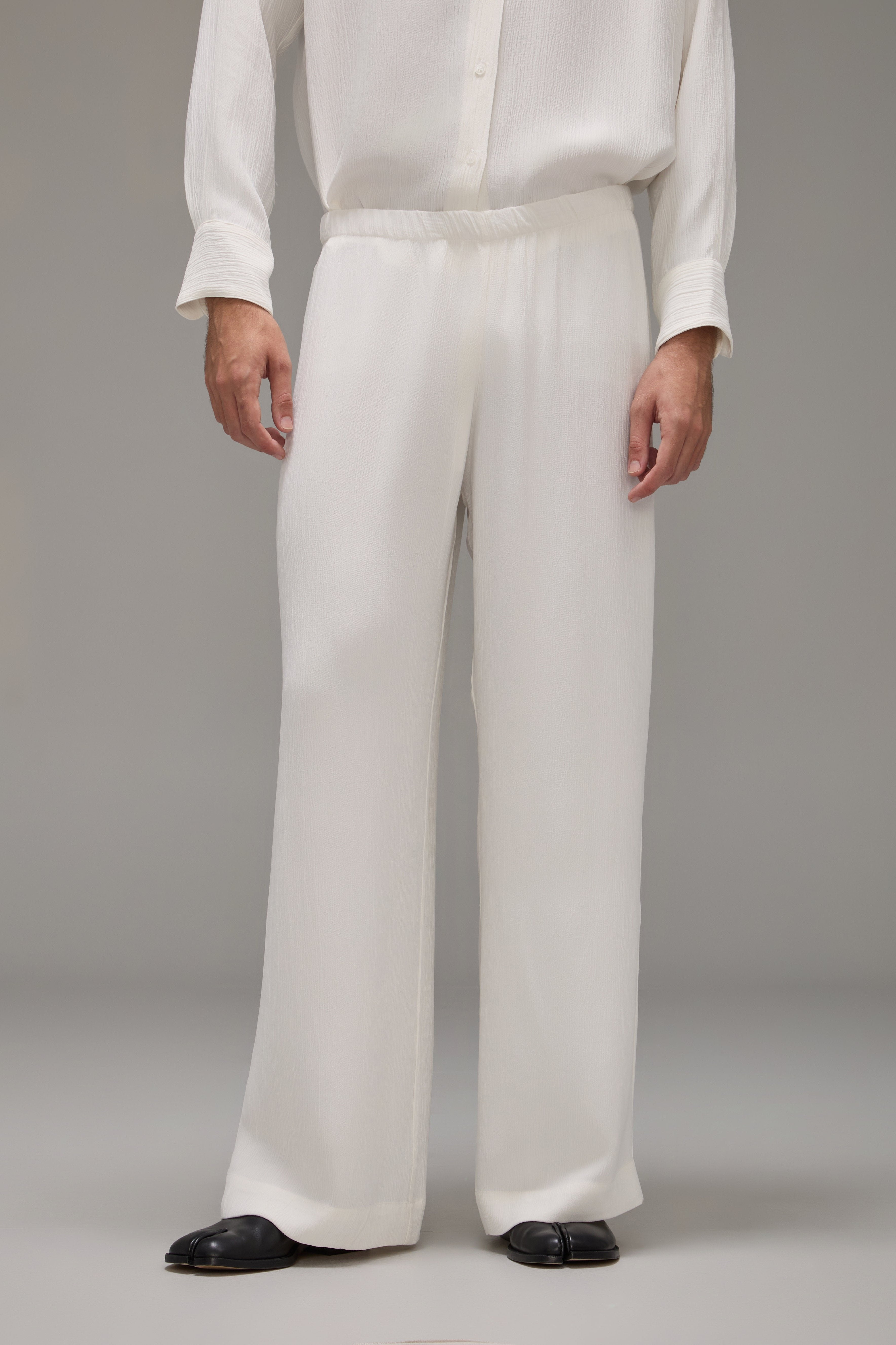A Calça Brisa é confeccionada em crepe texturizado, possui caimento solto, cós com elástico ajustável por rolotê interno e não possui bolsos.