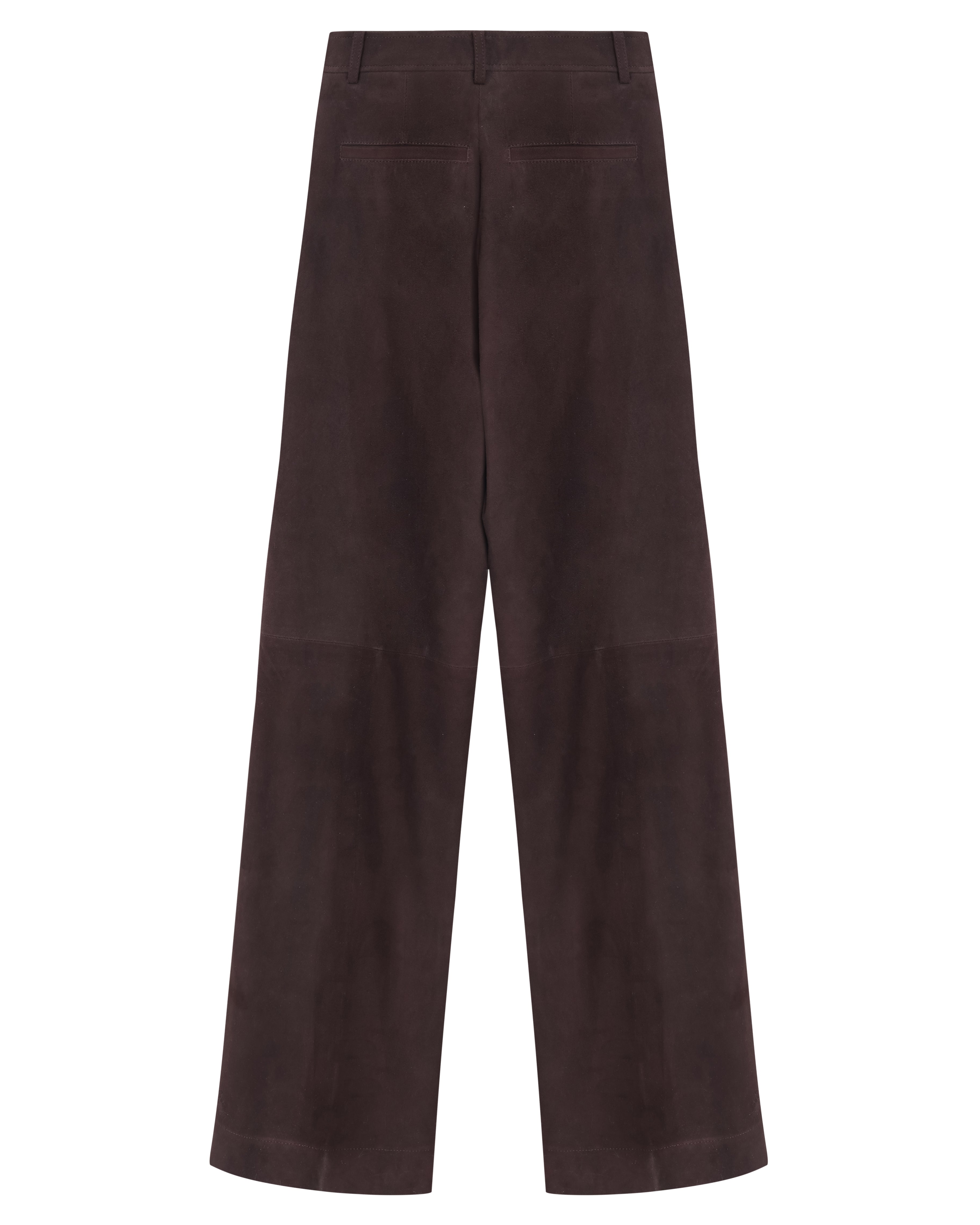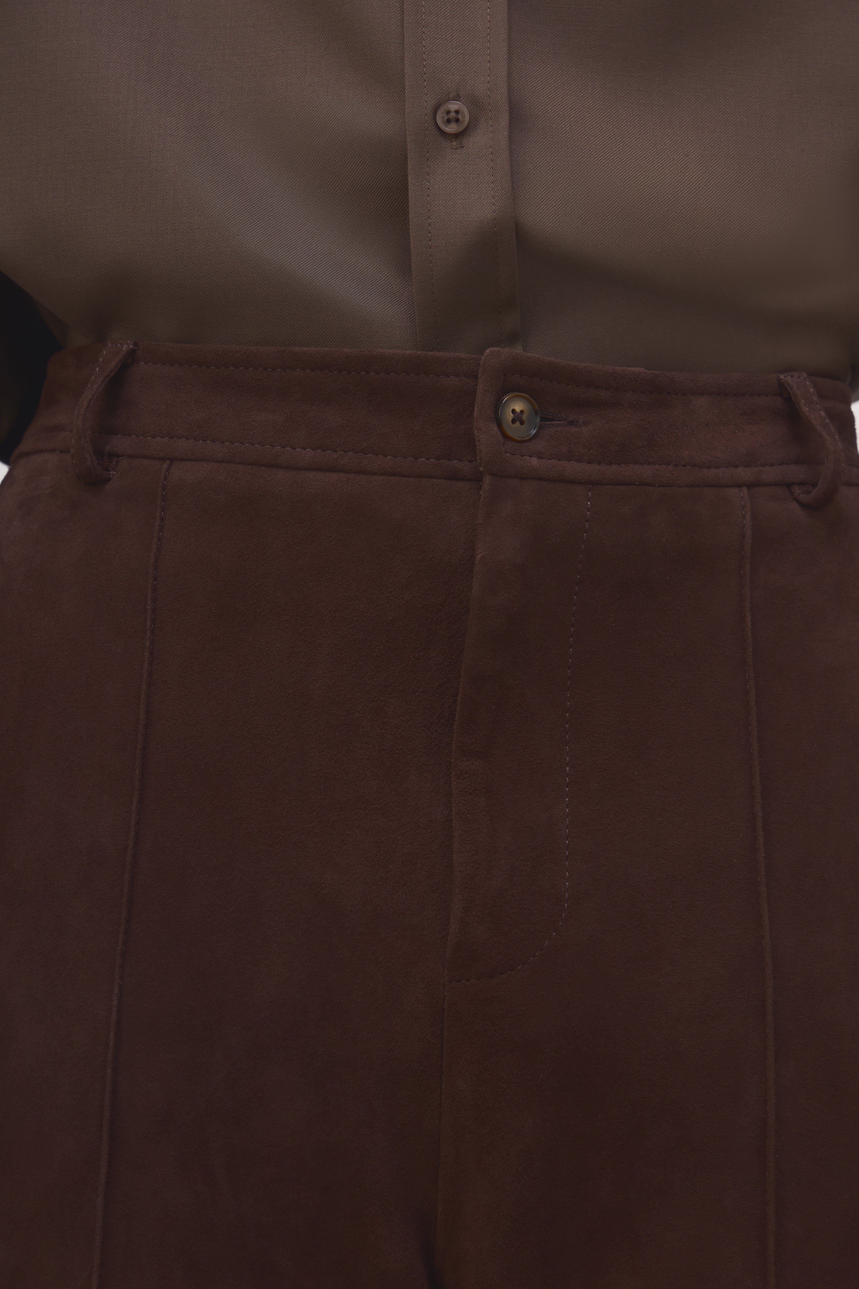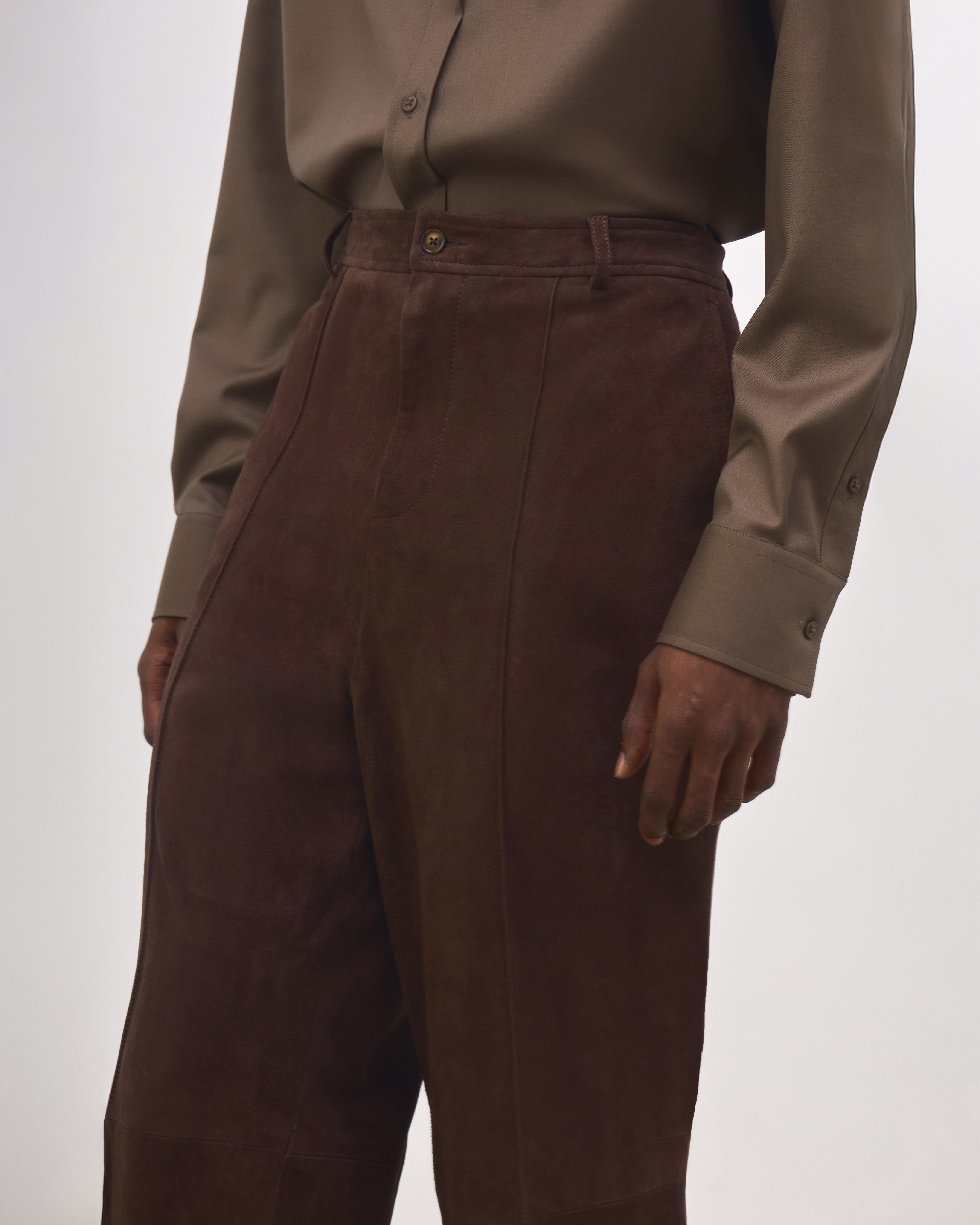 A Calça Cassio é confeccionada em camurça natural com estrutura encorpada, possui cós com passantes, fechamento frontal com zíper e botão de pressão, vivos verticais, bolsos modelo faca nas laterais, bolsos embutidos posterior e barra alongada.