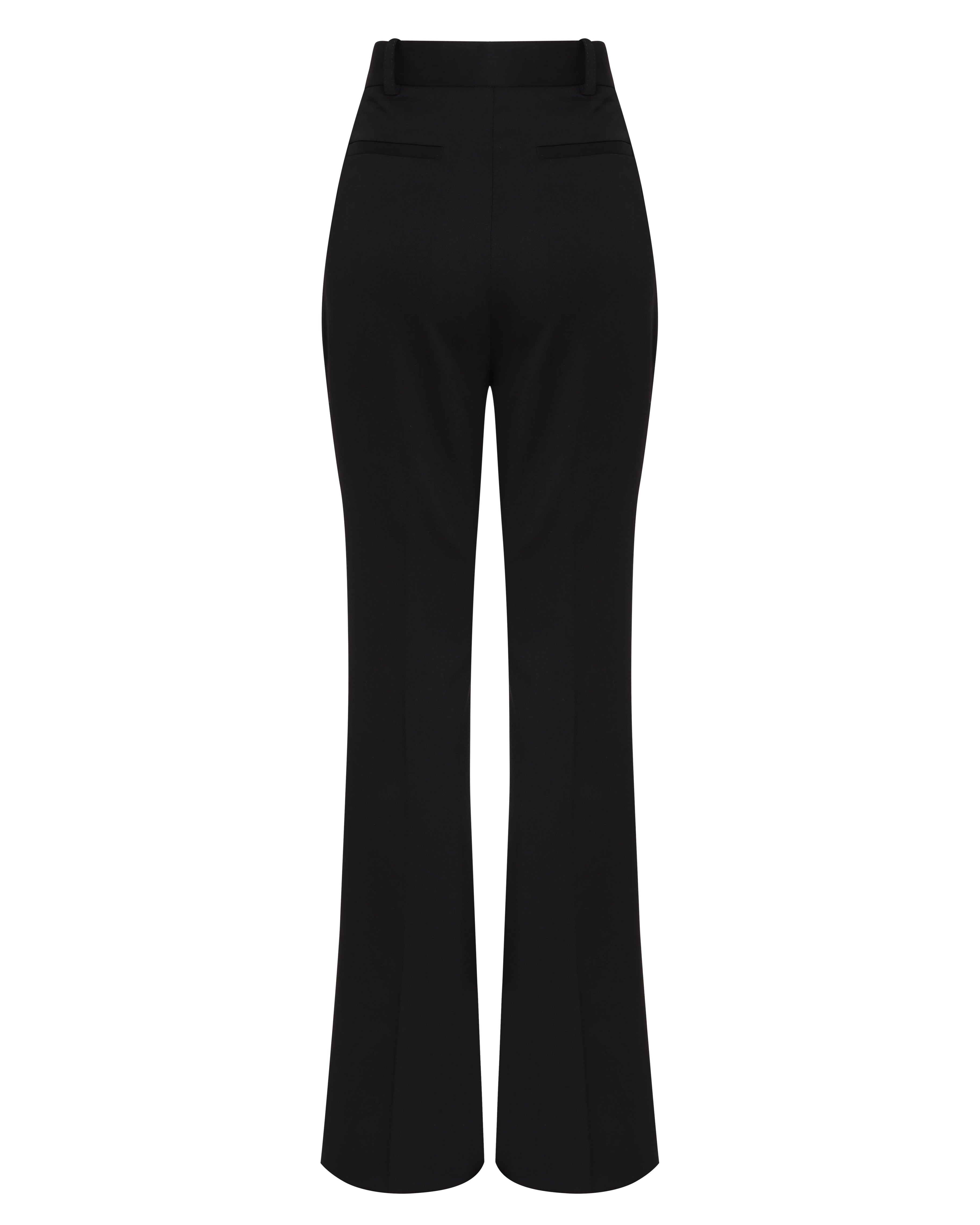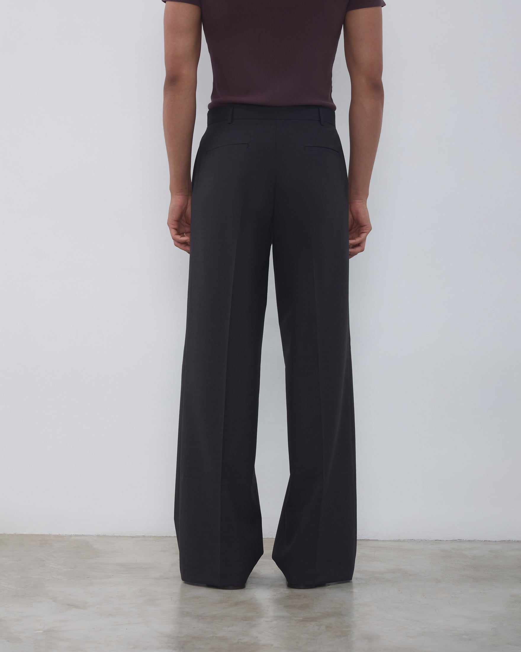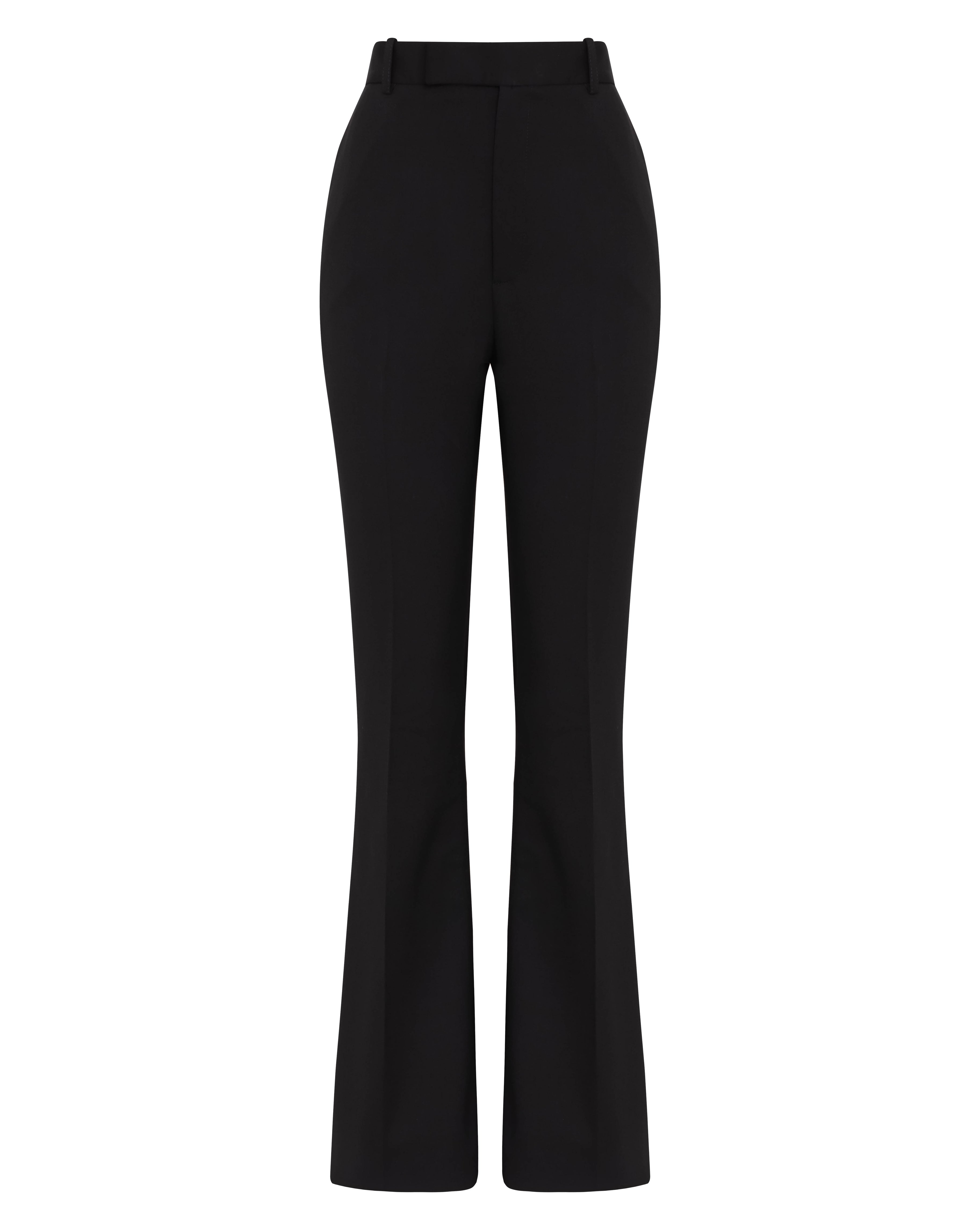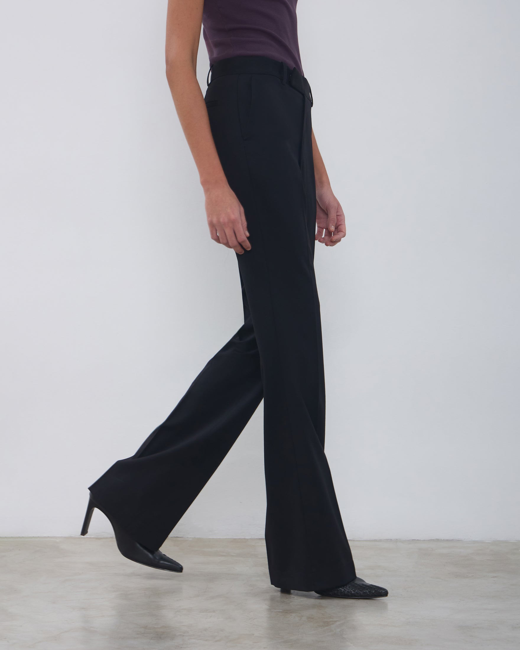 A Calça Dama é confeccionada em lã, possui modelagem de alfaiataria, caimento levemente flare, cintura alta, cós com passantes, fechamento frontal por zíper, vinco vertical, dois bolsos modelo faca nas laterais, dois bolsos embutidos posteriores, barra invisível e acabamentos internos de alfaiataria tradicional.