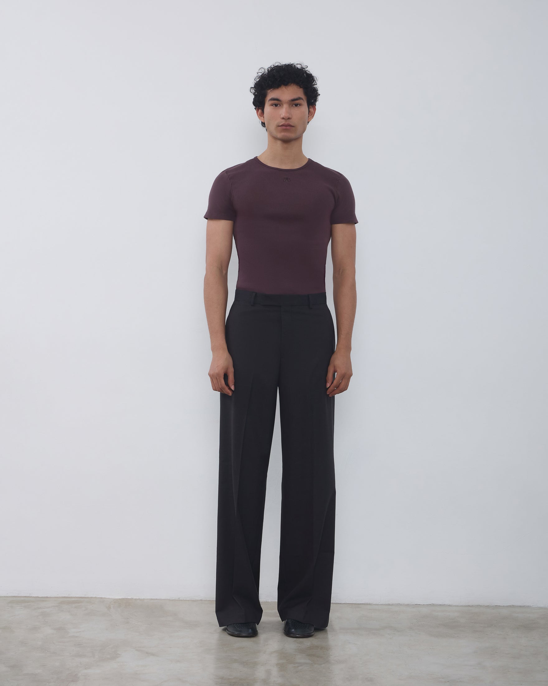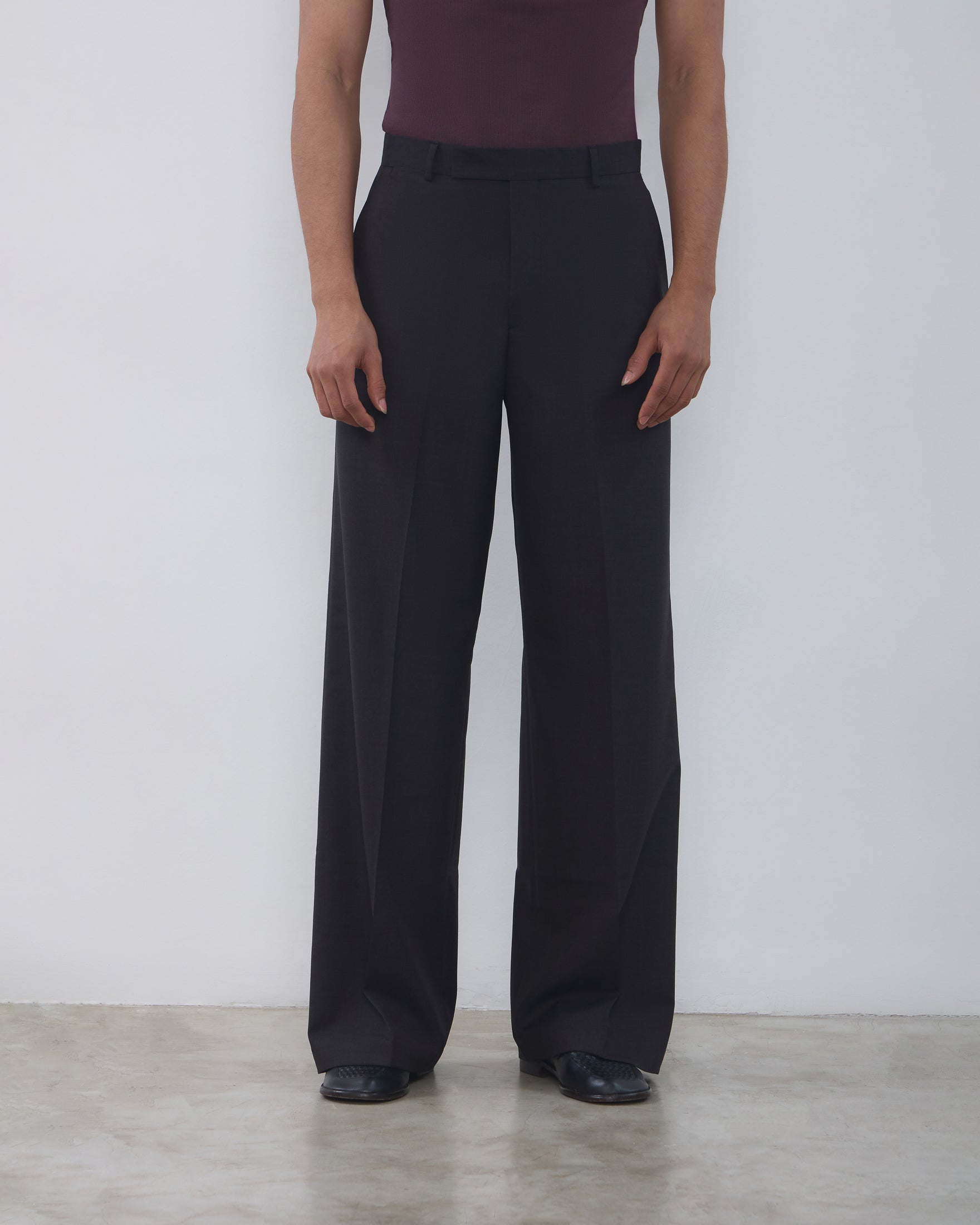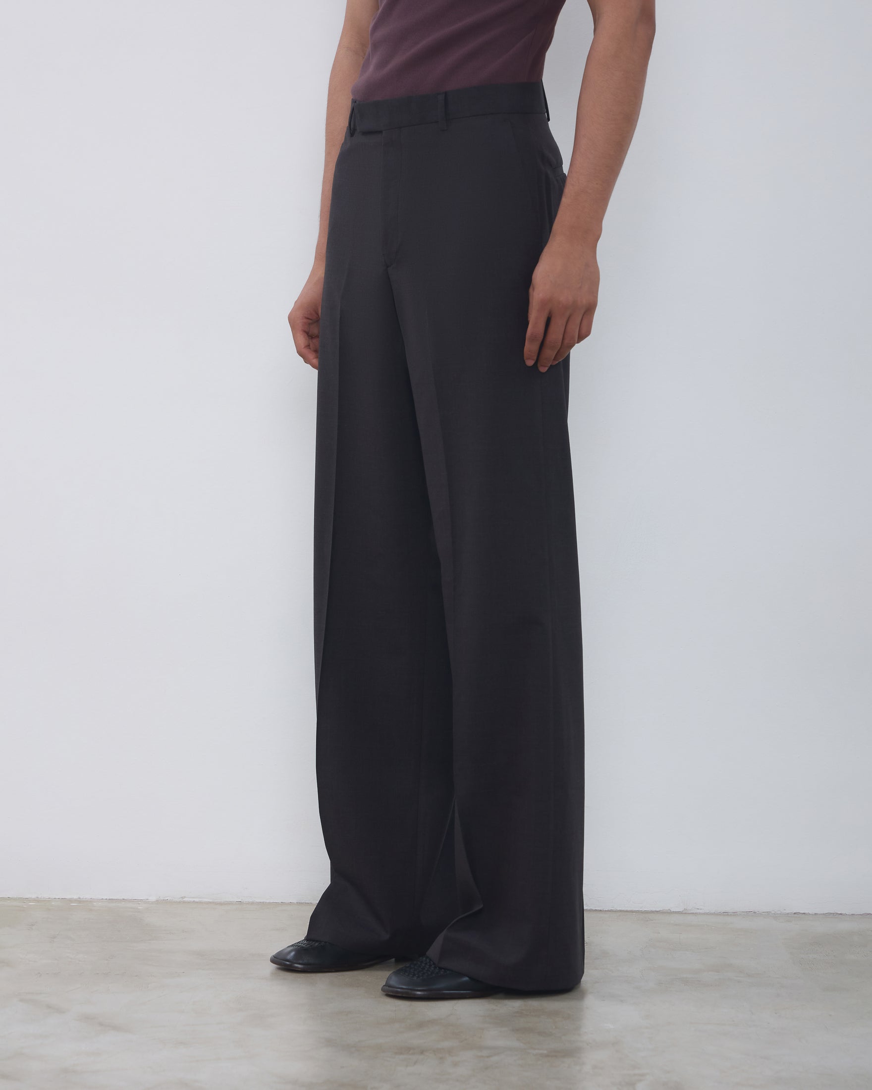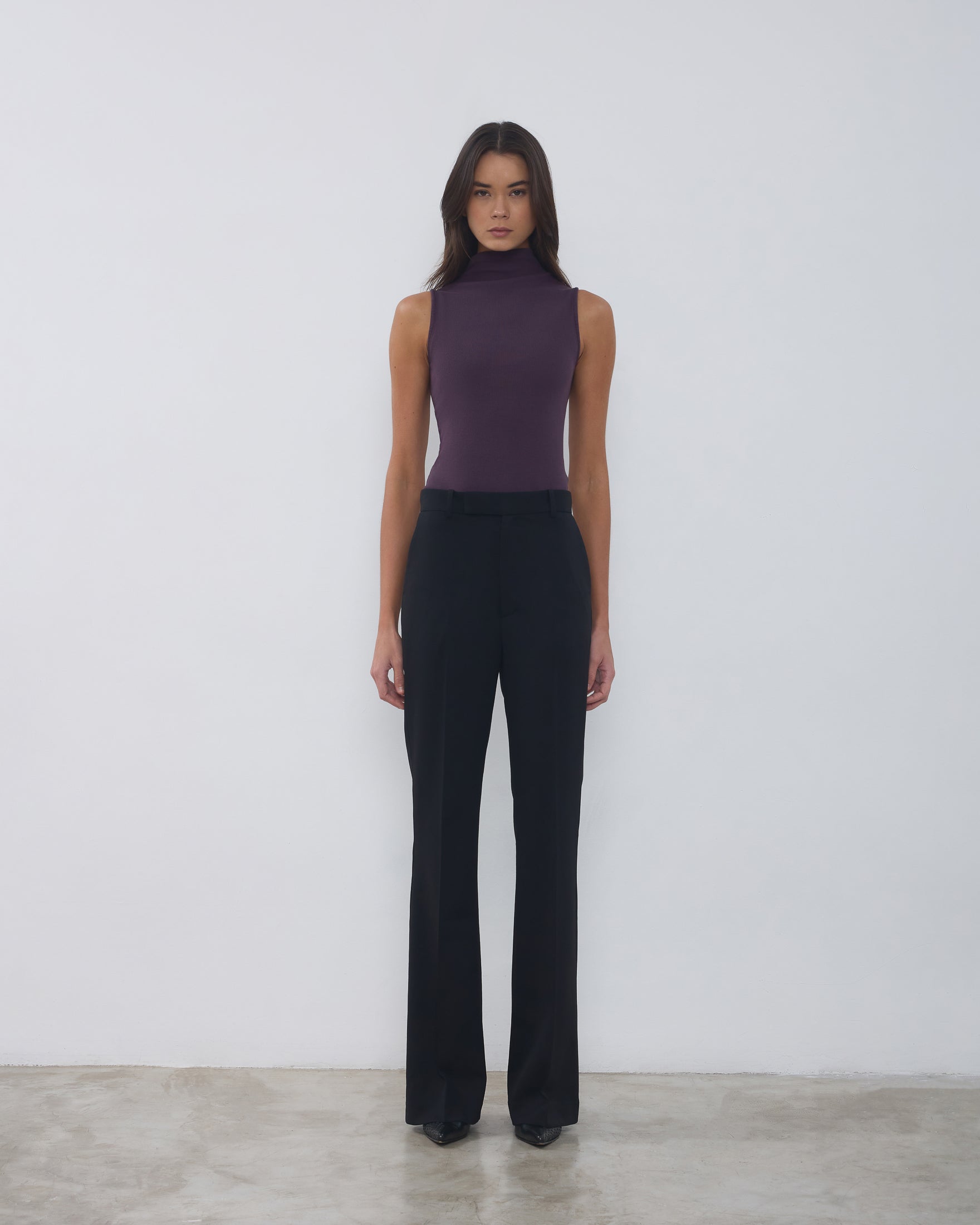 A Calça Dama é confeccionada em lã, possui modelagem de alfaiataria, caimento levemente flare, cintura alta, cós com passantes, fechamento frontal por zíper, vinco vertical, dois bolsos modelo faca nas laterais, dois bolsos embutidos posteriores, barra invisível e acabamentos internos de alfaiataria tradicional.