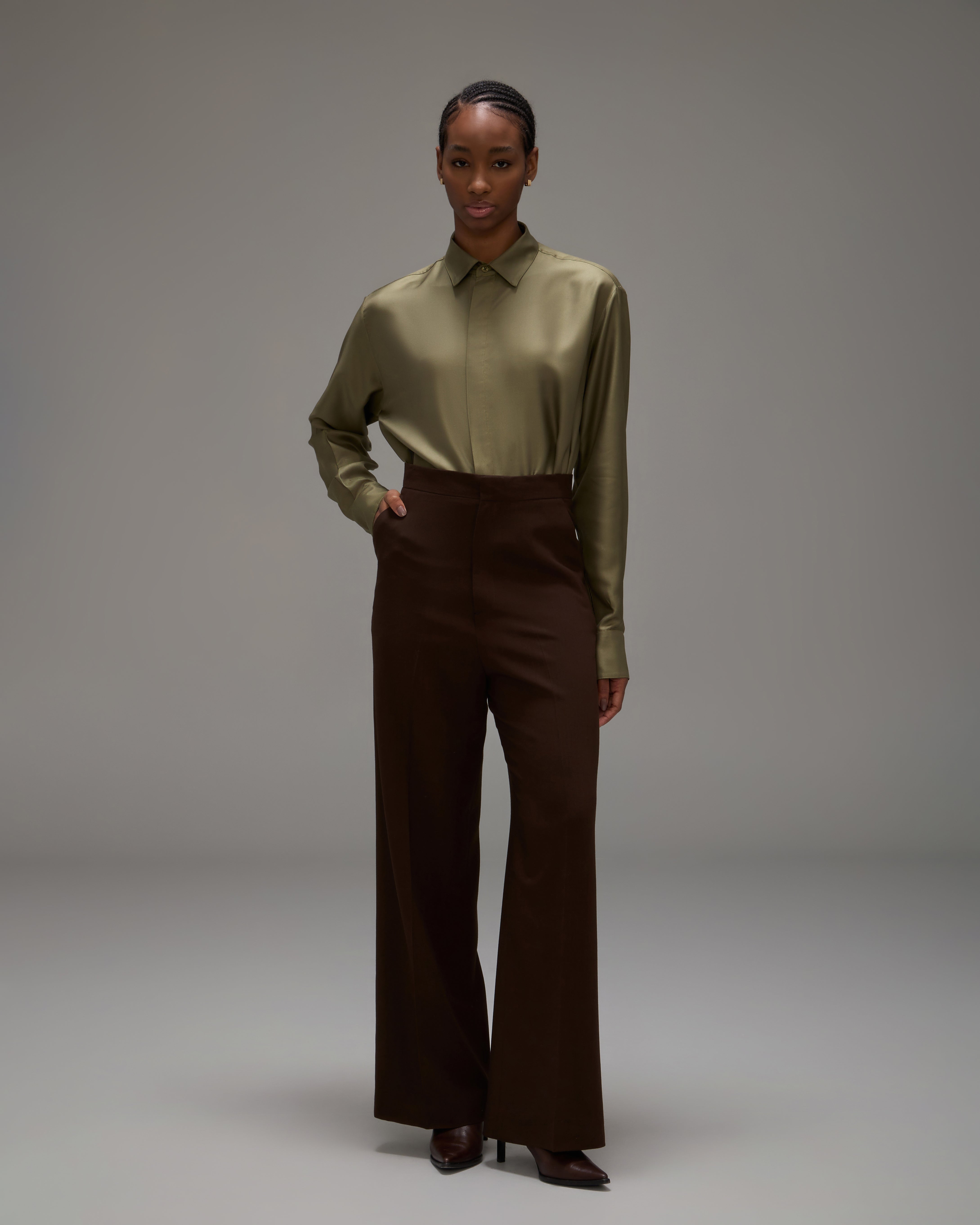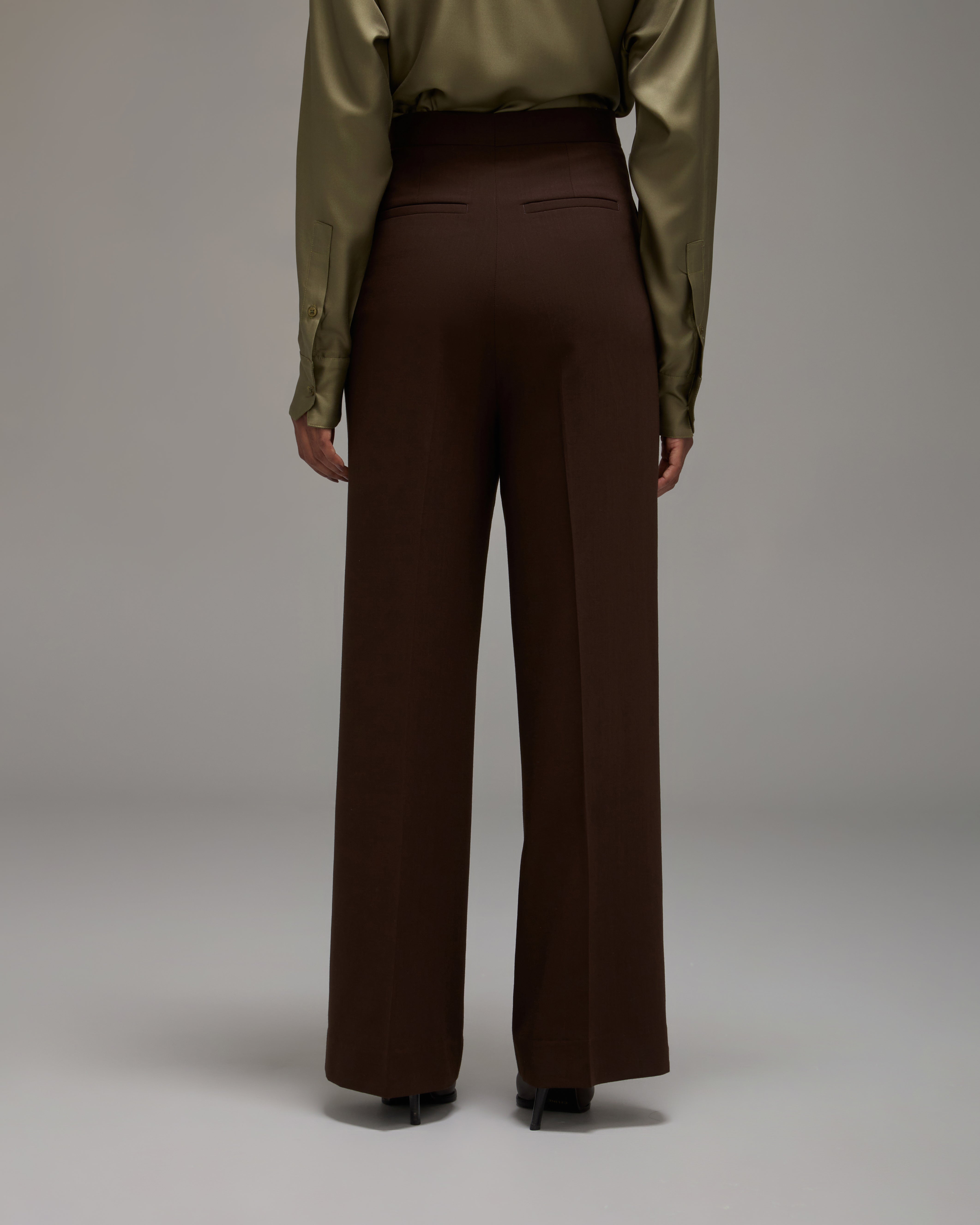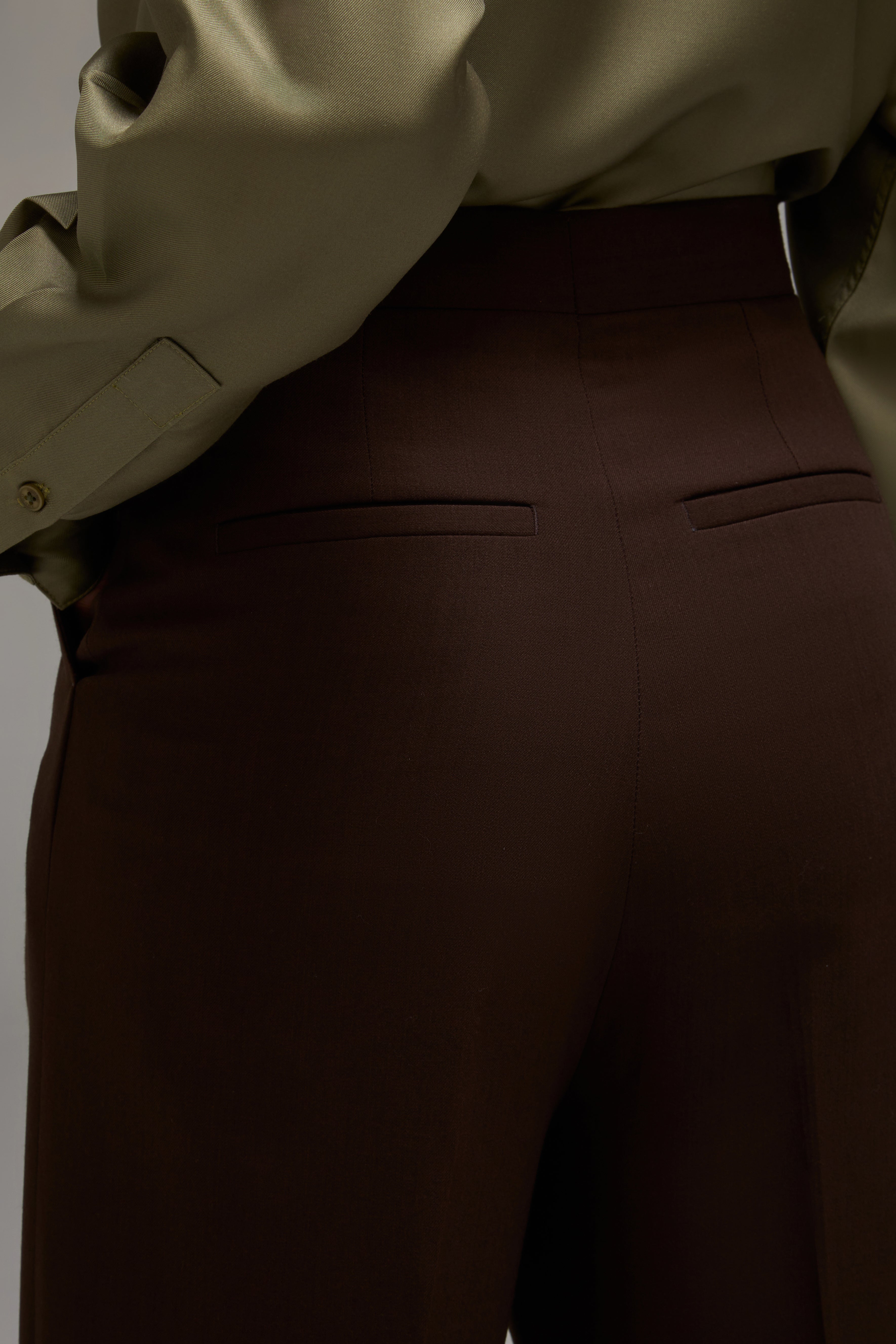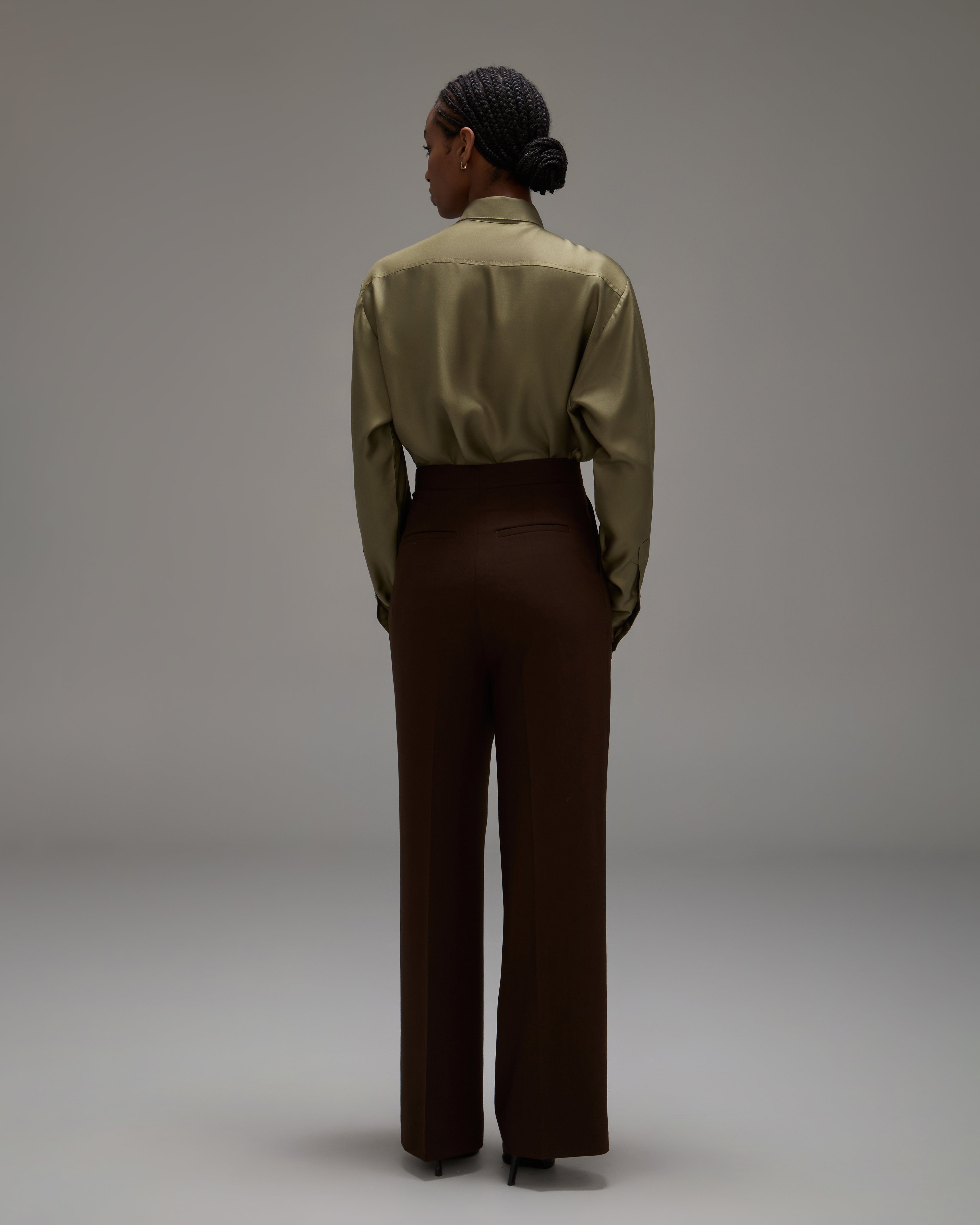 A Calça Elis é confeccionada em lã deadstock, possui modelagem de alfaiataria, cintura alta, cós sem passantes, fechamento frontal por ganchos interno, dois bolsos faca nas laterais e dois bolsos posteriores embutidos e detalhe de frisos de passadoria frontais e posteriores.