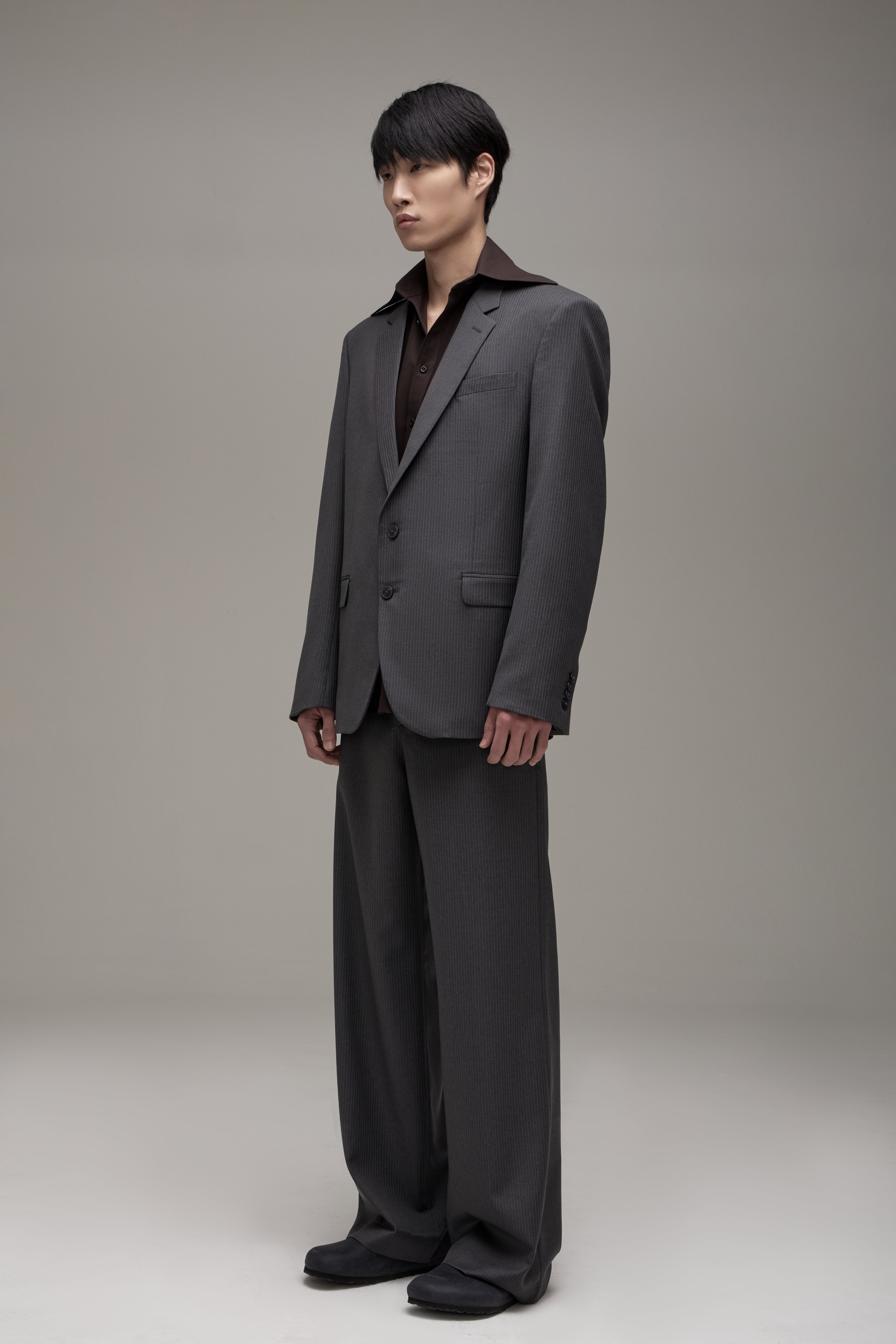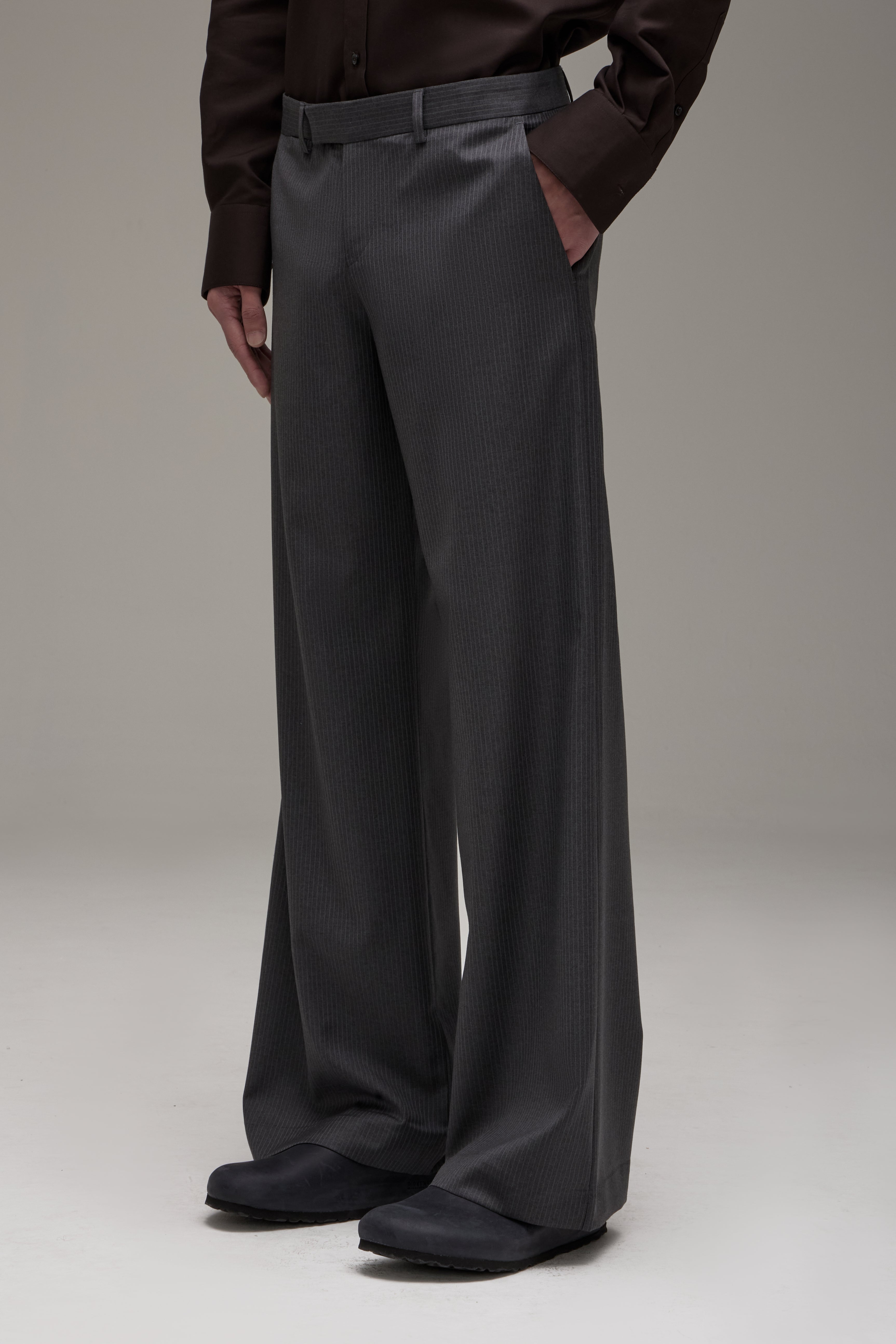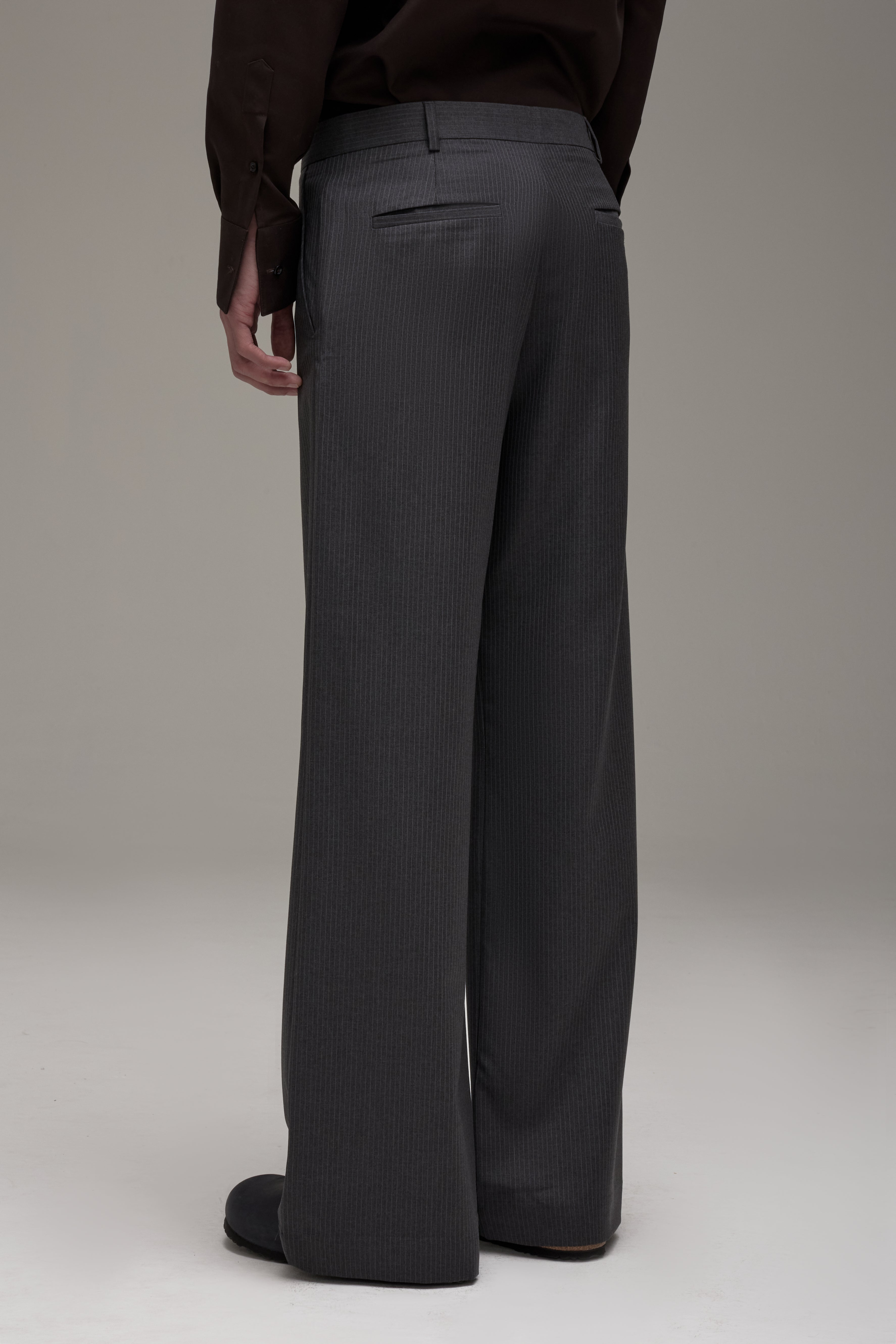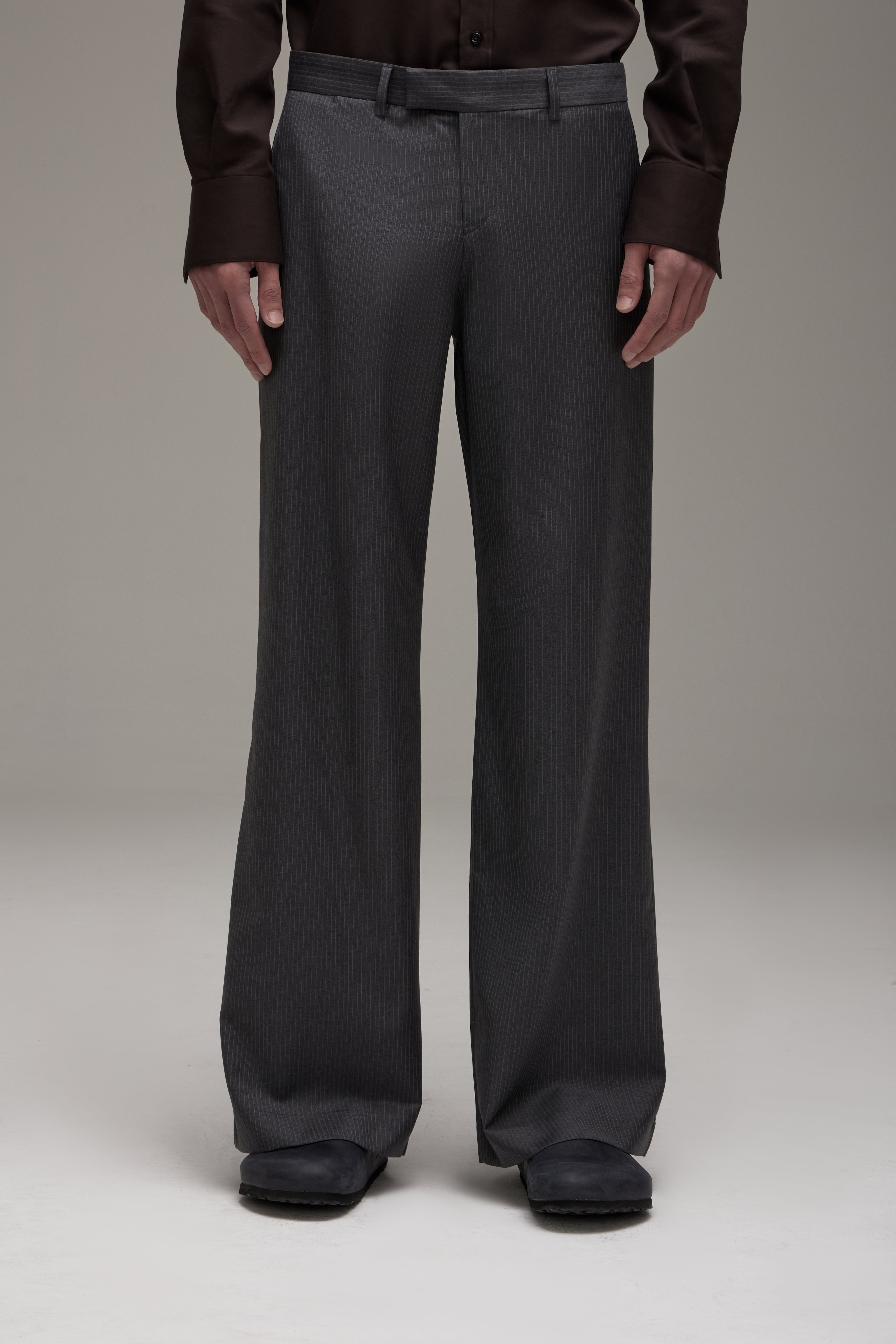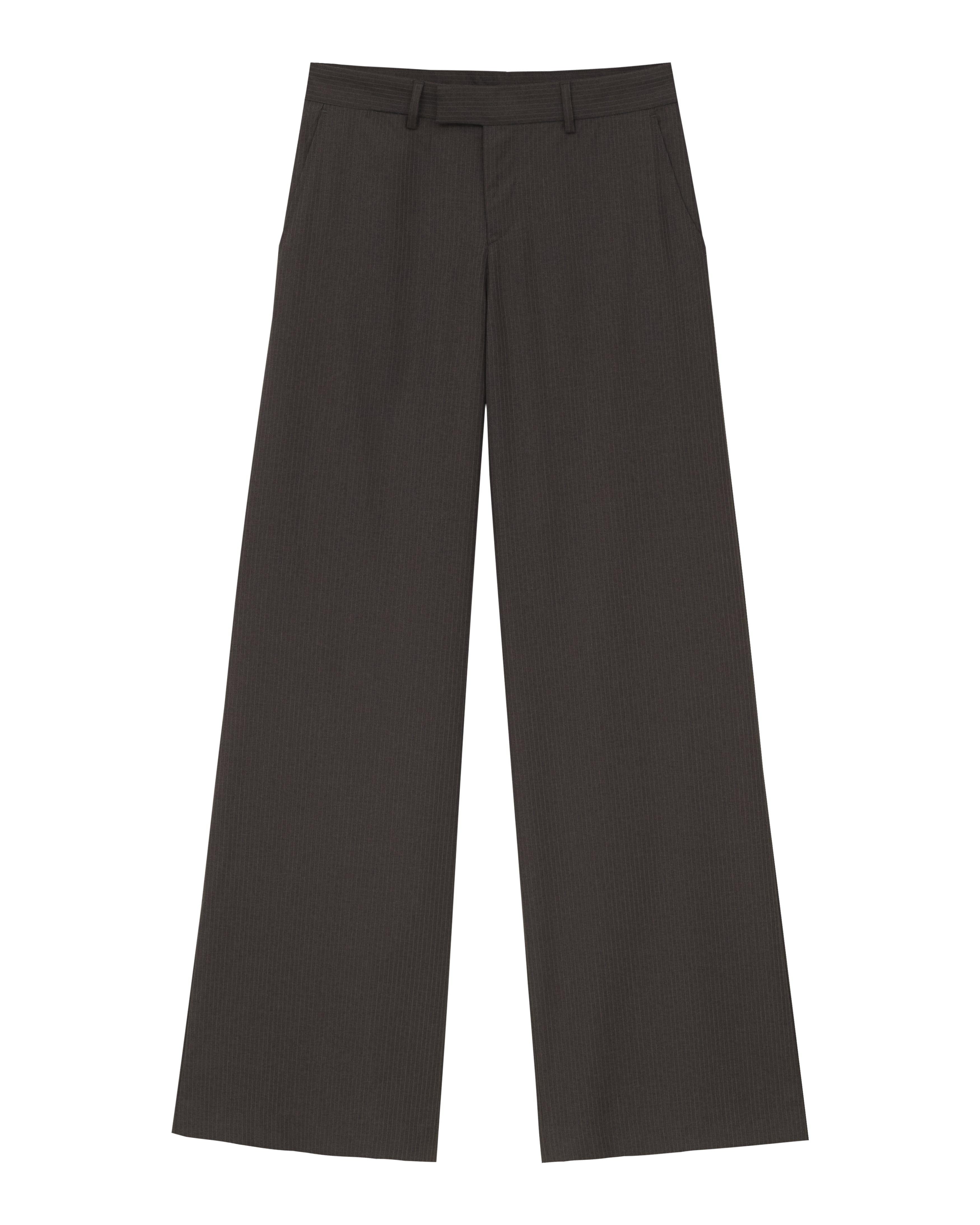 A Calça Ezra é confeccionada em lã importada, possui padronagem risca de giz, modelagem de alfaiataria, cintura baixa, cós com passantes, fechamento frontal por zíper e fecho interno, dois bolsos modelo faca nas laterais, dois bolsos embutidos posteriores, forro embutido, barra invisível e acabamentos internos de alfaiataria tradicional, com viés e ponto picado.