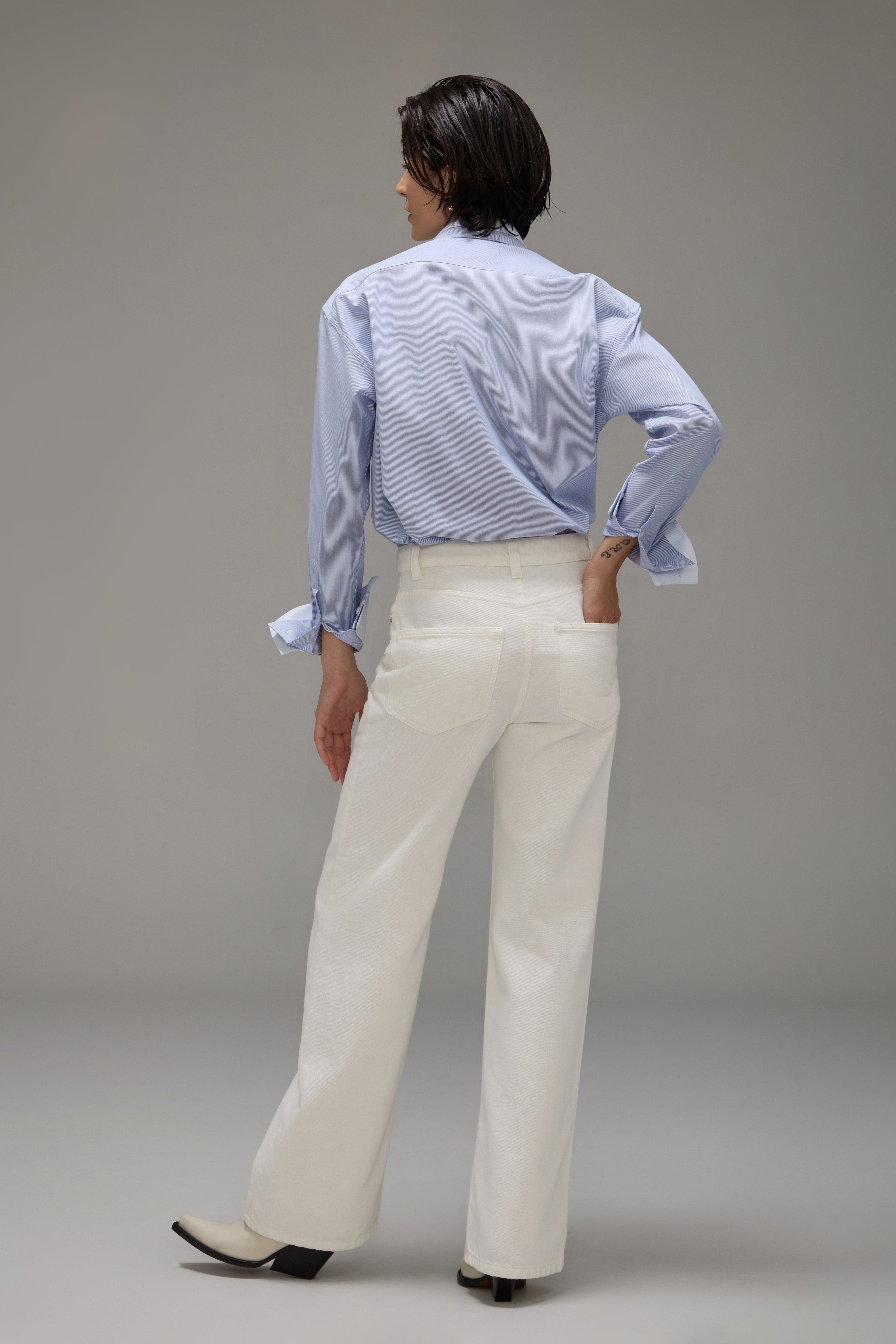 A Calça Gal é confeccionada em sarja branca pesada, possui modelagem flare, cintura alta, cós com passantes, fechamento frontal por botão e zíper, cinco bolsos, etiqueta da marca feita em couro natural em matéria-prima de descarte e acabamento pespontado.