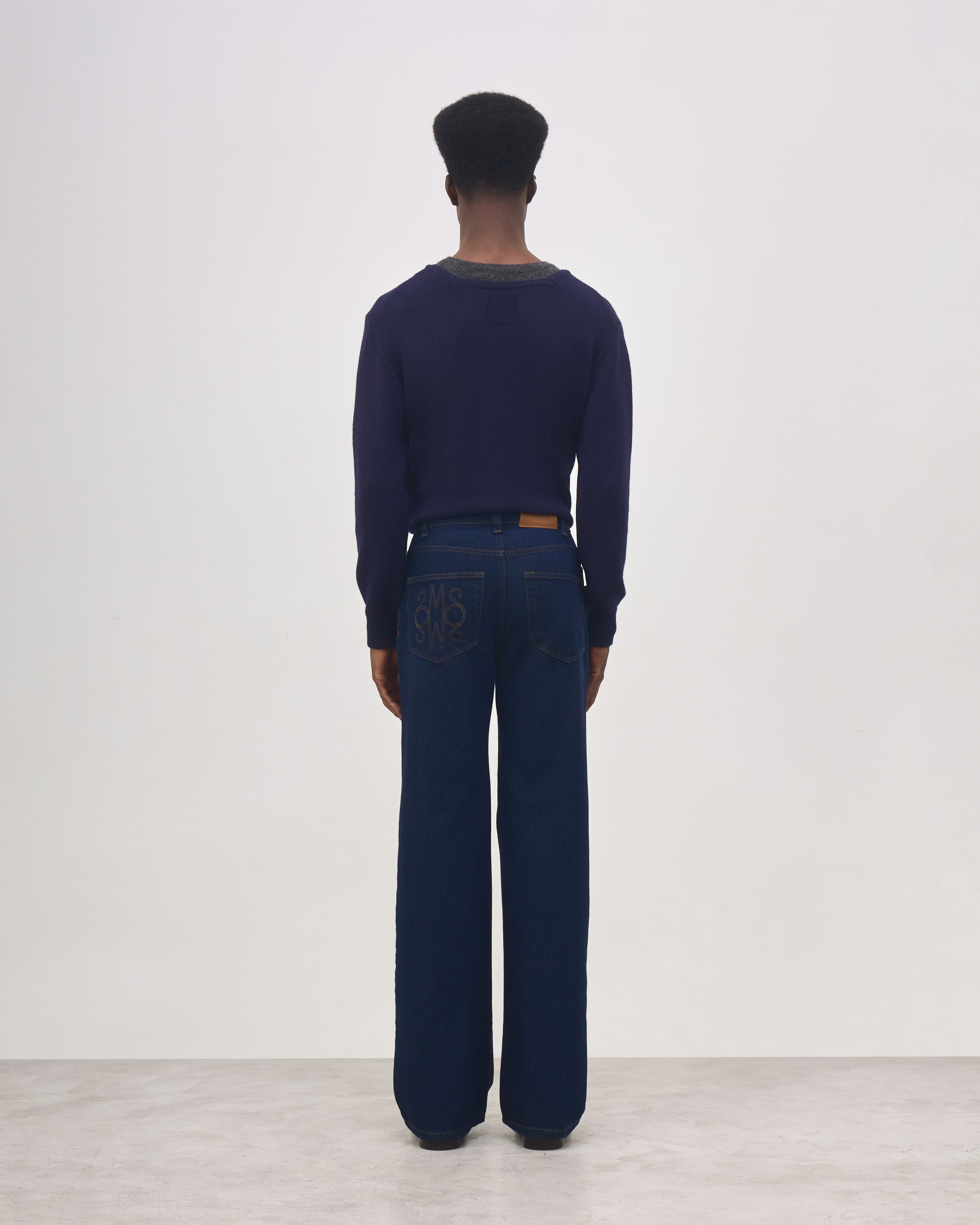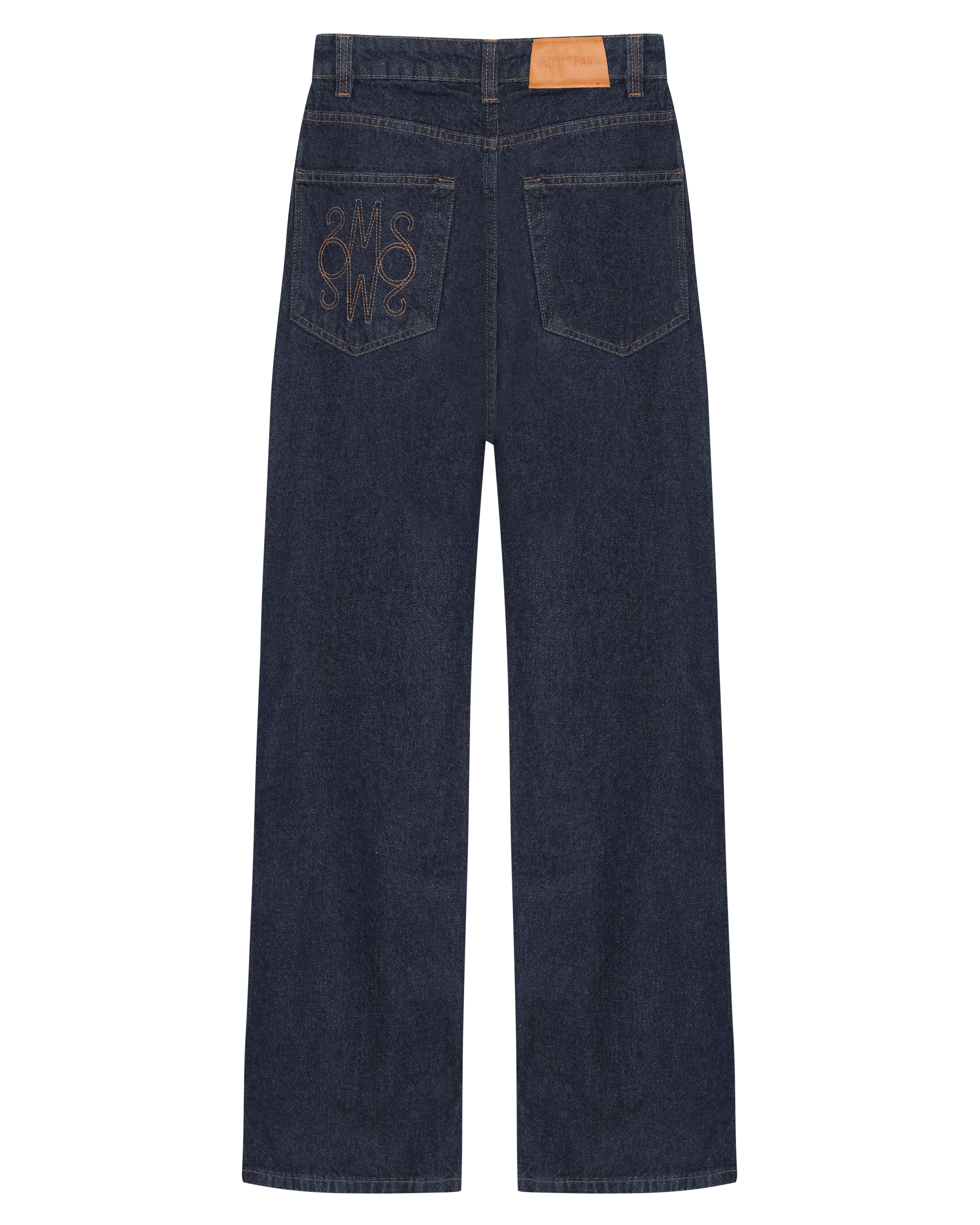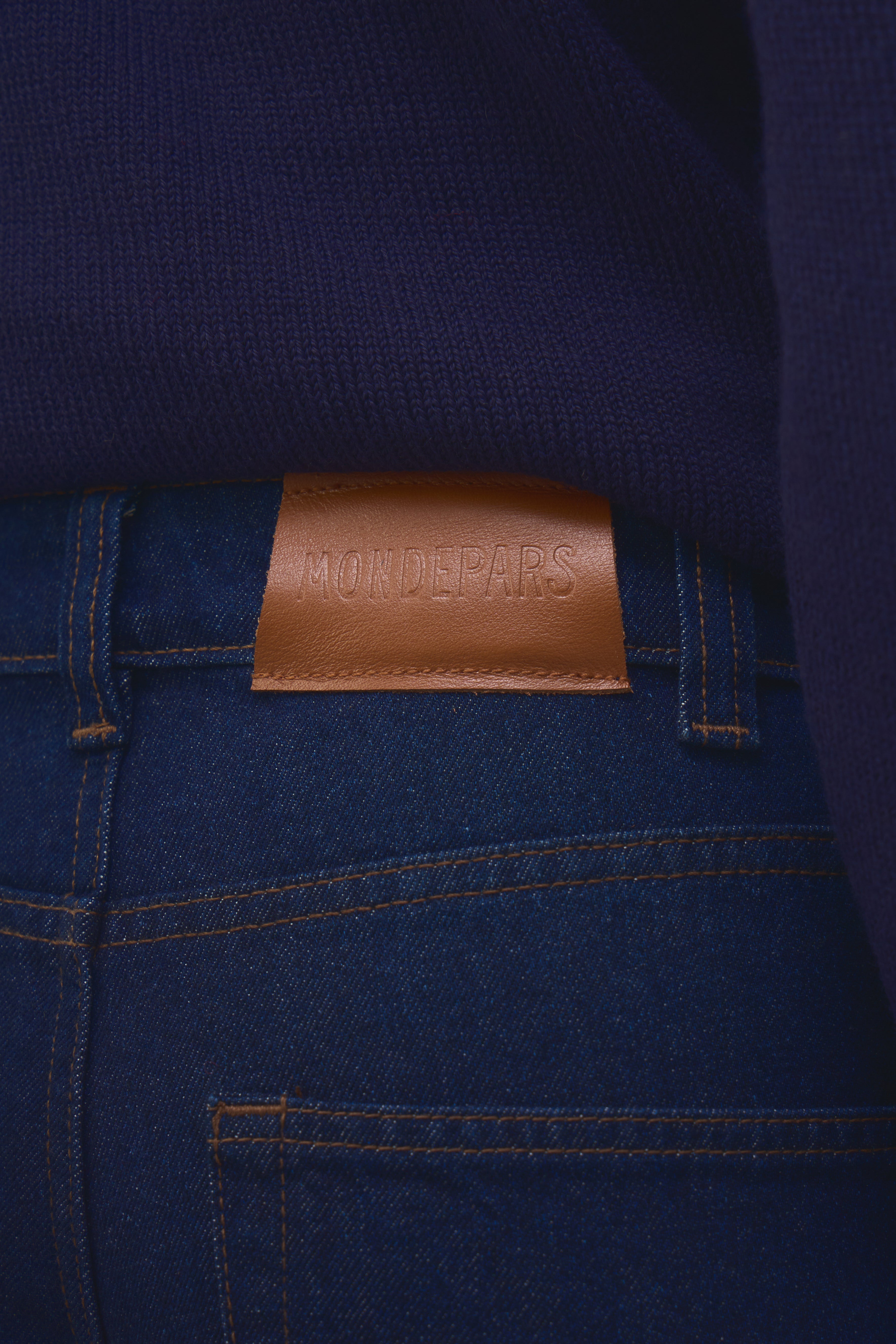 A Calça Gal é confeccionada em jeans com lavagem escura, possui modelagem flare, cintura alta, cós com passantes, fechamento frontal por botão e zíper, cinco bolsos, etiqueta da marca feita em couro natural em matéria-prima de descarte e acabamento pespontado.