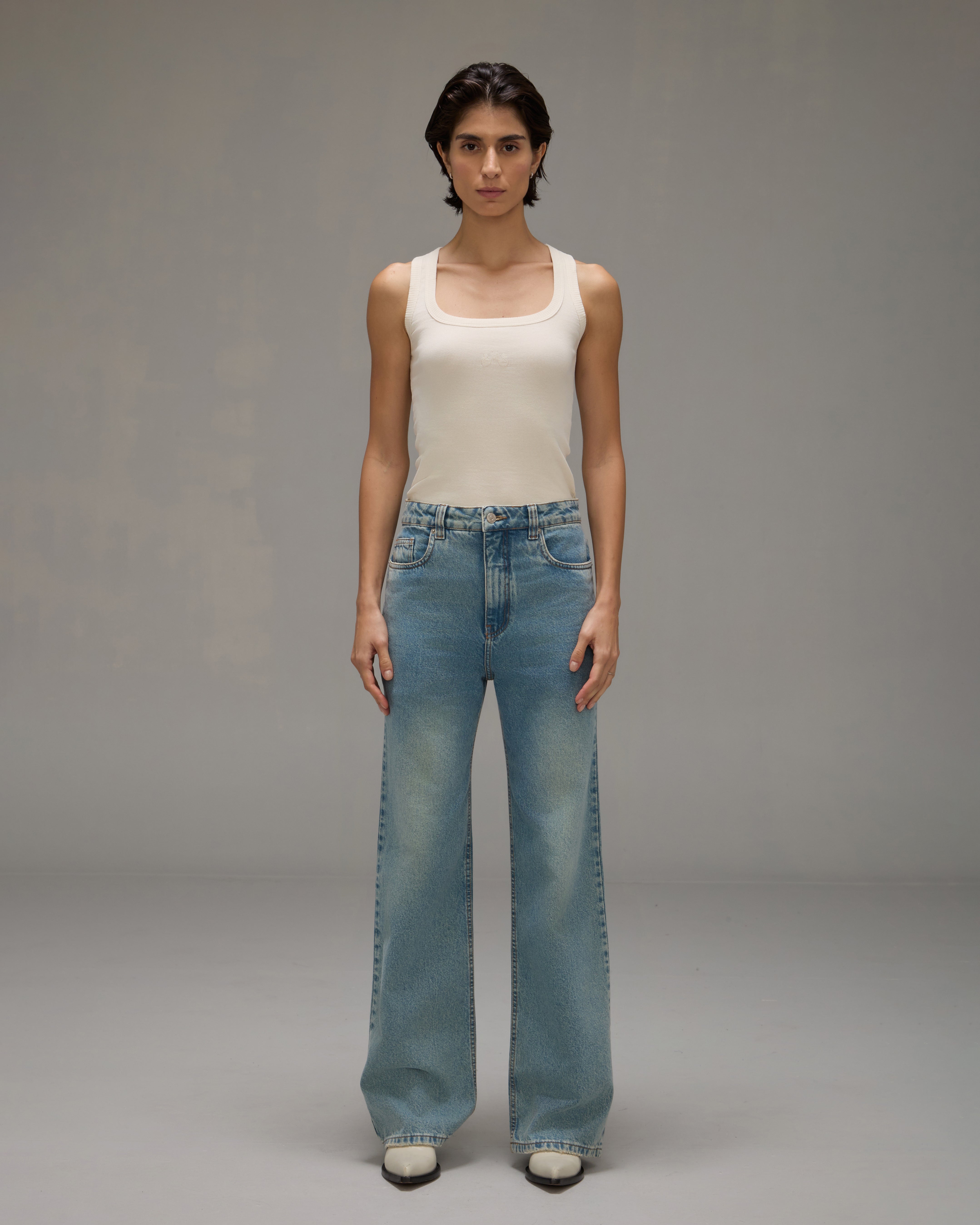 A Calça Gal é confeccionada em jeans, possui modelagem flare, cintura alta, cós com passantes, fechamento frontal por botão e zíper, cinco bolsos, etiqueta da marca feita em couro natural em matéria-prima de descarte e acabamento pespontado.