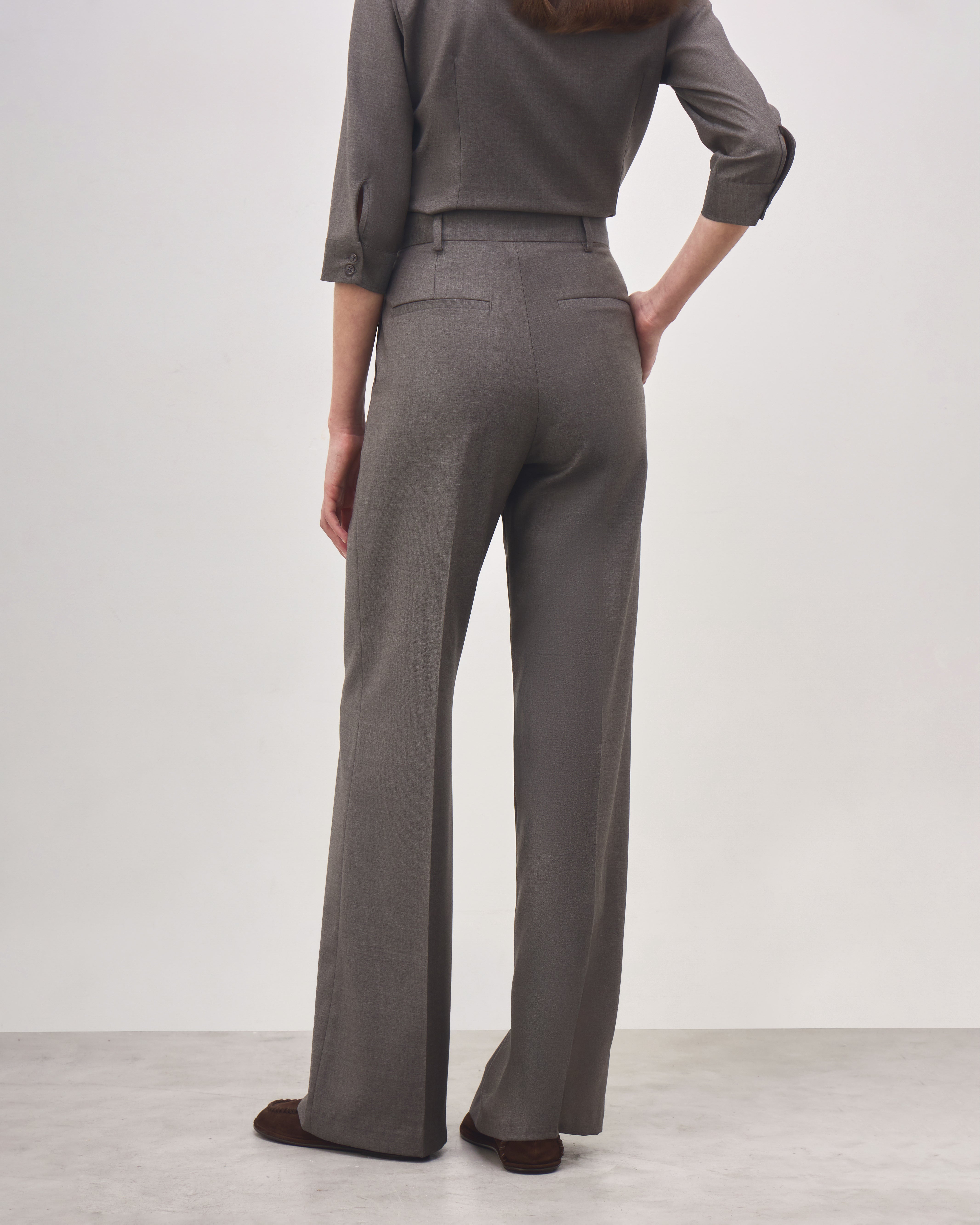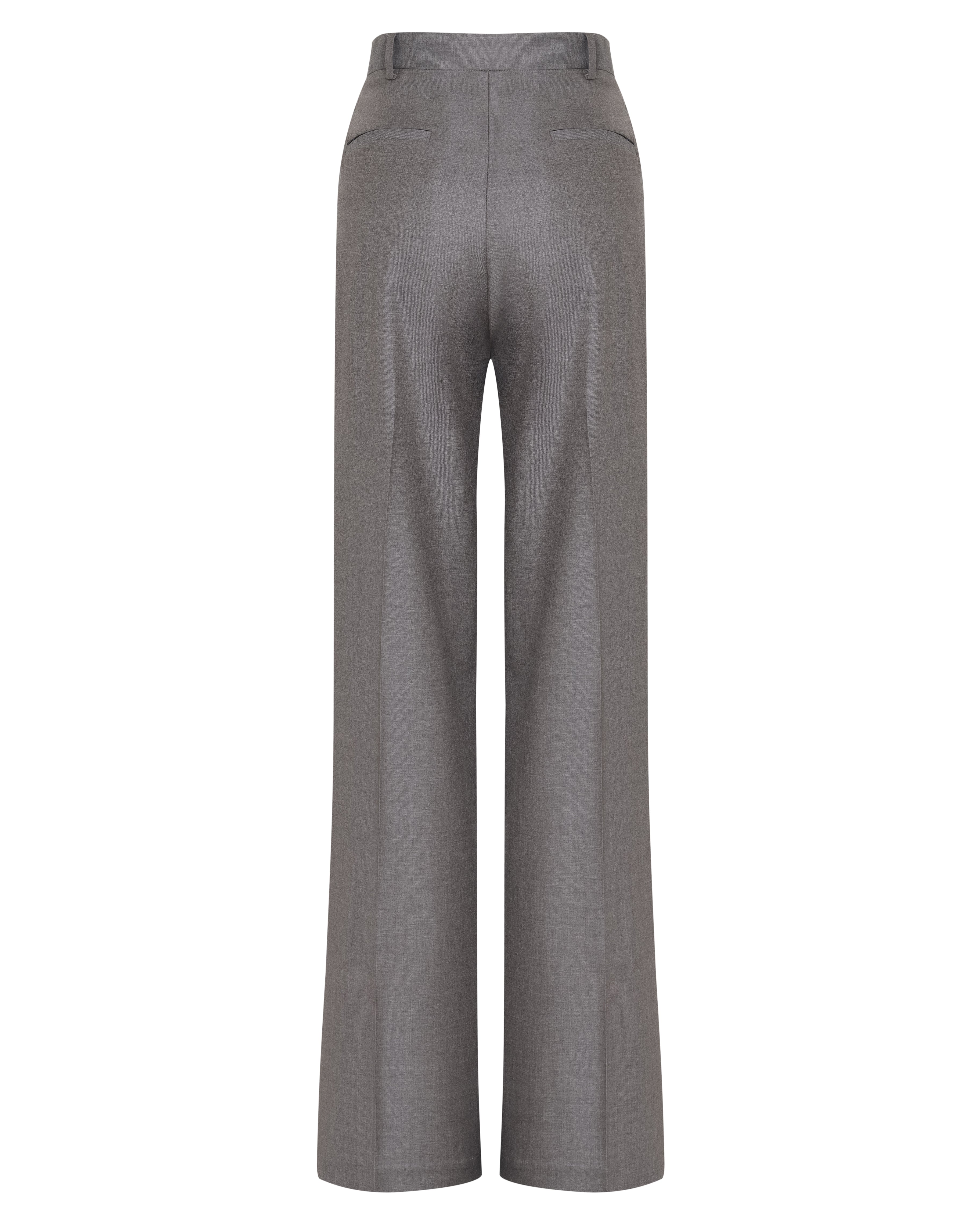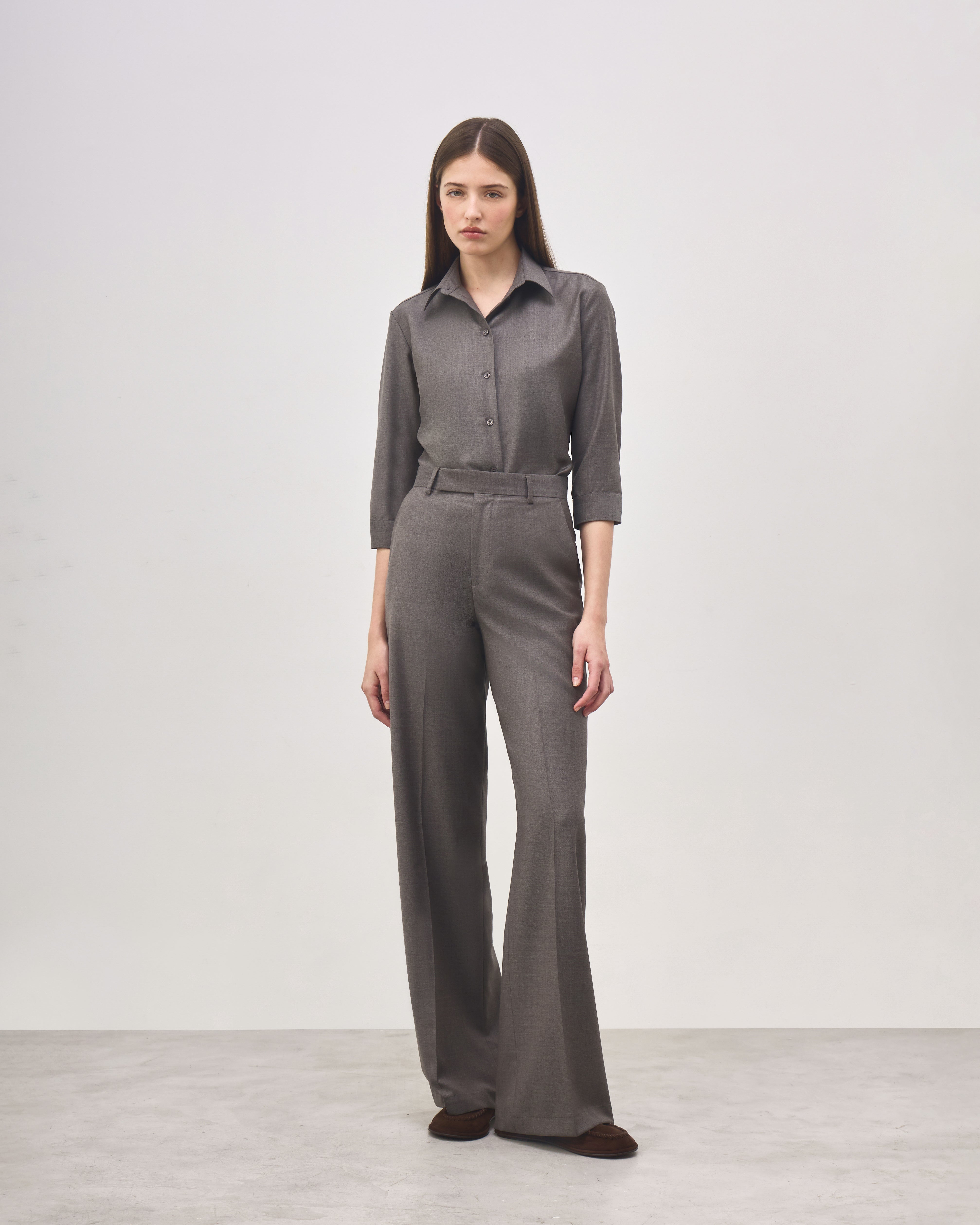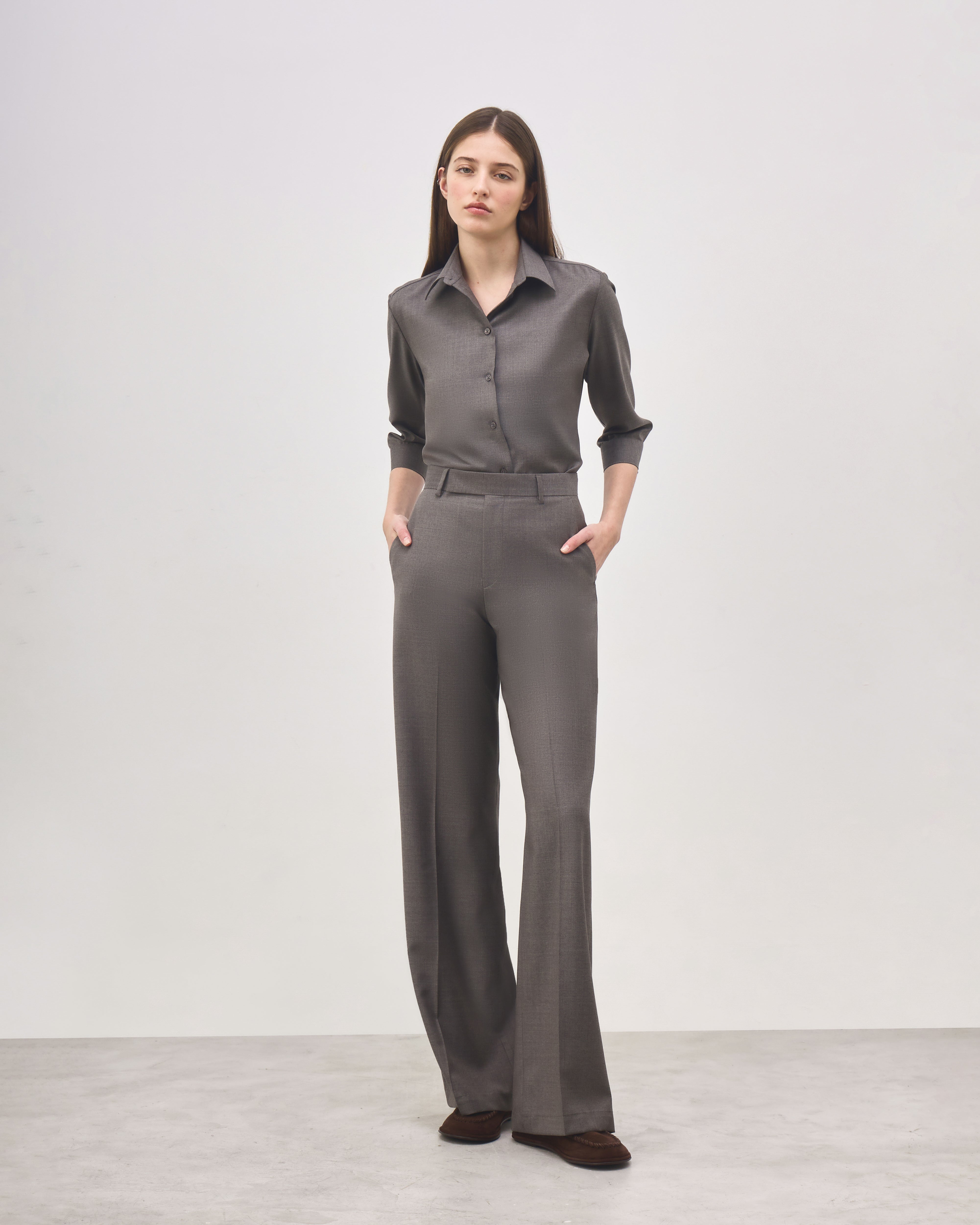A Calça Kai é confeccionada em lã importada, possui modelagem de alfaiataria, caimento mais solto, cintura alta, cós com passantes, fechamento frontal por zíper, vinco vertical, dois bolsos modelo faca nas laterais, dois bolsos embutidos posteriores, forro embutido, barra invisível e acabamentos internos de alfaiataria tradicional, com viés e ponto picado.