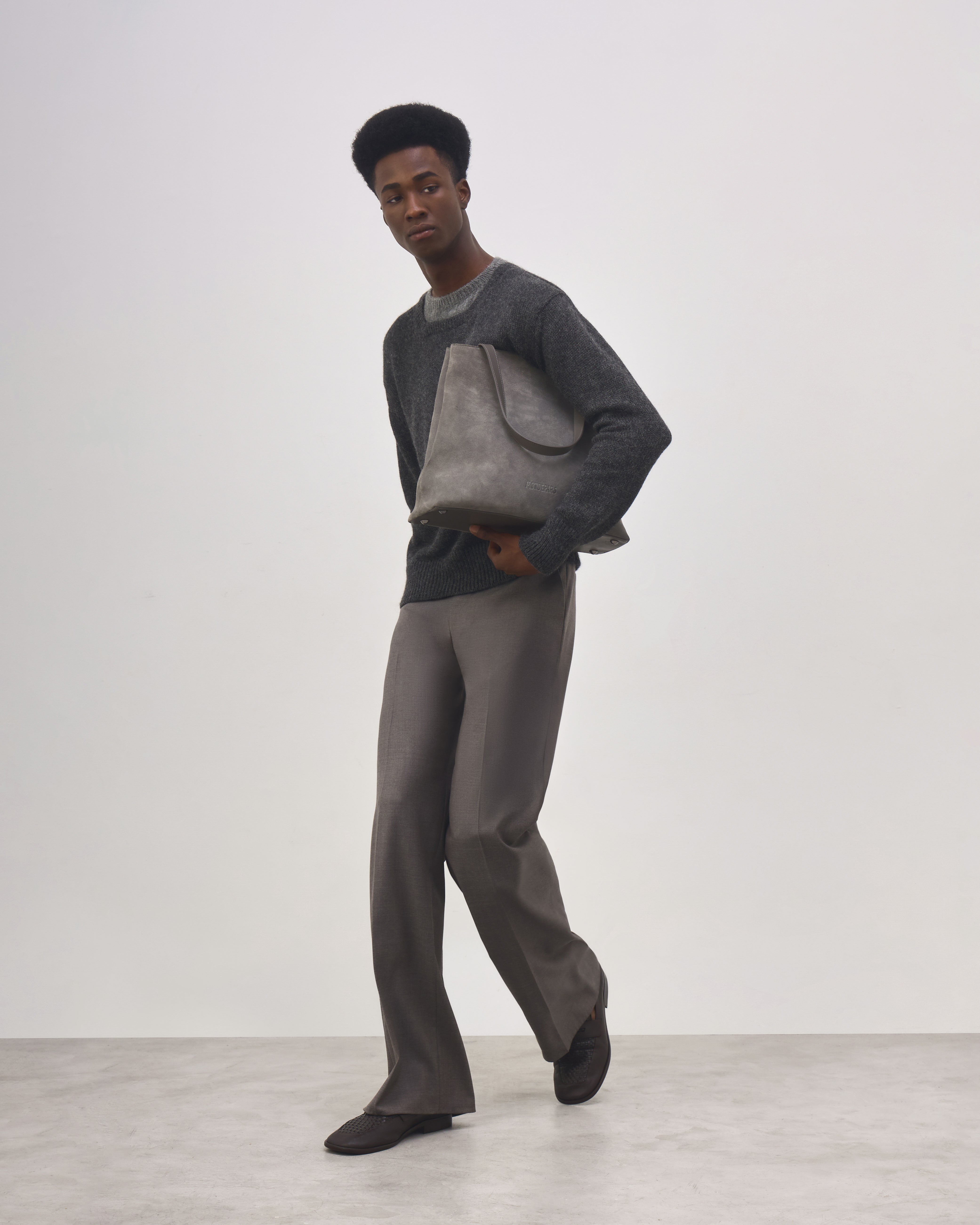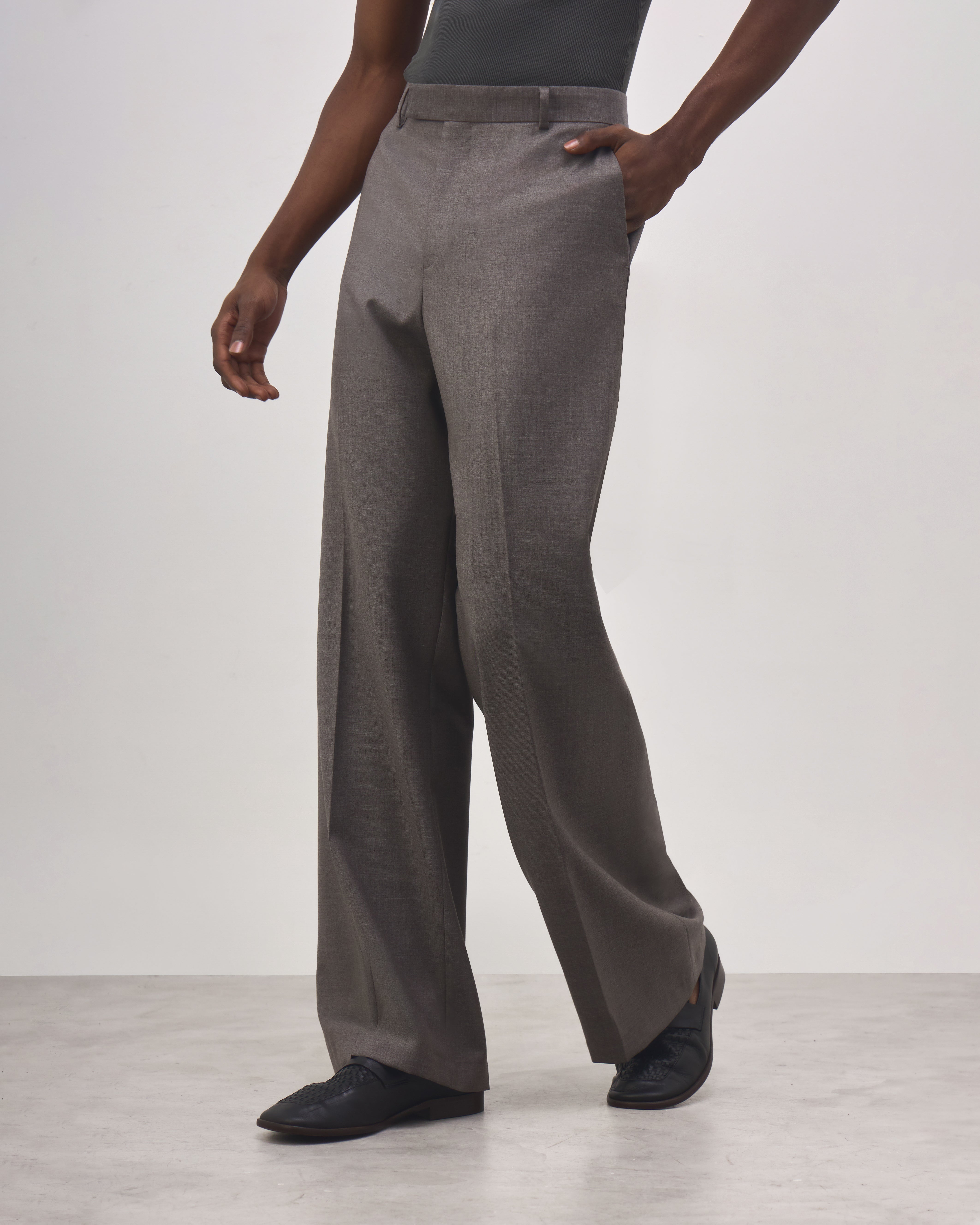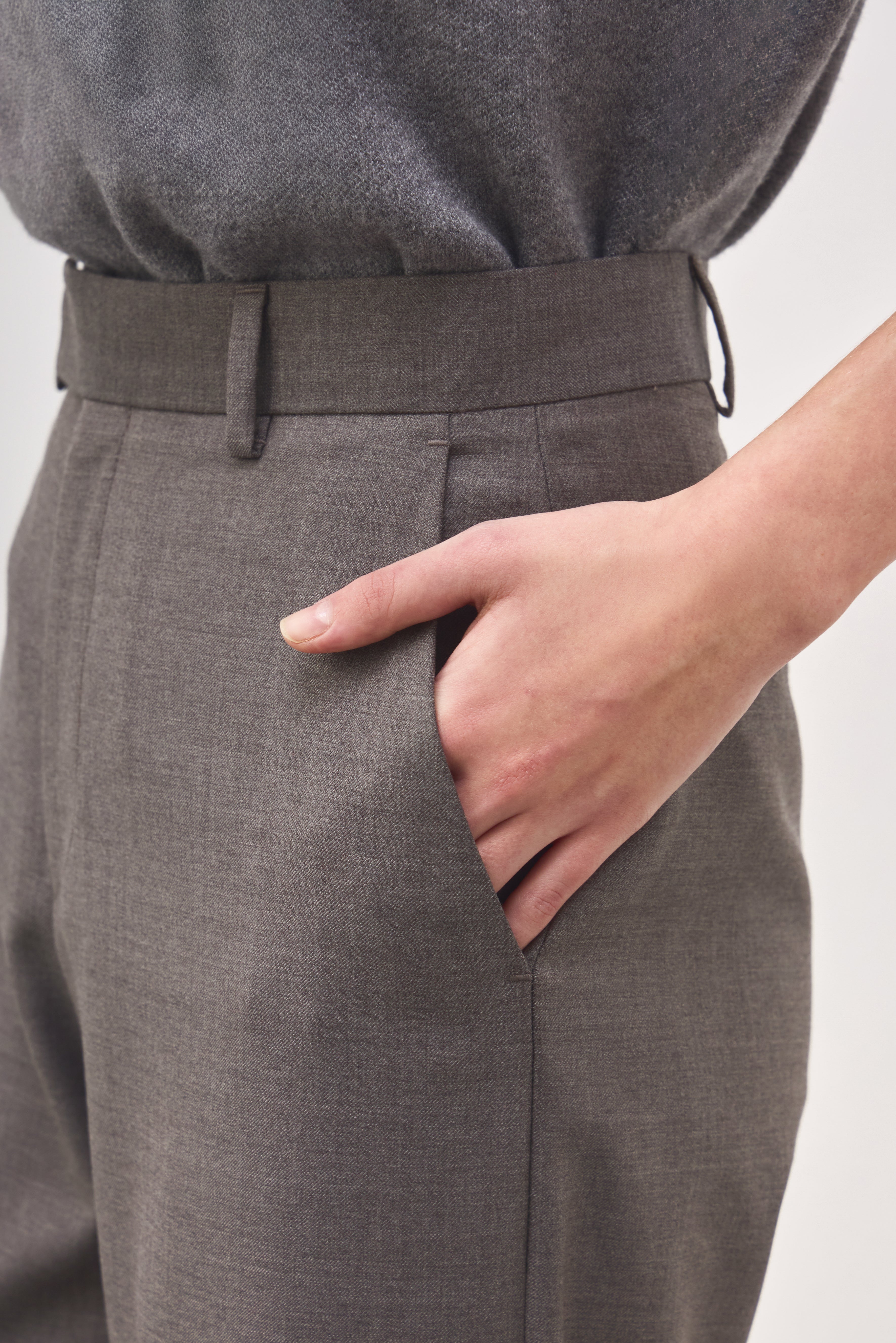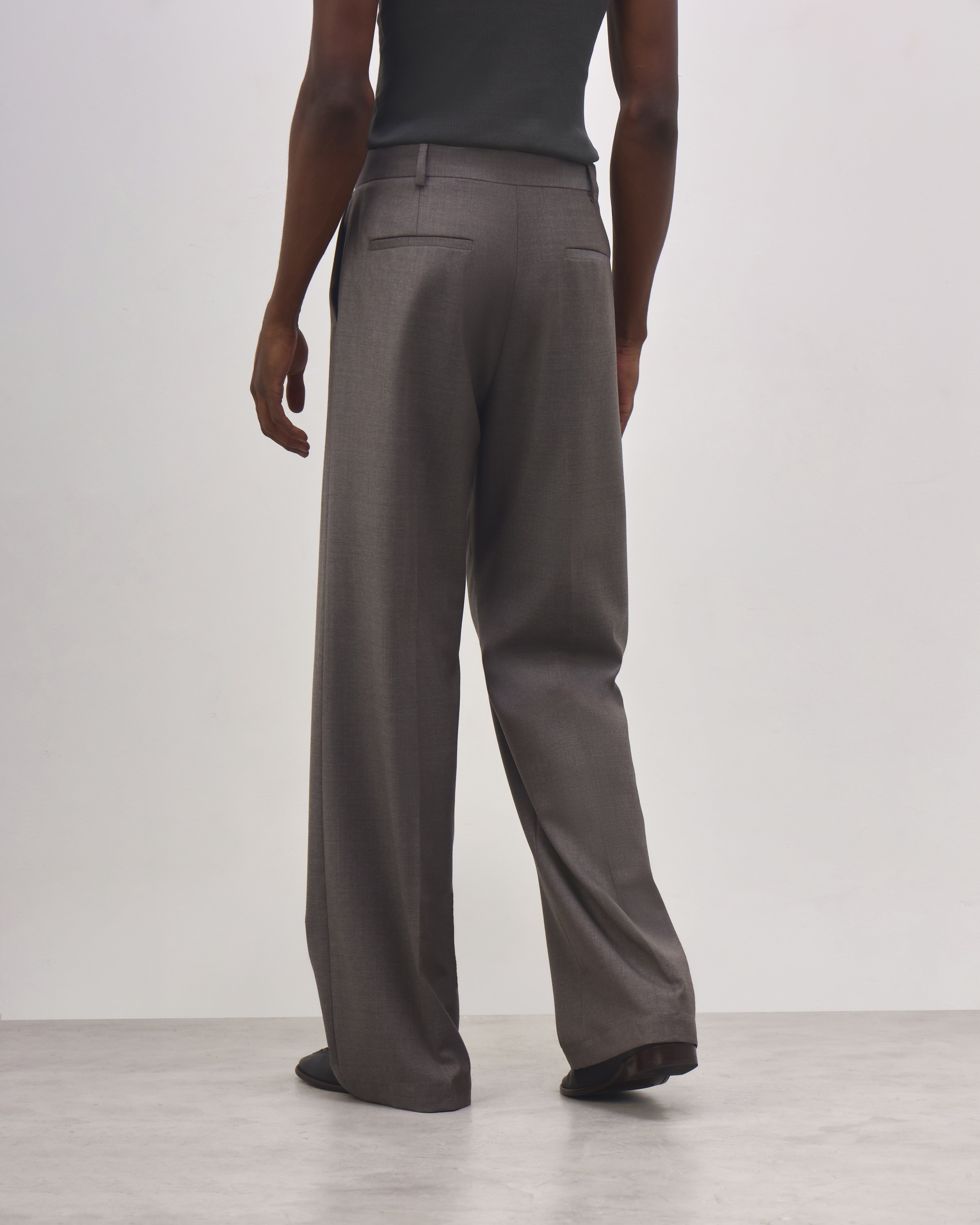 A Calça Kai é confeccionada em lã importada, possui modelagem de alfaiataria, caimento mais solto, cintura alta, cós com passantes, fechamento frontal por zíper, vinco vertical, dois bolsos modelo faca nas laterais, dois bolsos embutidos posteriores, forro embutido, barra invisível e acabamentos internos de alfaiataria tradicional, com viés e ponto picado.