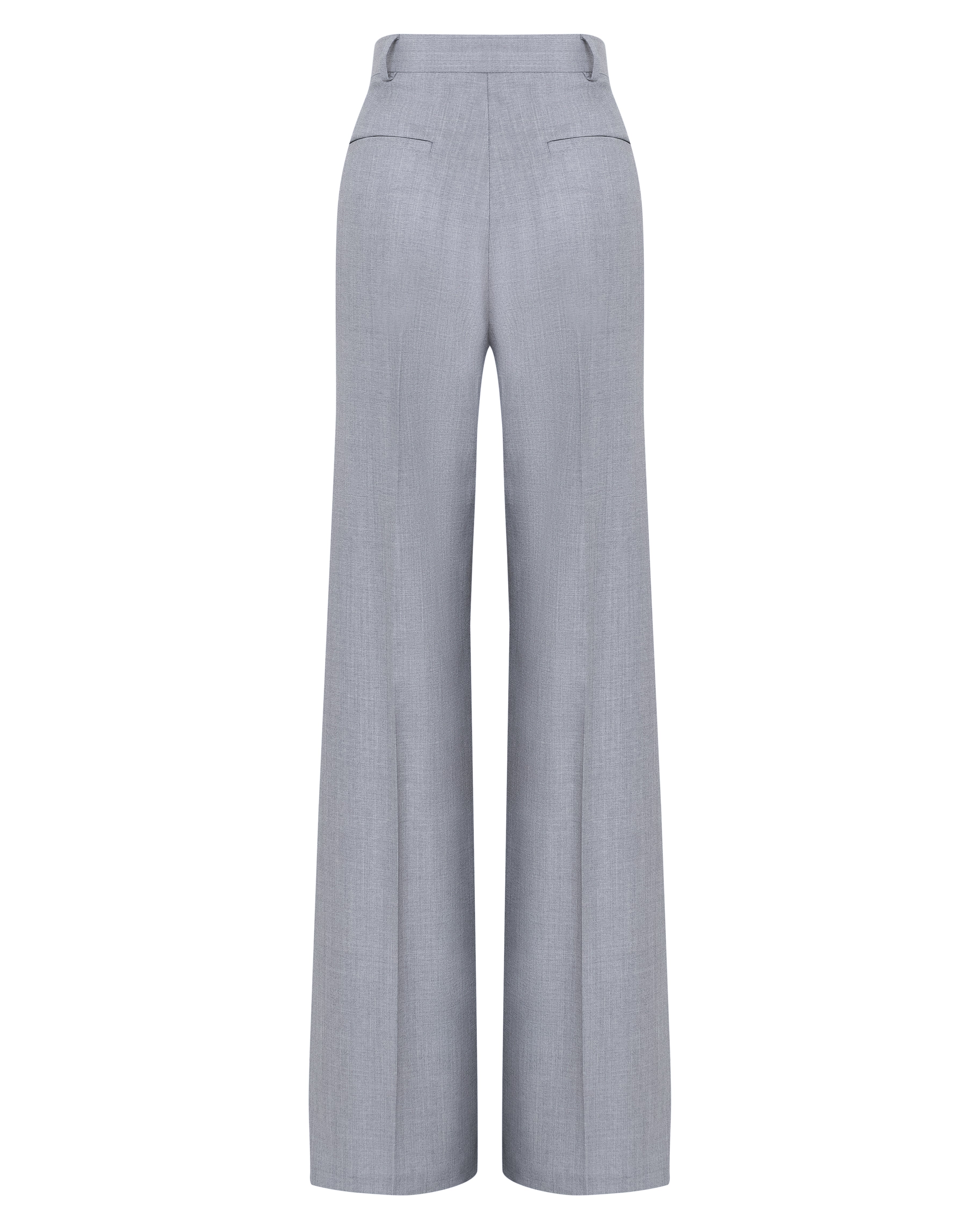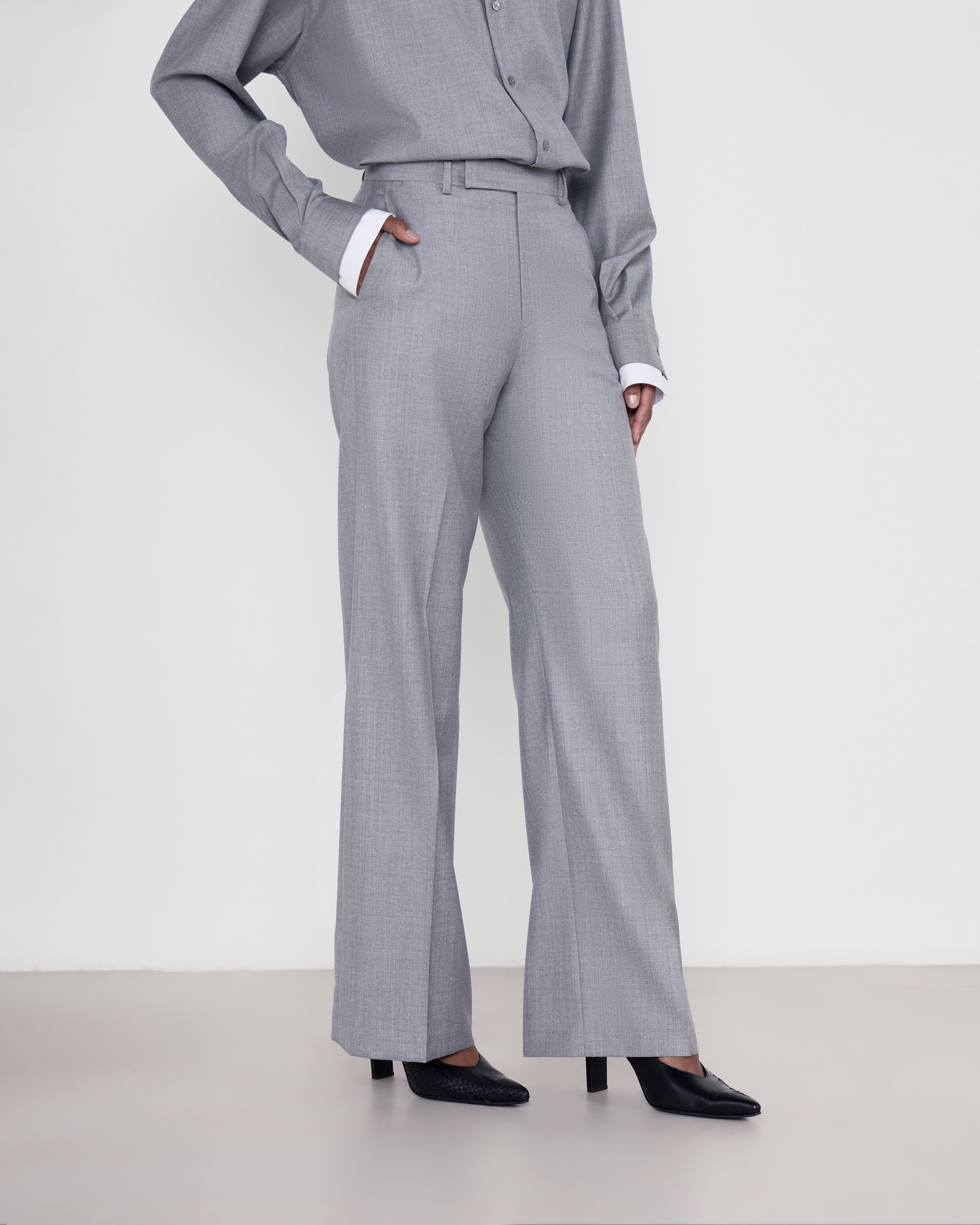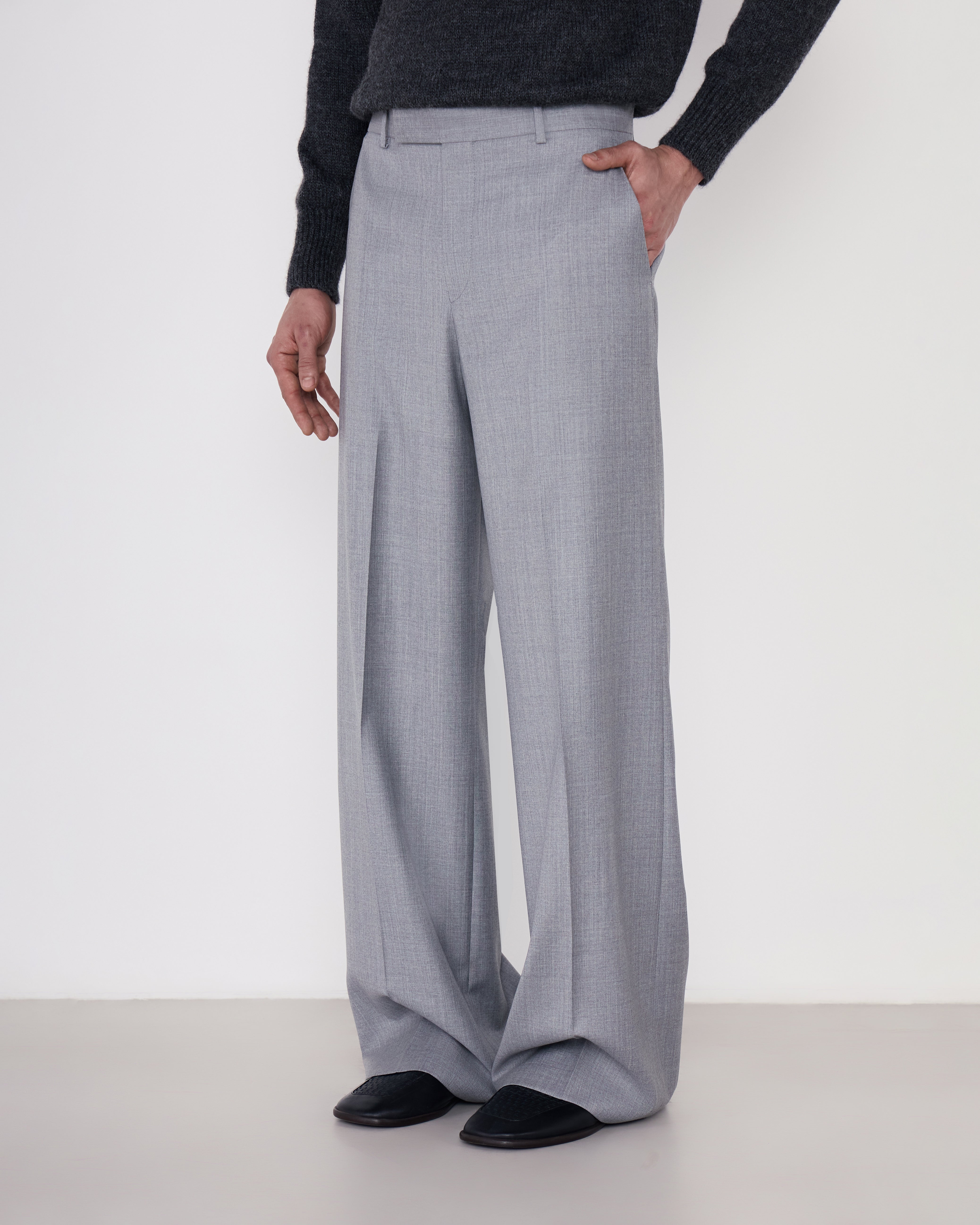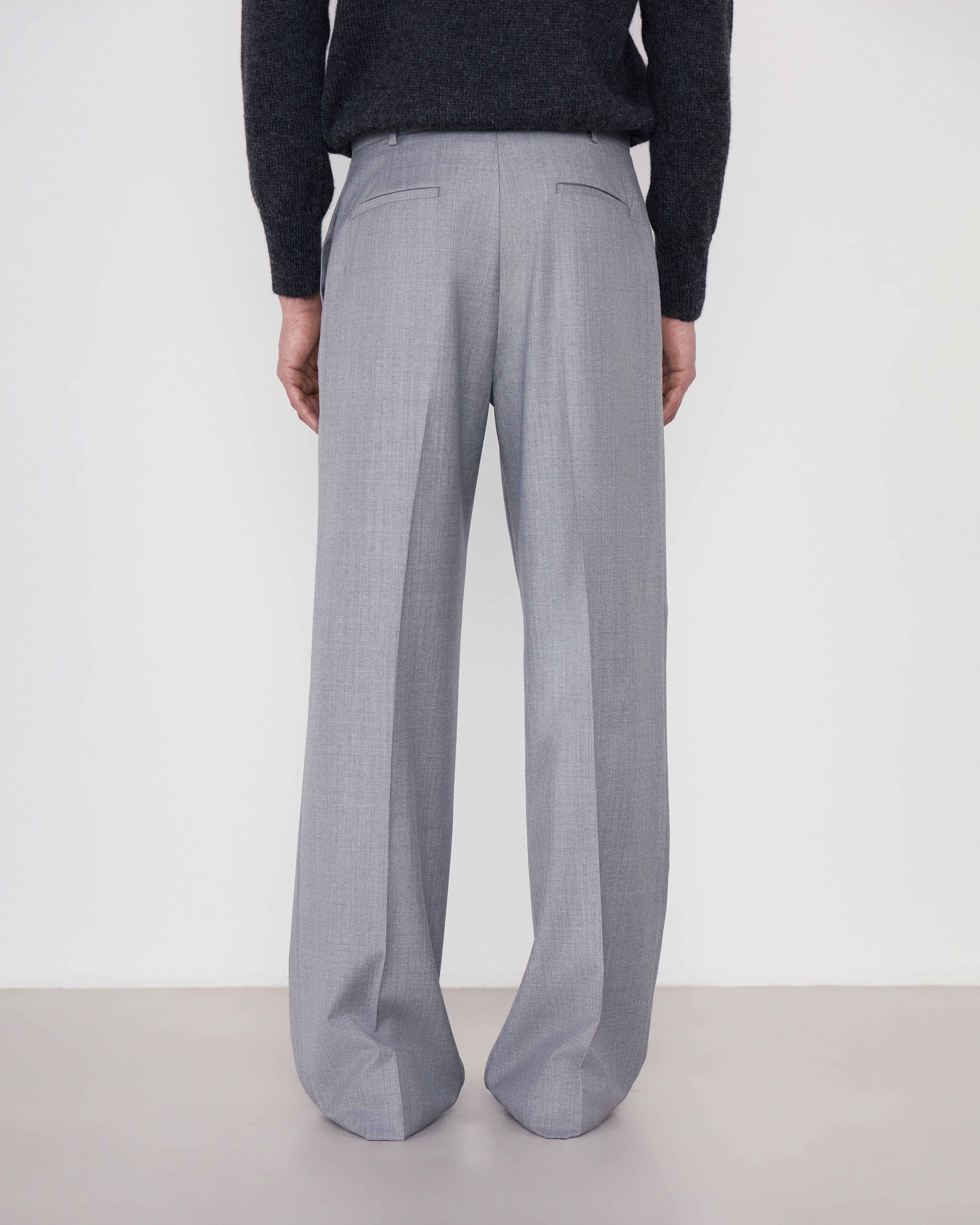 A Calça Kai é confeccionada em lã importada, possui modelagem de alfaiataria, caimento mais solto, cintura alta, cós com passantes, fechamento frontal por zíper, vinco vertical, dois bolsos modelo faca nas laterais, dois bolsos embutidos posteriores, forro embutido, barra invisível e acabamentos internos de alfaiataria tradicional, com viés e ponto picado.