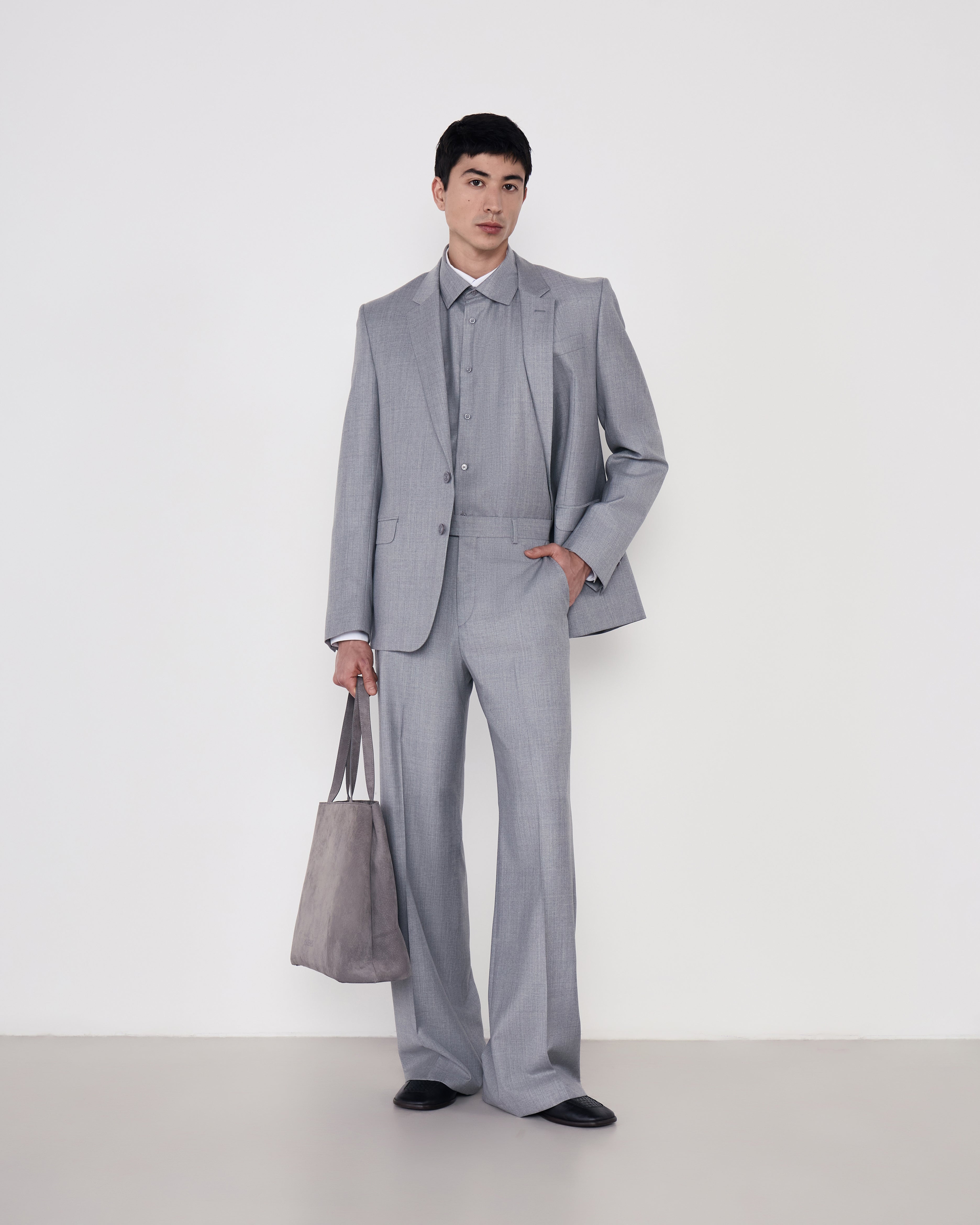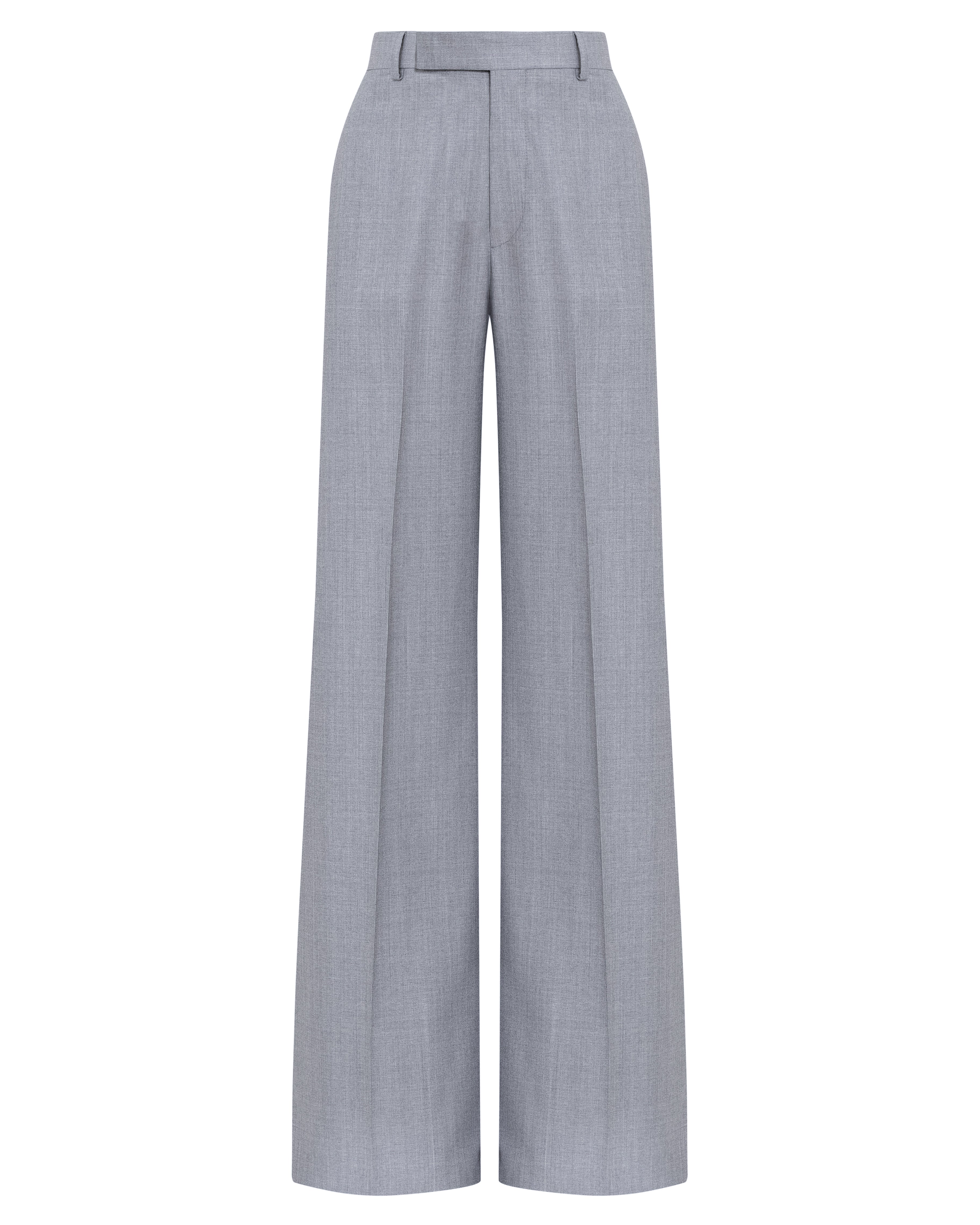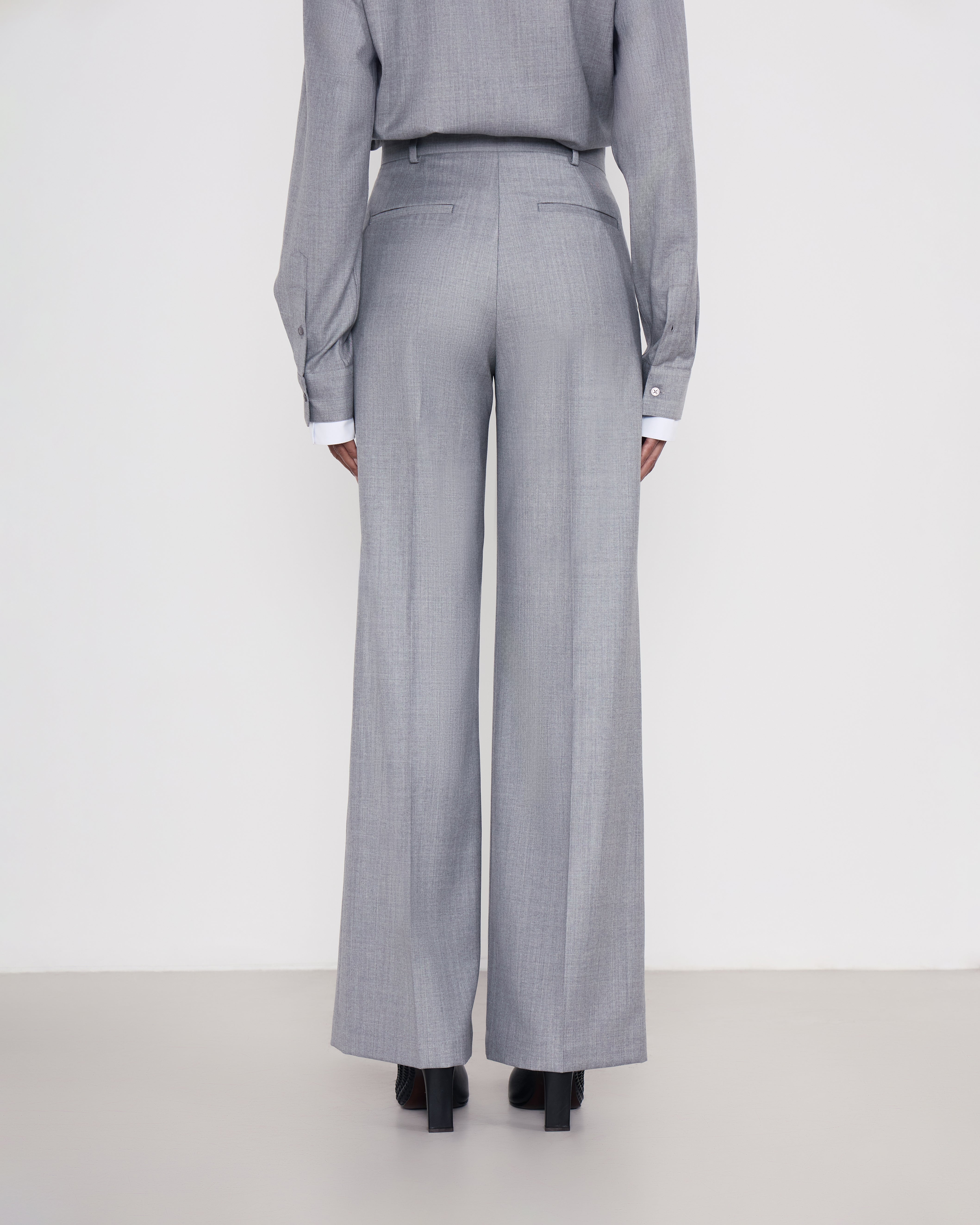 A Calça Kai é confeccionada em lã importada, possui modelagem de alfaiataria, caimento mais solto, cintura alta, cós com passantes, fechamento frontal por zíper, vinco vertical, dois bolsos modelo faca nas laterais, dois bolsos embutidos posteriores, forro embutido, barra invisível e acabamentos internos de alfaiataria tradicional, com viés e ponto picado.