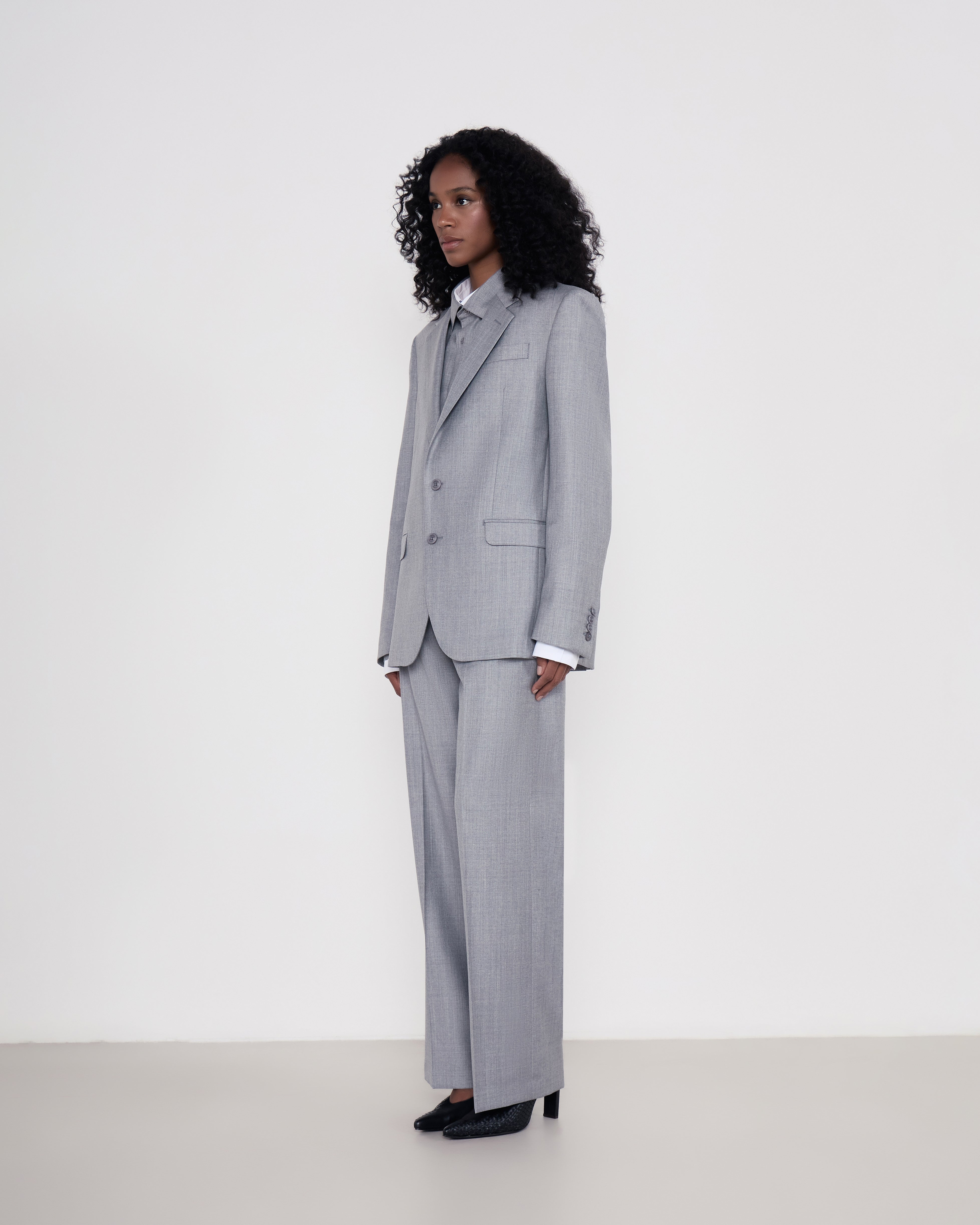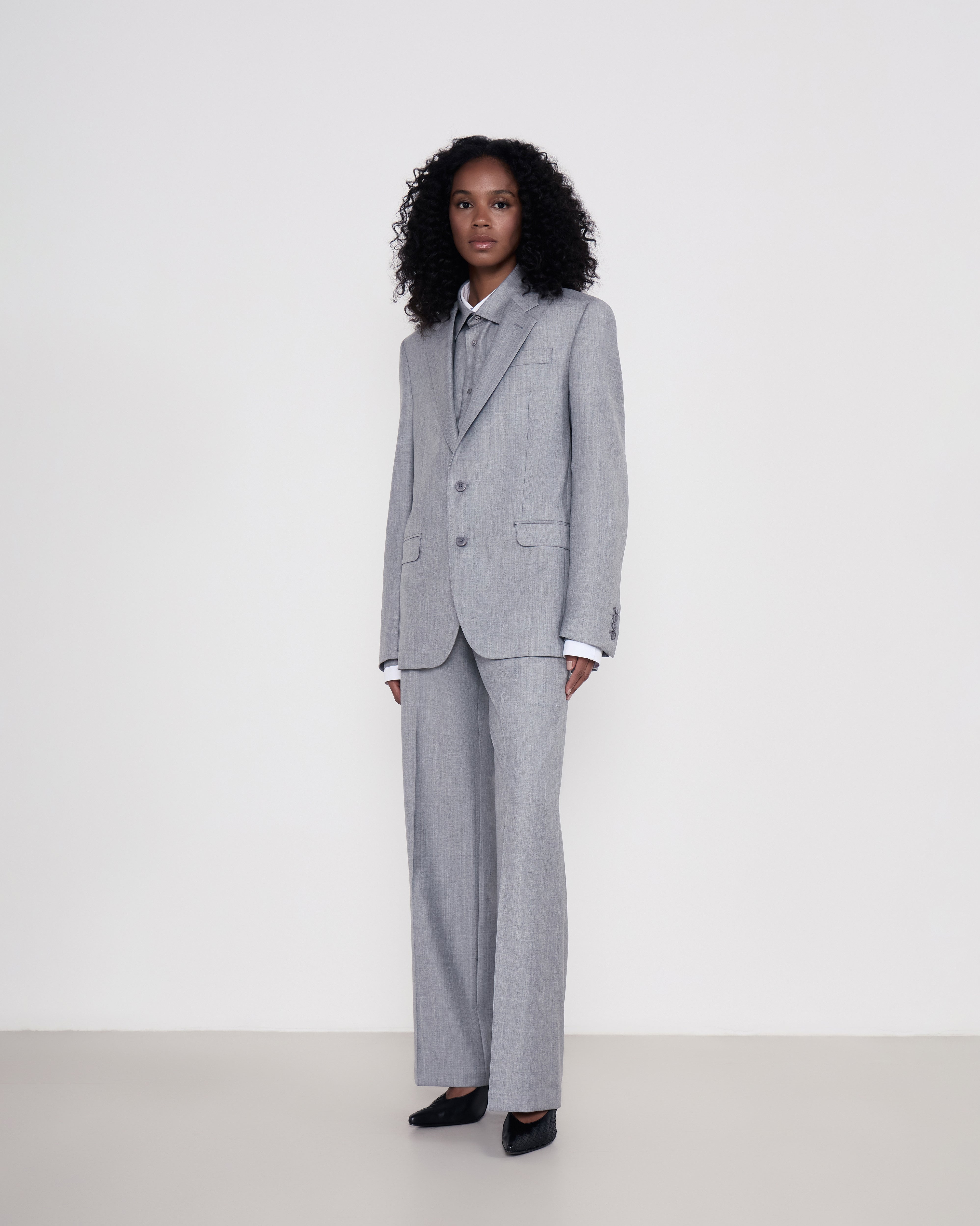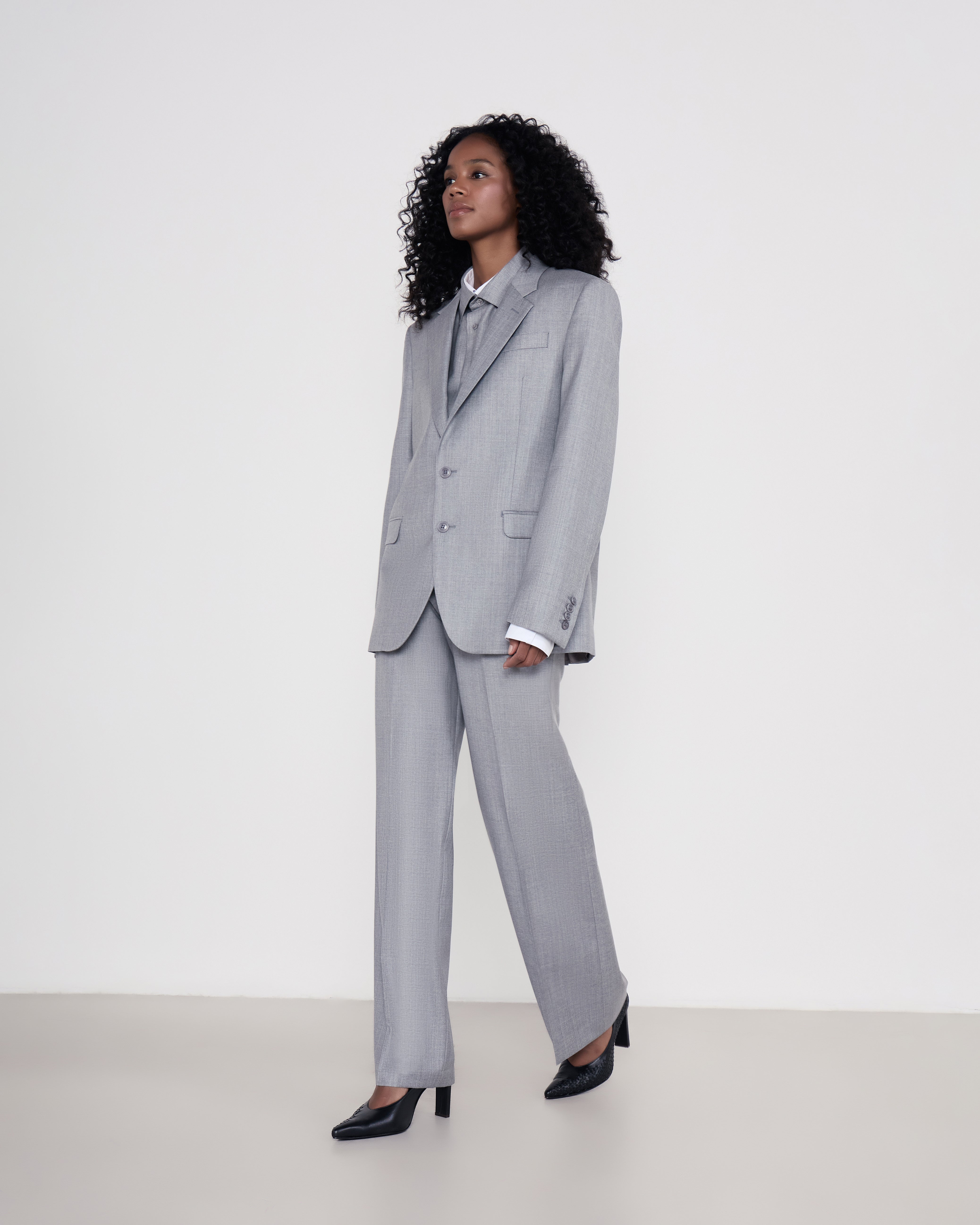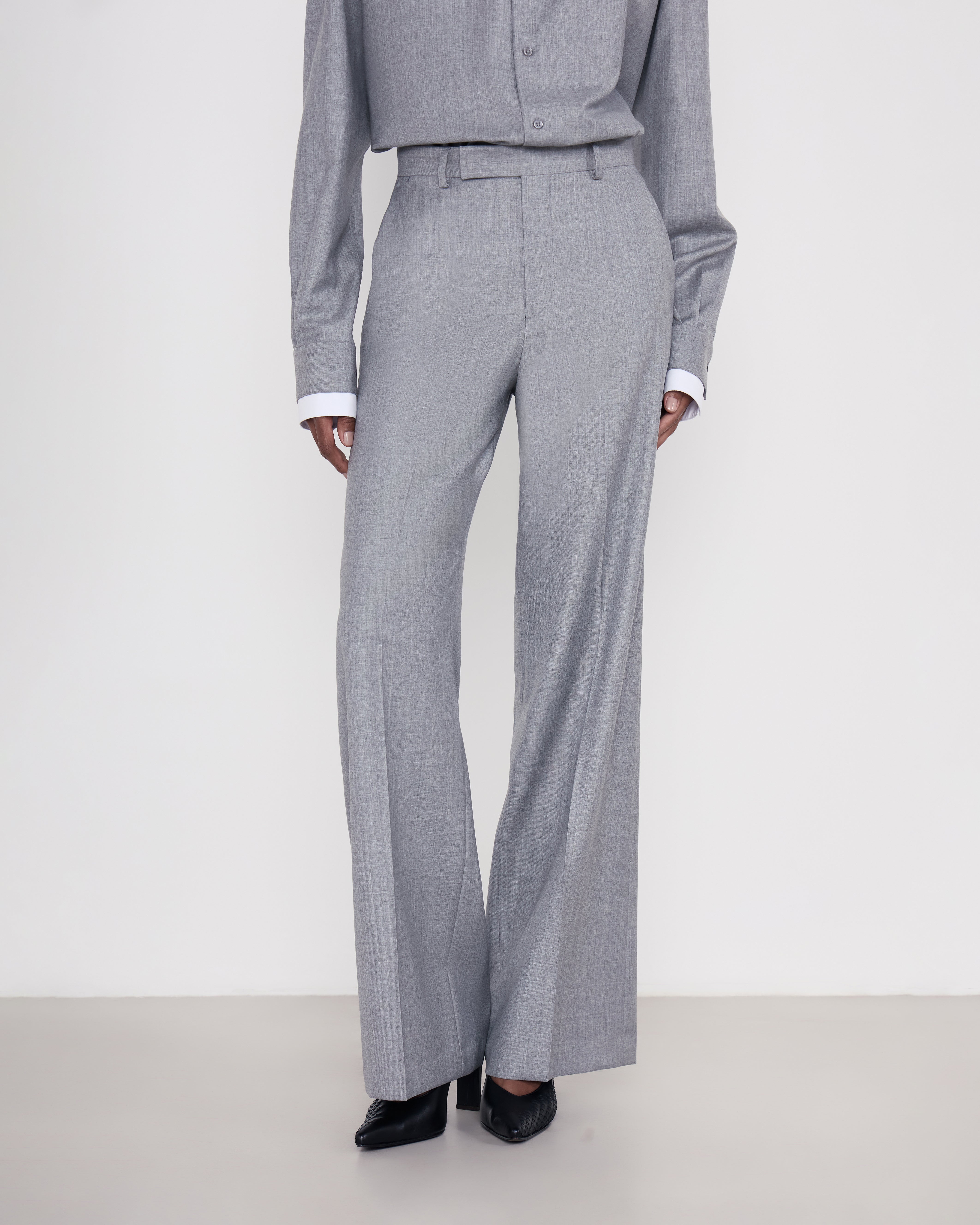 A Calça Kai é confeccionada em lã importada, possui modelagem de alfaiataria, caimento mais solto, cintura alta, cós com passantes, fechamento frontal por zíper, vinco vertical, dois bolsos modelo faca nas laterais, dois bolsos embutidos posteriores, forro embutido, barra invisível e acabamentos internos de alfaiataria tradicional, com viés e ponto picado.