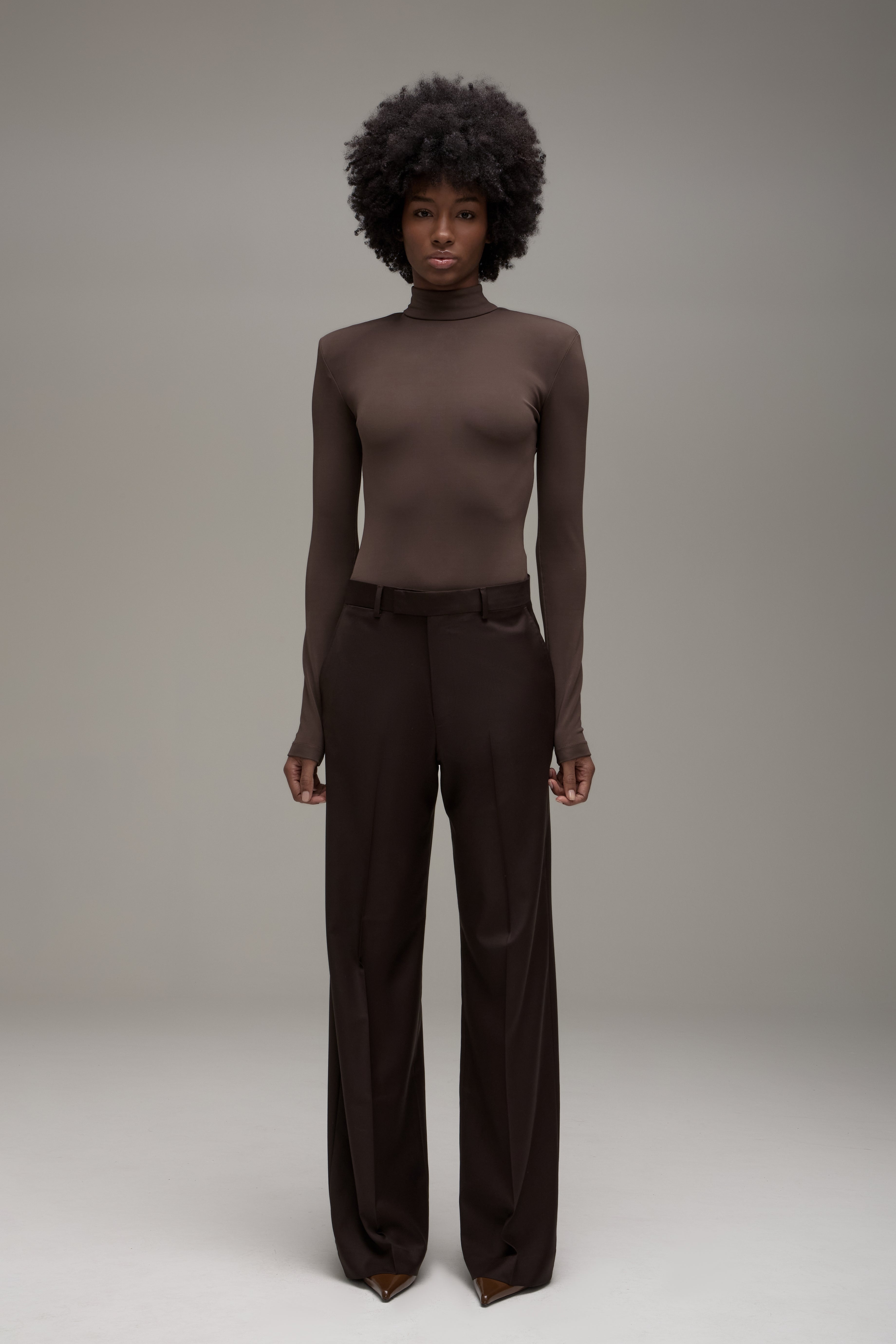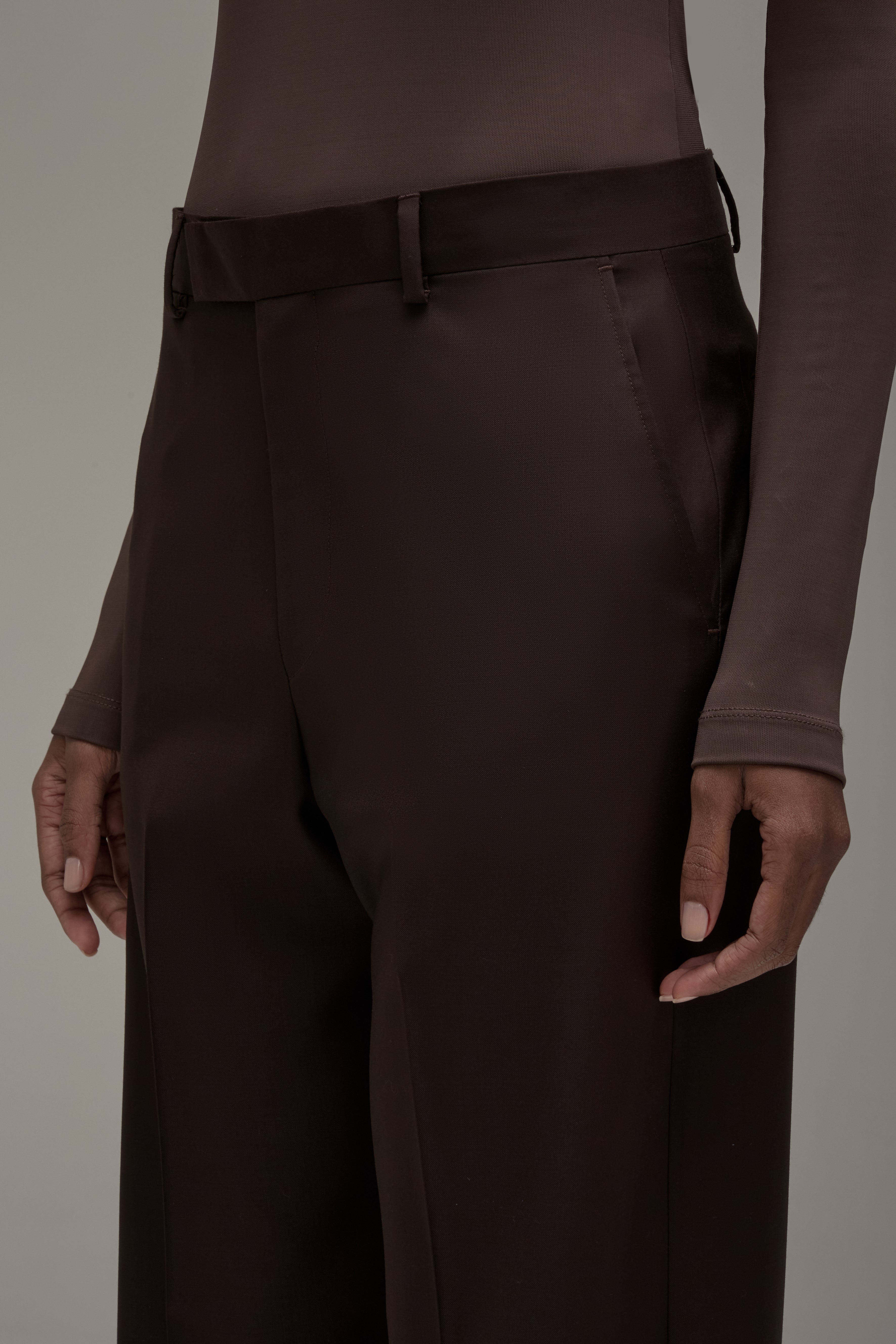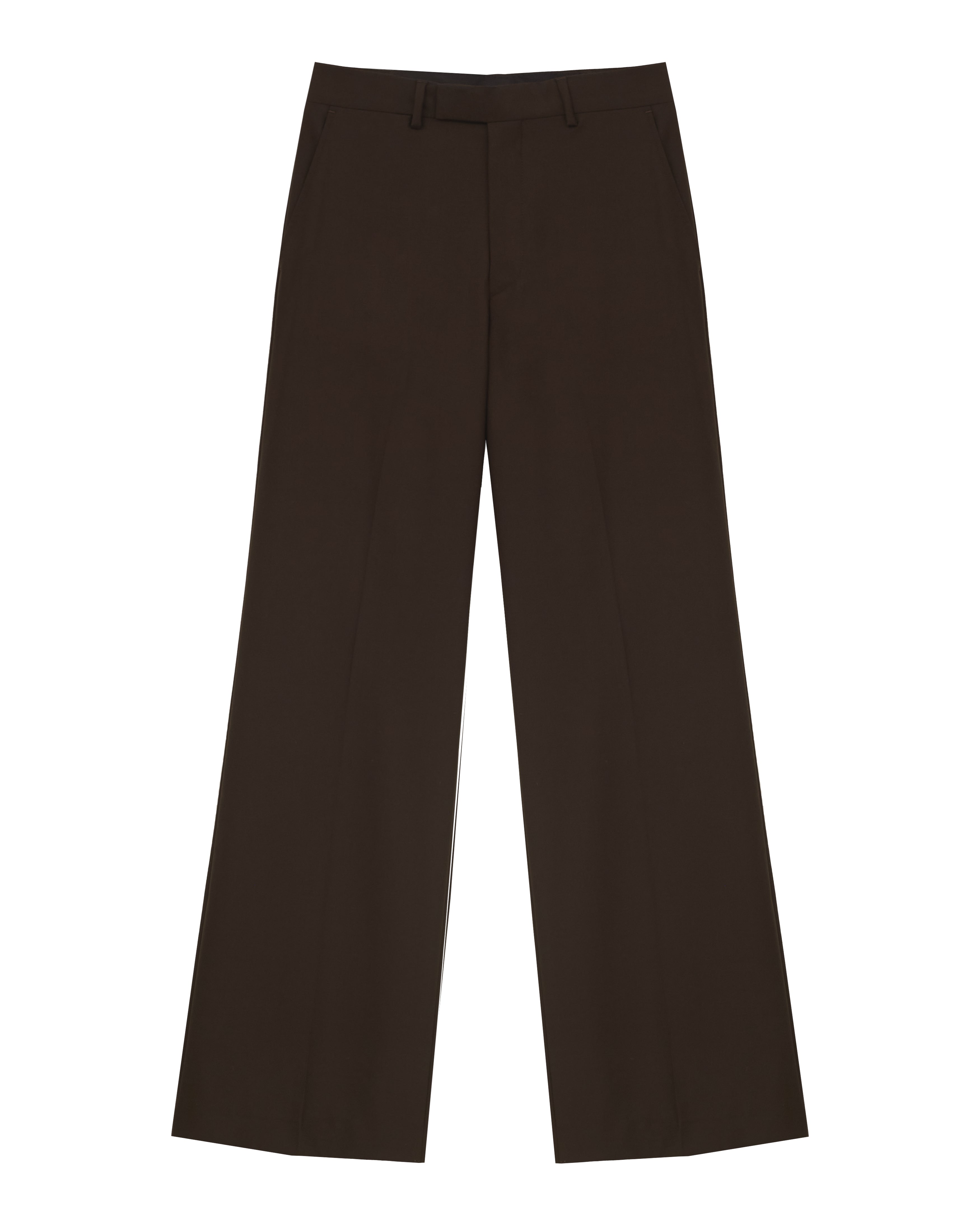 A Calça Kai é confeccionada em lã importada, possui modelagem de alfaiataria, caimento mais solto, cintura alta, cós com passantes, fechamento frontal por zíper, vinco vertical, dois bolsos modelo faca nas laterais, dois bolsos embutidos posteriores, forro embutido, barra invisível e acabamentos internos de alfaiataria tradicional, com viés e ponto picado.