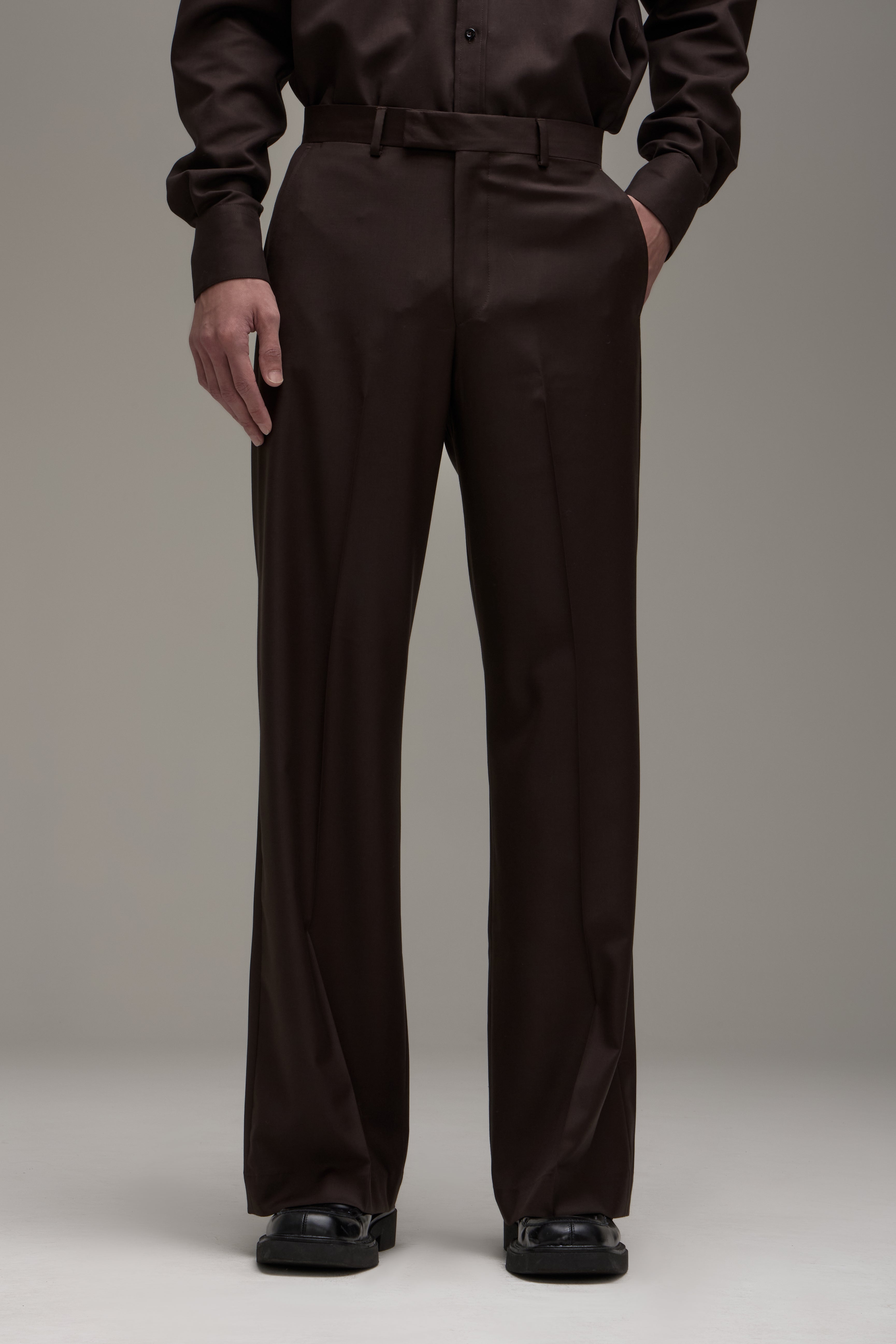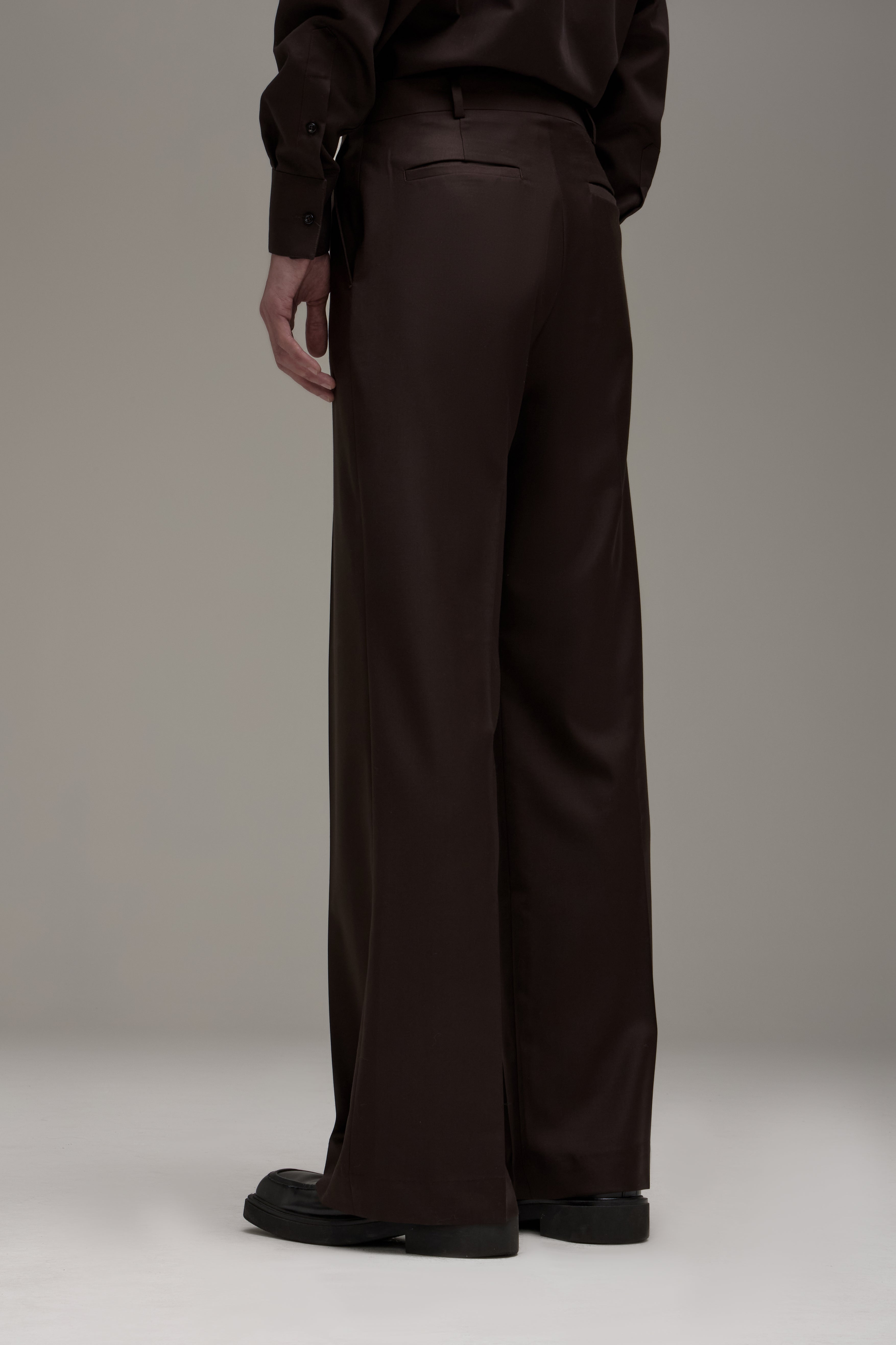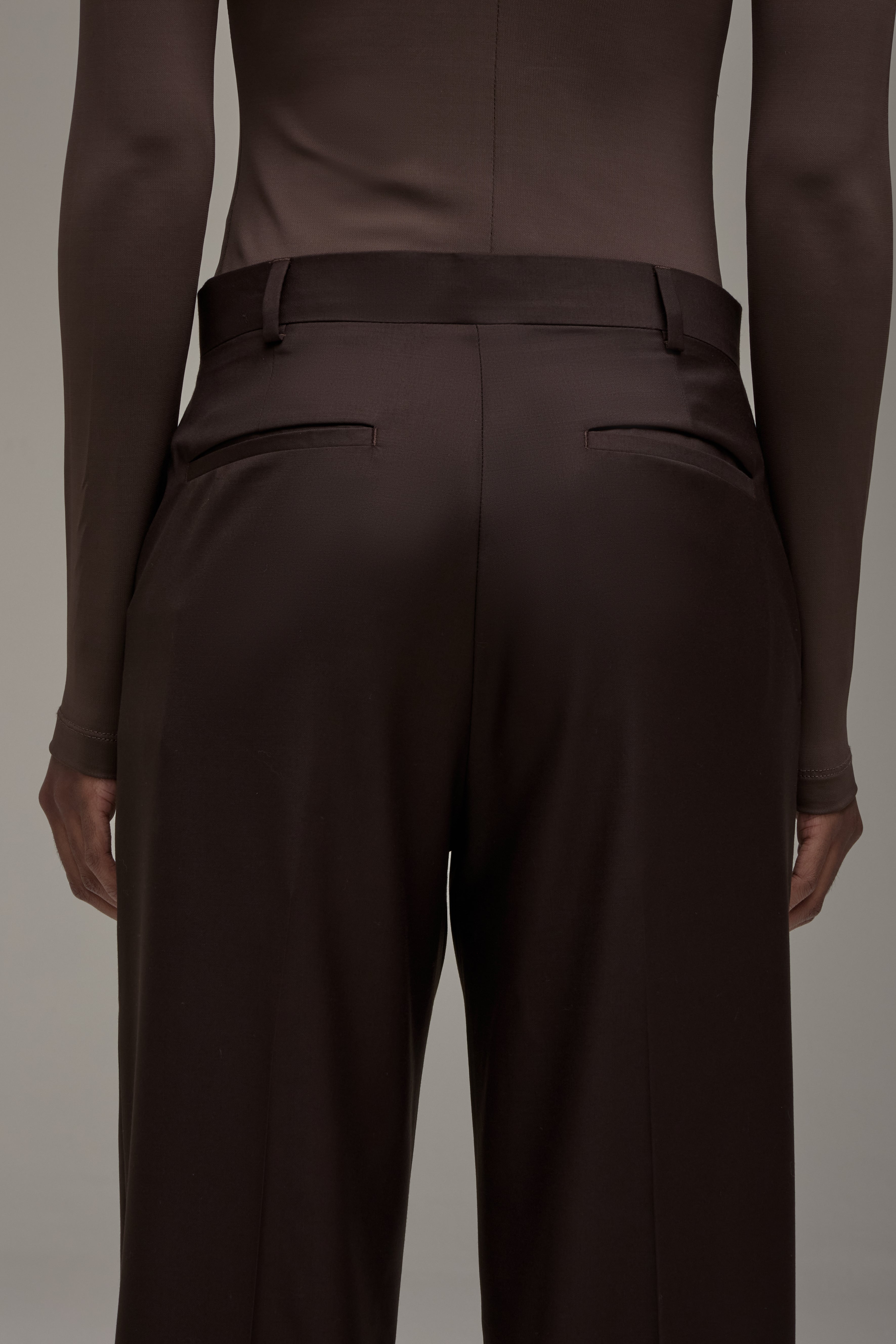 A Calça Kai é confeccionada em lã importada, possui modelagem de alfaiataria, caimento mais solto, cintura alta, cós com passantes, fechamento frontal por zíper, vinco vertical, dois bolsos modelo faca nas laterais, dois bolsos embutidos posteriores, forro embutido, barra invisível e acabamentos internos de alfaiataria tradicional, com viés e ponto picado.