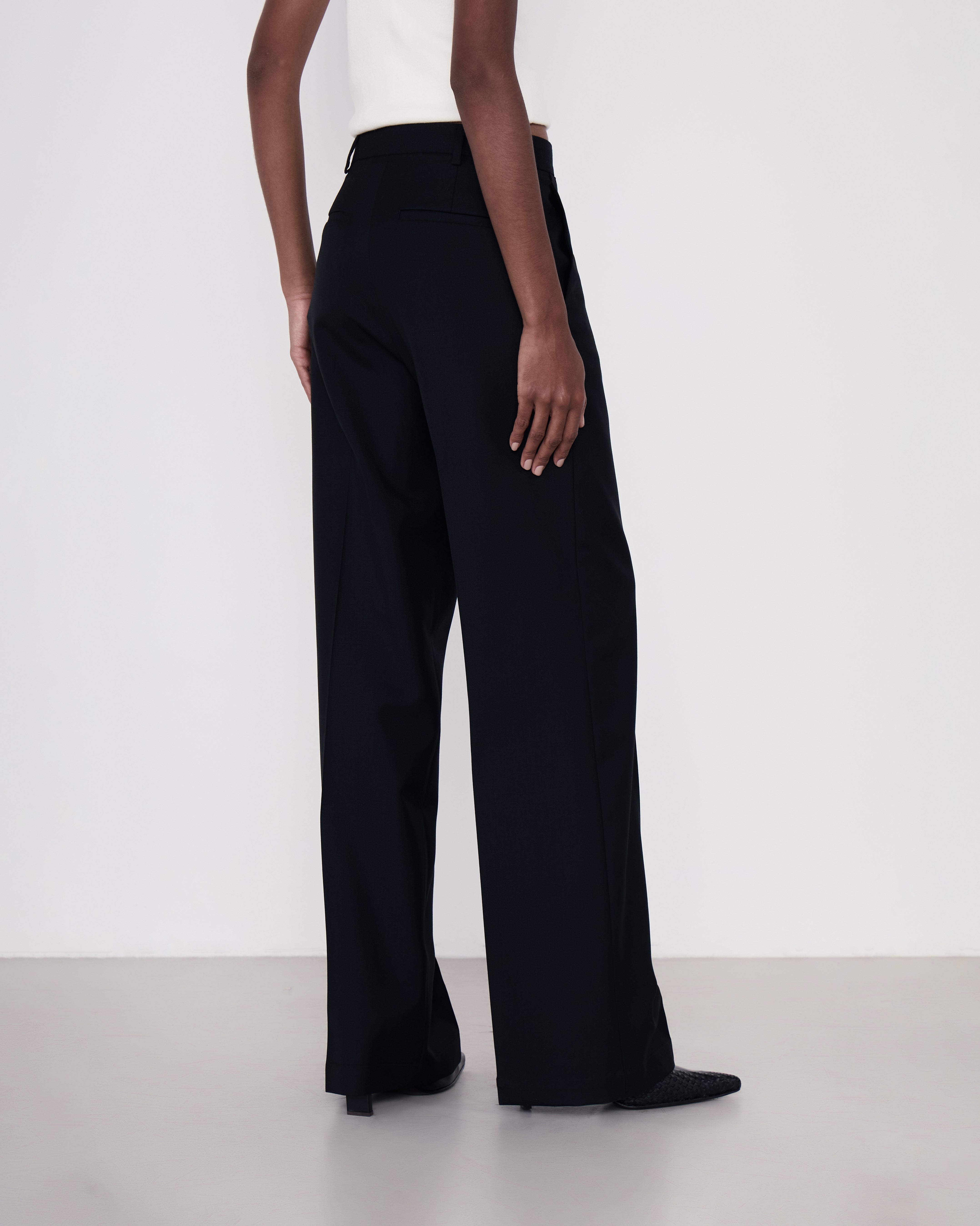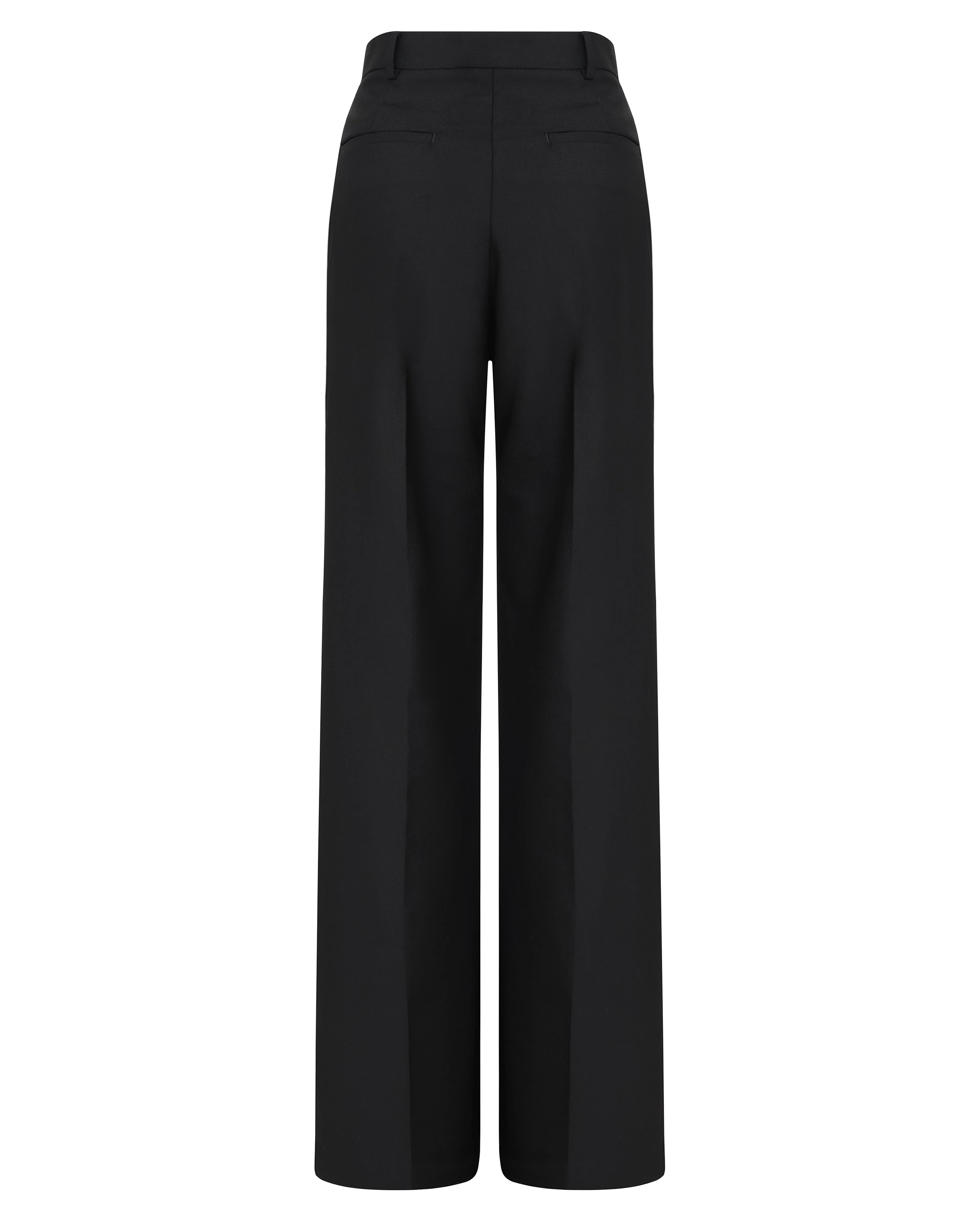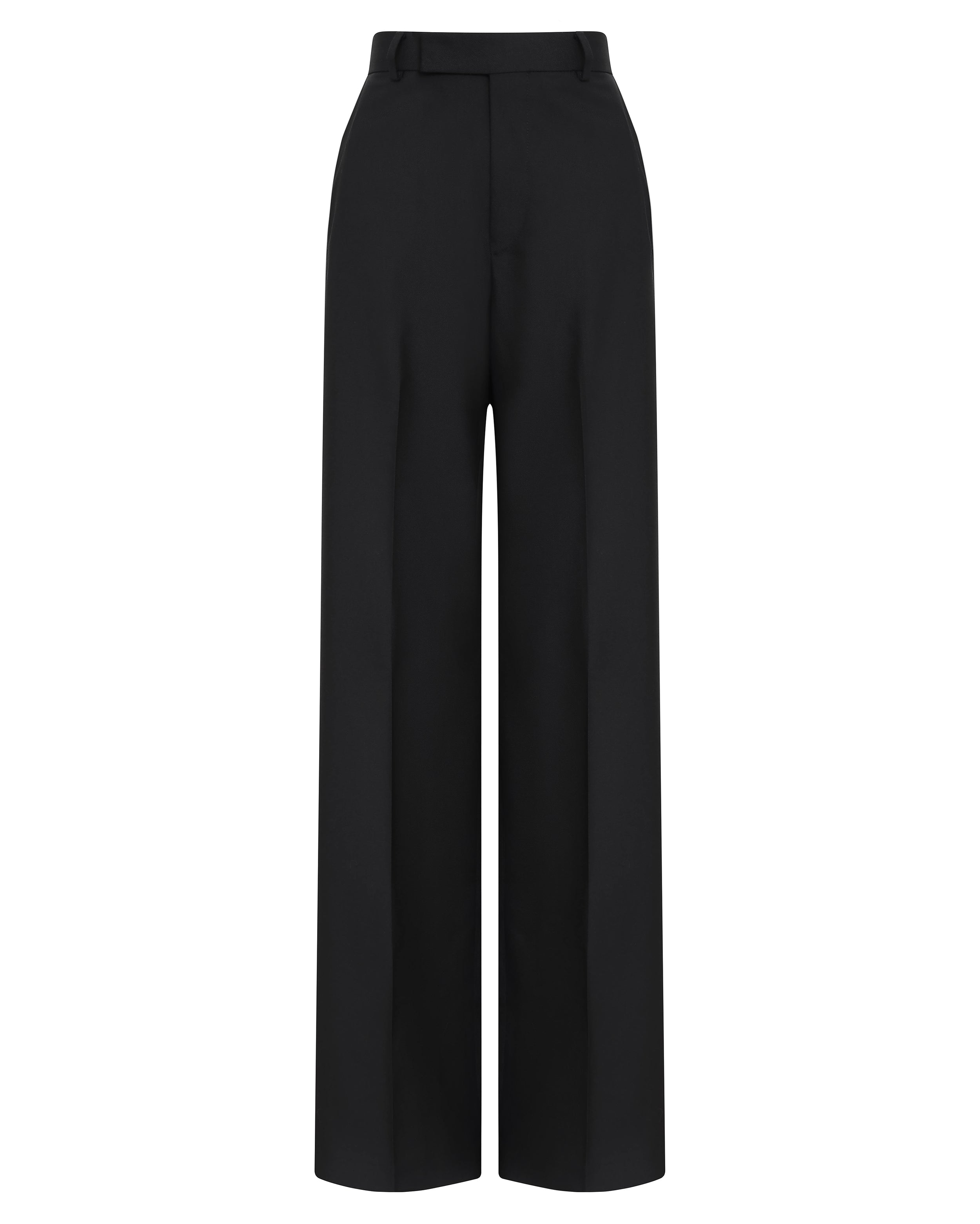 A Calça Kioko é confeccionada em lã importada, possui modelagem de alfaiataria, caimento mais solto, cintura alta, cós com passantes, fechamento frontal por zíper, vinco vertical, dois bolsos modelo faca nas laterais, dois bolsos embutidos posteriores, forro embutido, barra invisível e acabamentos internos de alfaiataria tradicional, com viés.