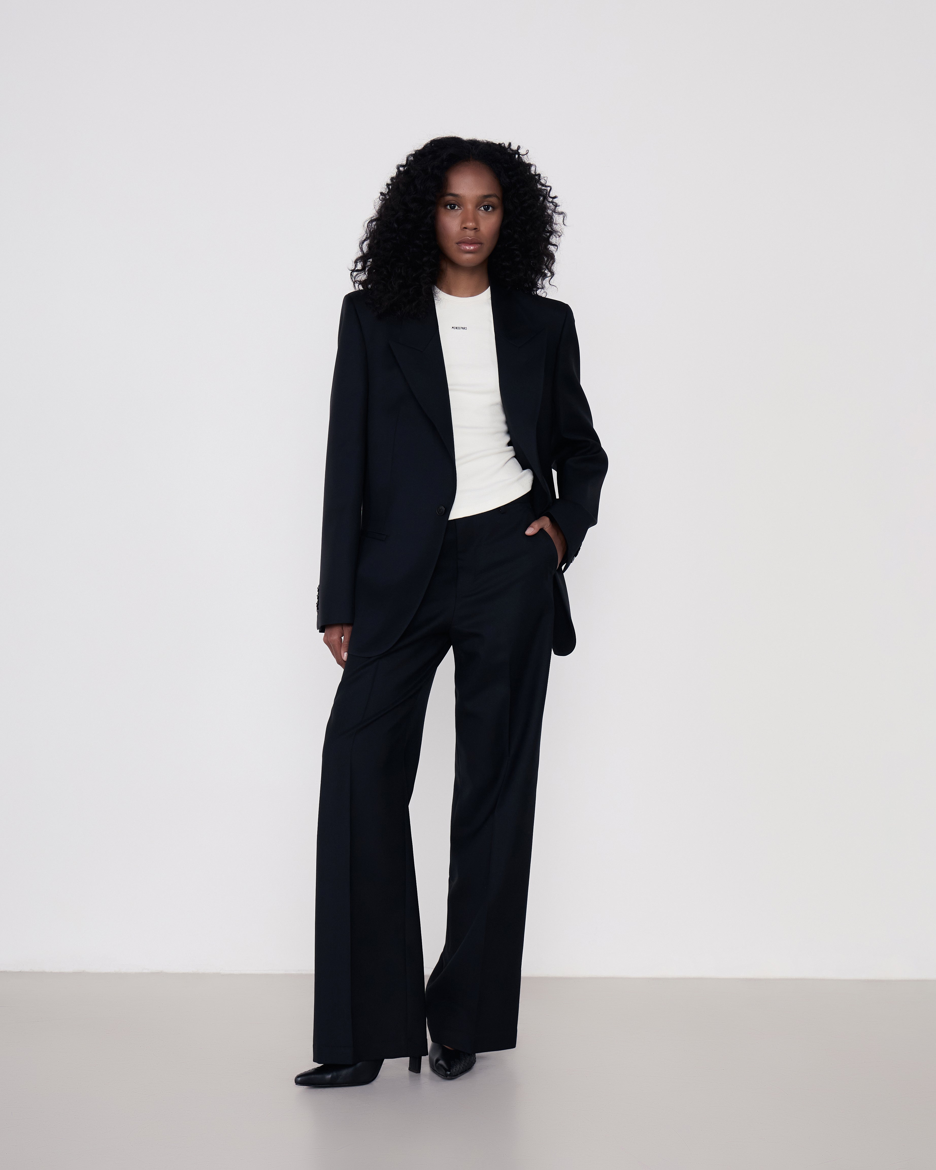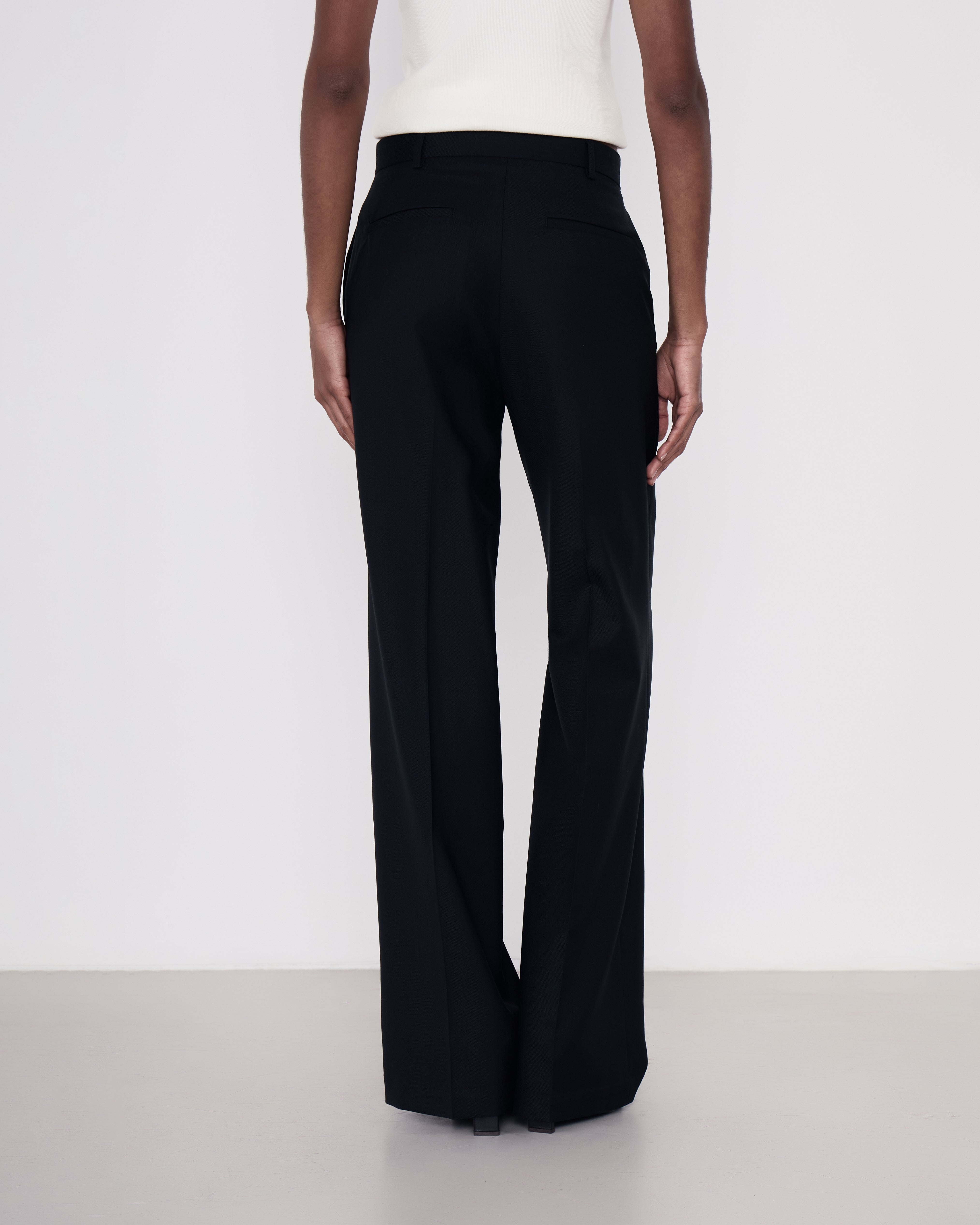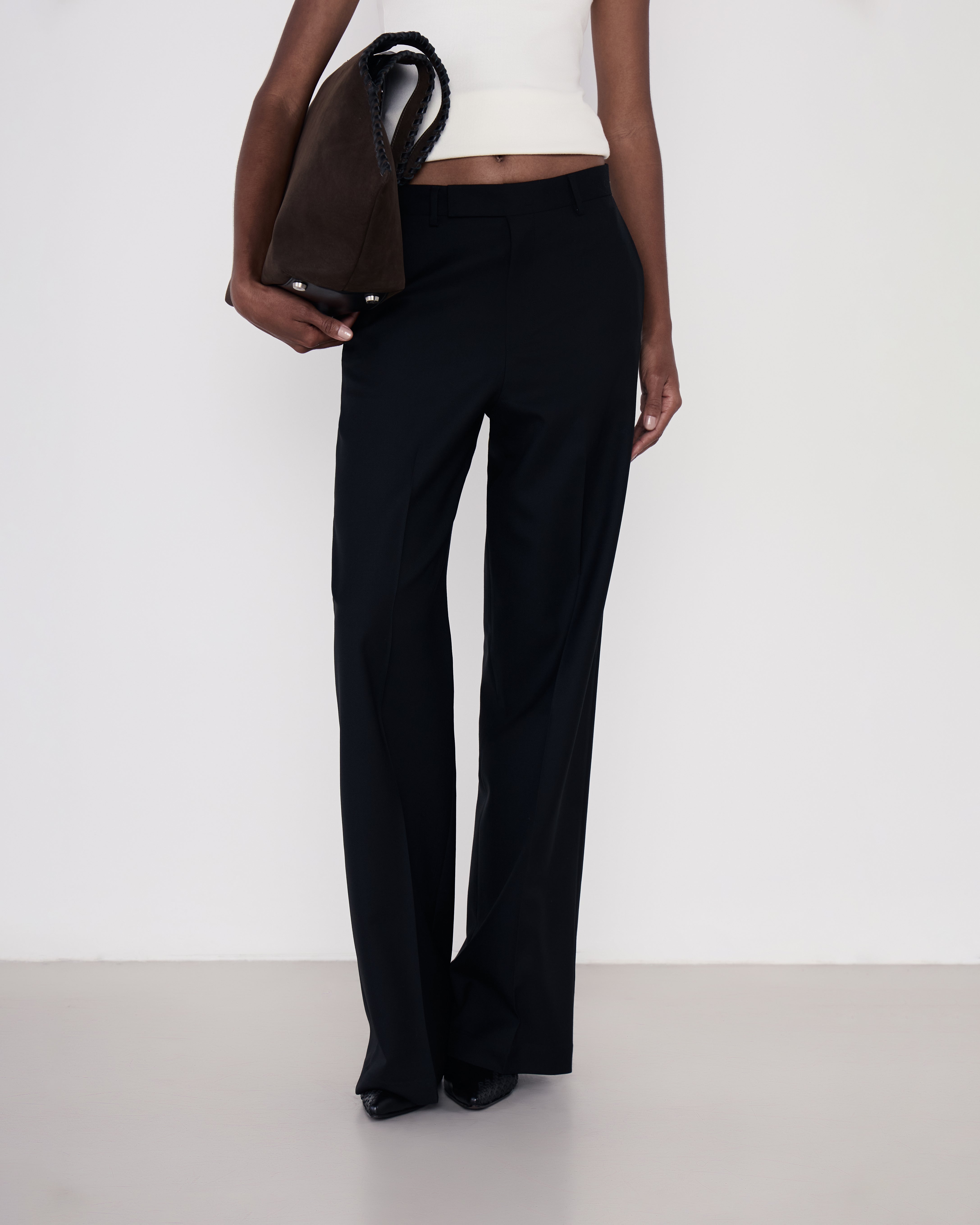 A Calça Kioko é confeccionada em lã importada, possui modelagem de alfaiataria, caimento mais solto, cintura alta, cós com passantes, fechamento frontal por zíper, vinco vertical, dois bolsos modelo faca nas laterais, dois bolsos embutidos posteriores, forro embutido, barra invisível e acabamentos internos de alfaiataria tradicional, com viés.