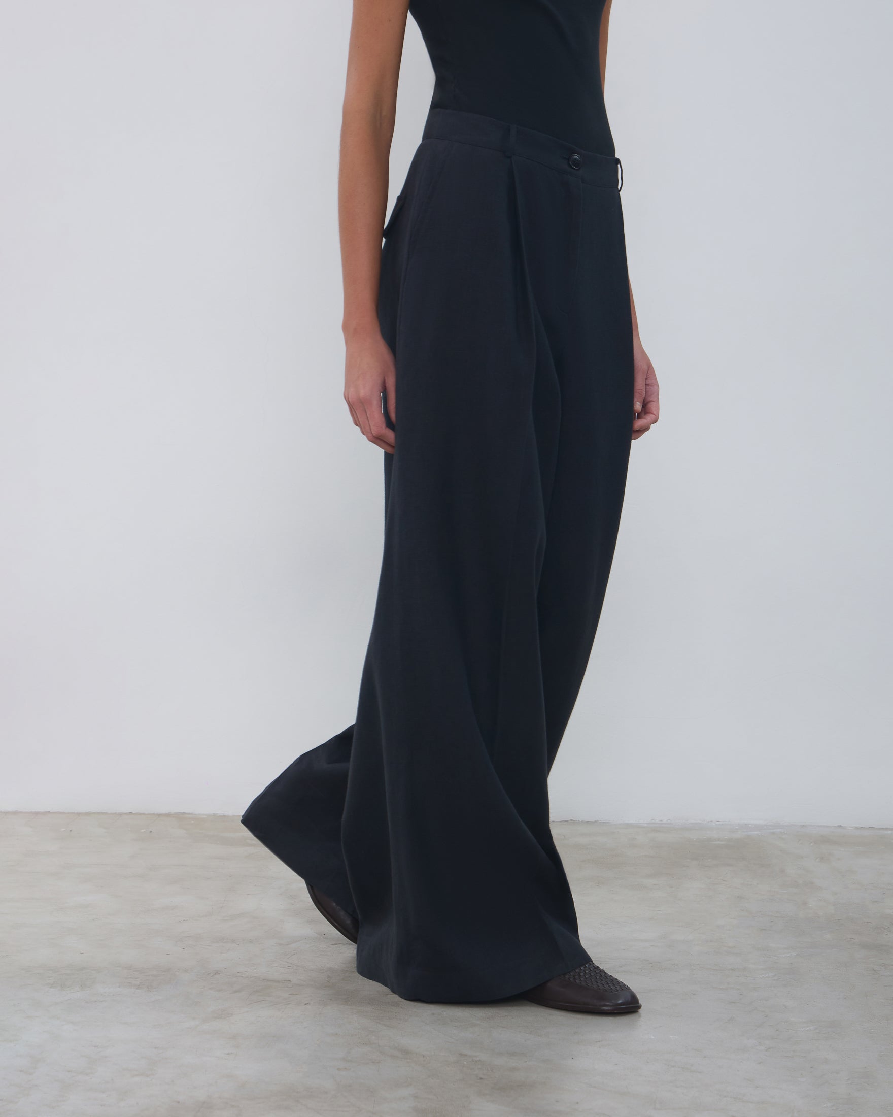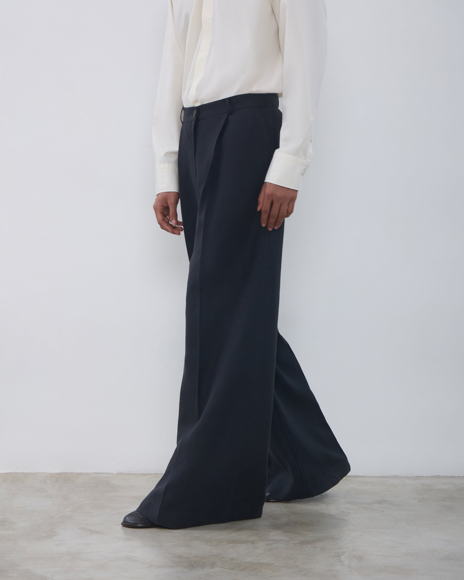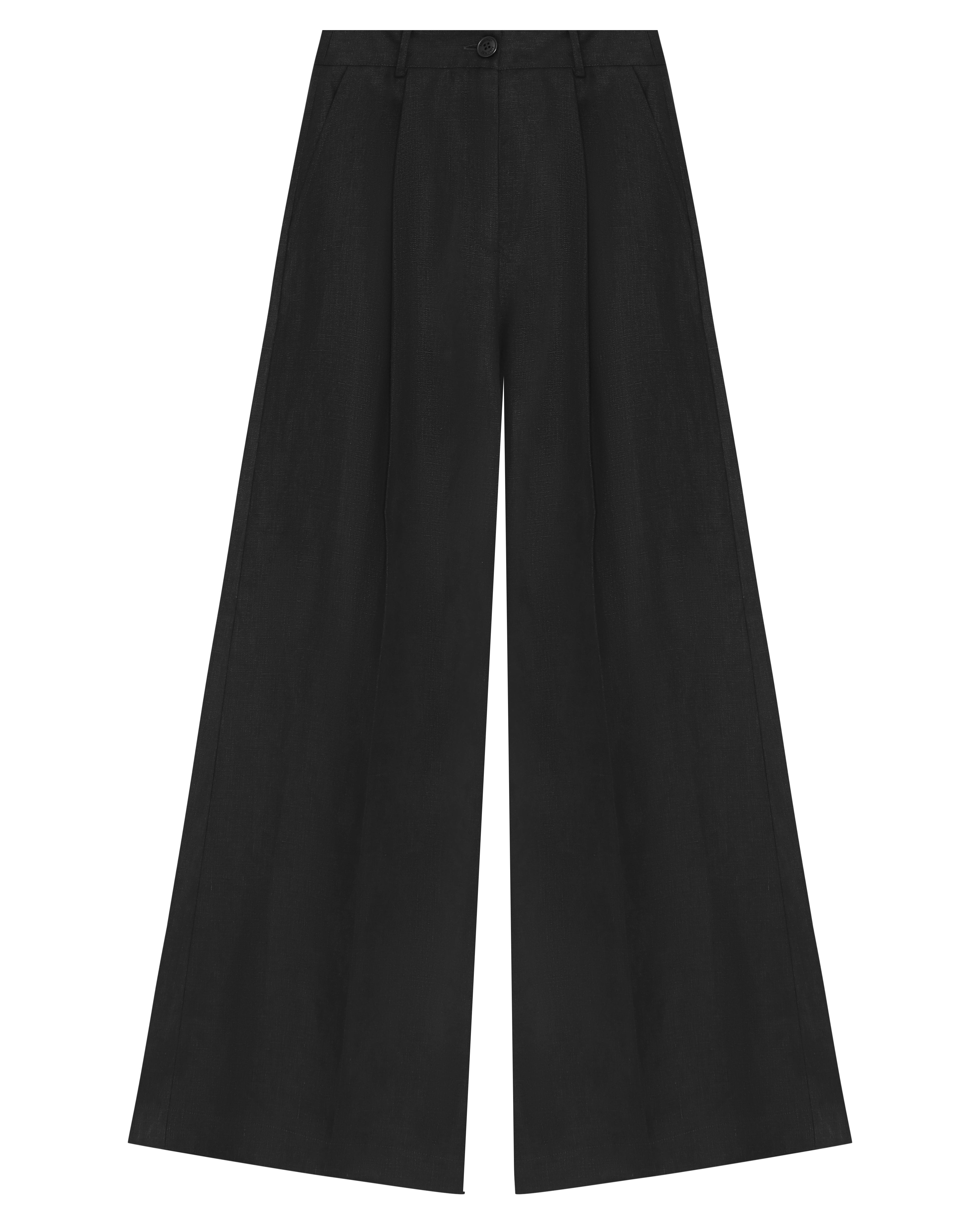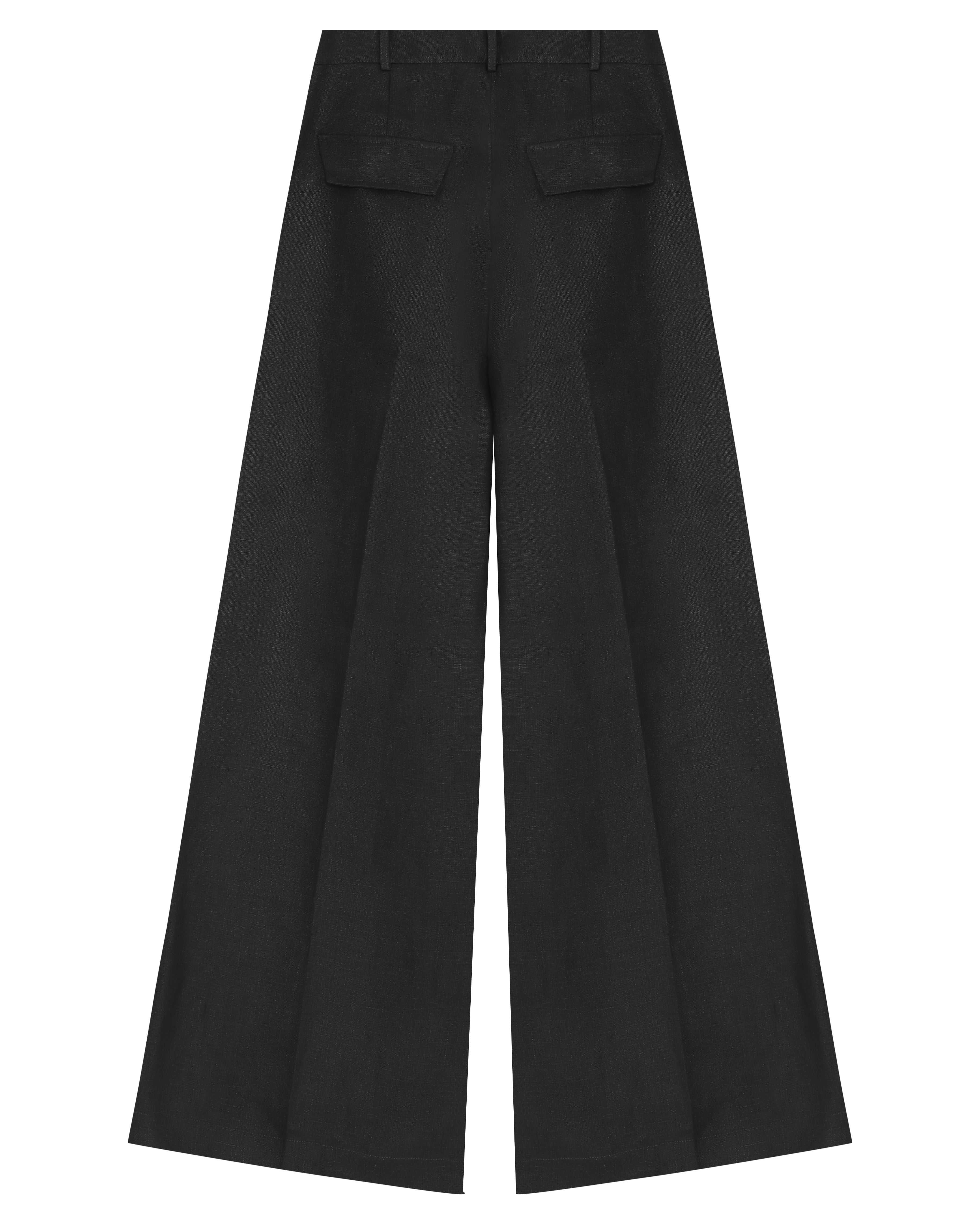 A Calça Rita é confeccionada em linho, possui caimento acinturado, modelo pantalona com frisos de passadoria, cós com passantes, fechamento frontal por ganchos de alfaiataria, zíper e botão, dois bolsos facas frontais, dois bolsos decorativos com lapelas em formato de trapézio nas costas e acabamento pespontado.