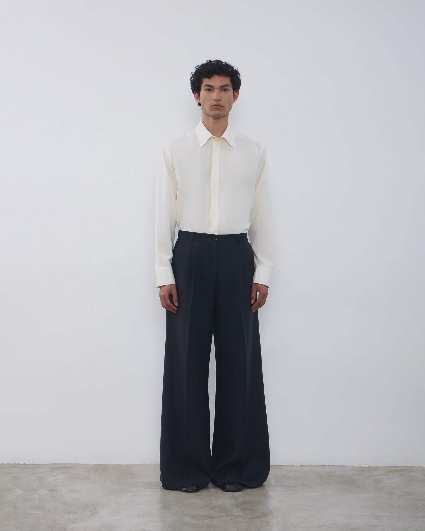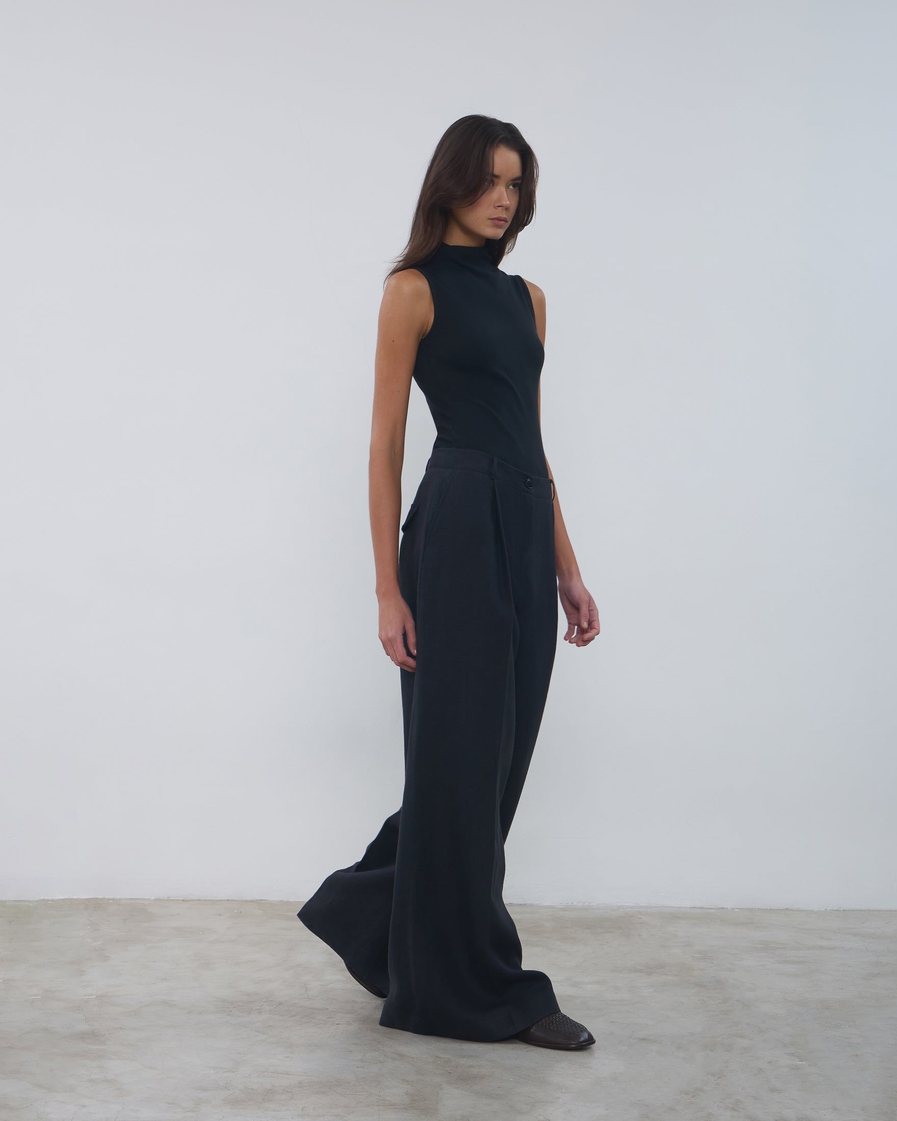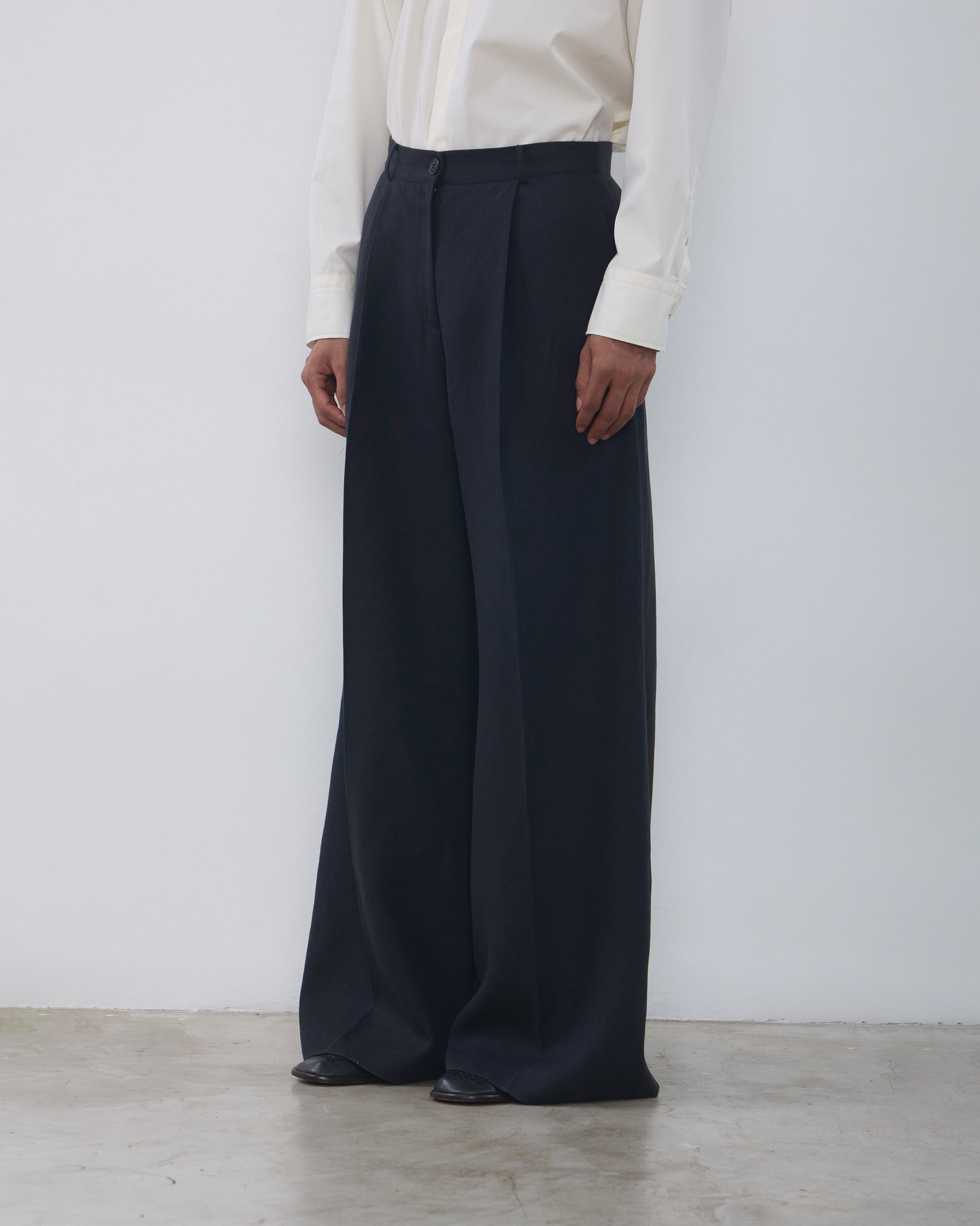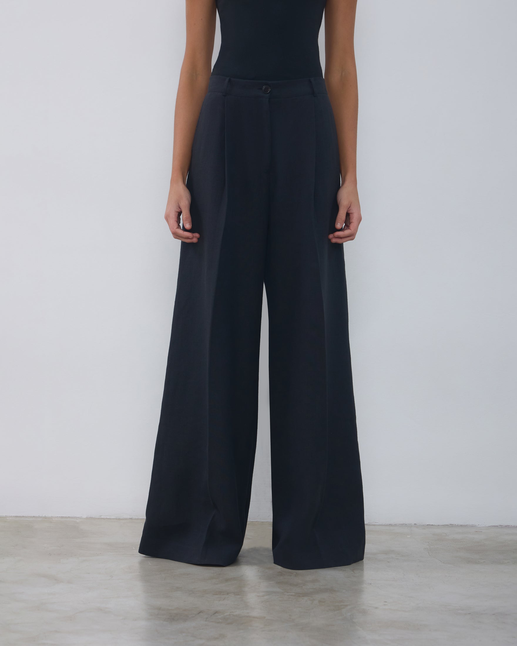 A Calça Rita é confeccionada em linho, possui caimento acinturado, modelo pantalona com frisos de passadoria, cós com passantes, fechamento frontal por ganchos de alfaiataria, zíper e botão, dois bolsos facas frontais, dois bolsos decorativos com lapelas em formato de trapézio nas costas e acabamento pespontado.