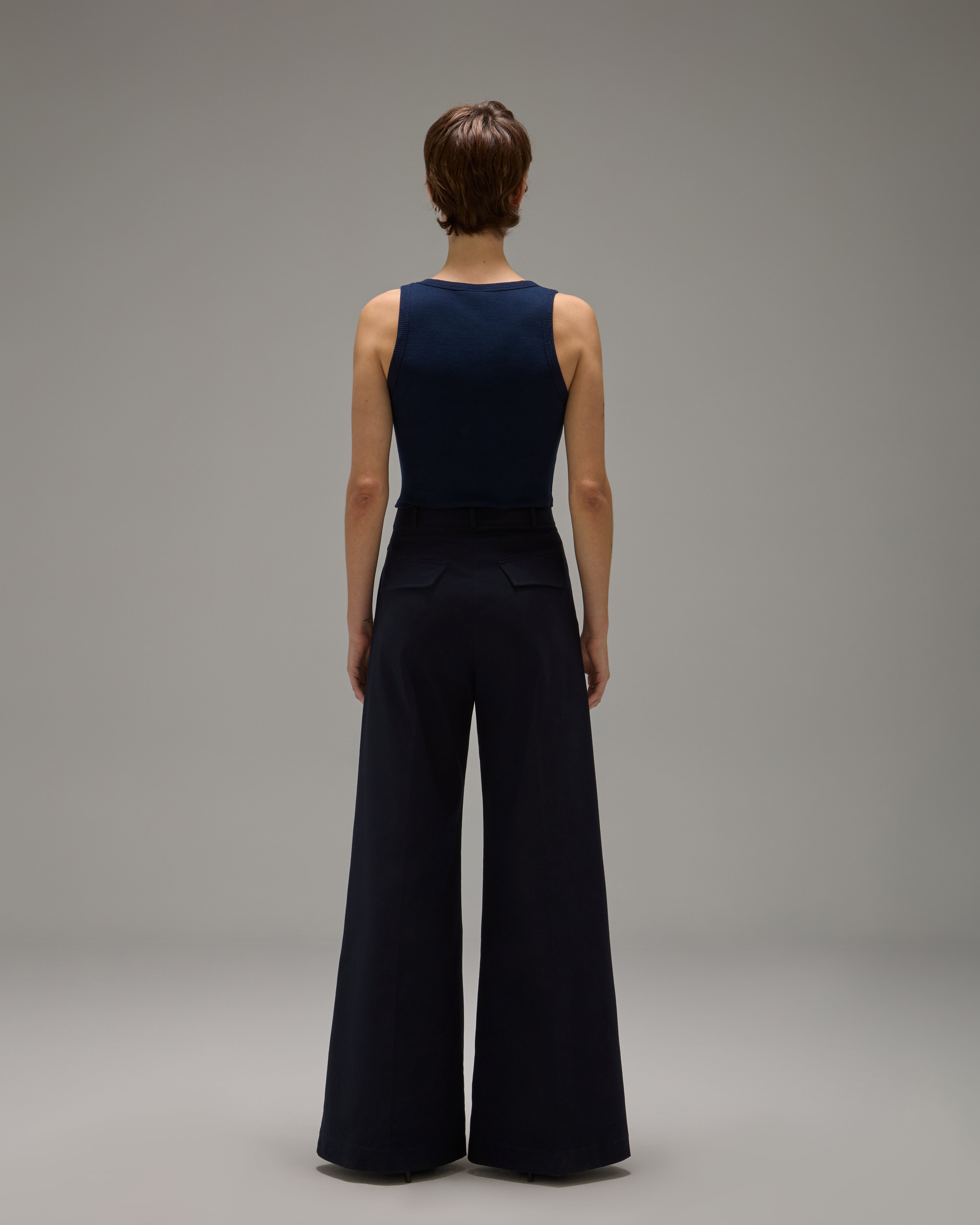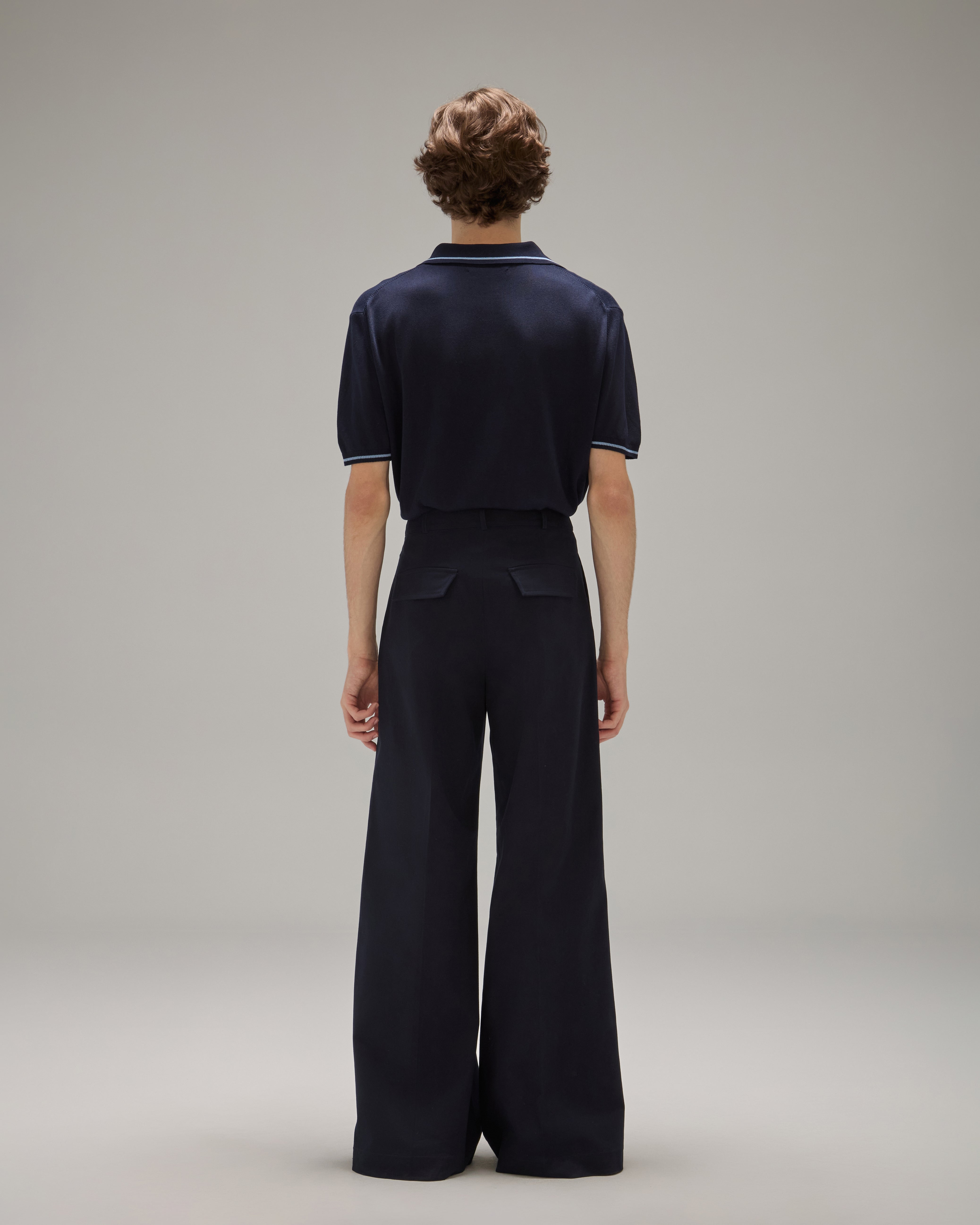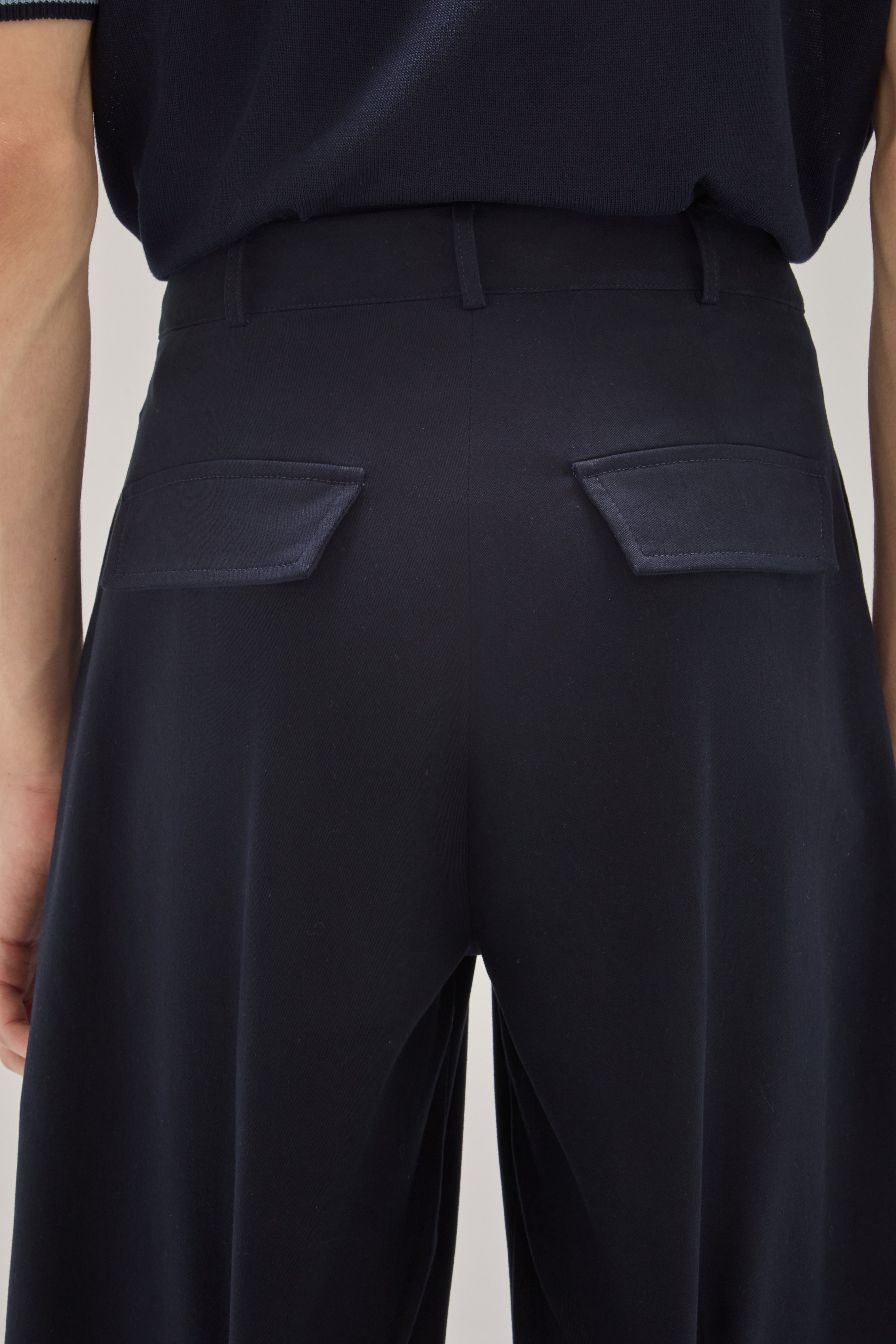 A Calça Rita é confeccionada em algodão, possui caimento acinturado, modelo pantalona com frisos de passadoria, cós com passantes, fechamento frontal por ganchos de alfaiataria, zíper e botão, dois bolsos facas frontais, dois bolsos decorativos com lapelas em formato de trapézio nas costas e acabamento pespontado.