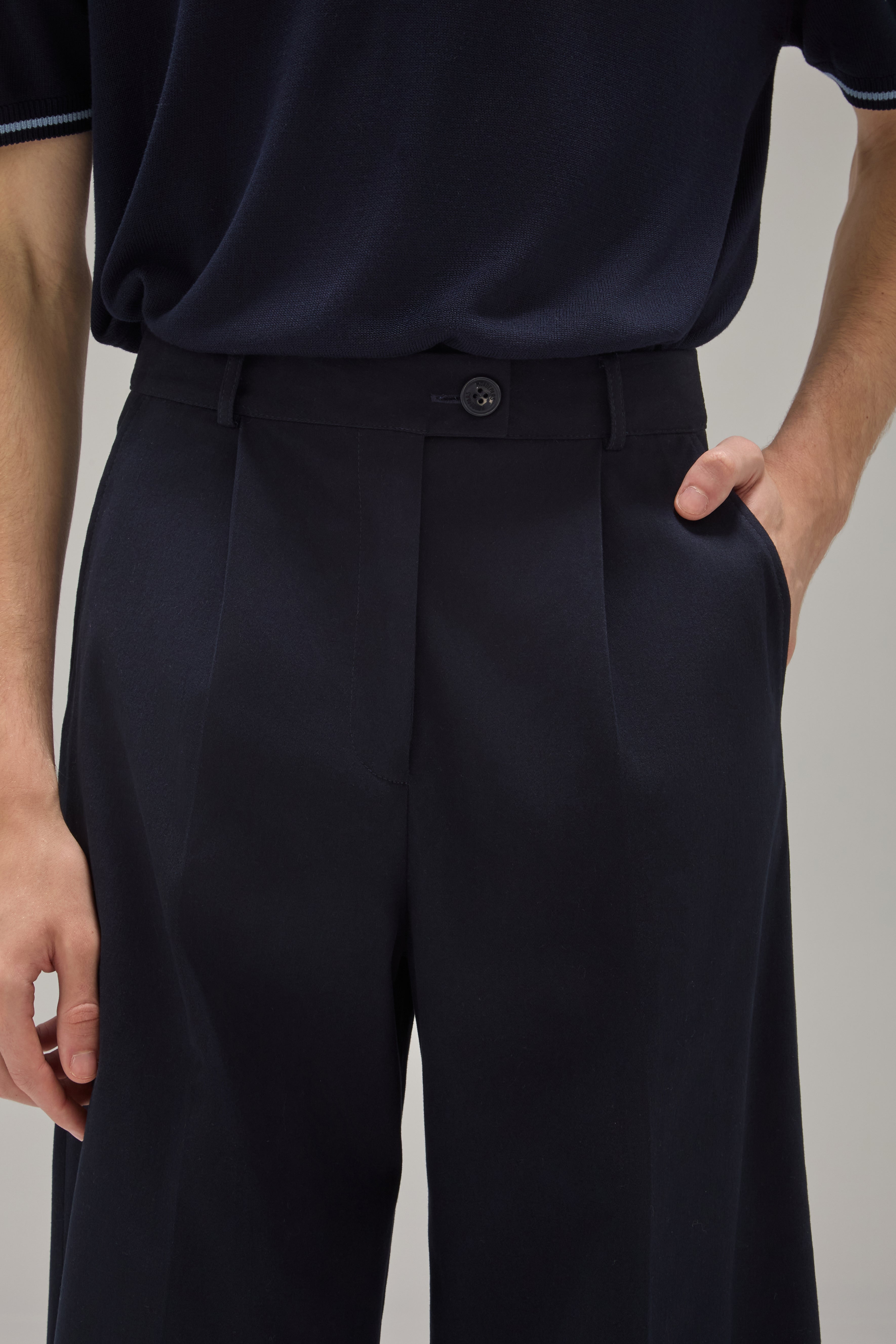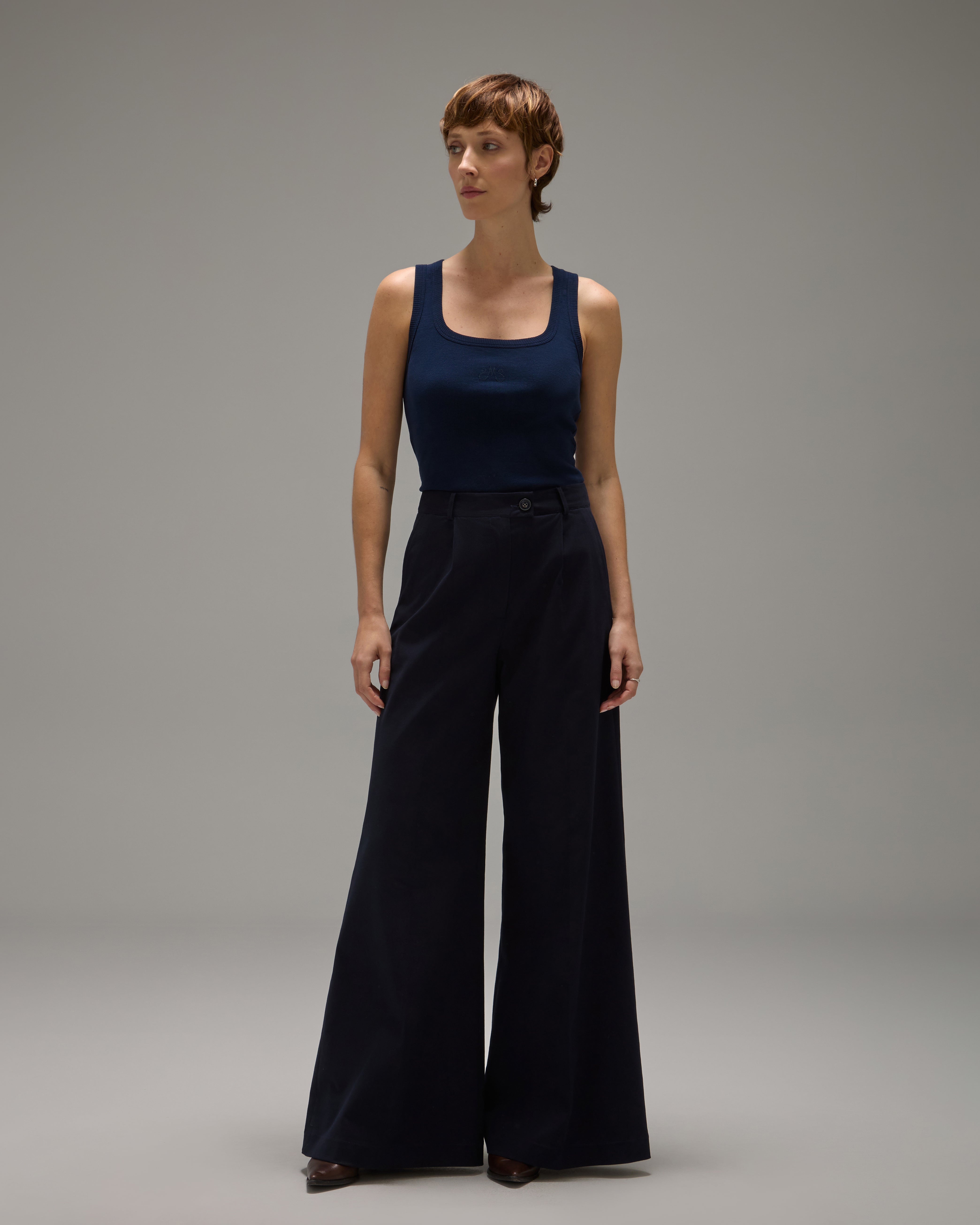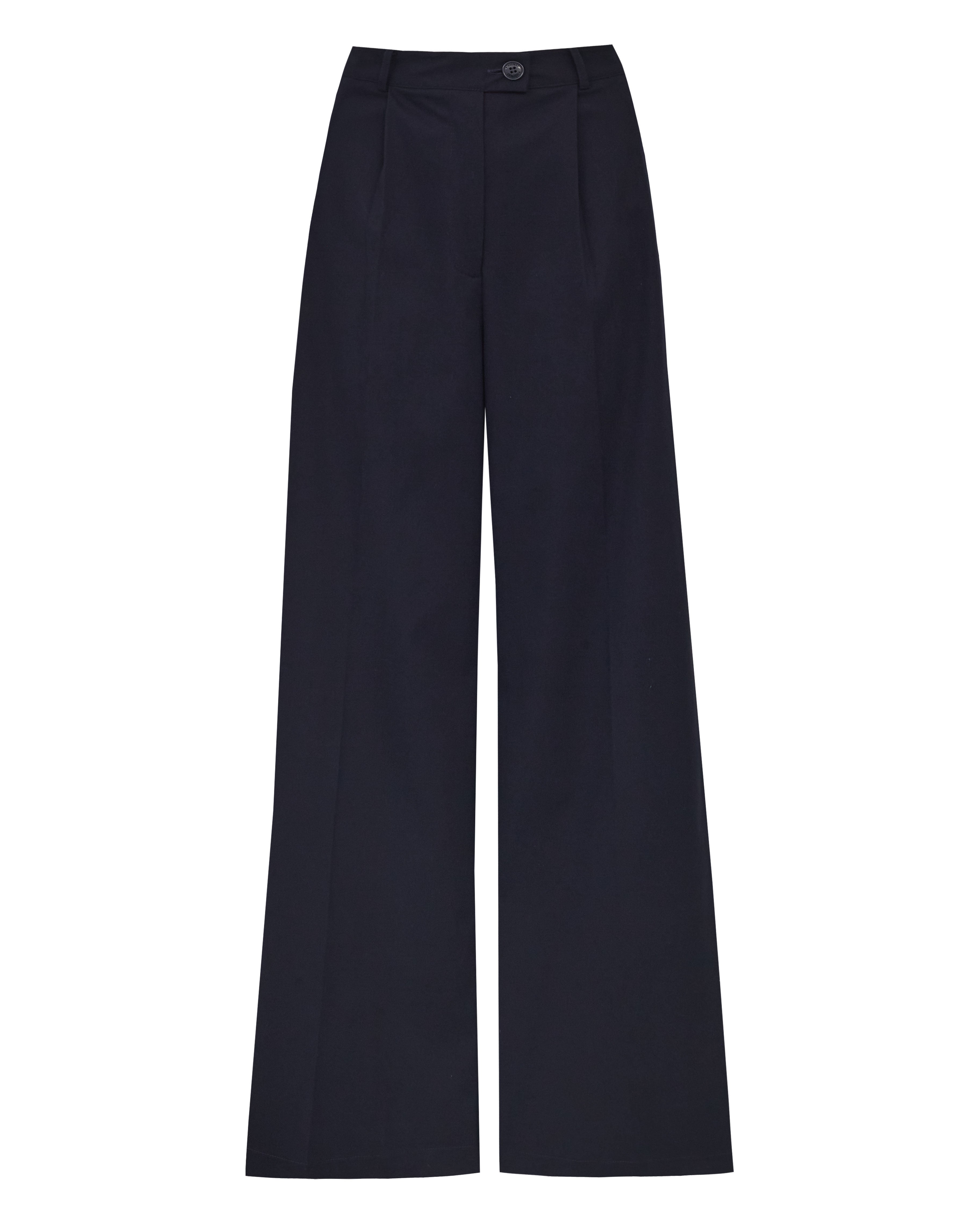 A Calça Rita é confeccionada em algodão, possui caimento acinturado, modelo pantalona com frisos de passadoria, cós com passantes, fechamento frontal por ganchos de alfaiataria, zíper e botão, dois bolsos facas frontais, dois bolsos decorativos com lapelas em formato de trapézio nas costas e acabamento pespontado.